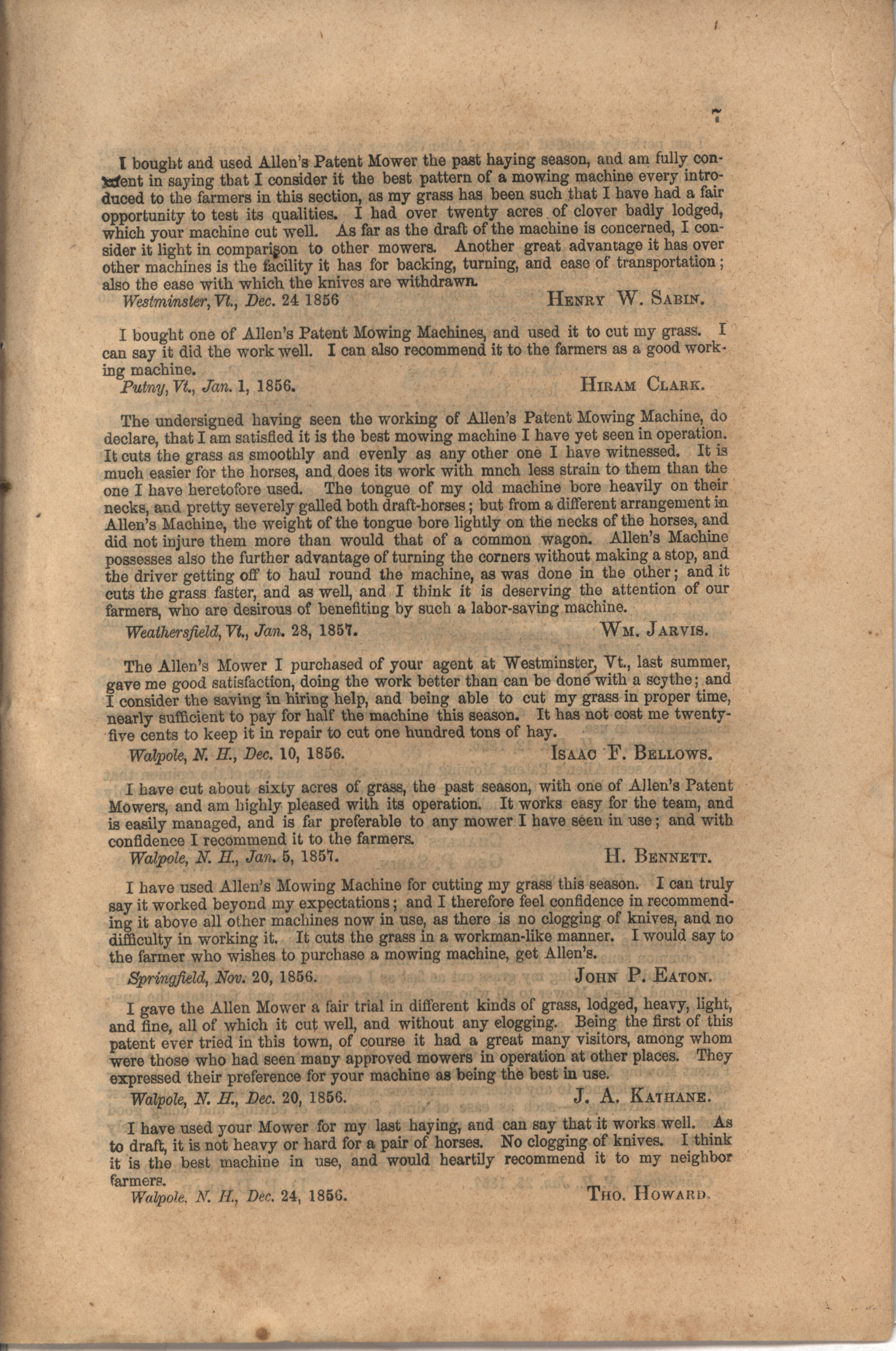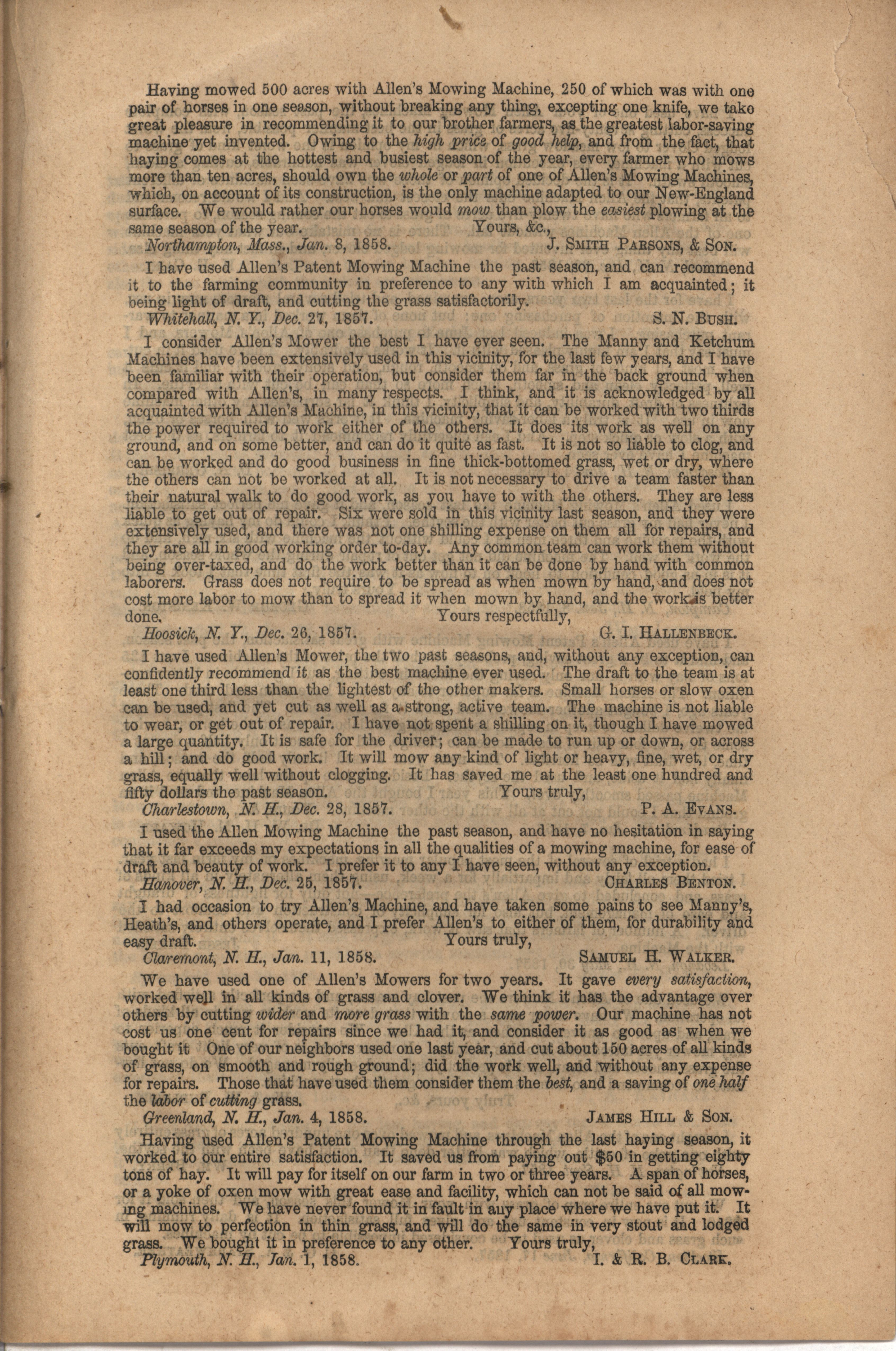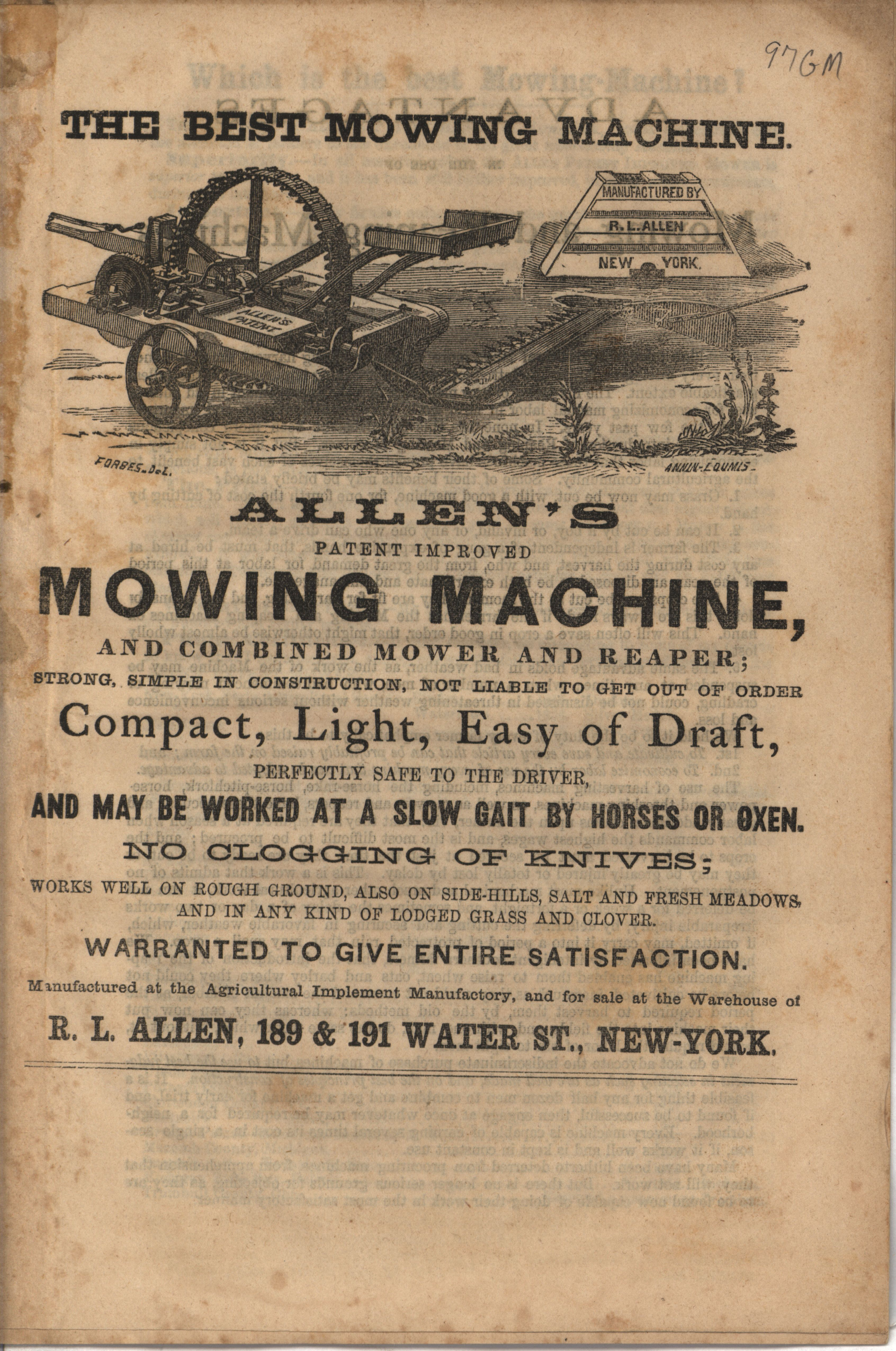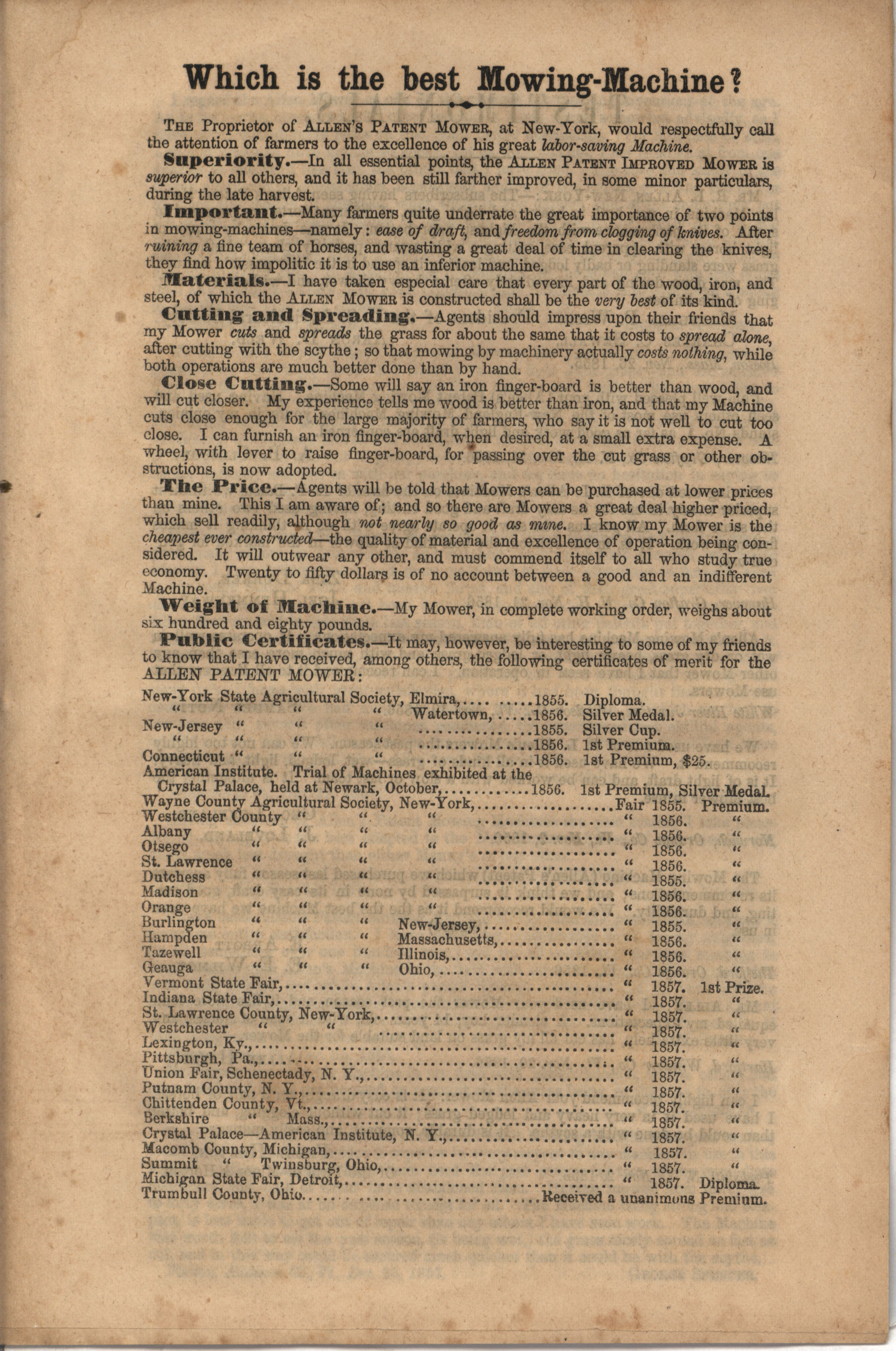 - Catalog for Allen's Patent Mowing Machines offered by M. and the J. H. Buck and Company from 1858 includes descriptions and testimonials.