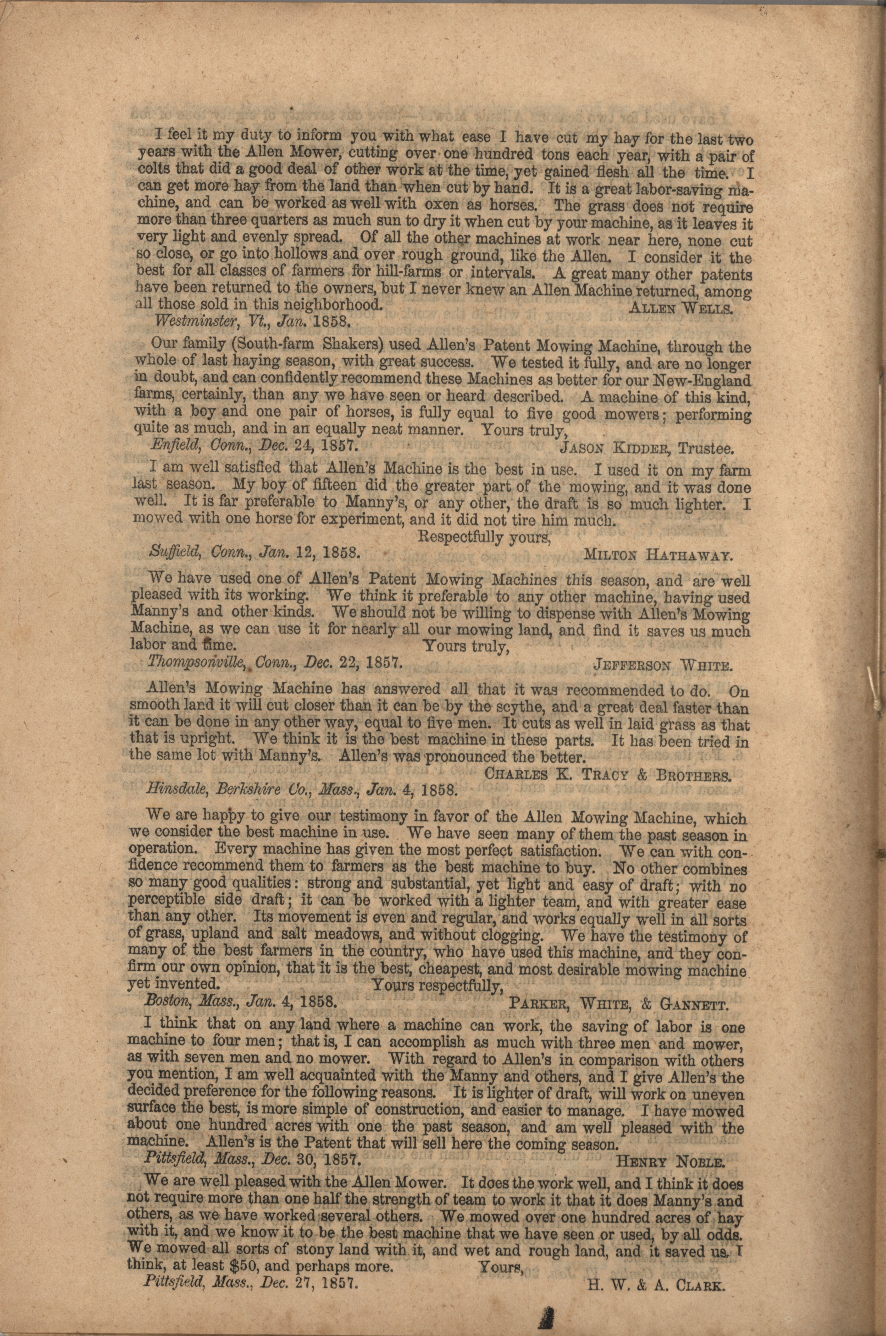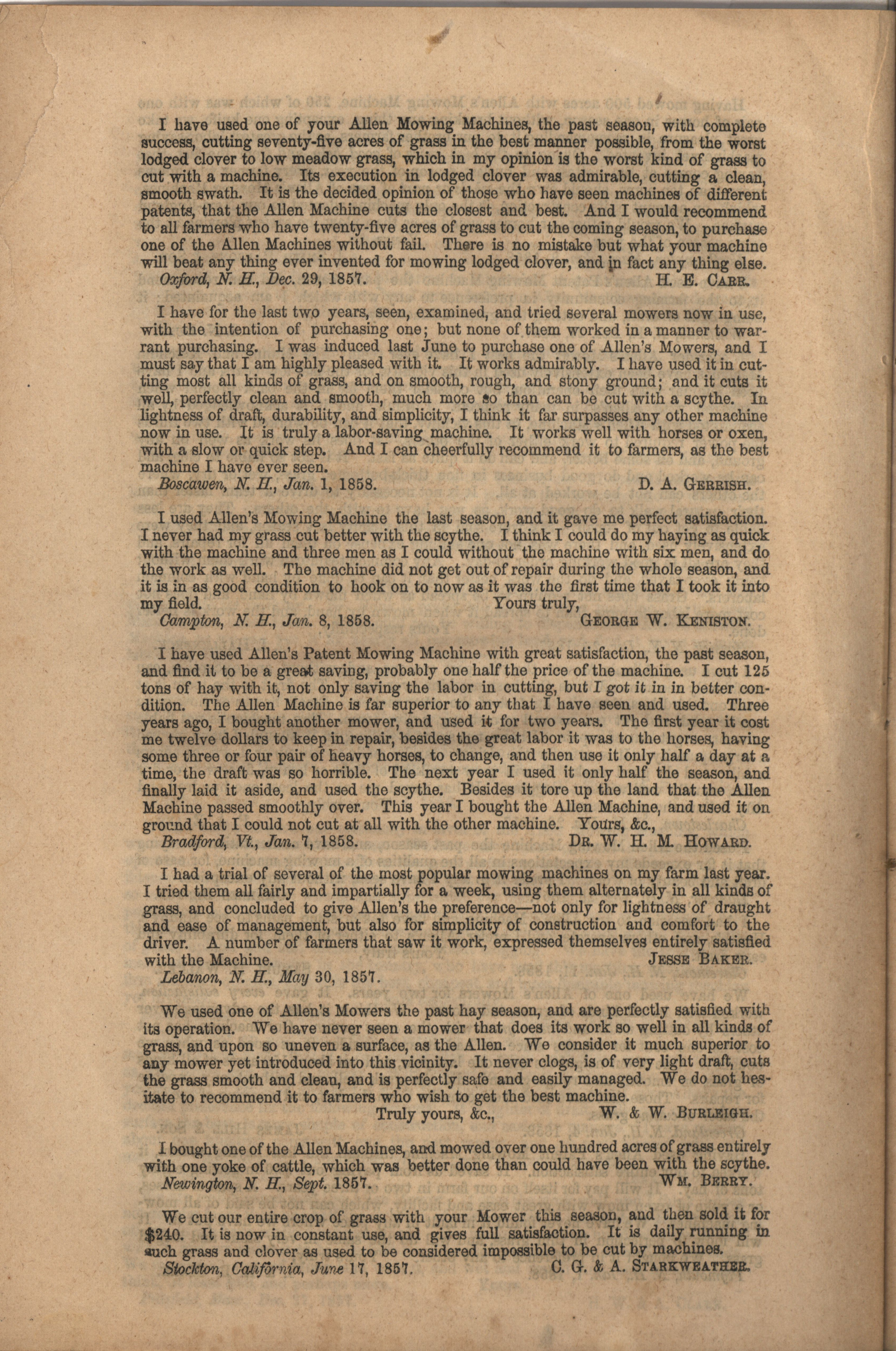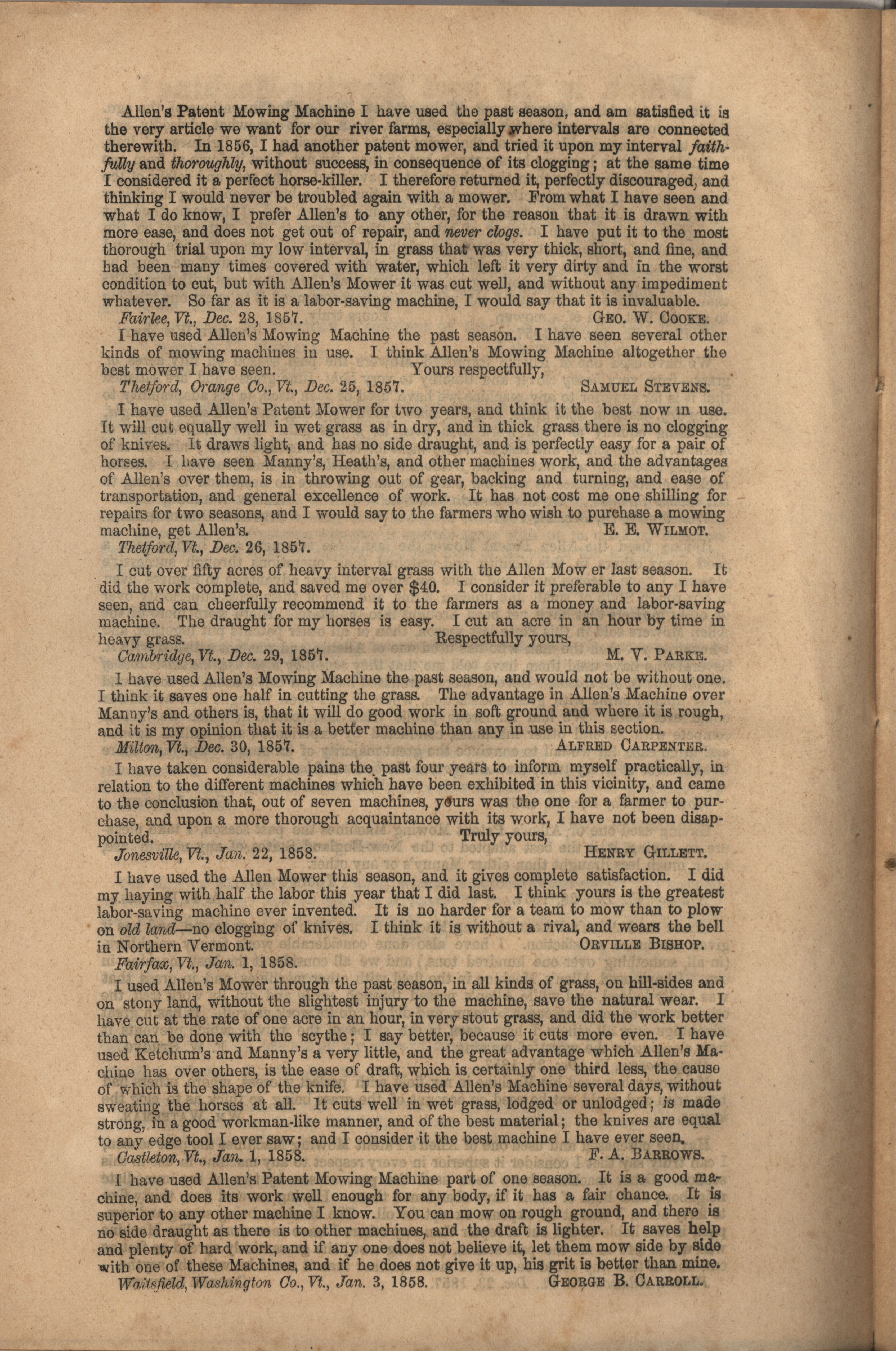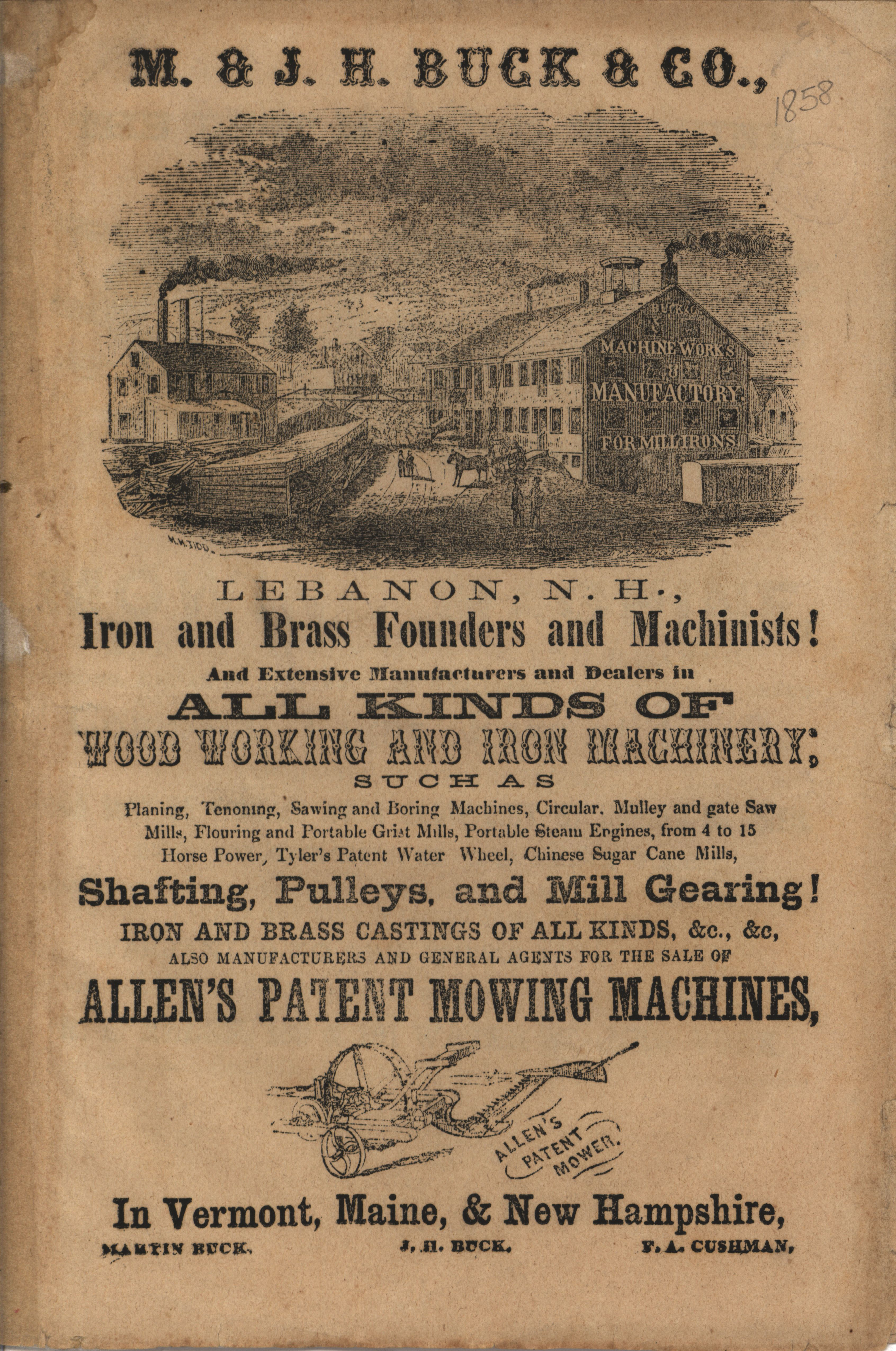 - Catalog for Allen's Patent Mowing Machines offered by M. and the J. H. Buck and Company from 1858 includes descriptions and testimonials.