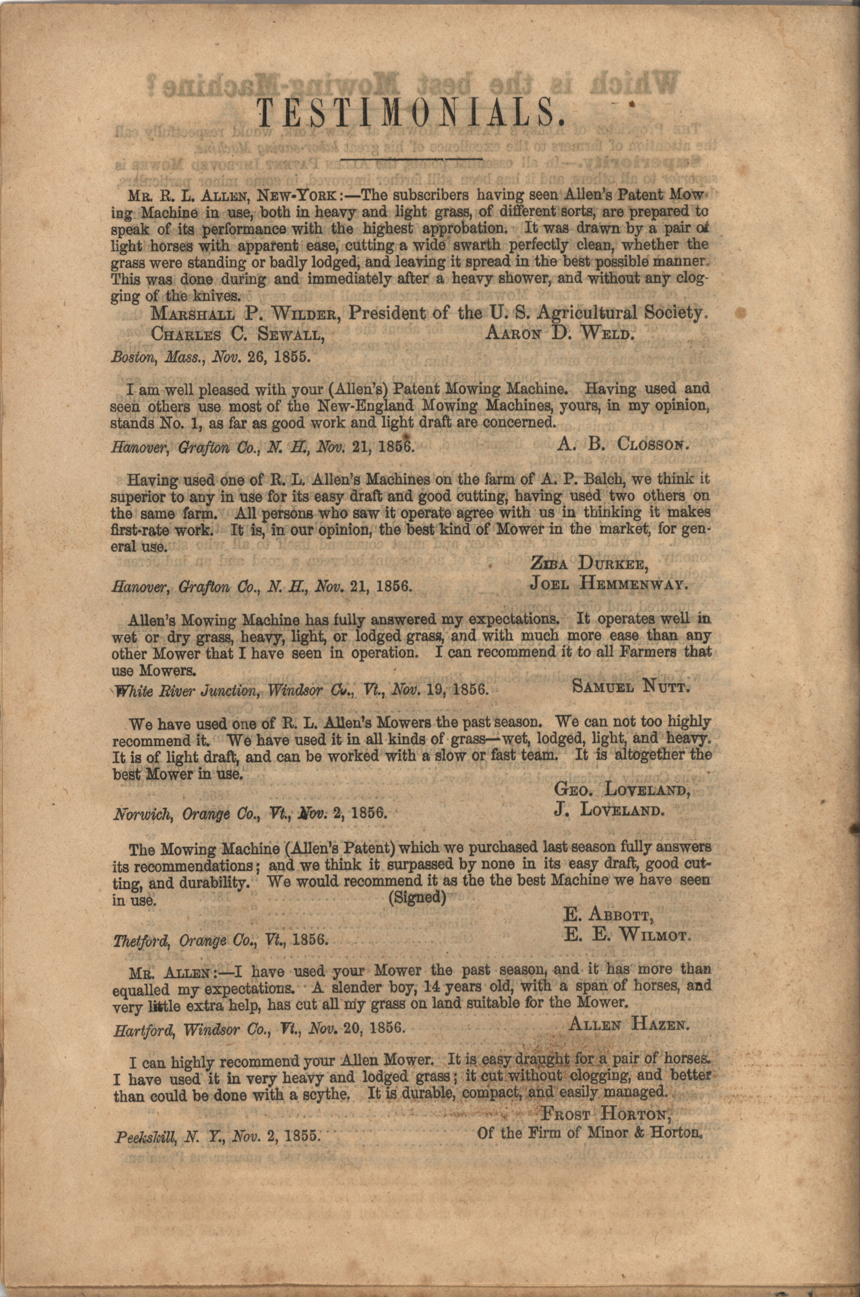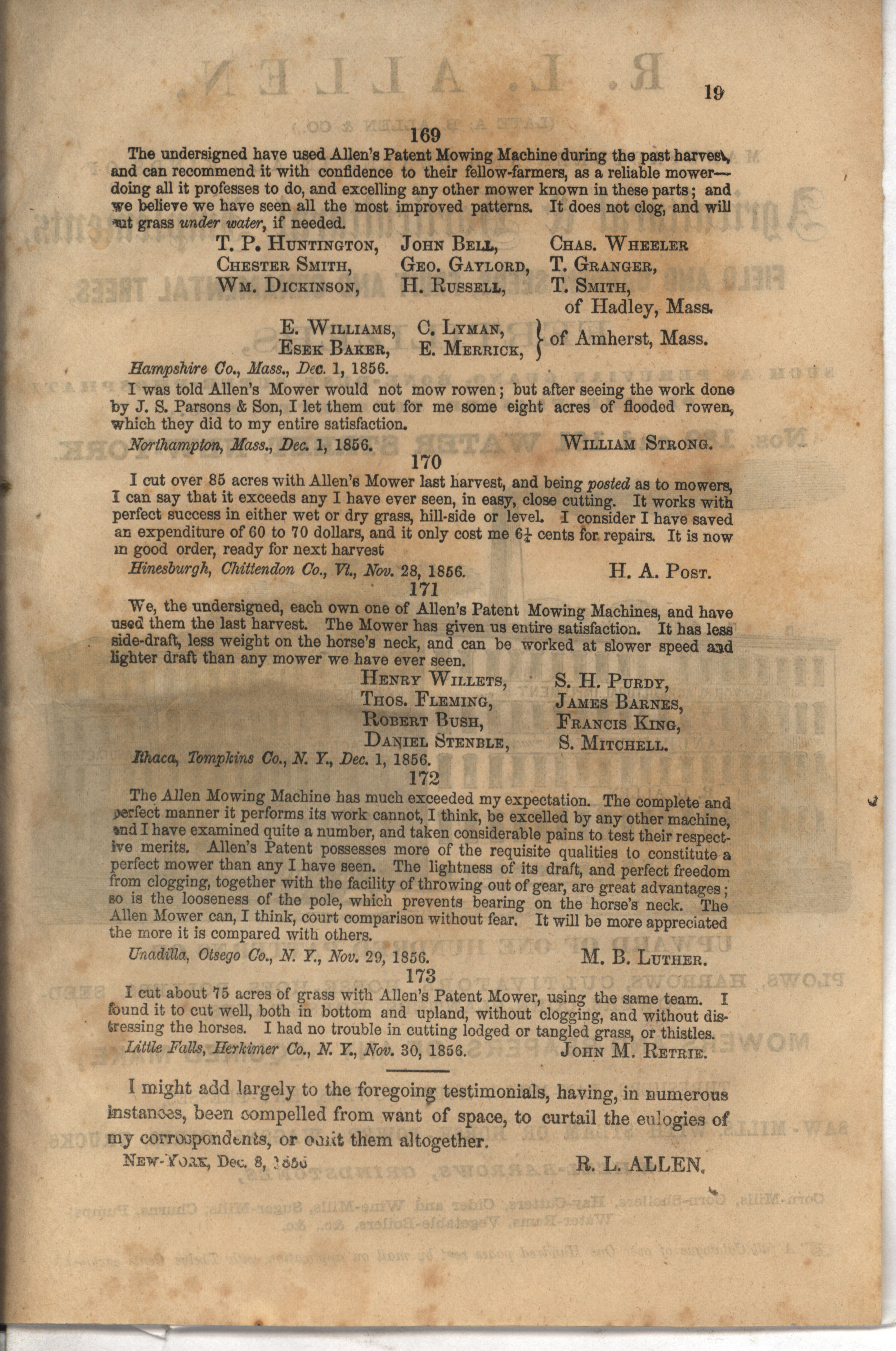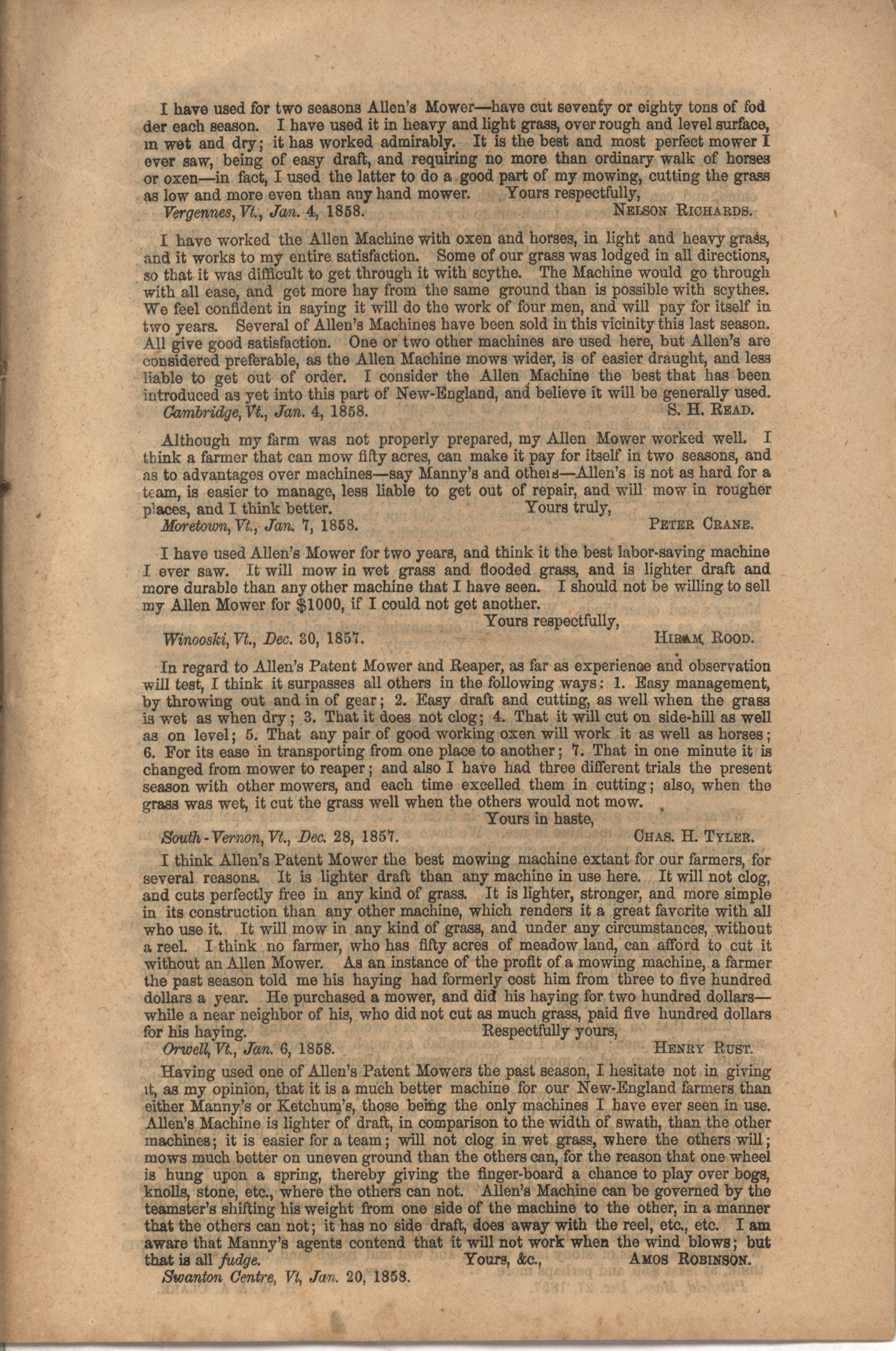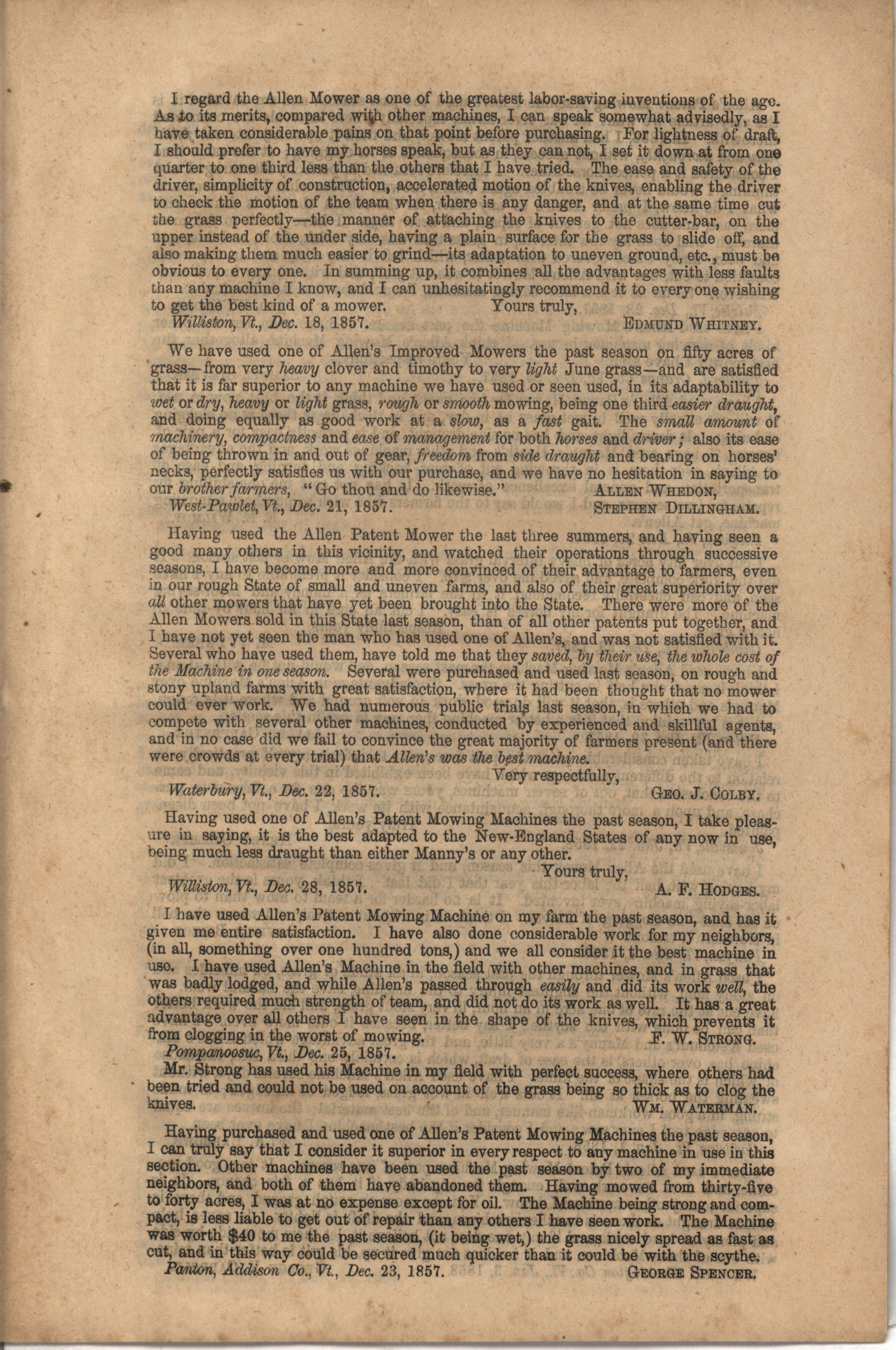 - Catalog for Allen's Patent Mowing Machines offered by M. and the J. H. Buck and Company from 1858 includes descriptions and testimonials.