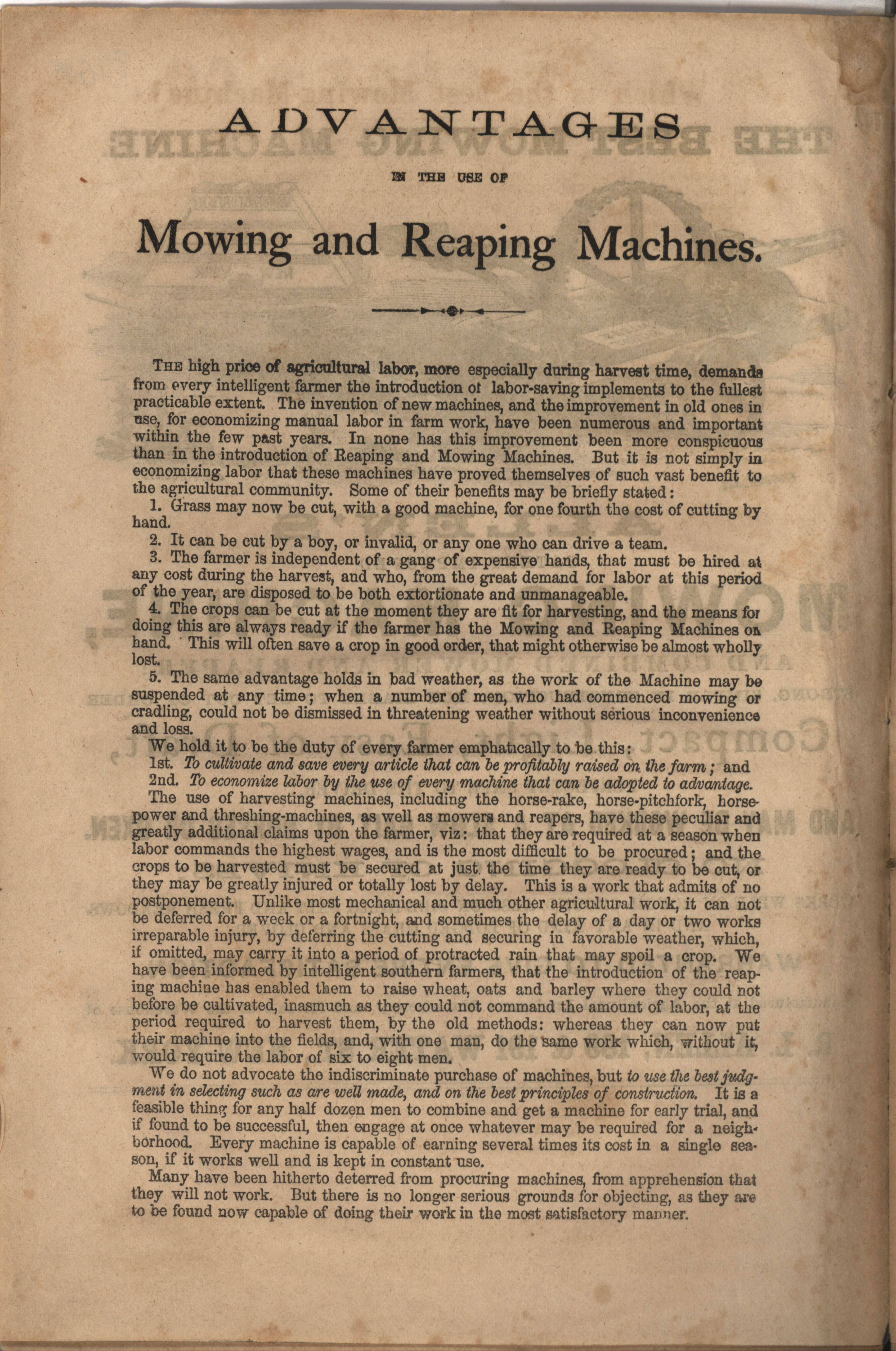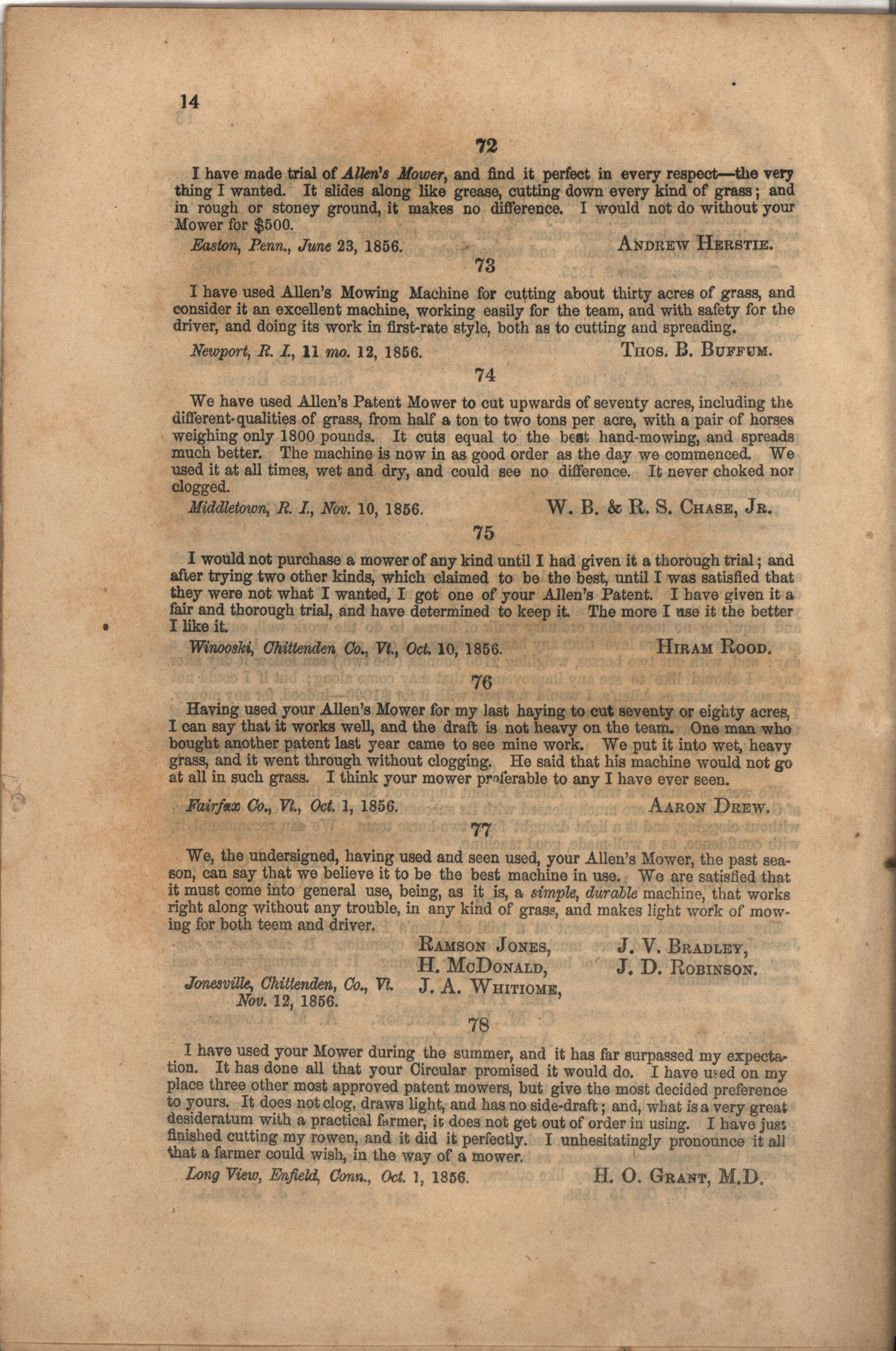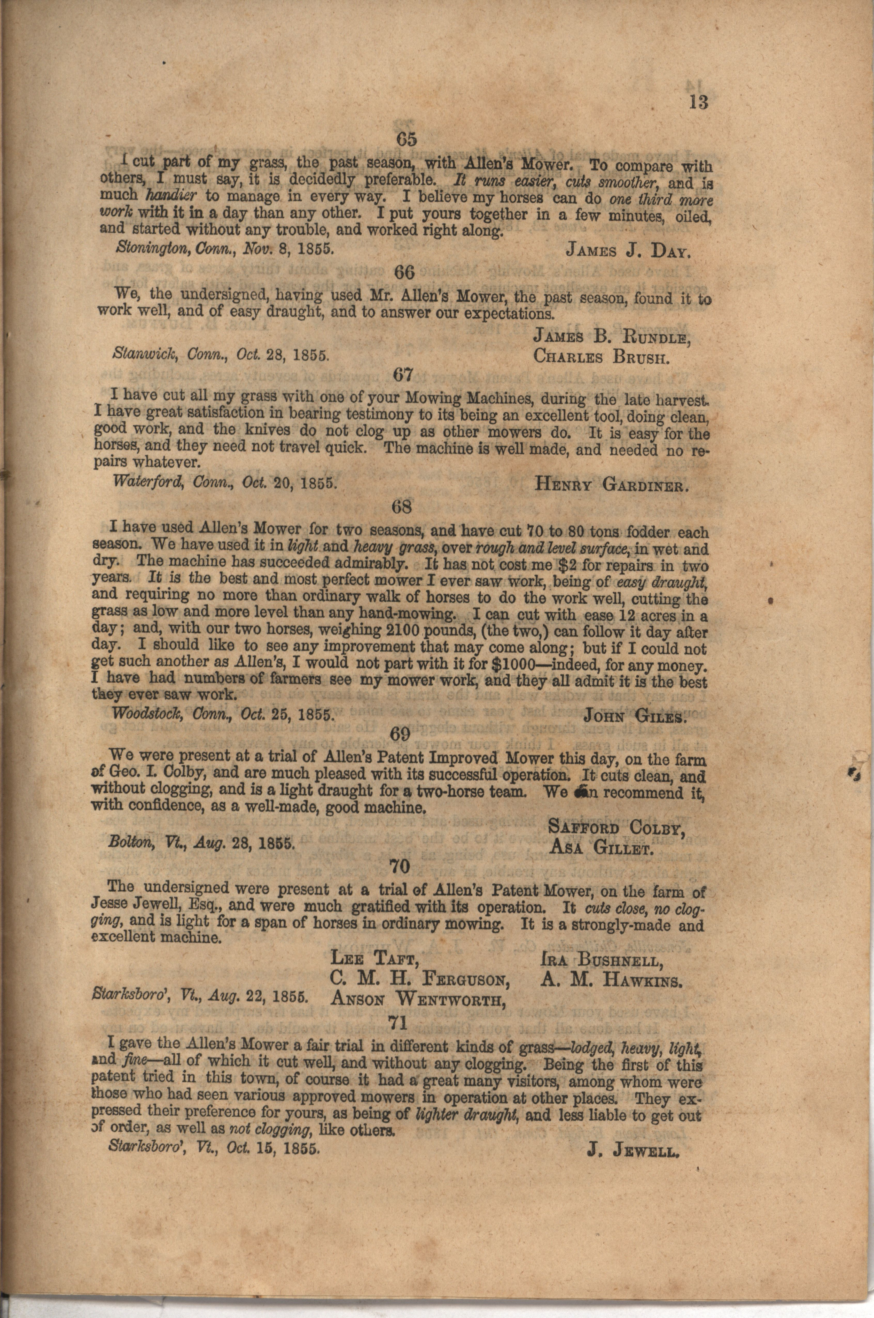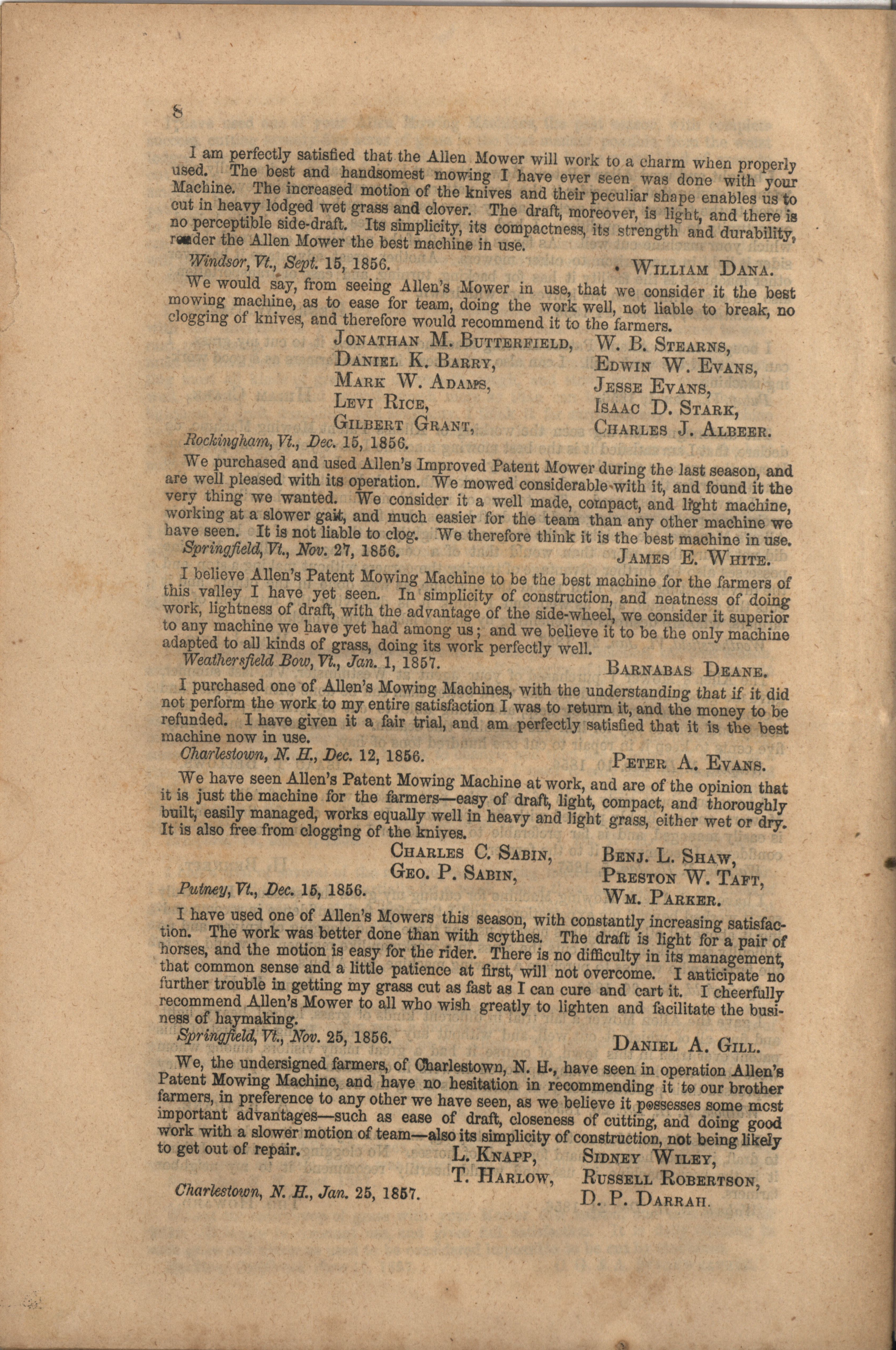 - Catalog for Allen's Patent Mowing Machines offered by M. and the J. H. Buck and Company from 1858 includes descriptions and testimonials.