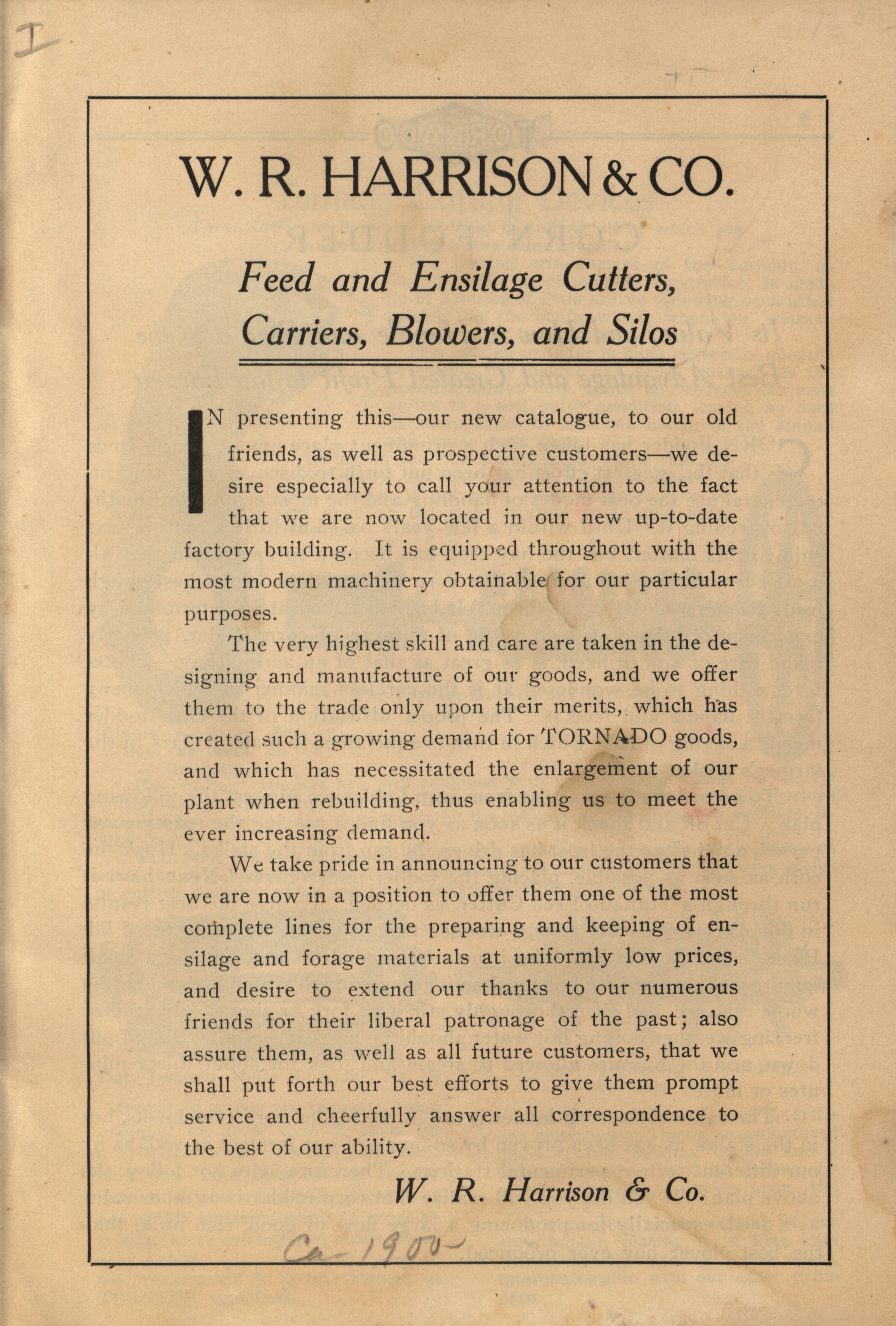 - Illustrated catalog describing the agricultural implements offered by W. R. Harrison and Company in 1900.