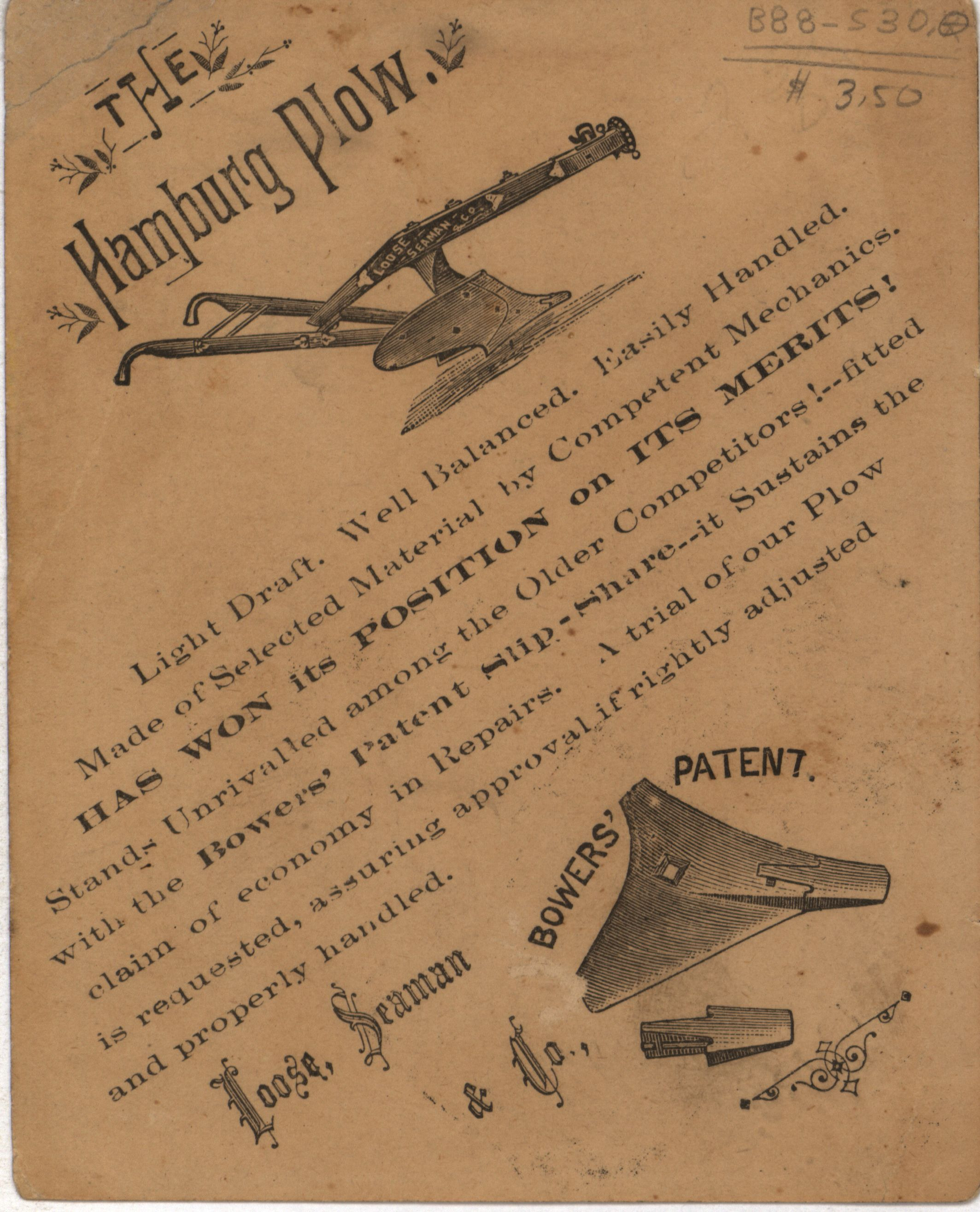 - "Hamburg Plow Works advertisement card", Agricultural Machinery Literature Collection, Iowa State University Library Digital Collections