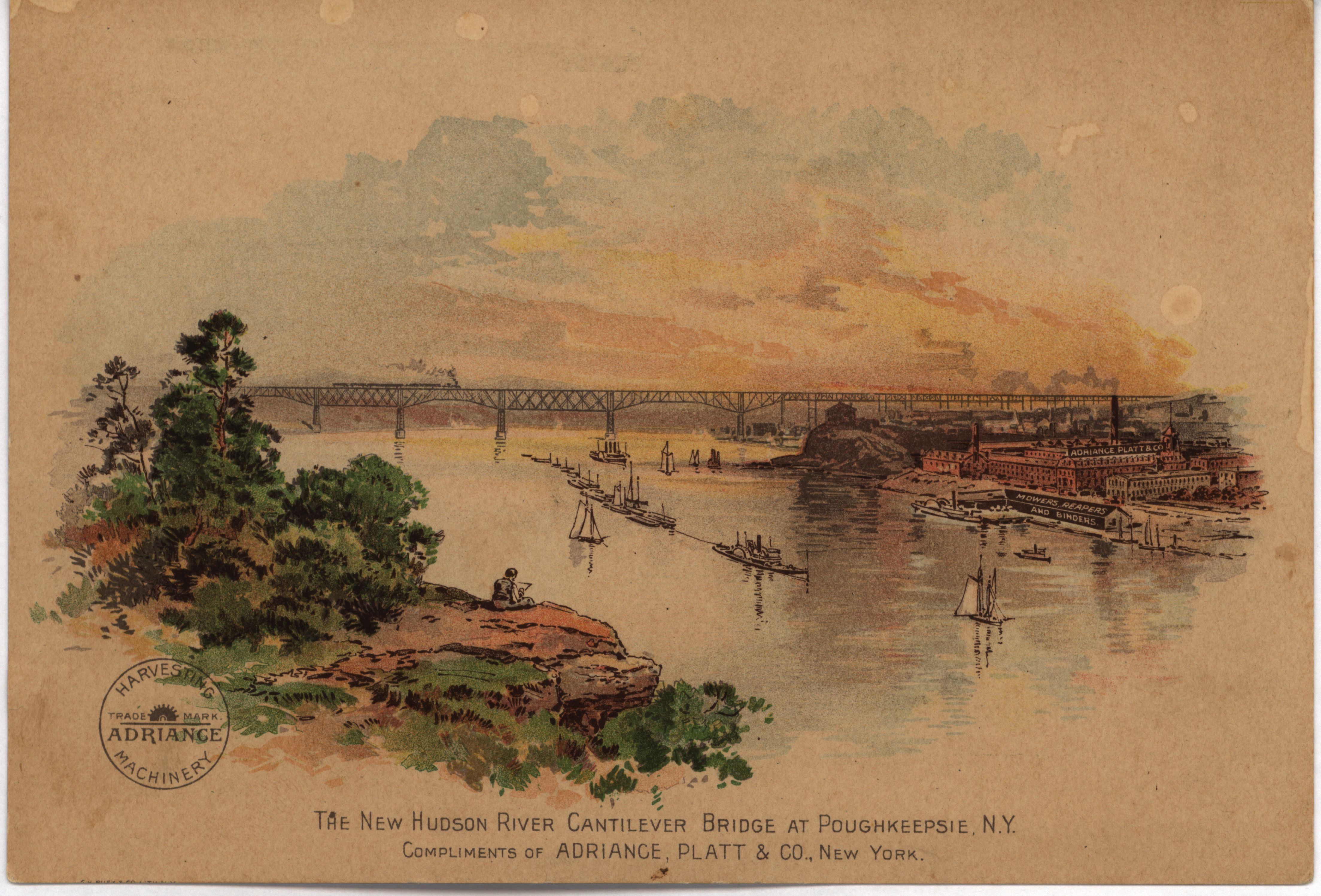 - Illustrated advertisement card for Andriance, Platt and Company rear discharge binder with print the bridge at Poughkeepsie, New York on backside of the advertisement.