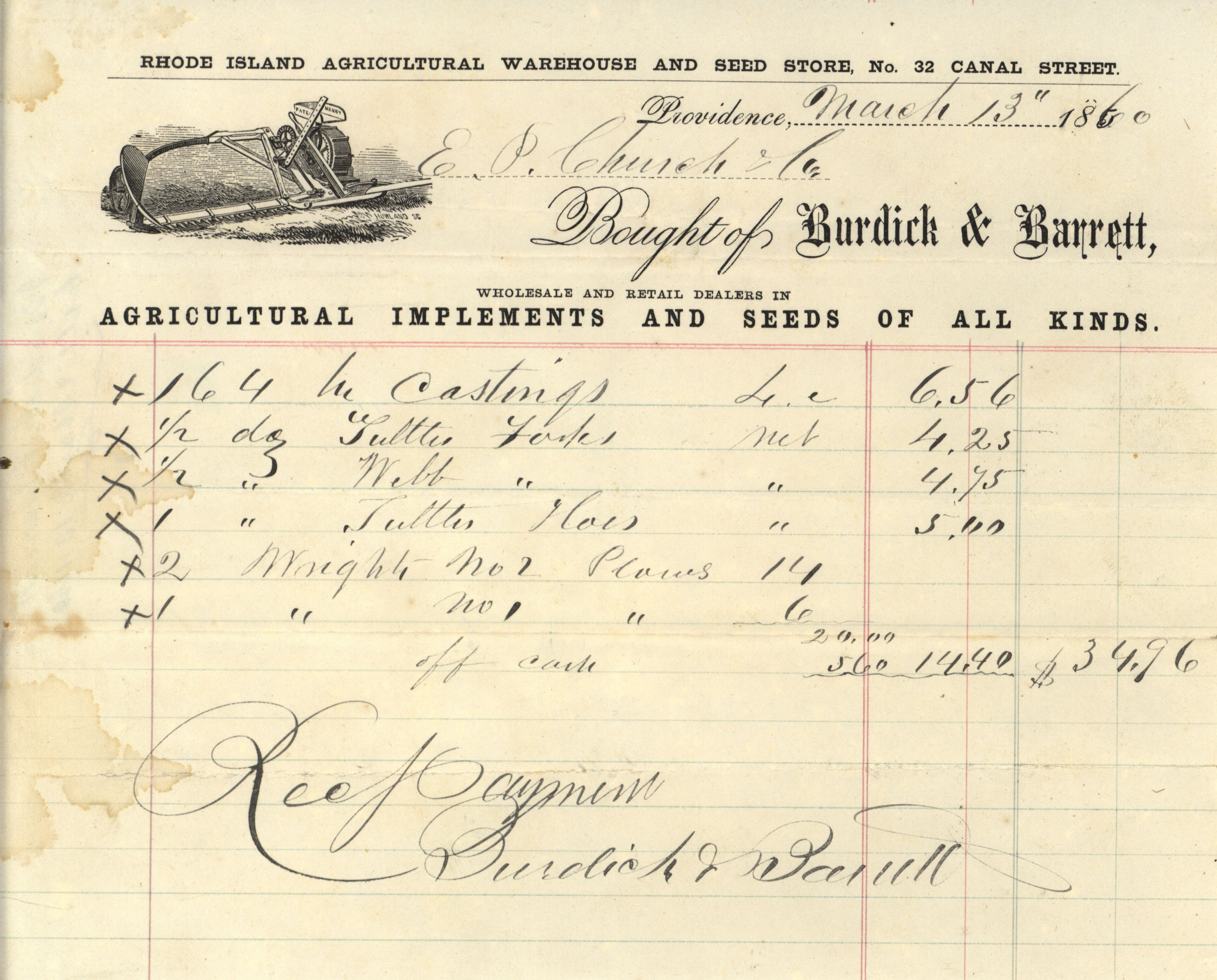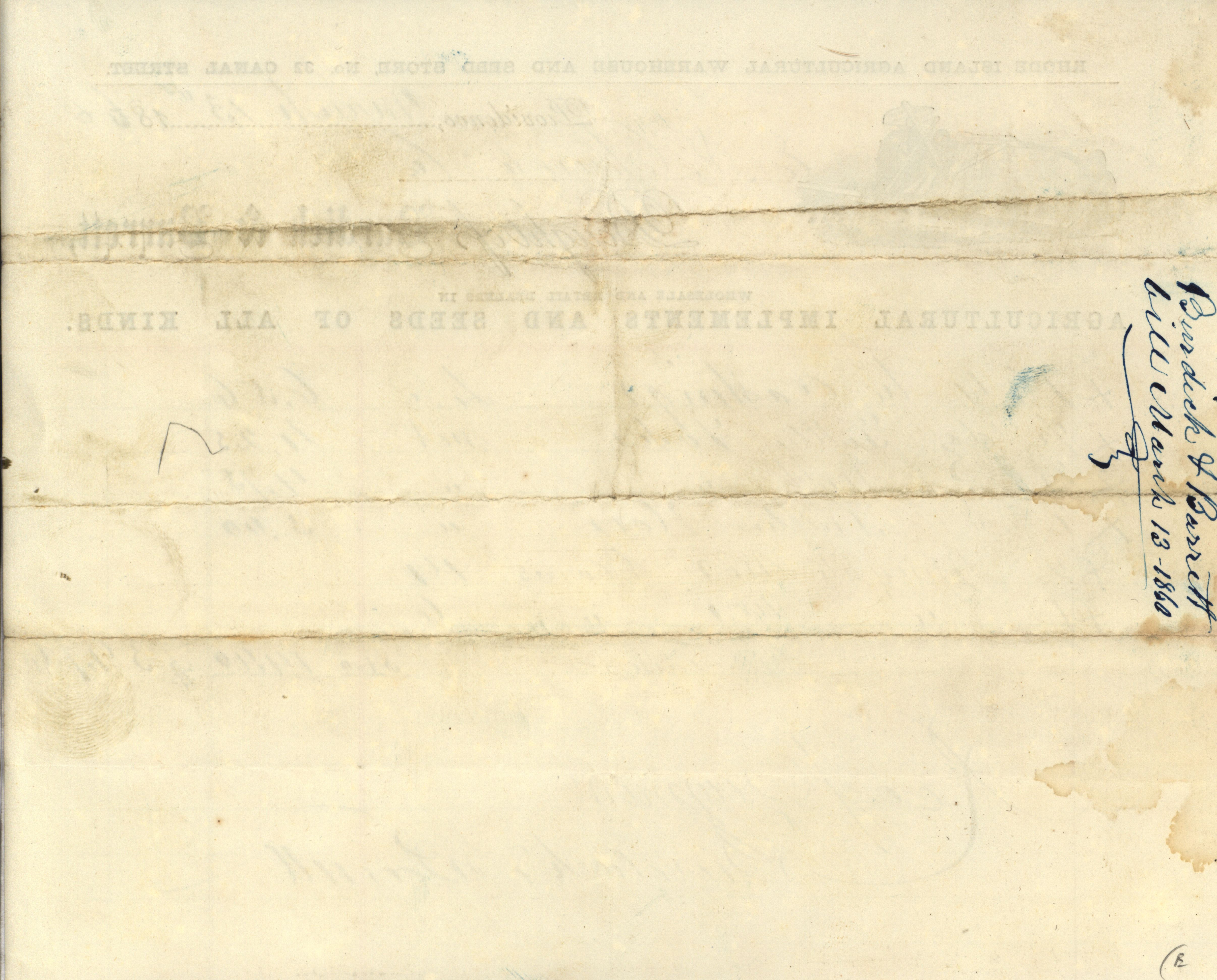 - An order sheet for the Rhode Island Agricultural Warehouse and Seed Store dated March 13, 1860 and signed by Burdick and Barrett.