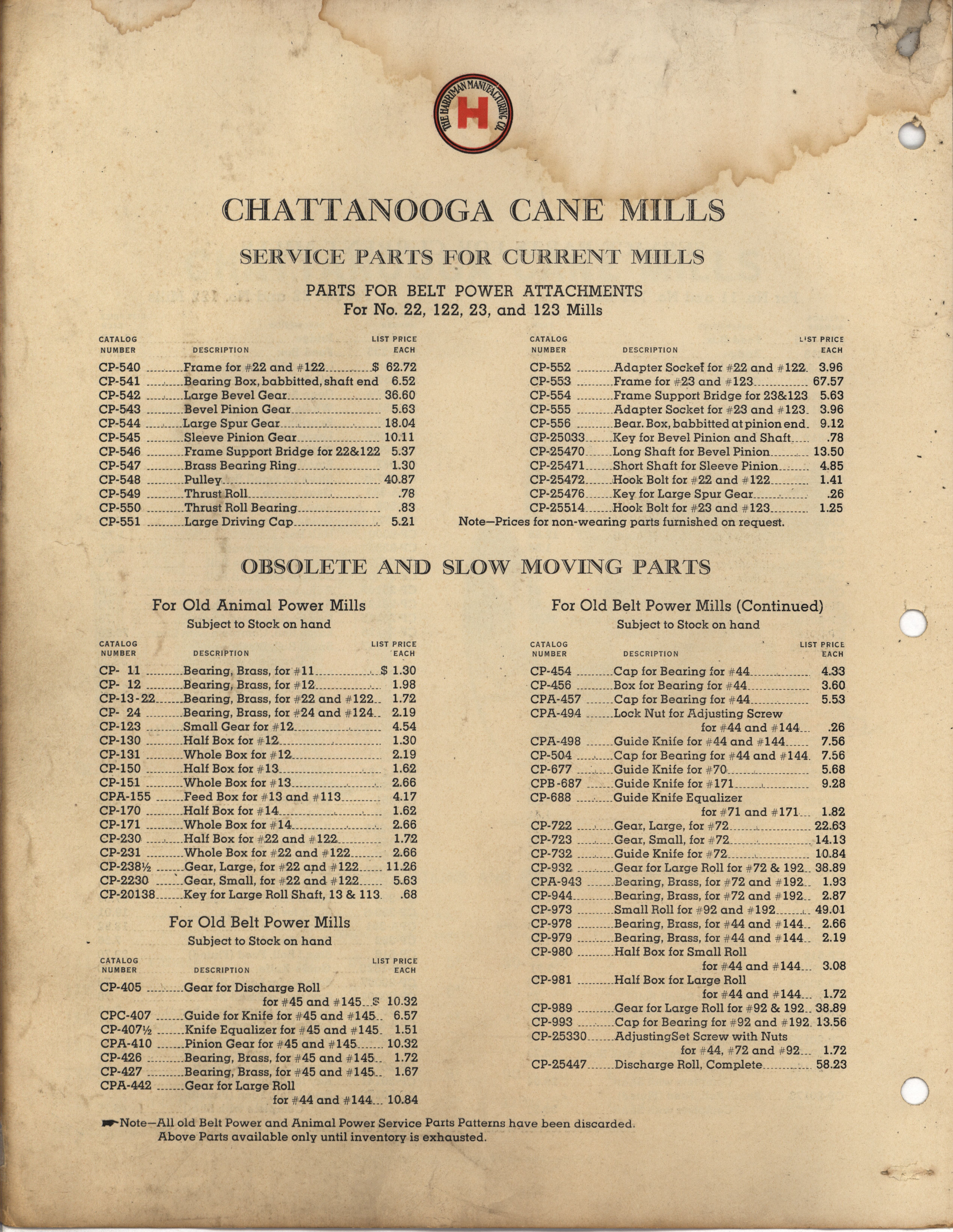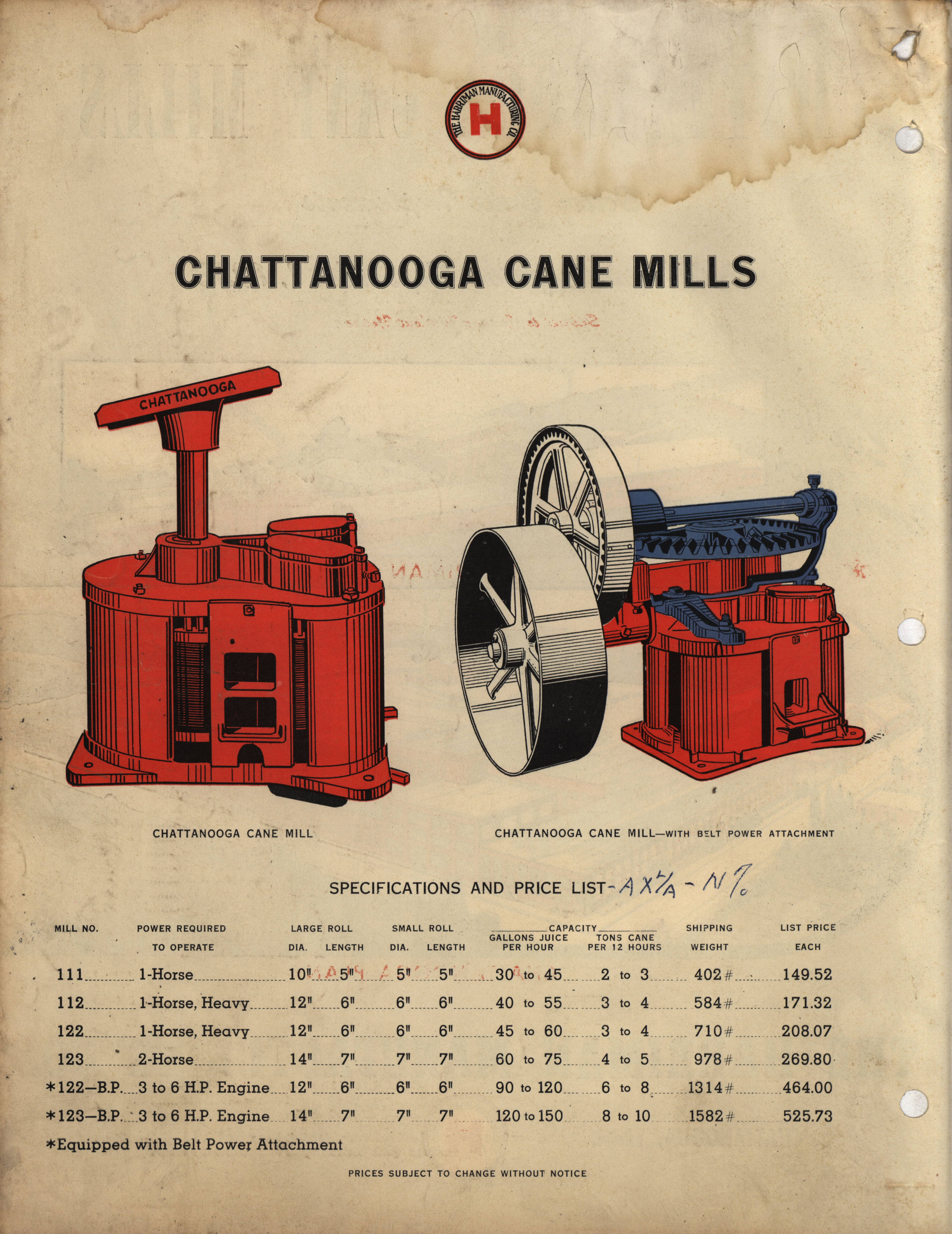 - Illustrated catalog describing the Chattanooga Cane Mills offered by Harriman Manufacturing Company in, includes a price list.