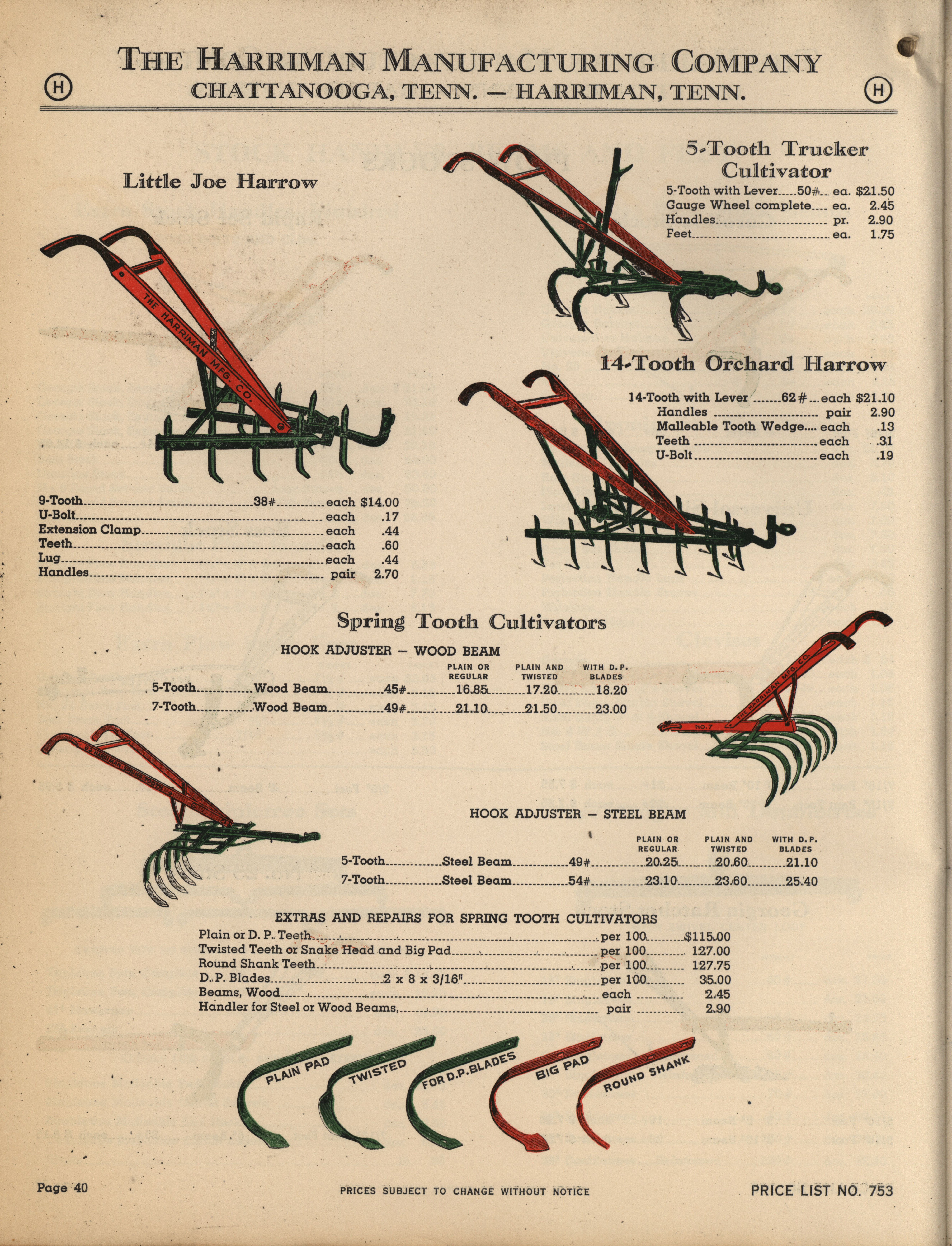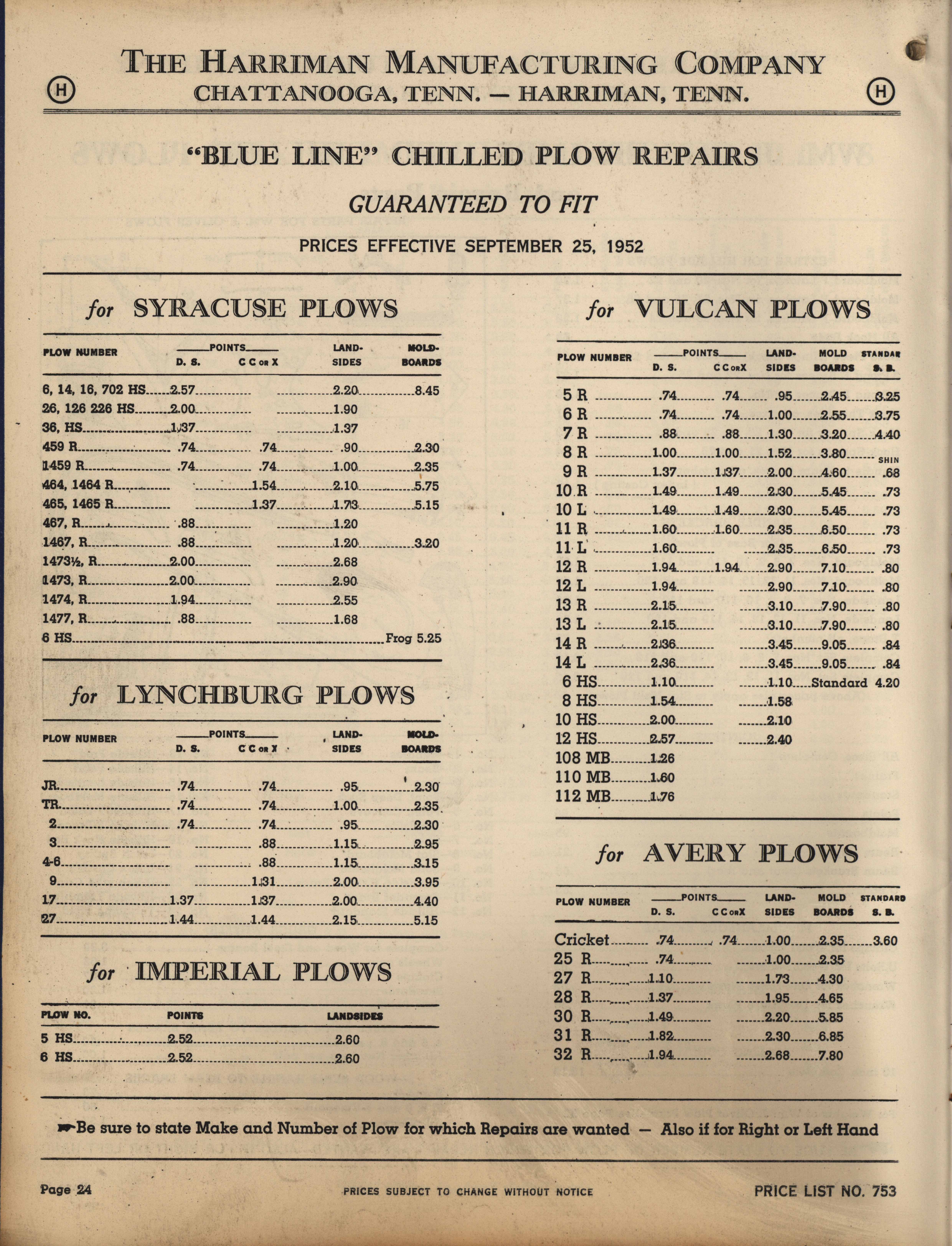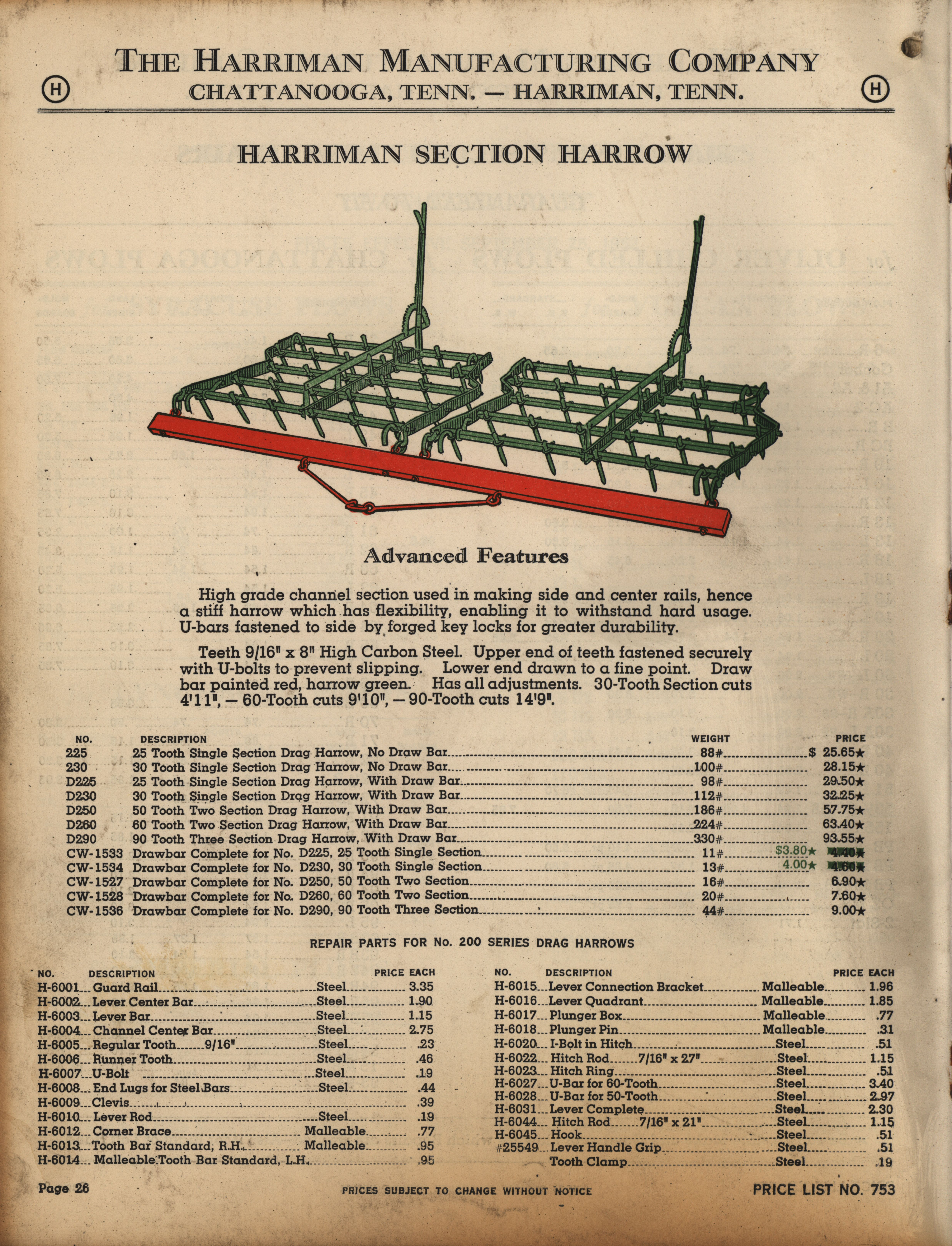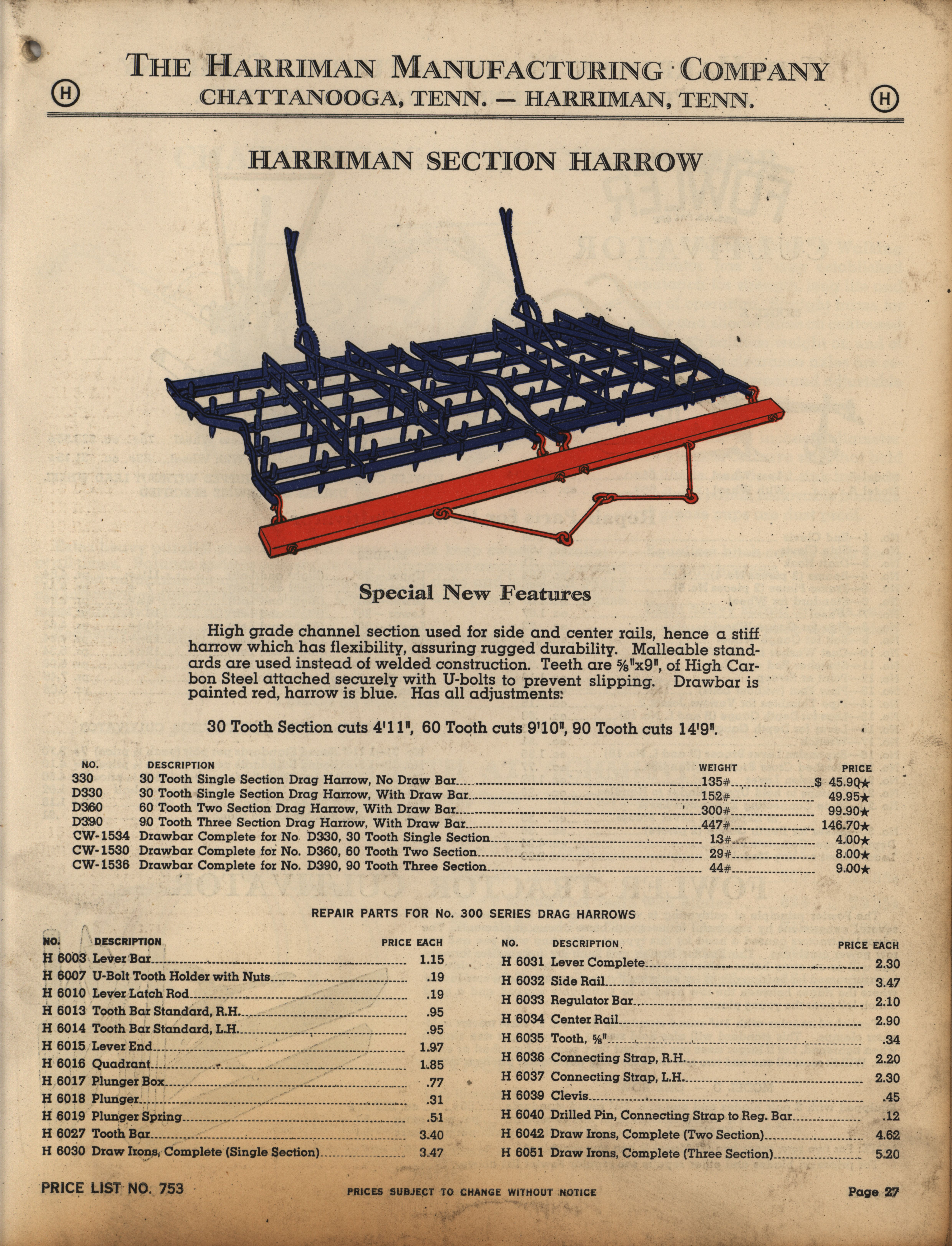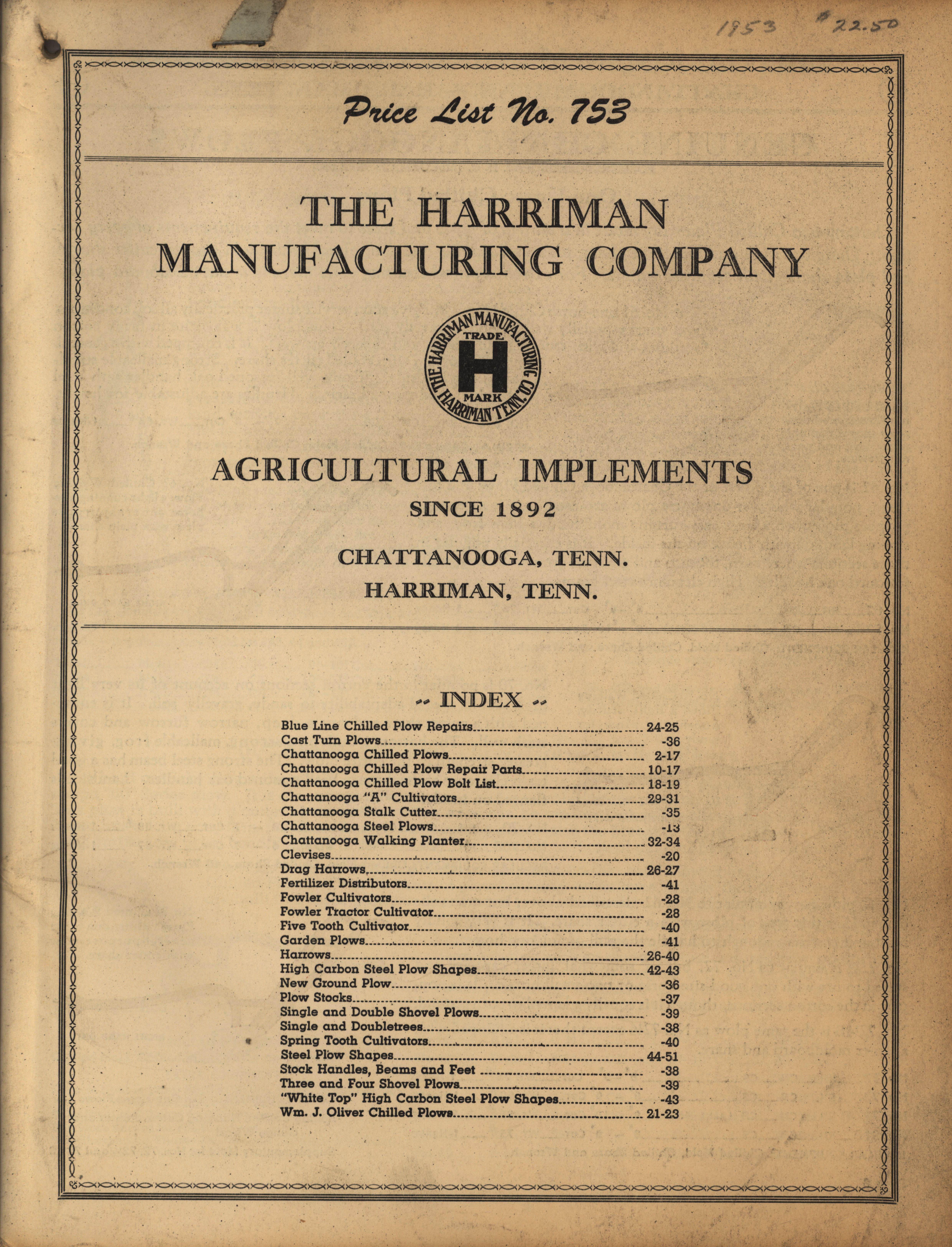 - Illustrated catalog describing the agricultural implements offered by Harriman Manufacturing Company in 1953, includes price list.