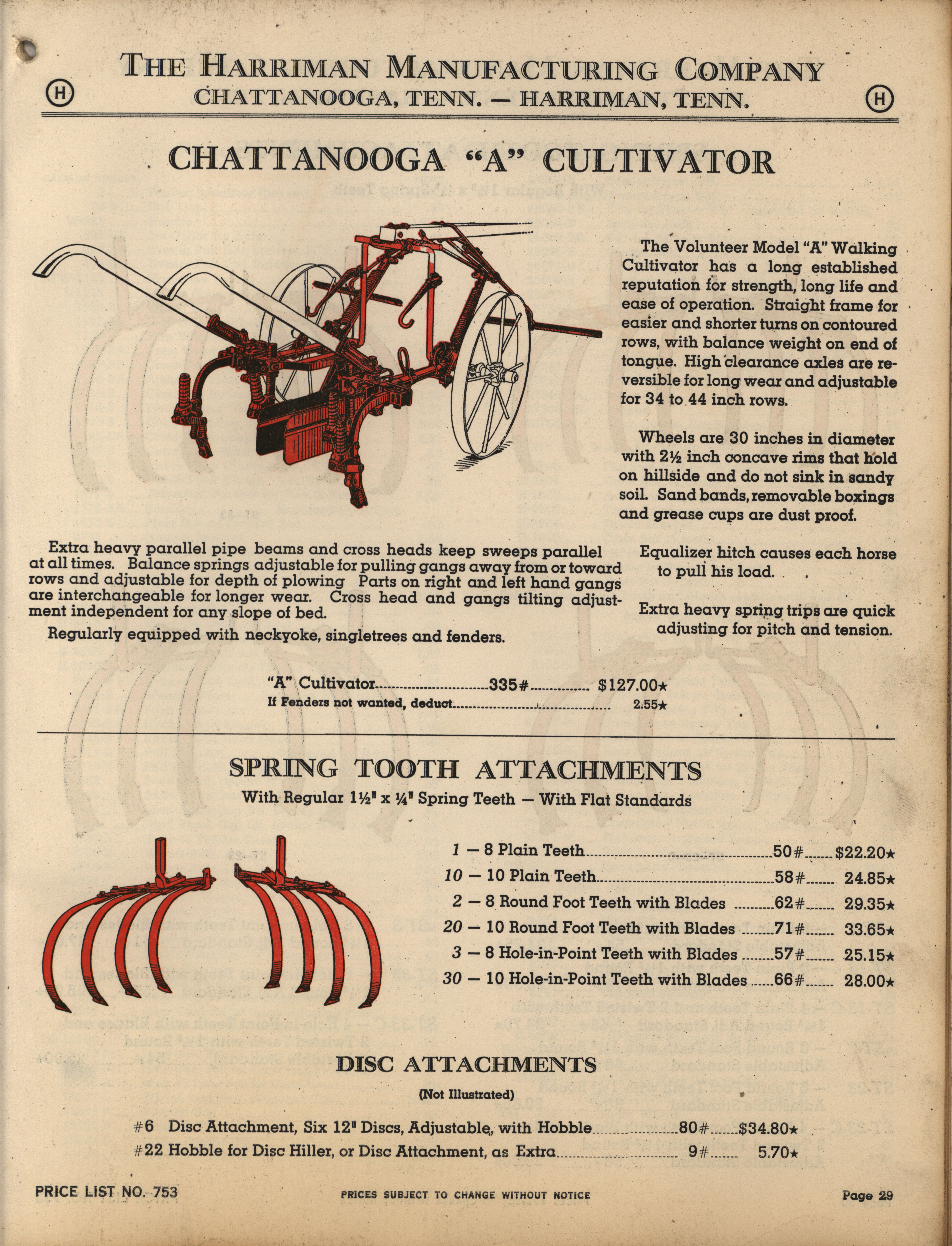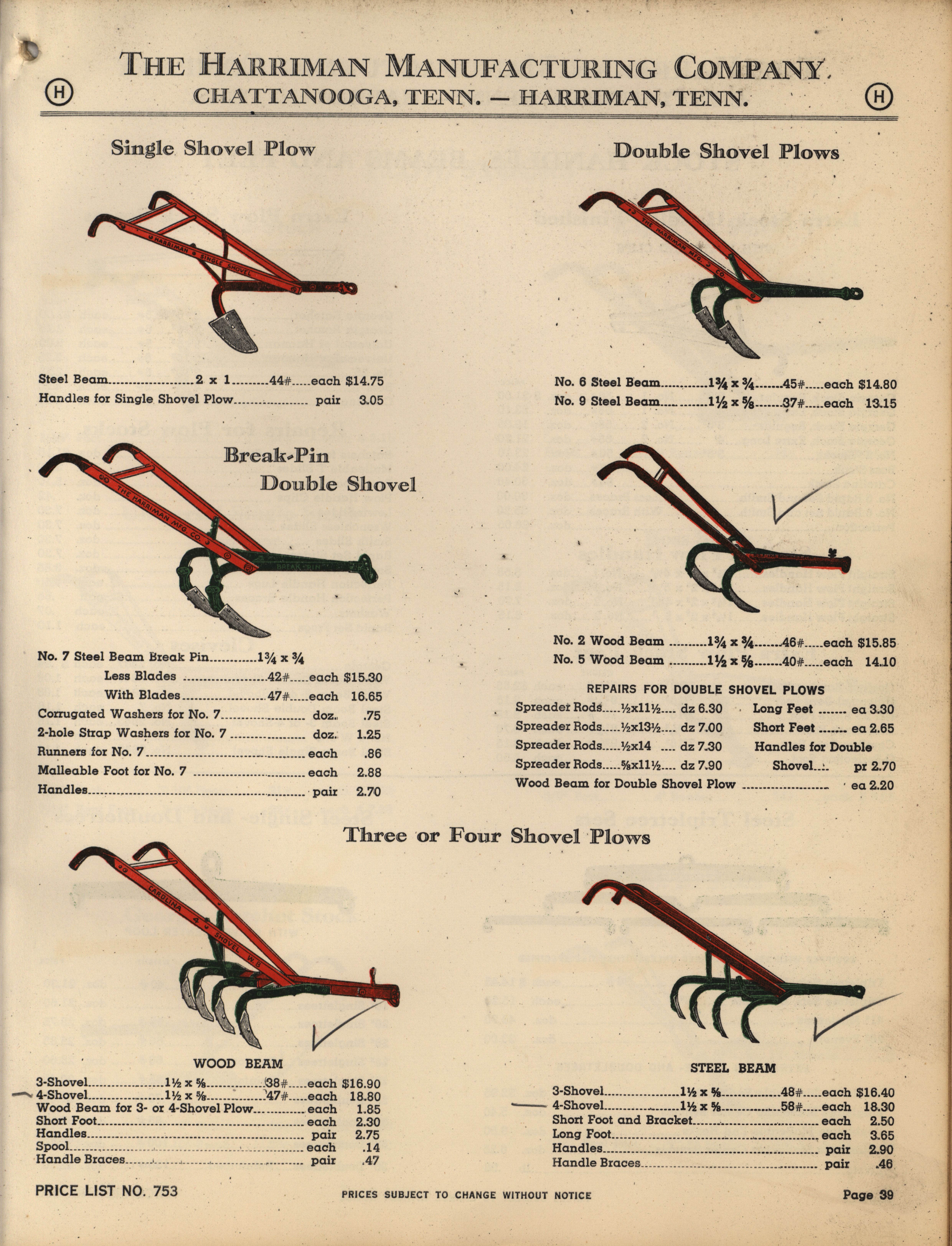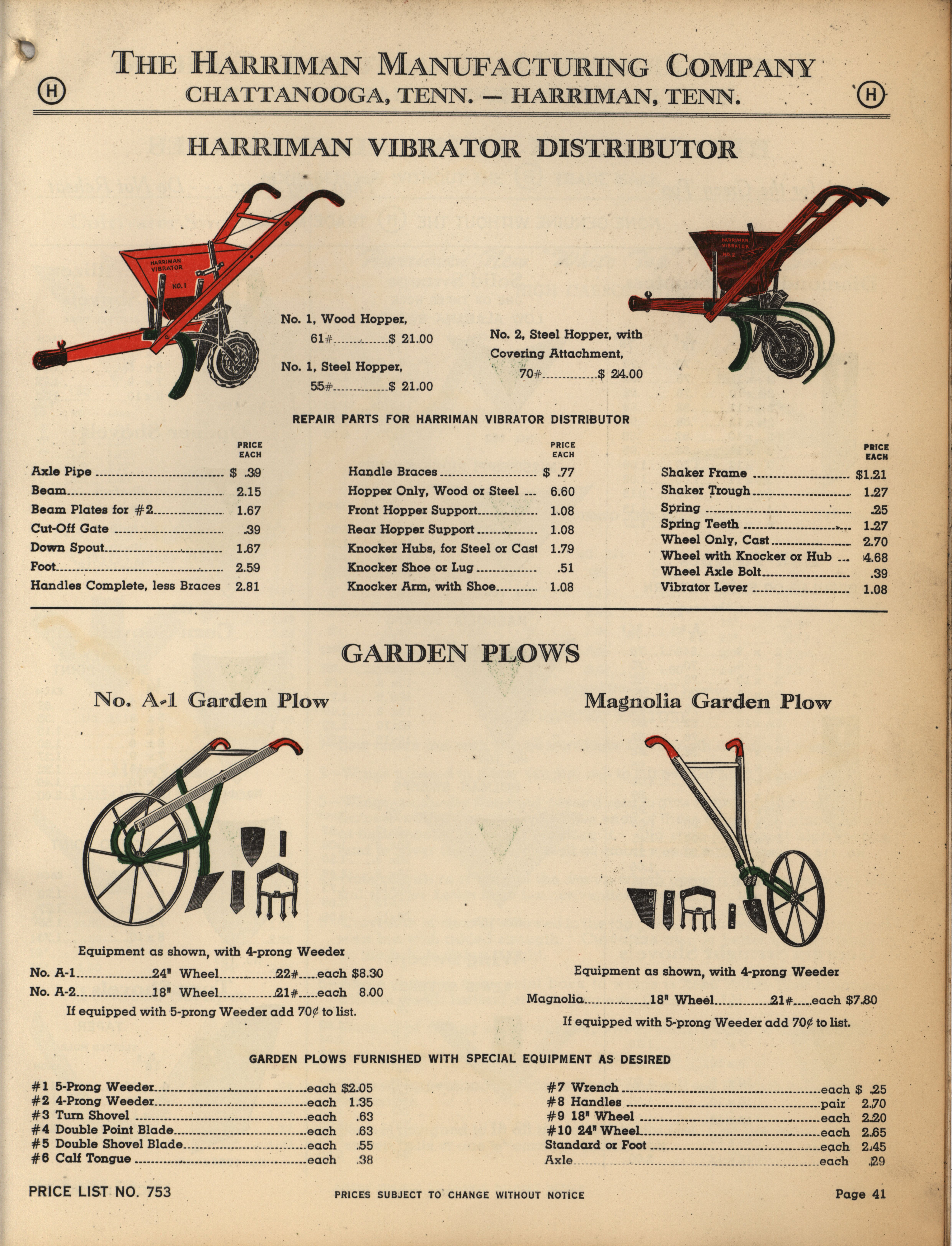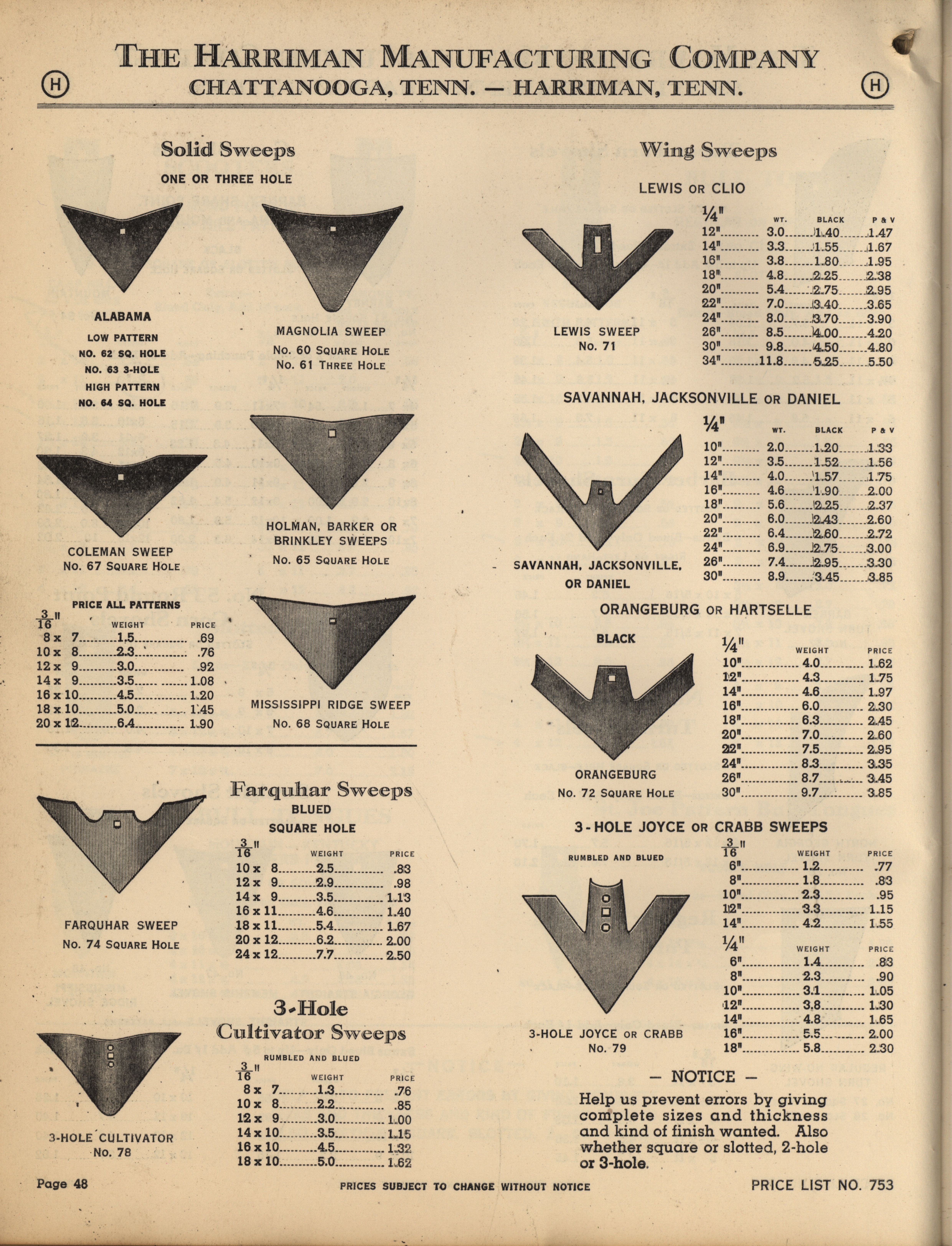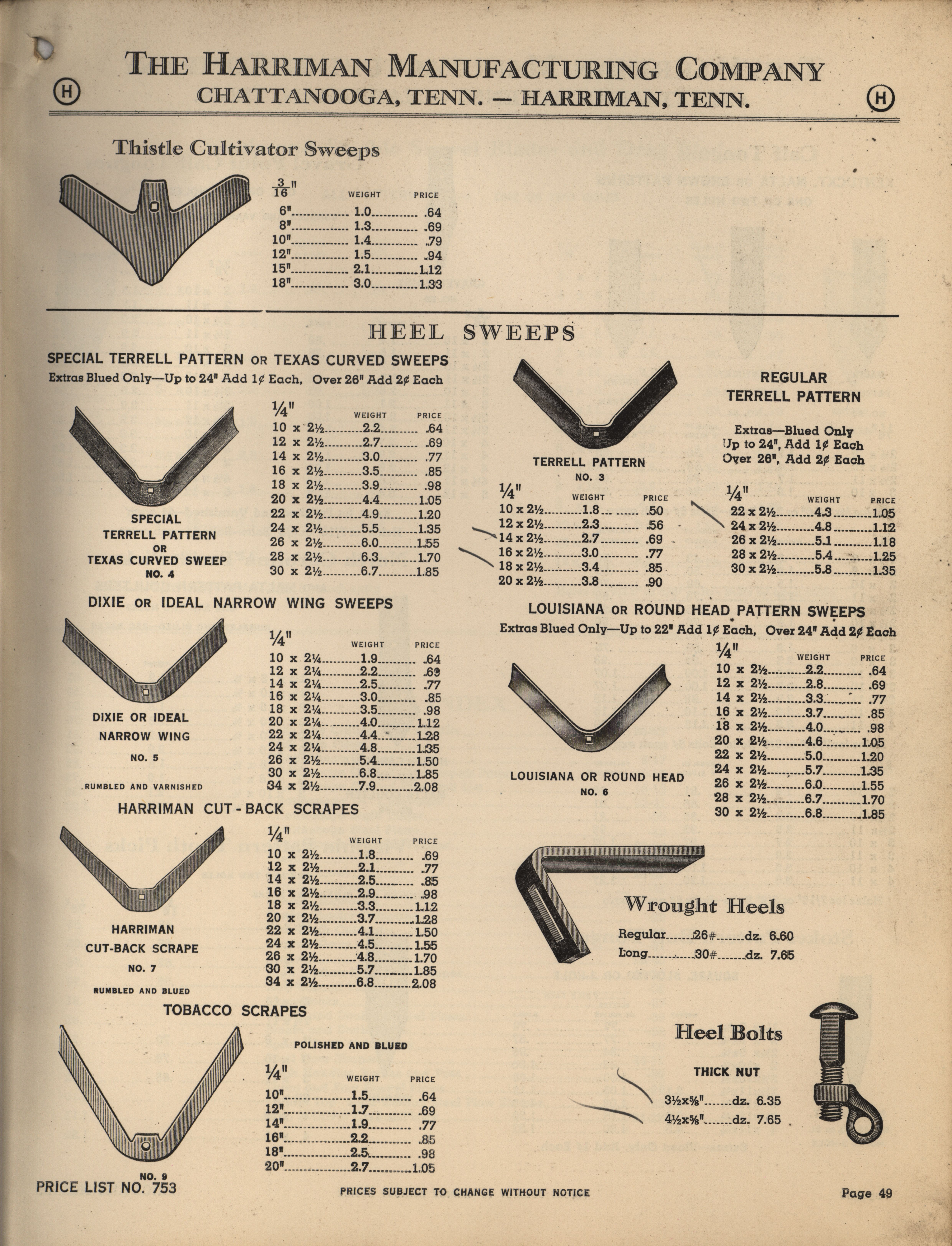 - Illustrated catalog describing the agricultural implements offered by Harriman Manufacturing Company in 1953, includes price list.