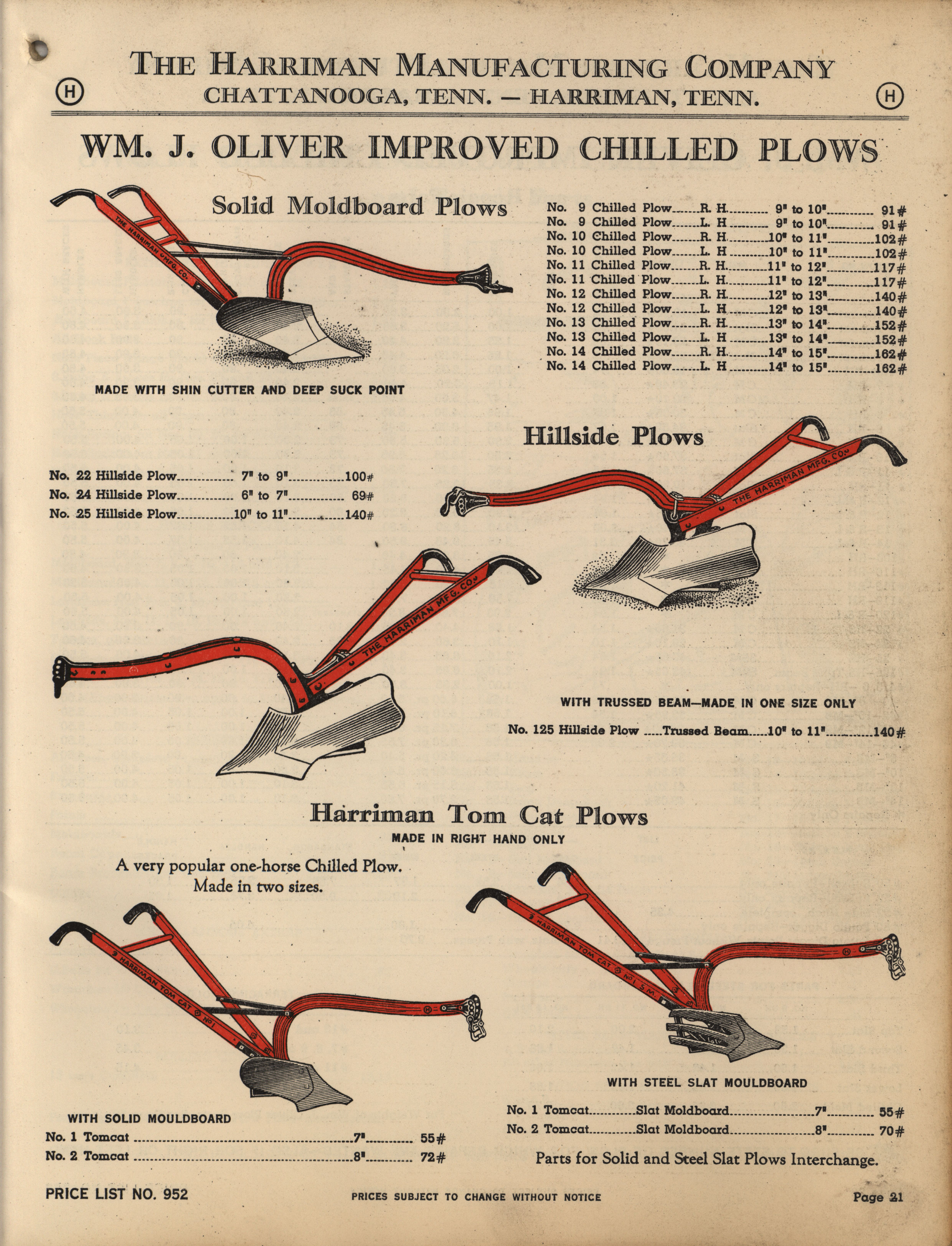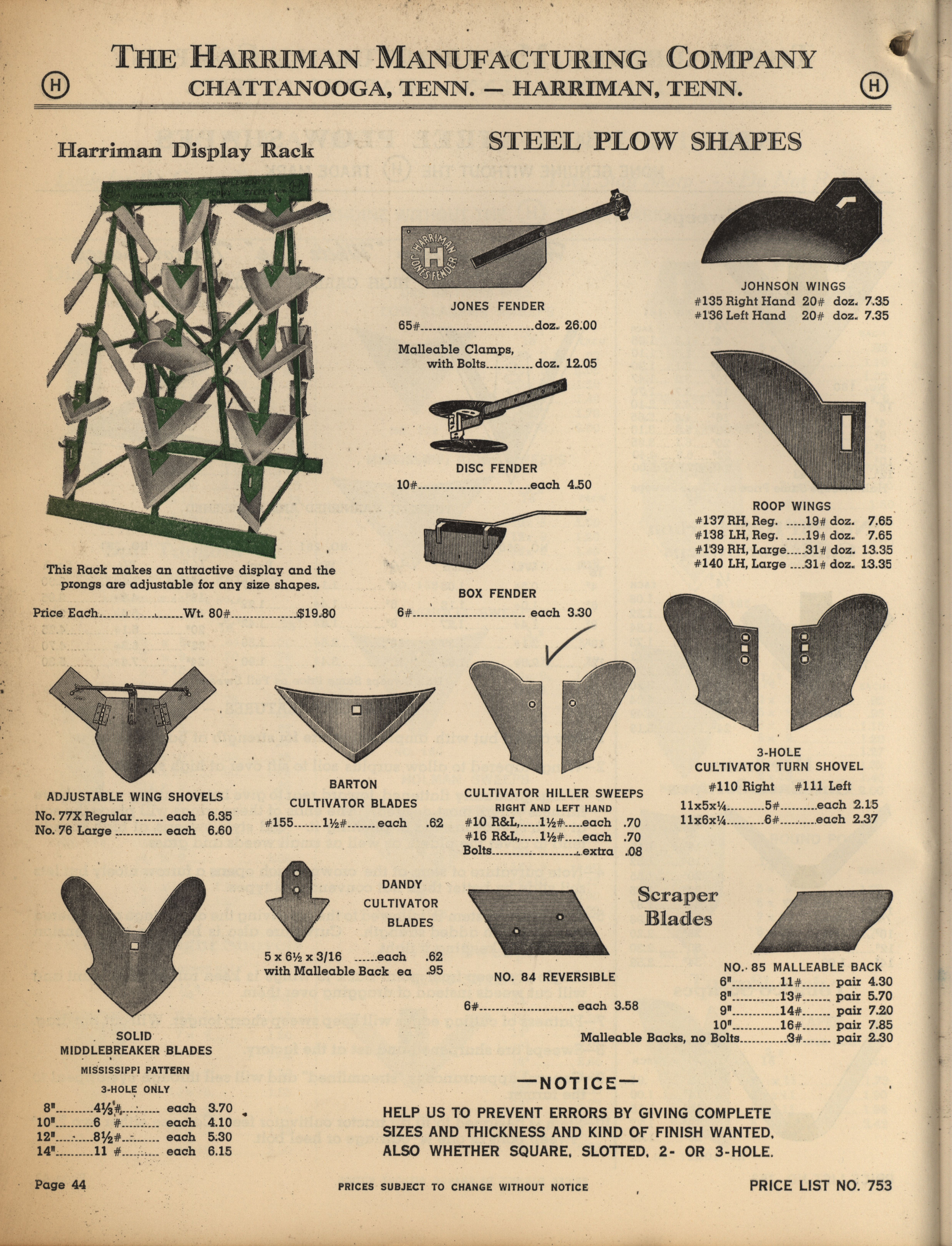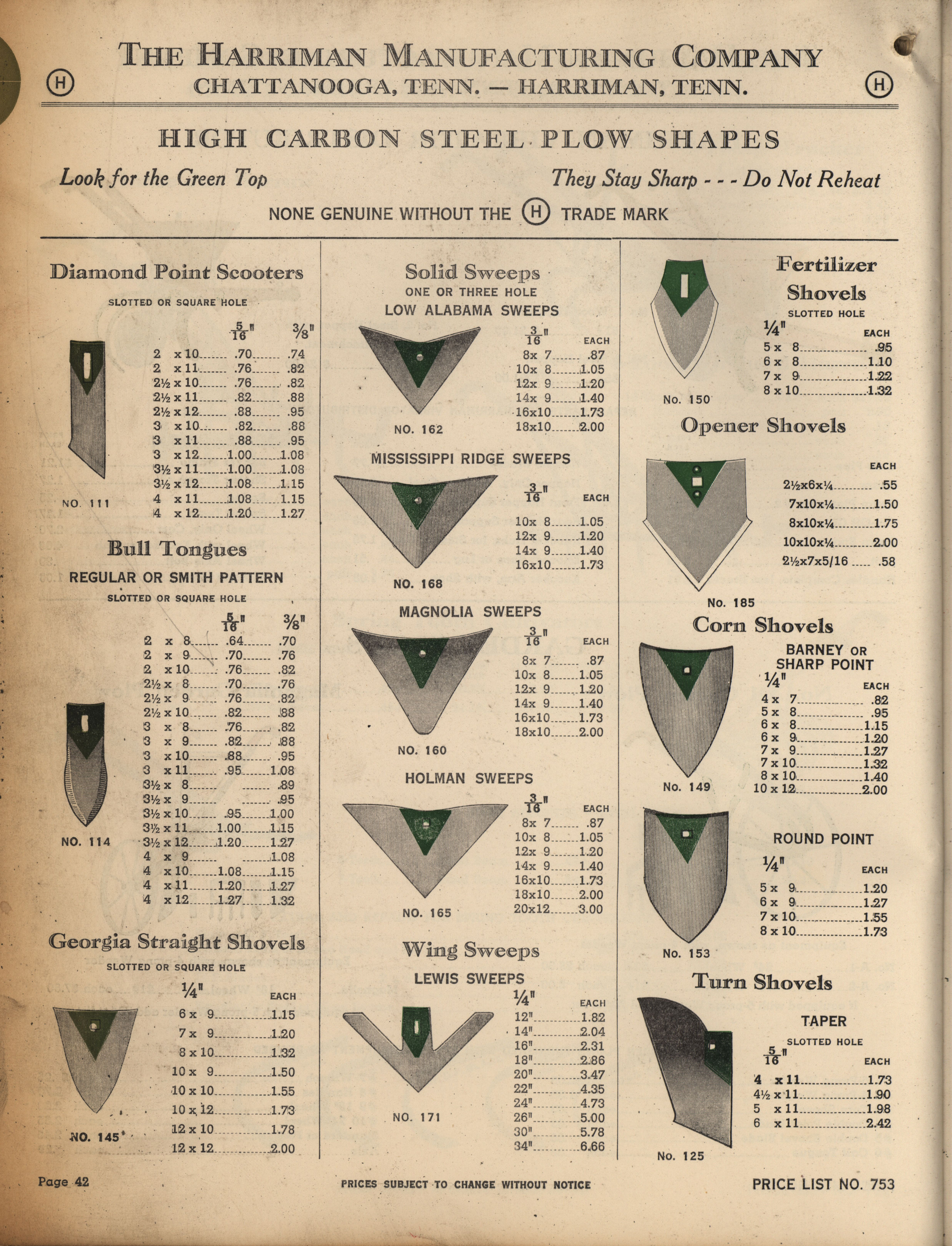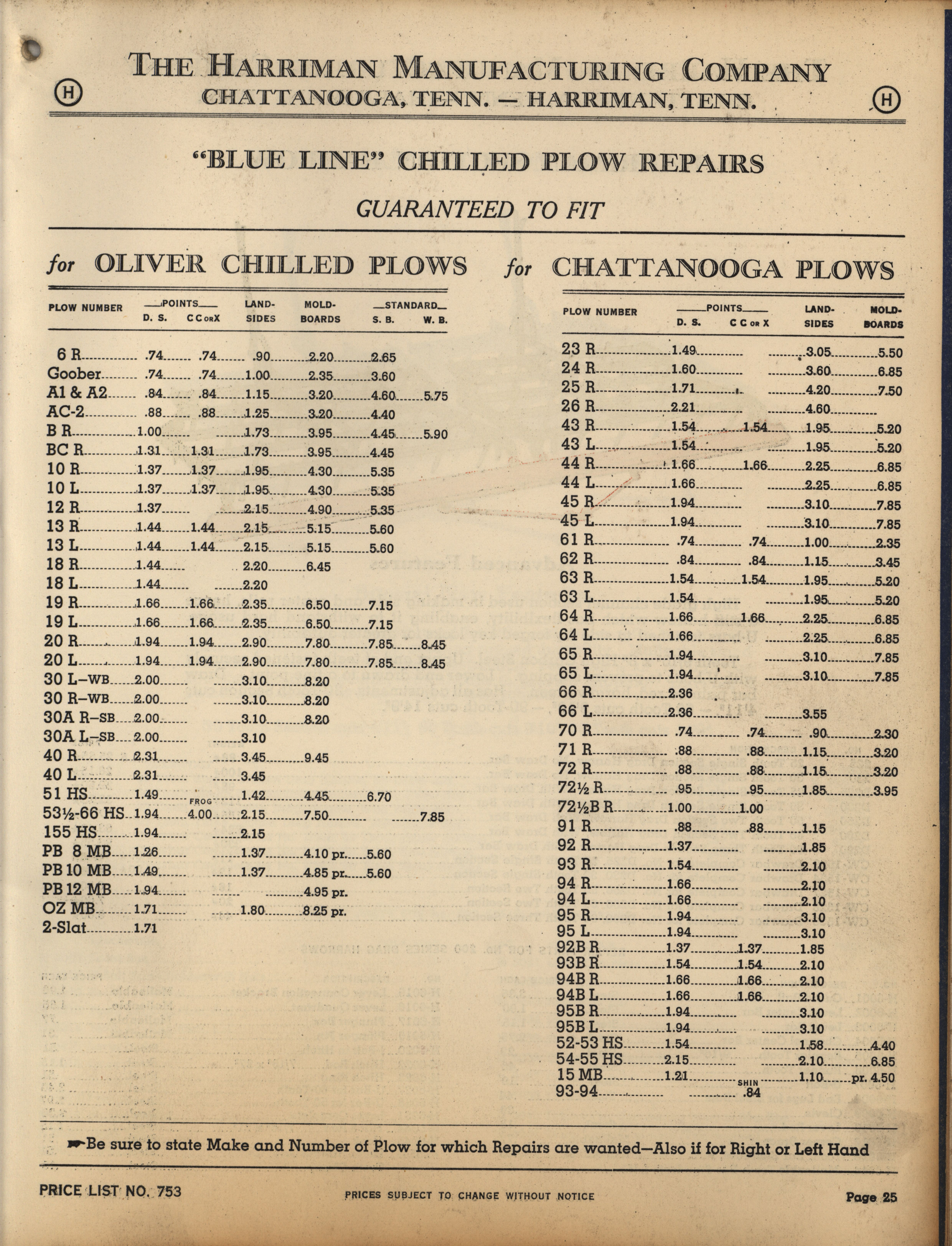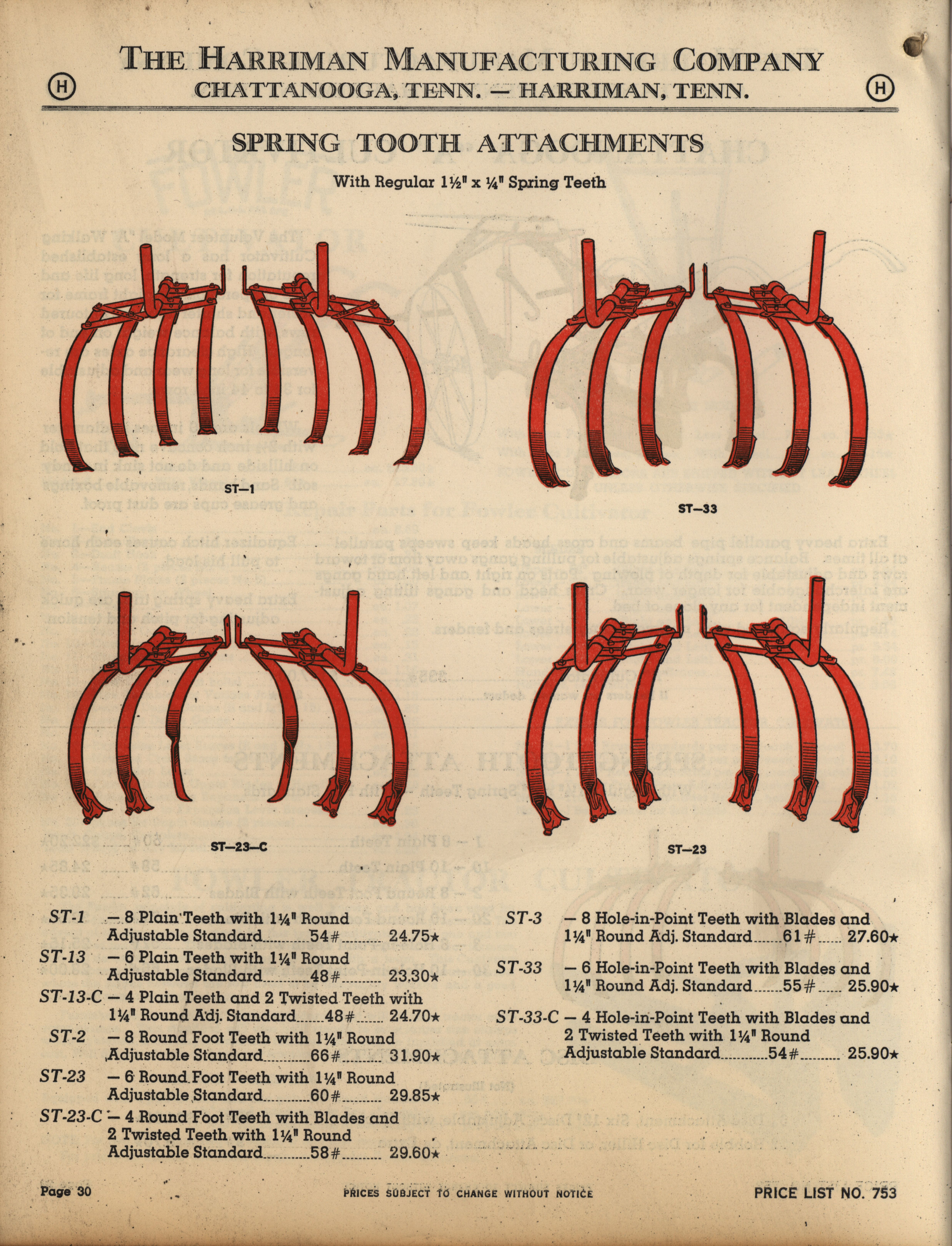 - Illustrated catalog describing the agricultural implements offered by Harriman Manufacturing Company in 1953, includes price list.