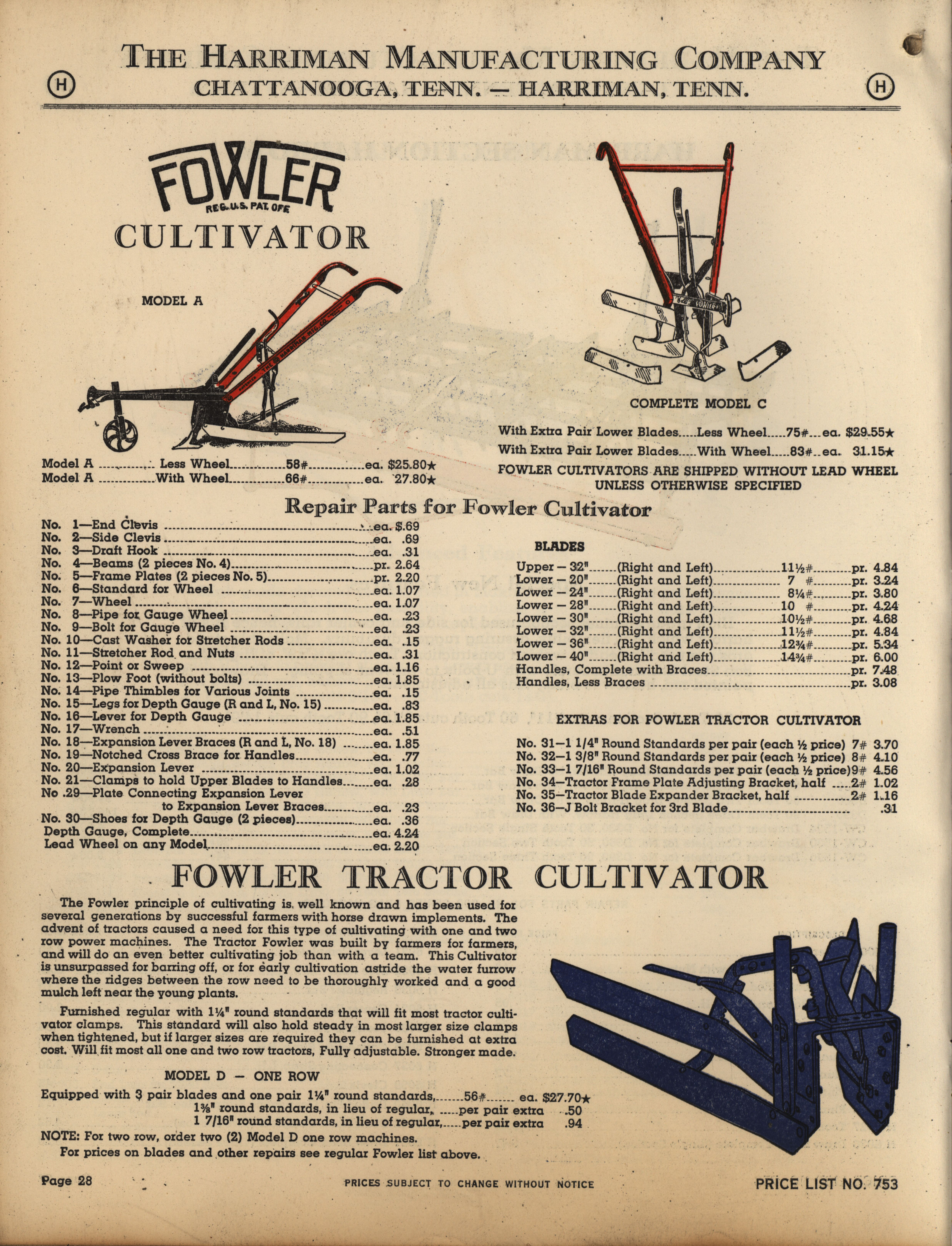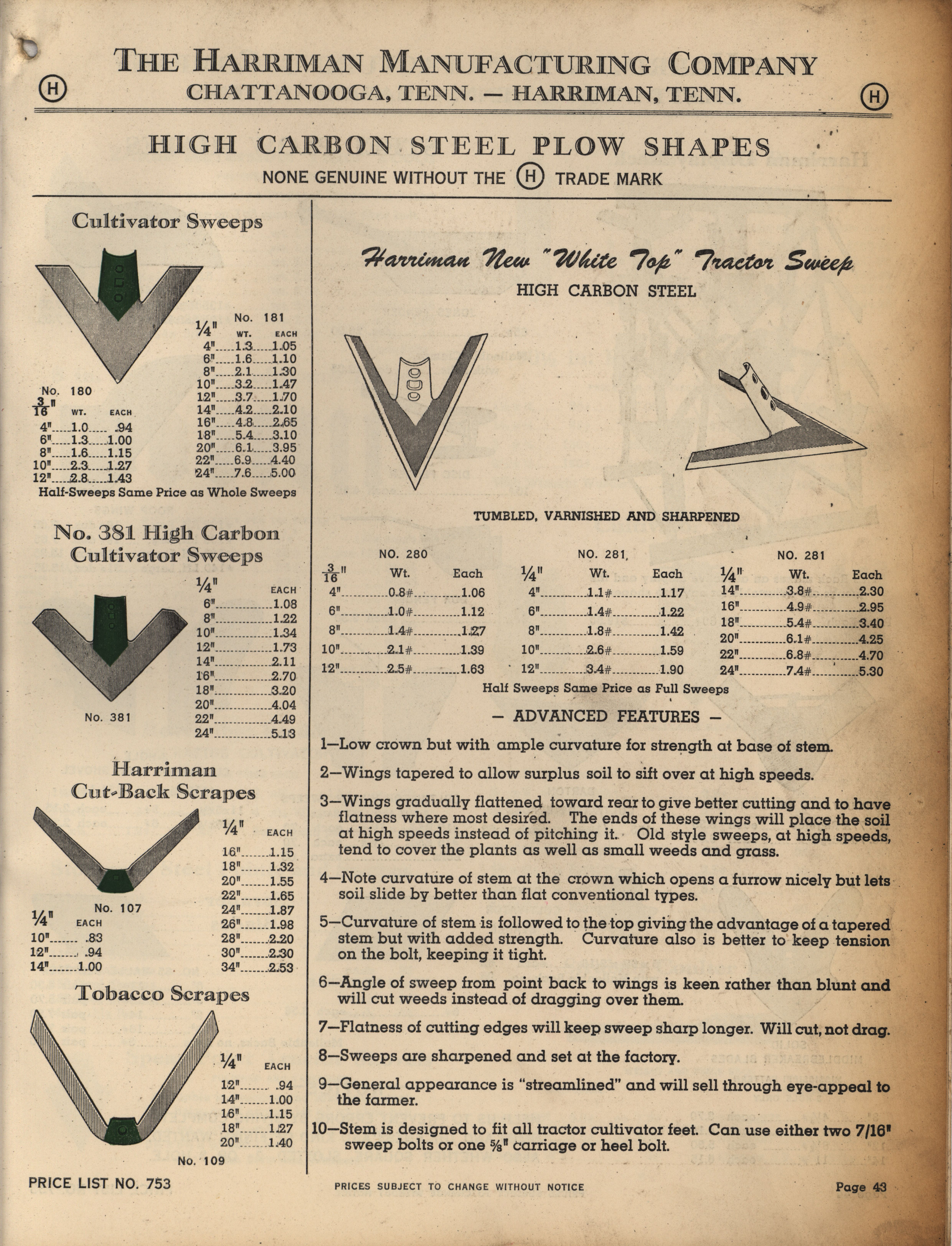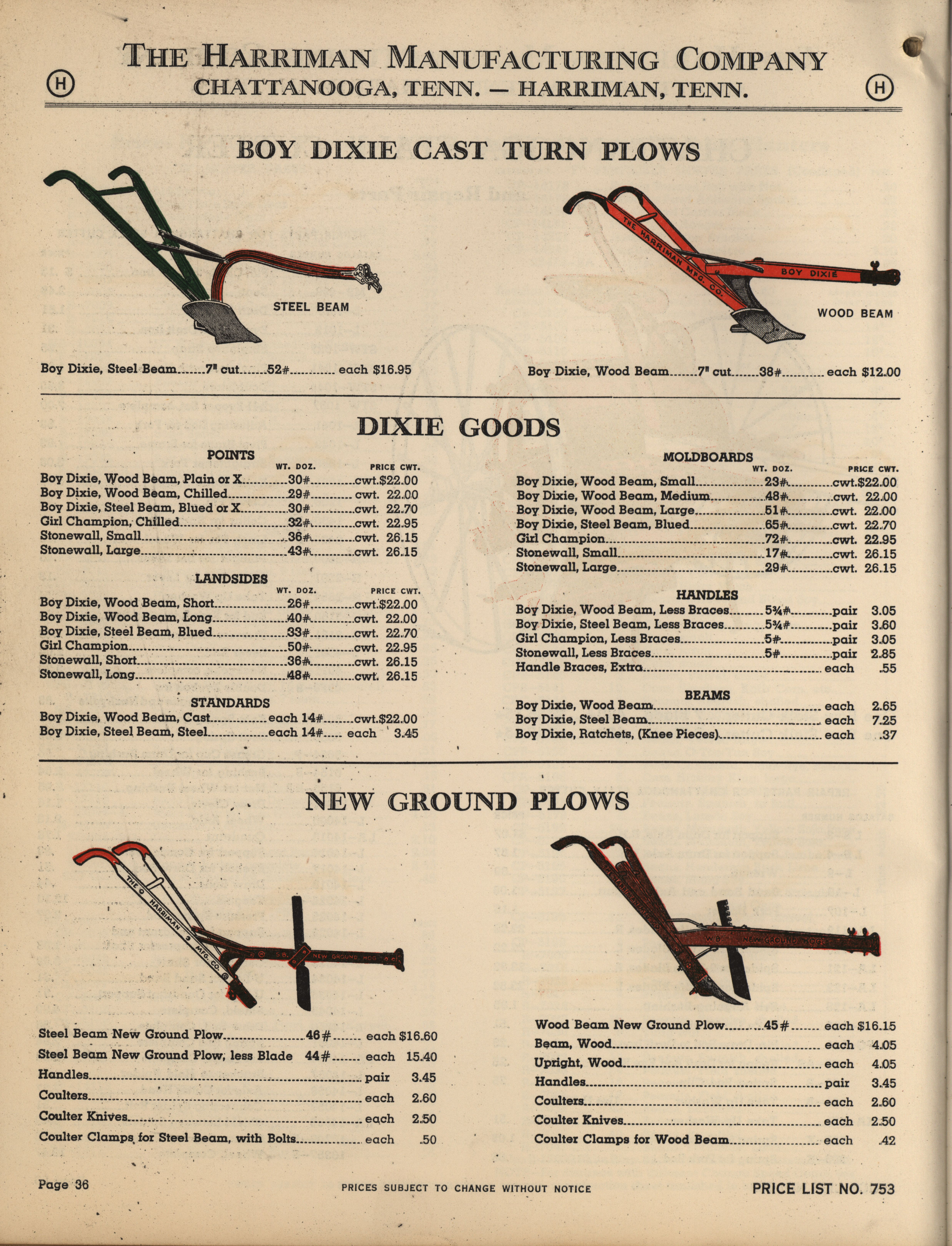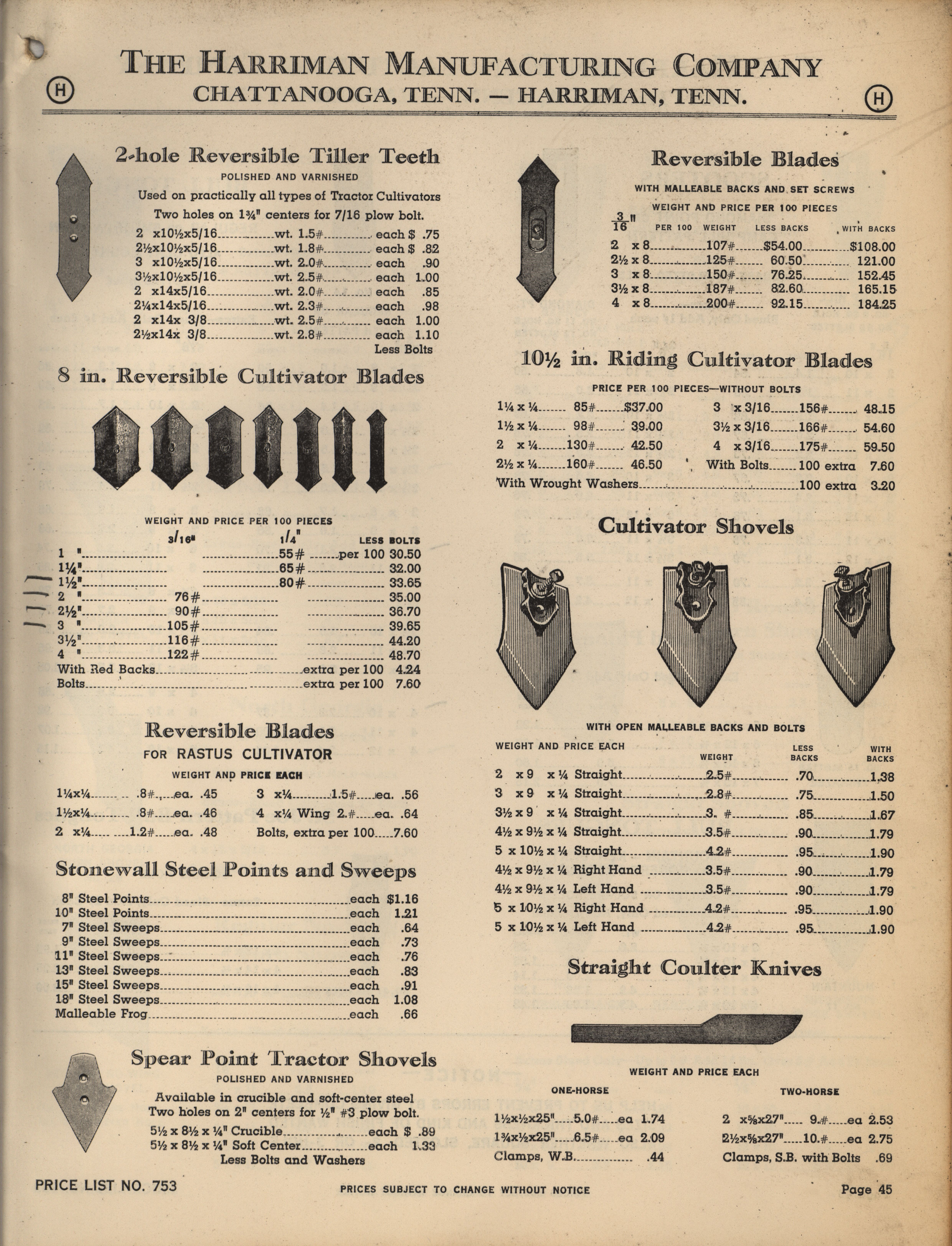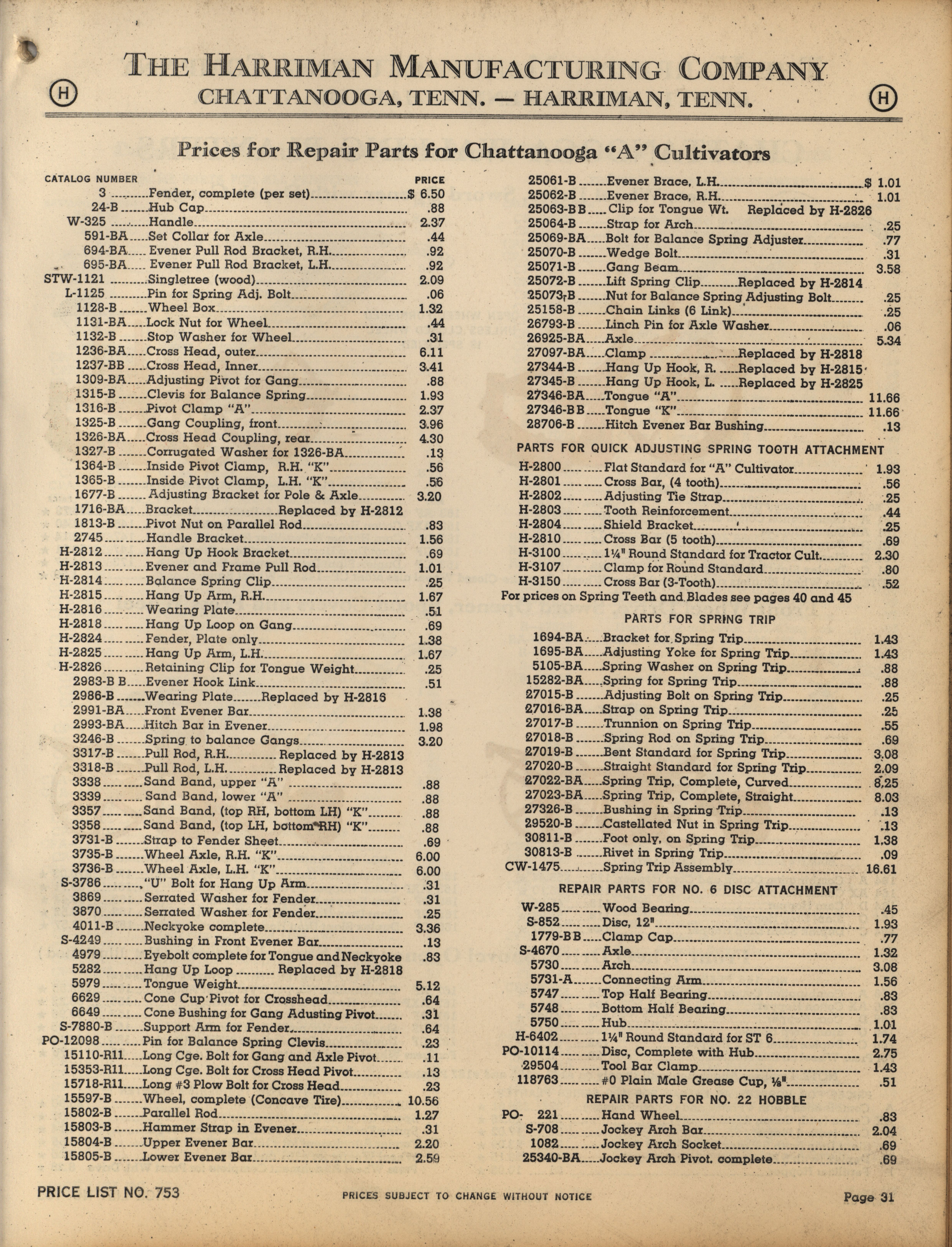 - Illustrated catalog describing the agricultural implements offered by Harriman Manufacturing Company in 1953, includes price list.