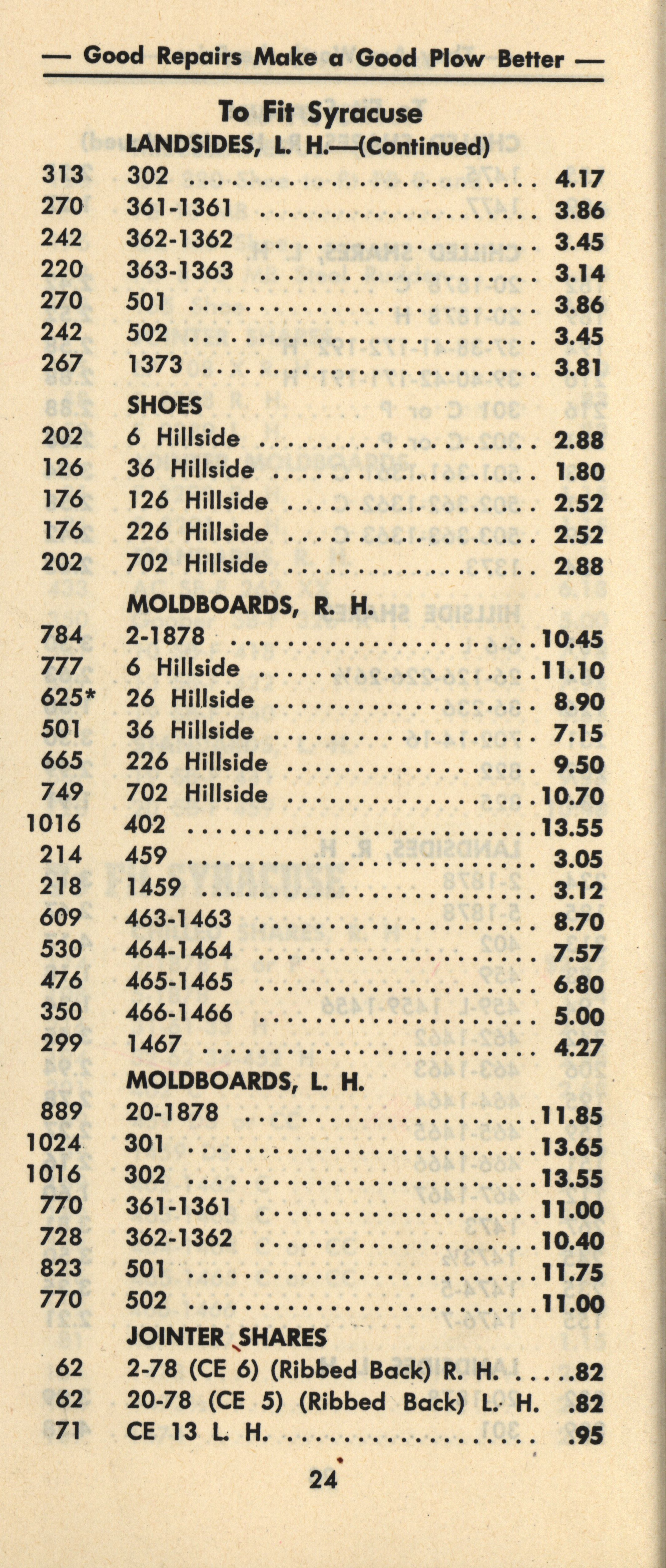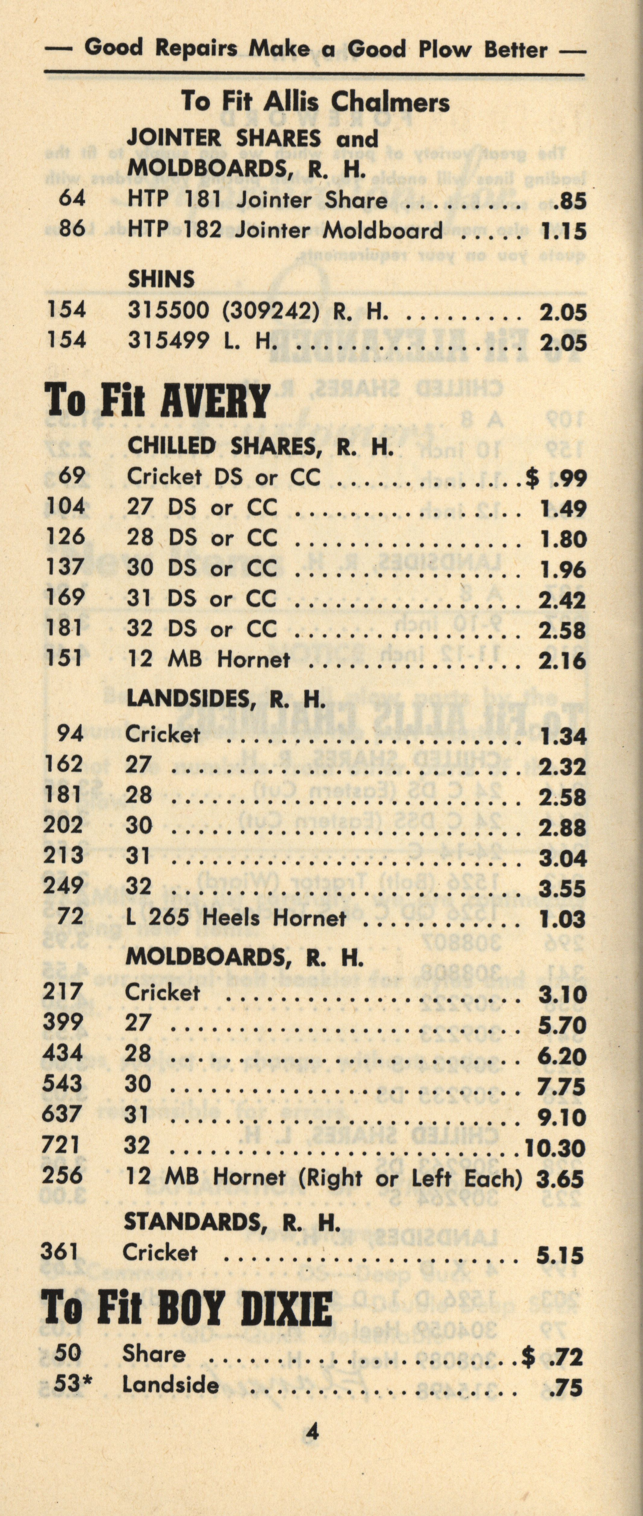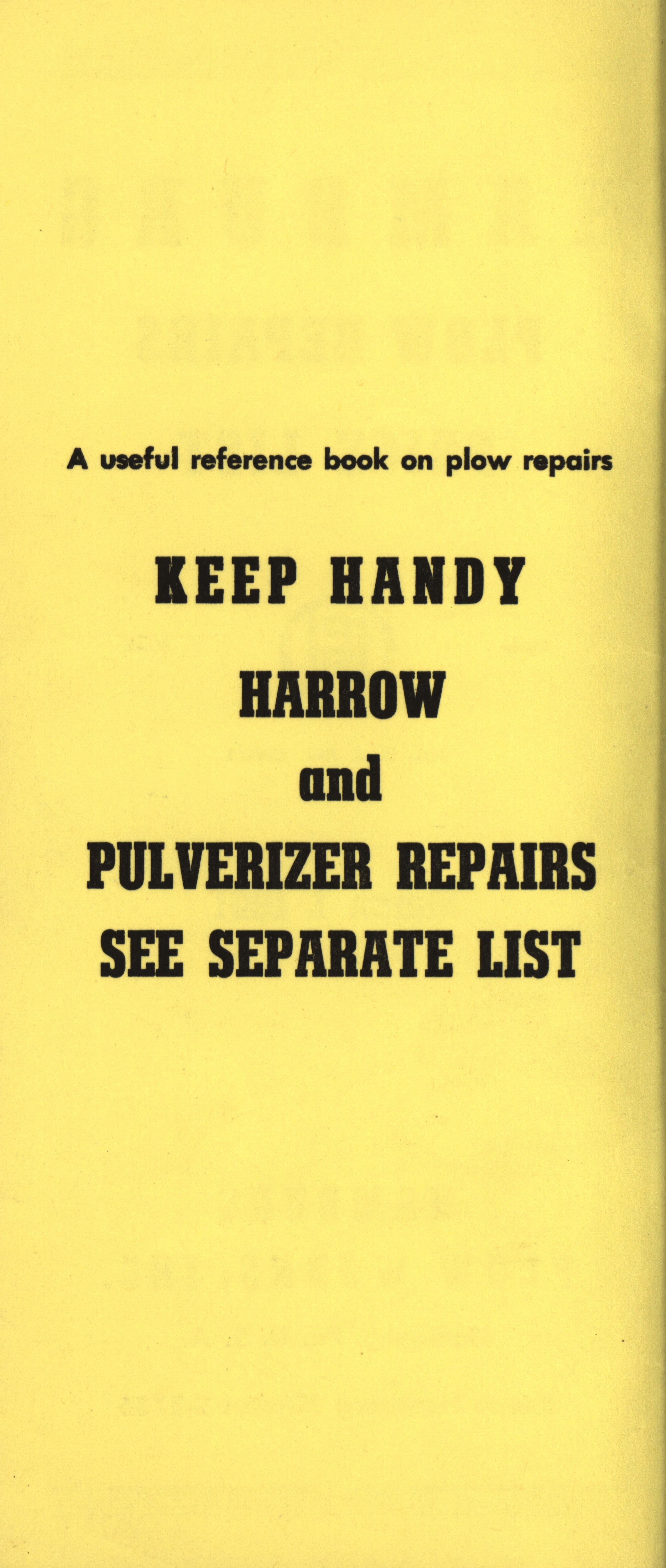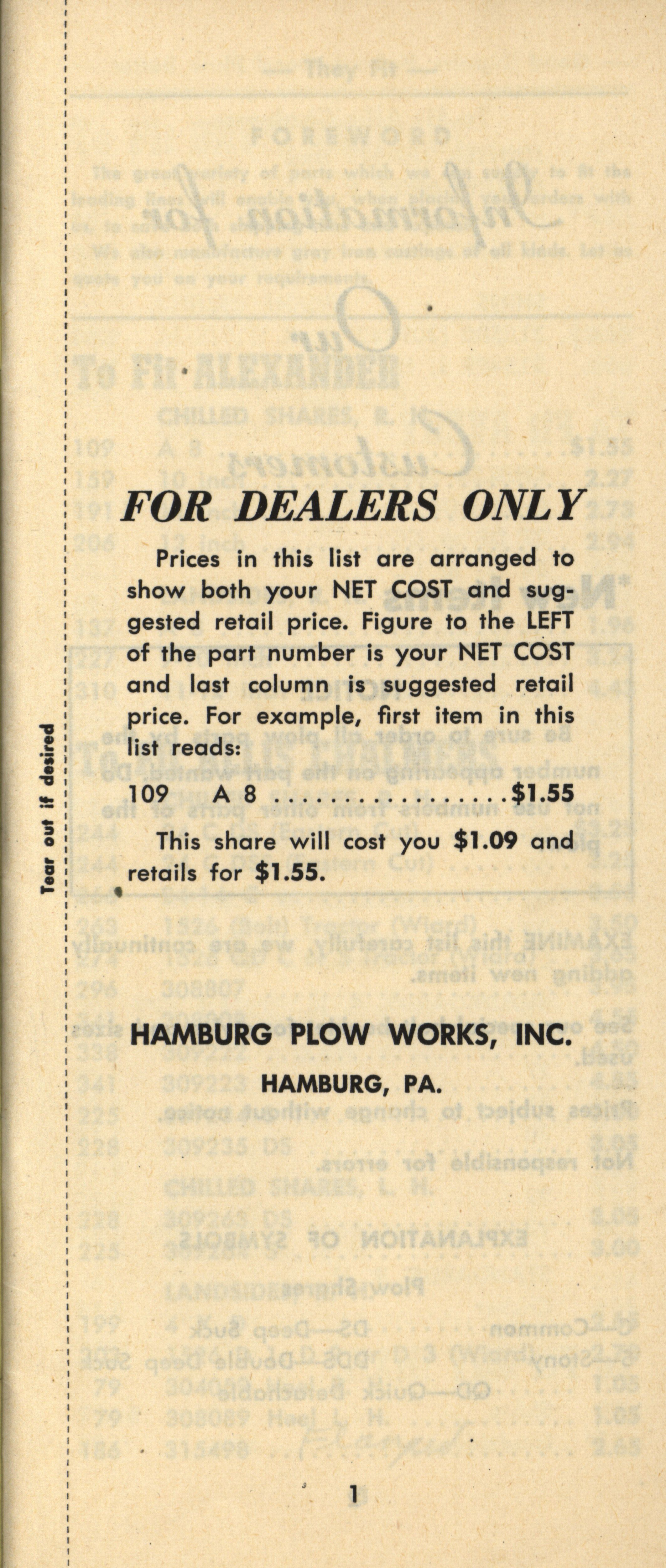 - Price list for repairs and parts offered by Hamburg Plow Works in 1961.