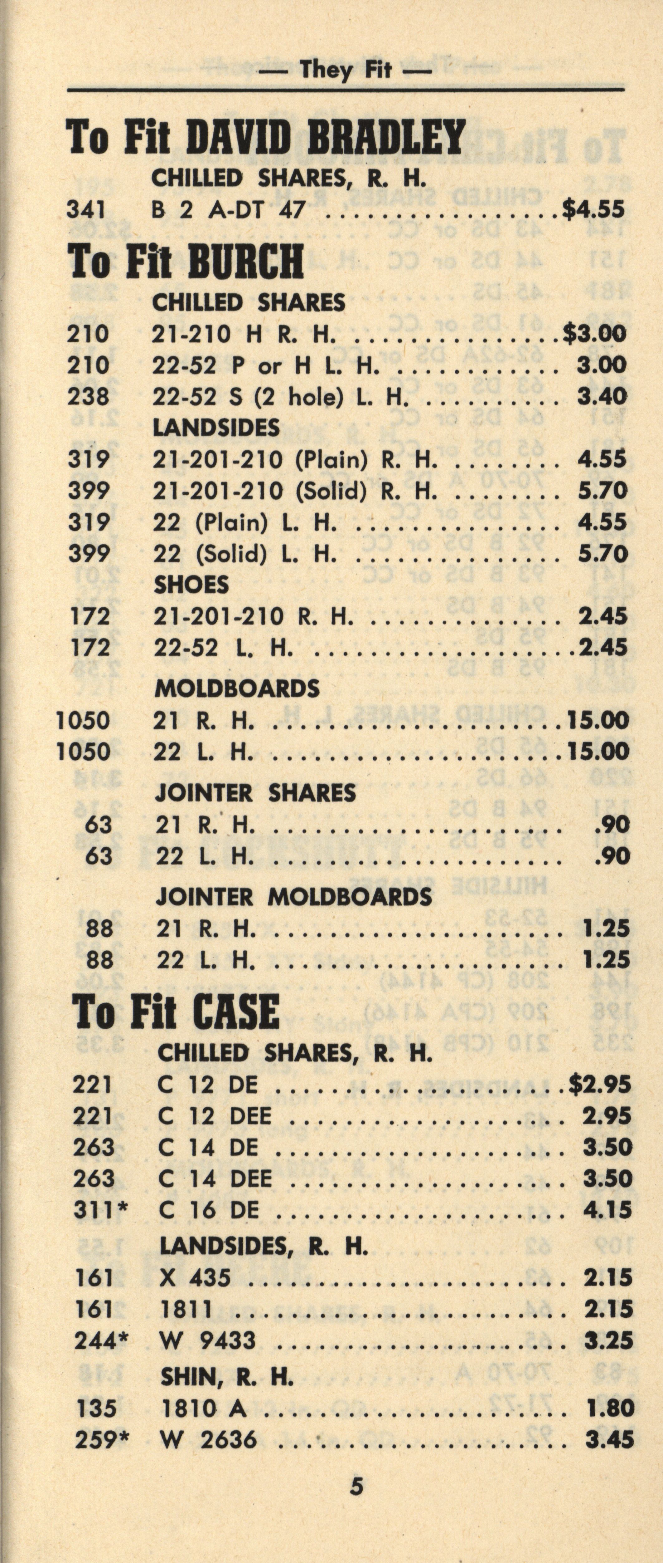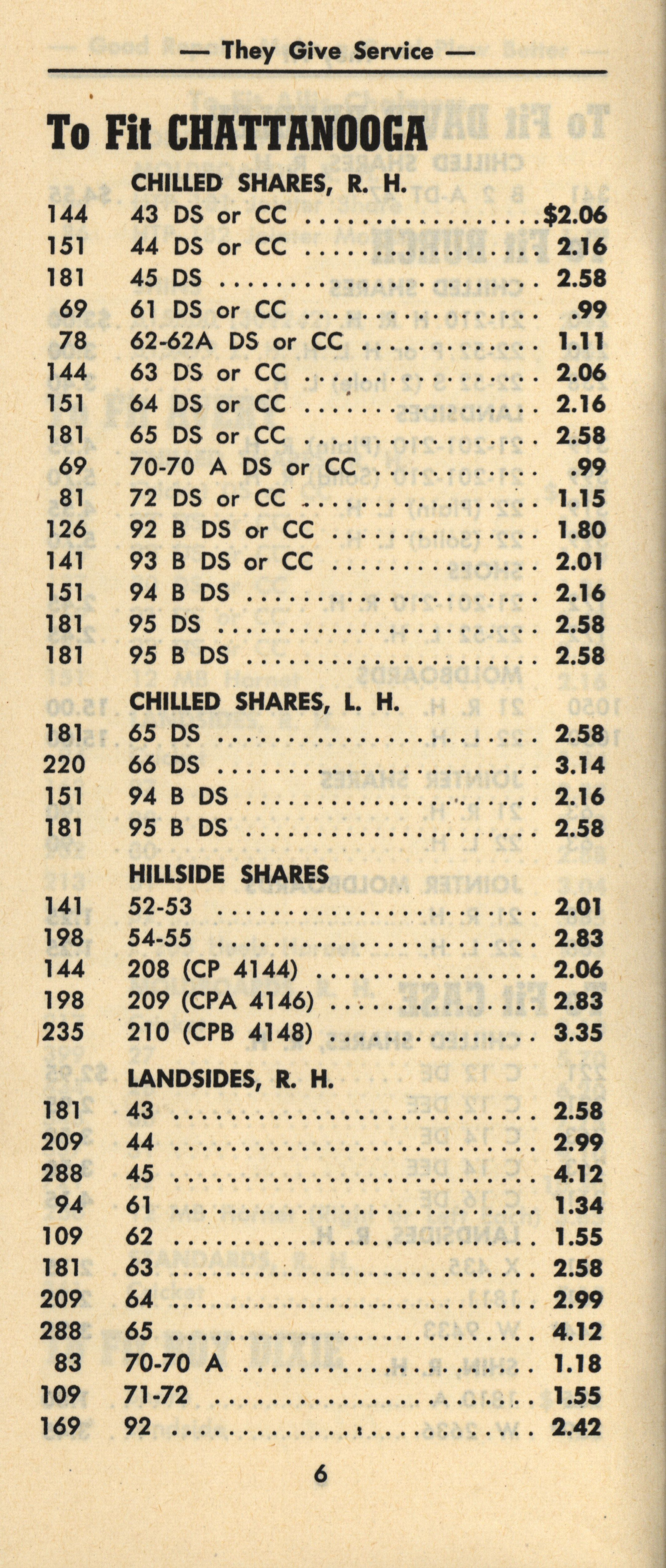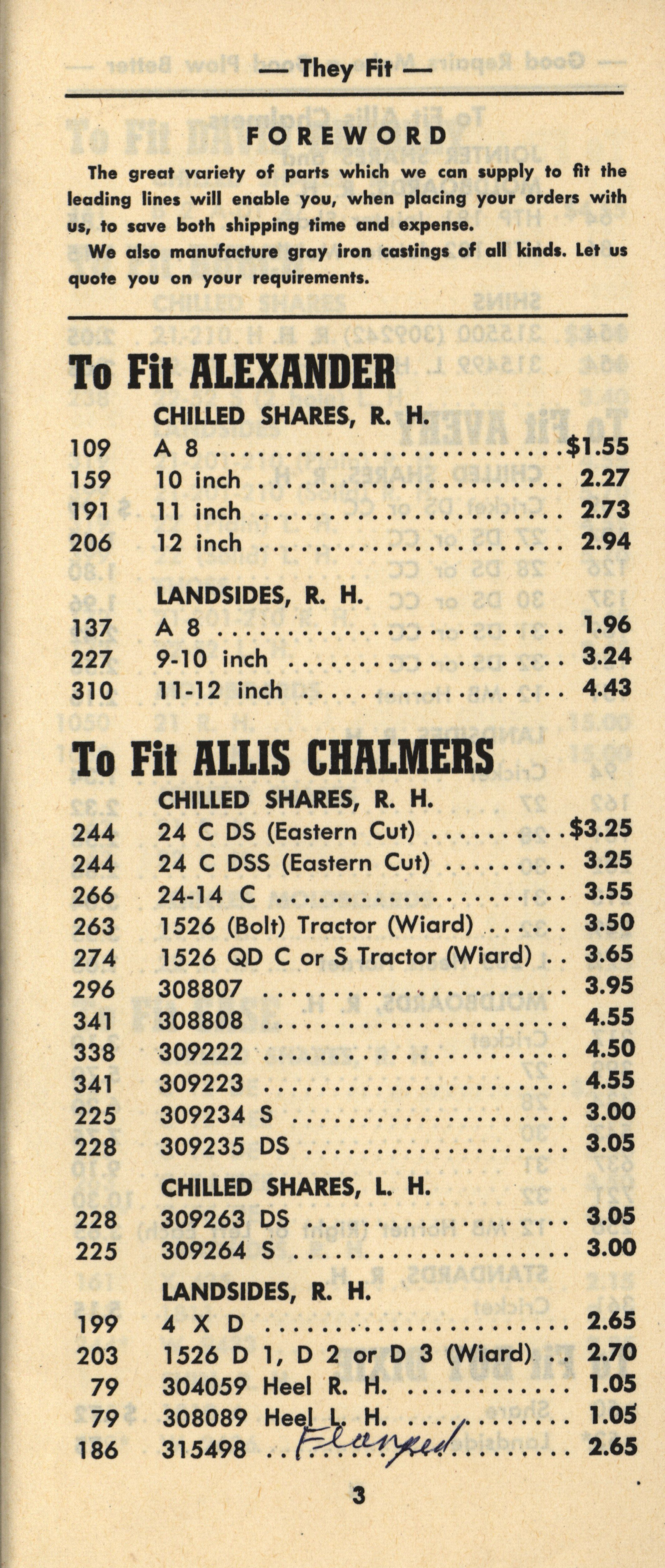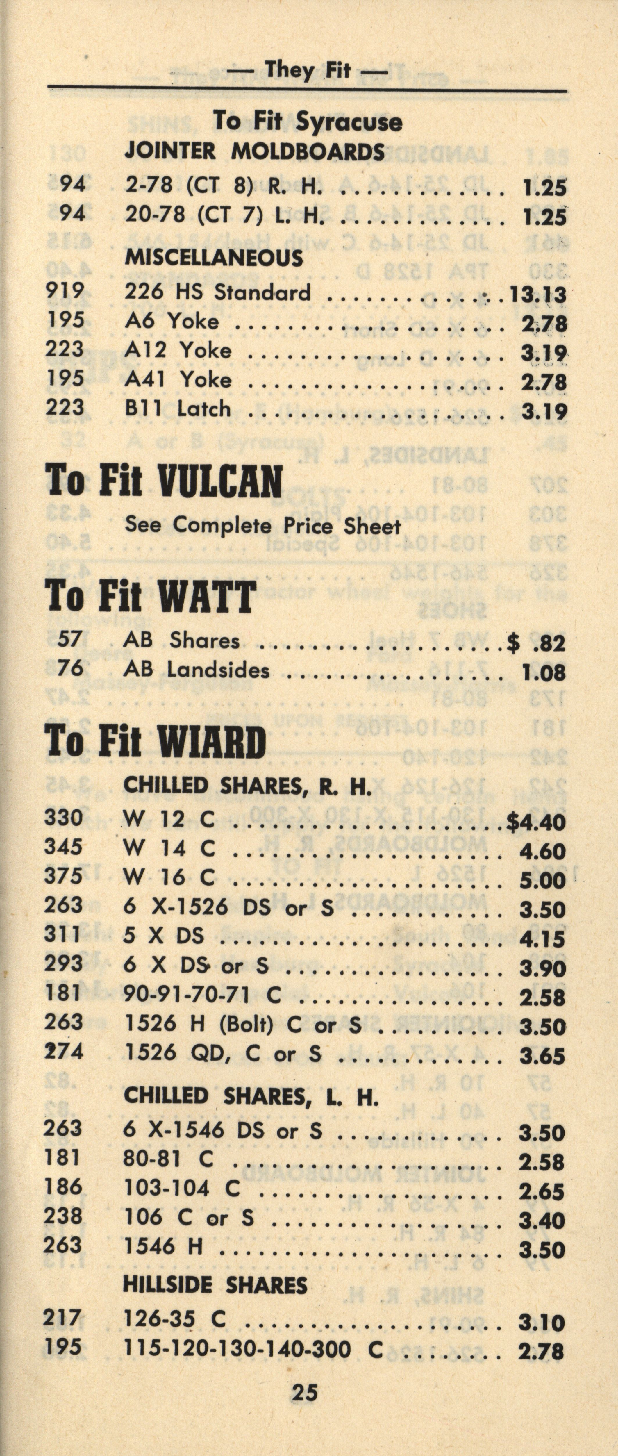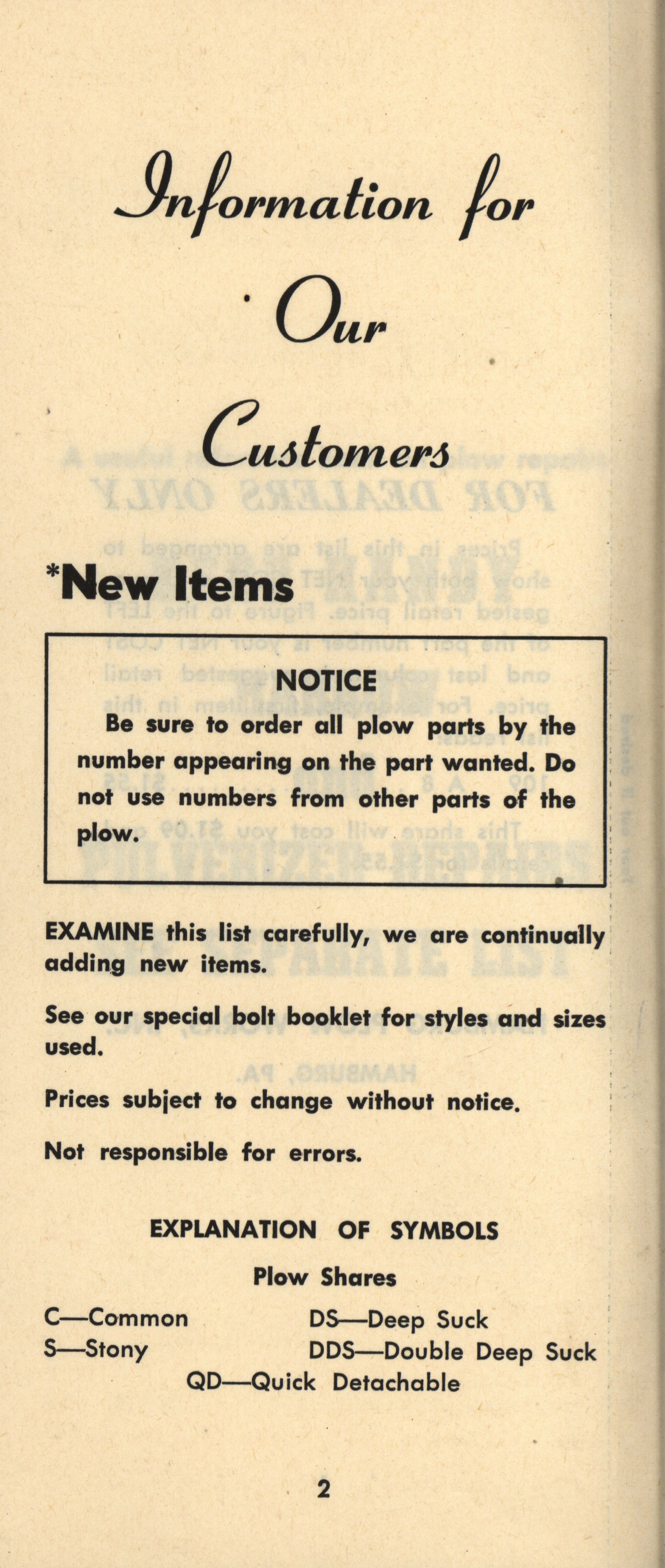 - Price list for repairs and parts offered by Hamburg Plow Works in 1961.
