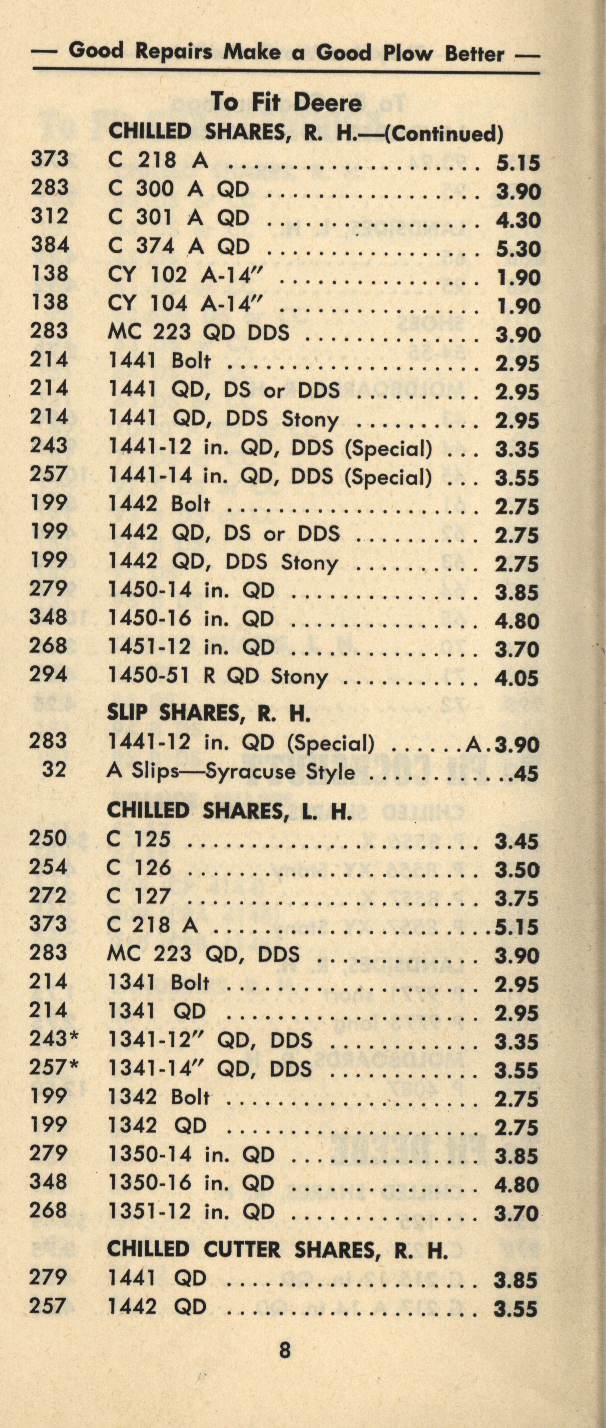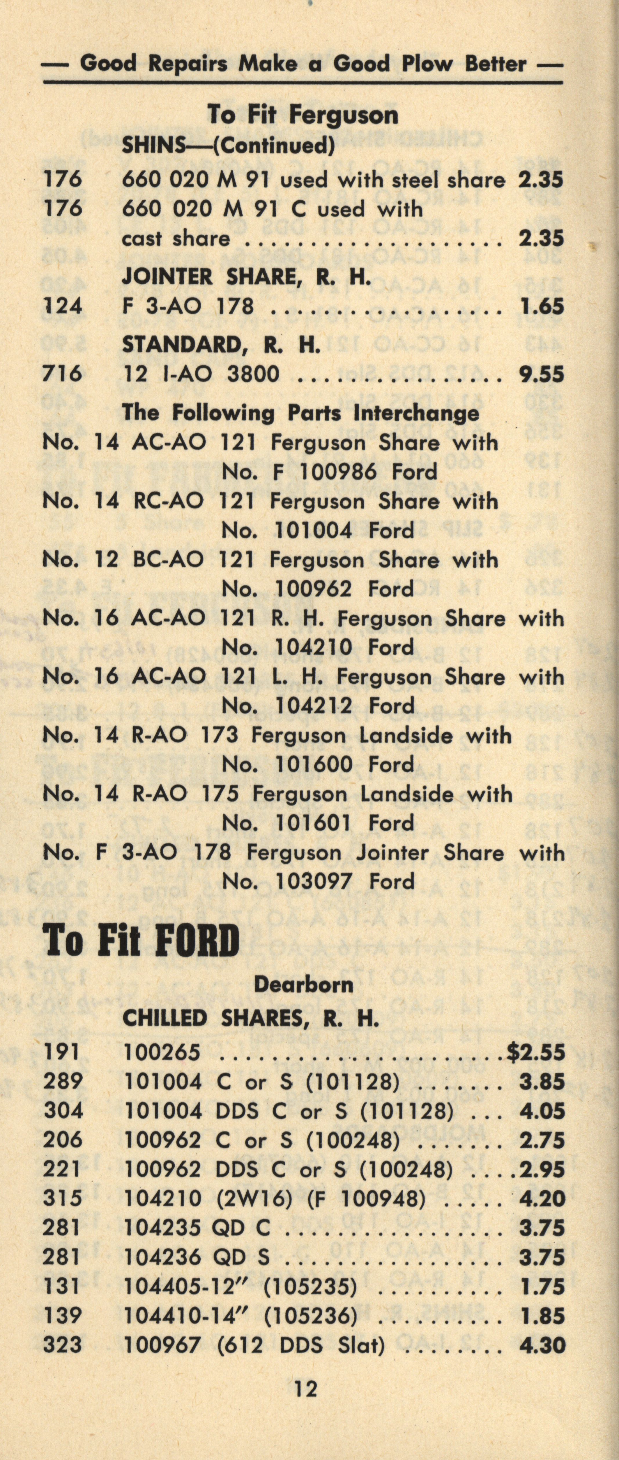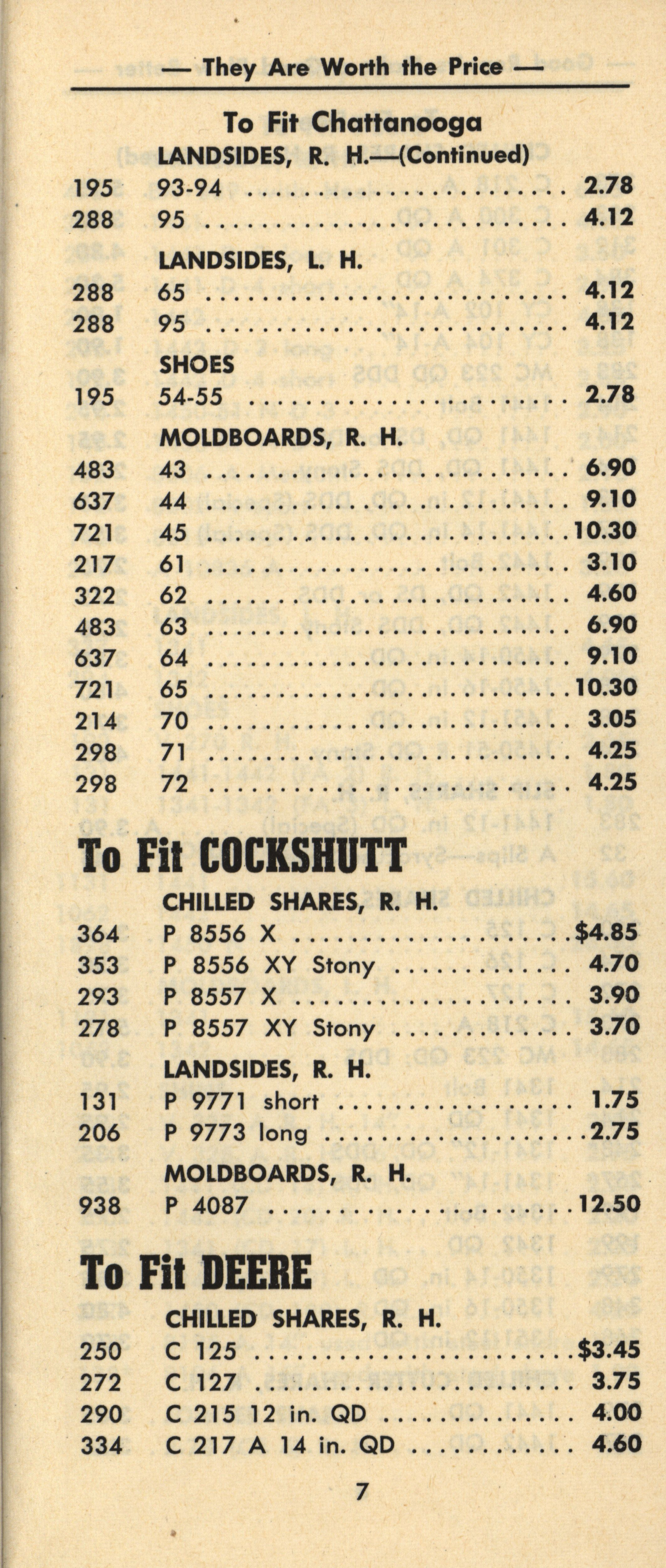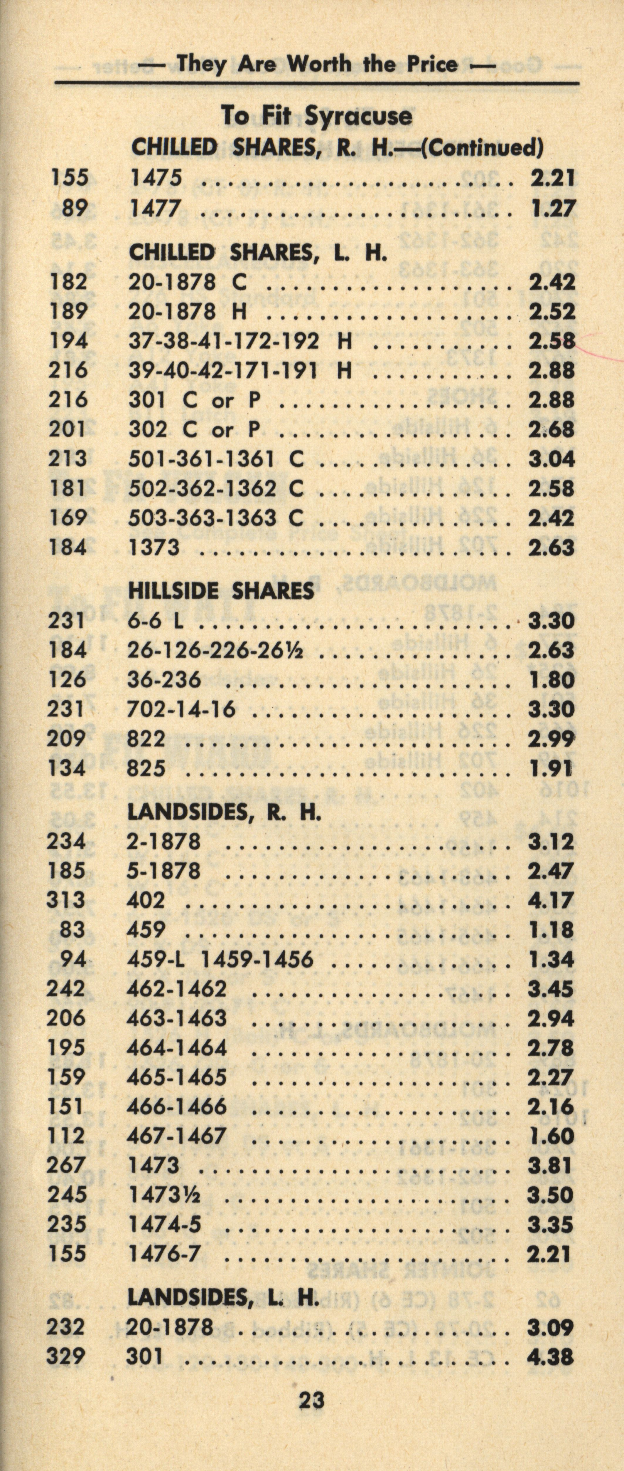 - Price list for repairs and parts offered by Hamburg Plow Works in 1961.