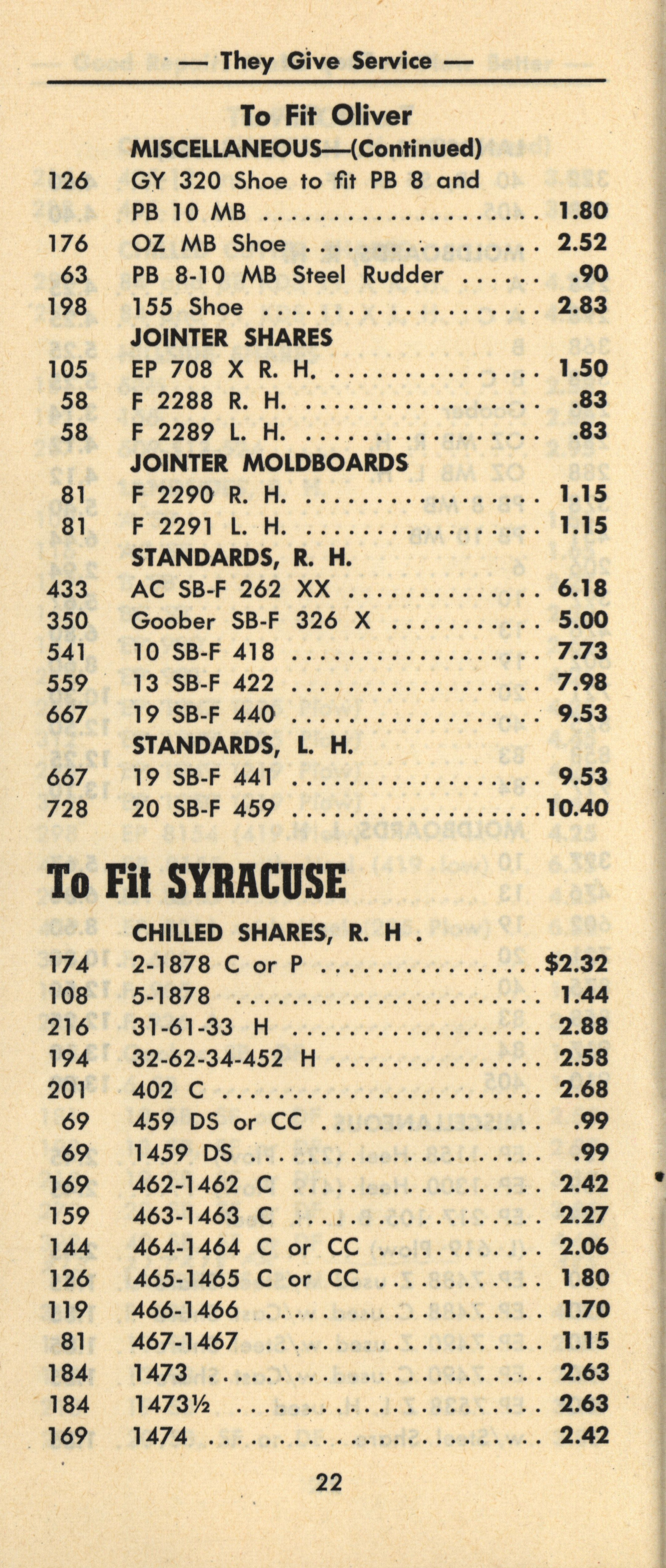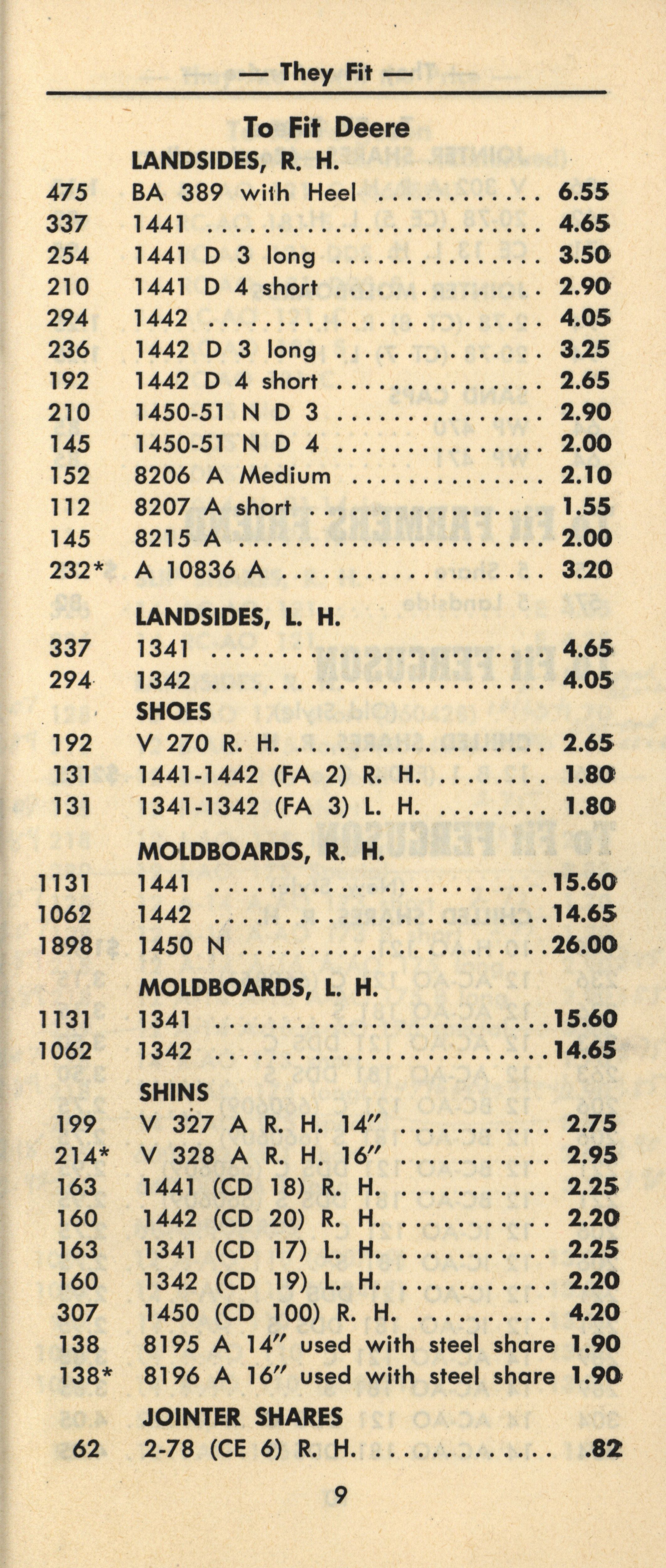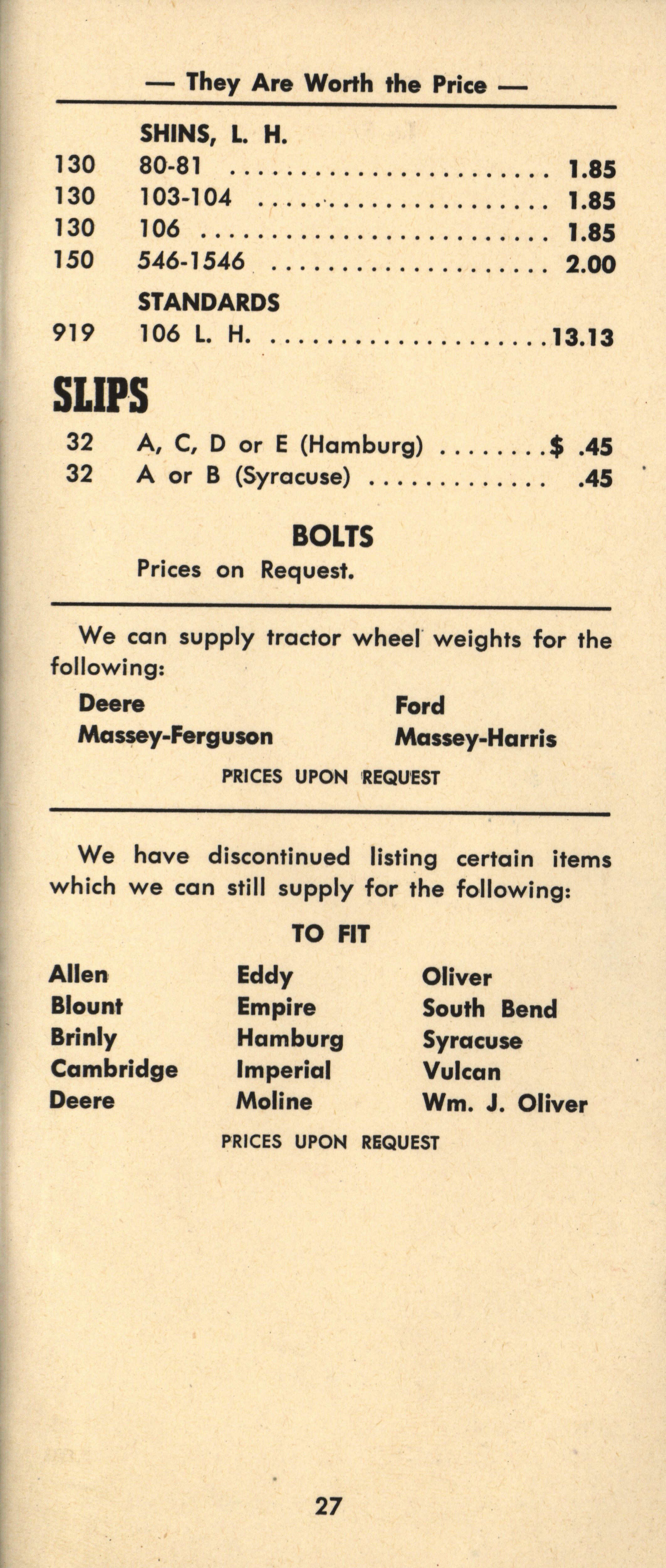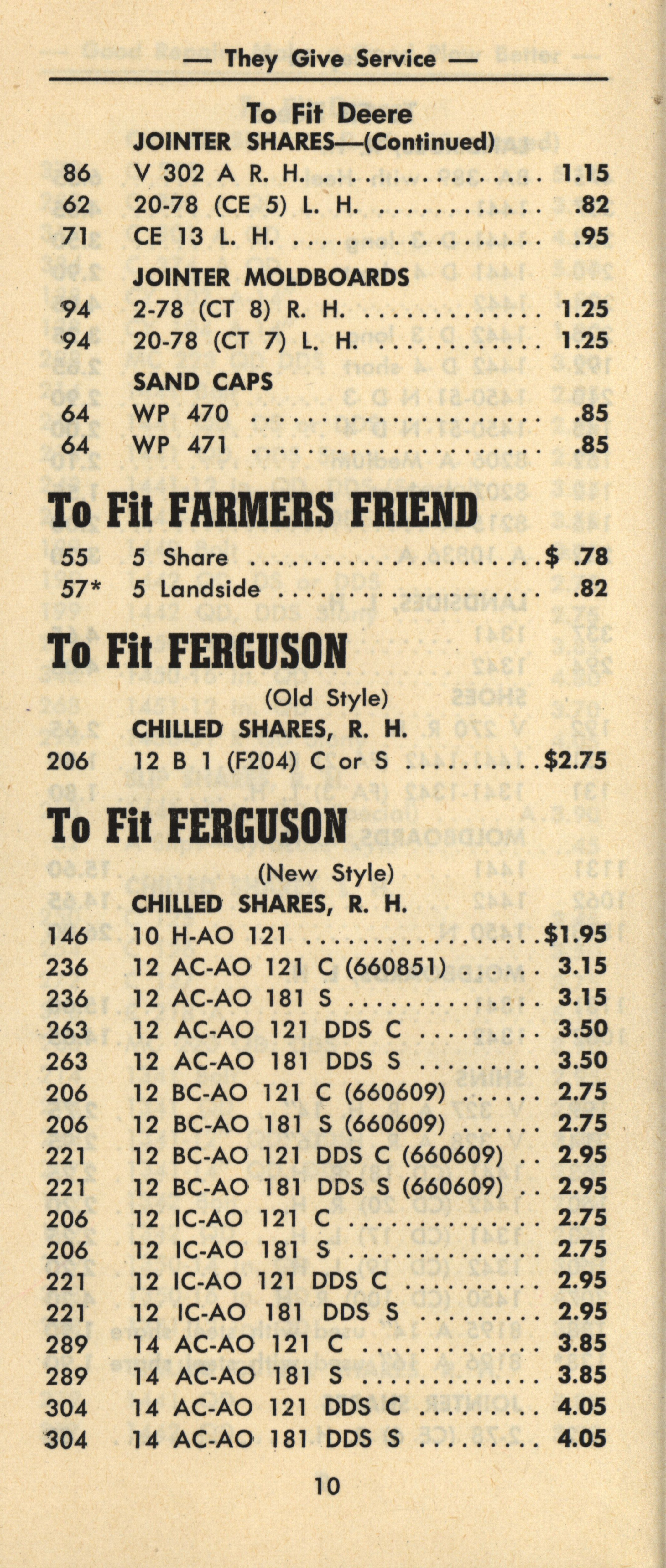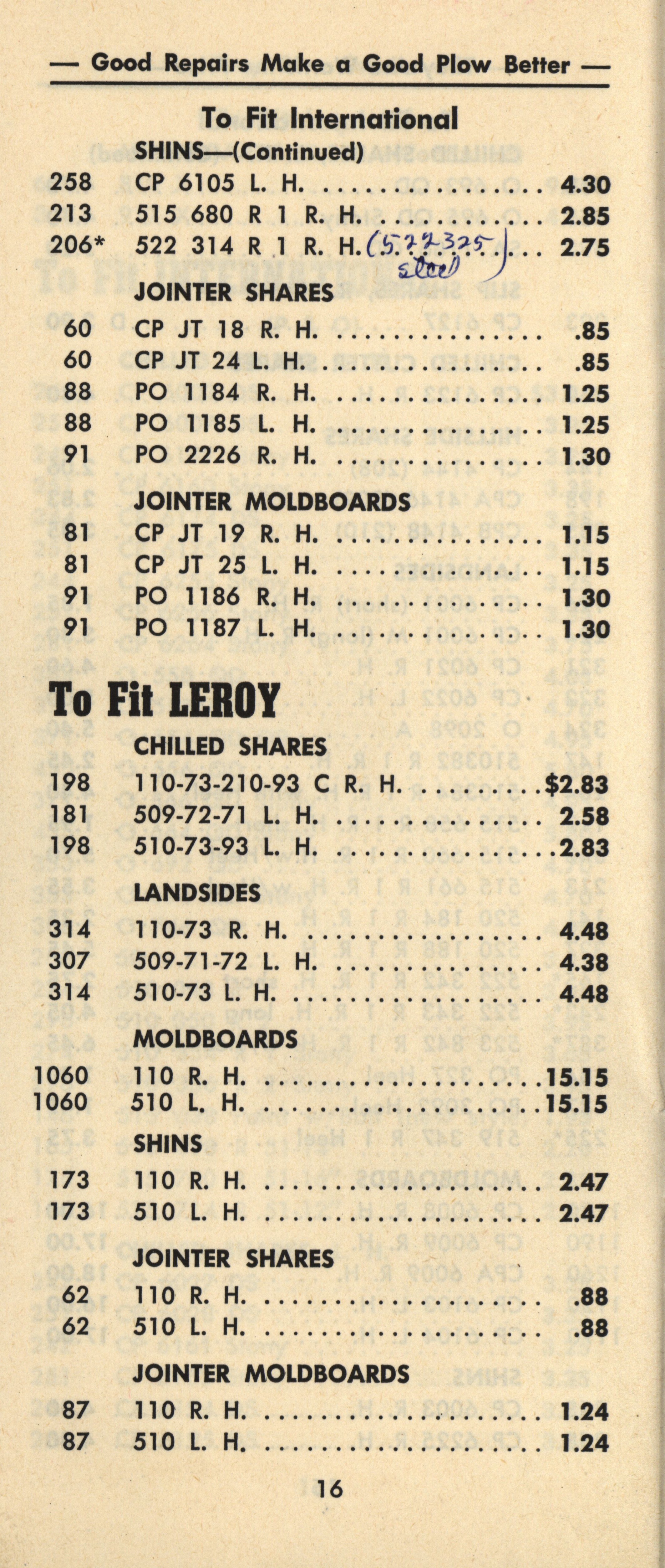 - Price list for repairs and parts offered by Hamburg Plow Works in 1961.