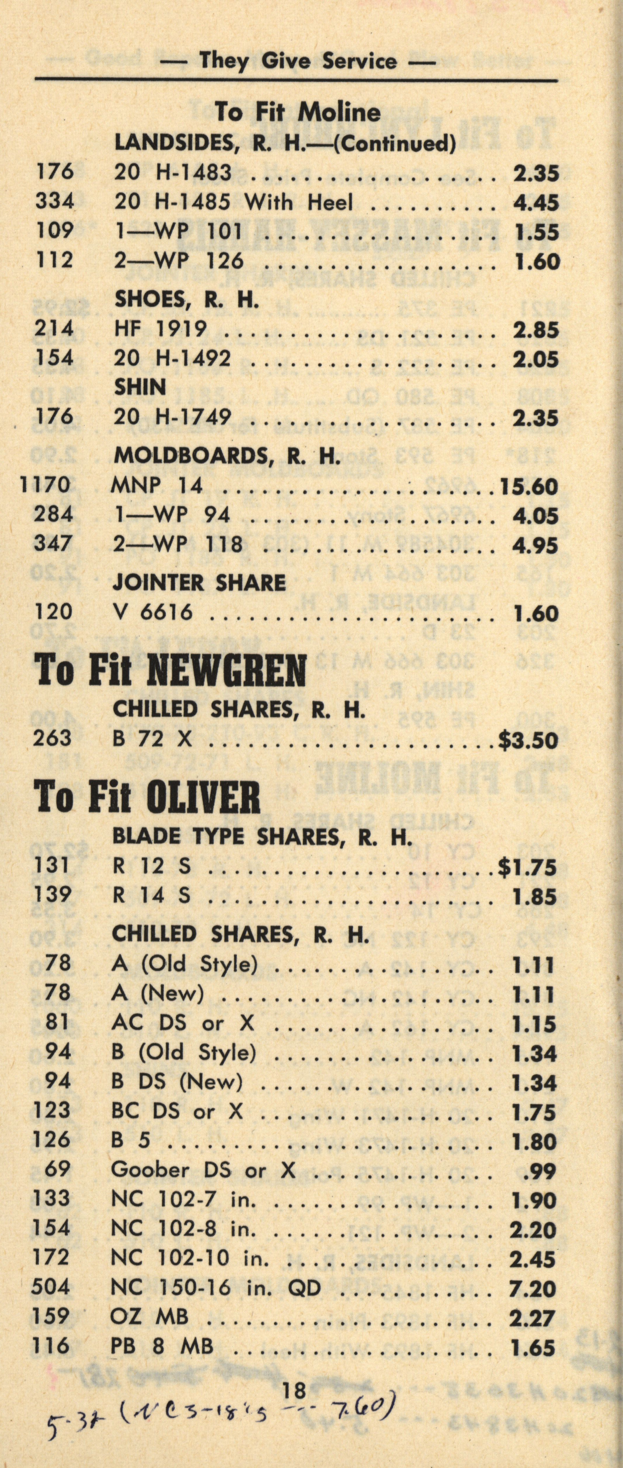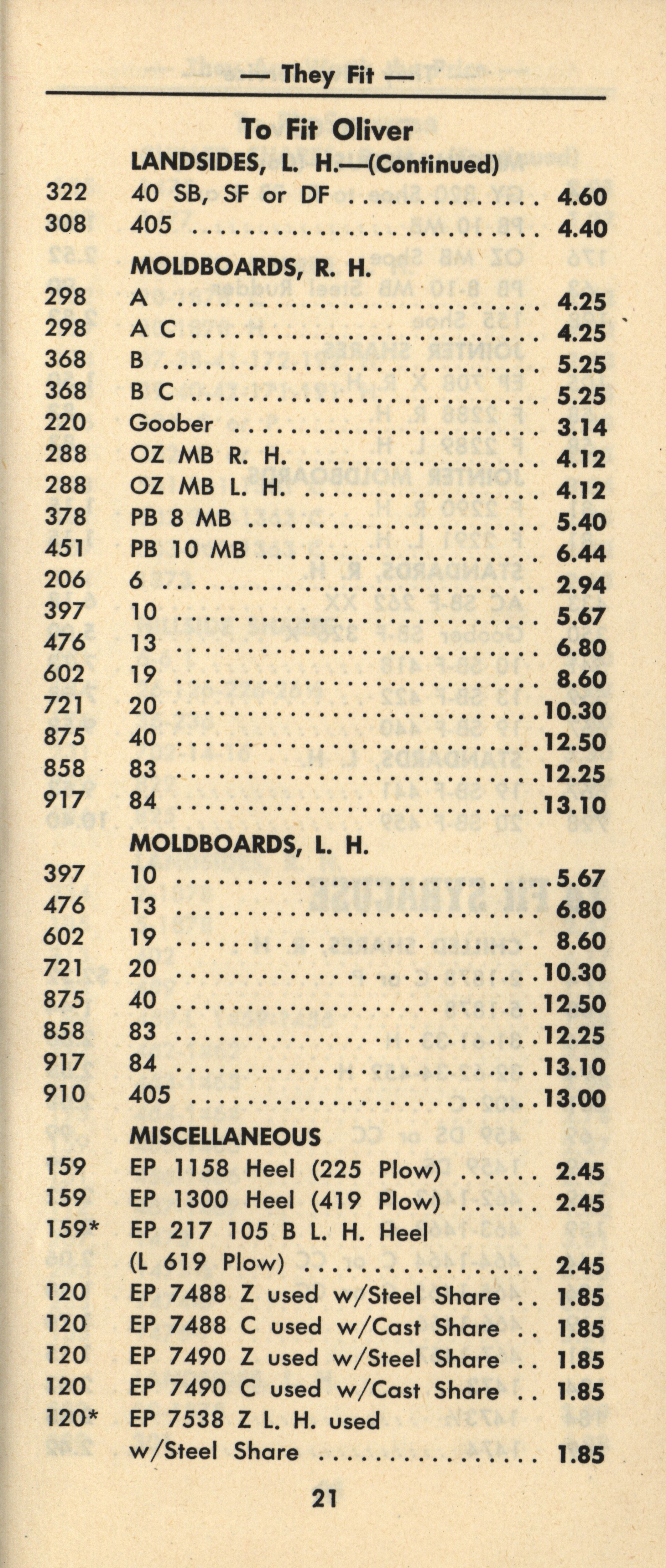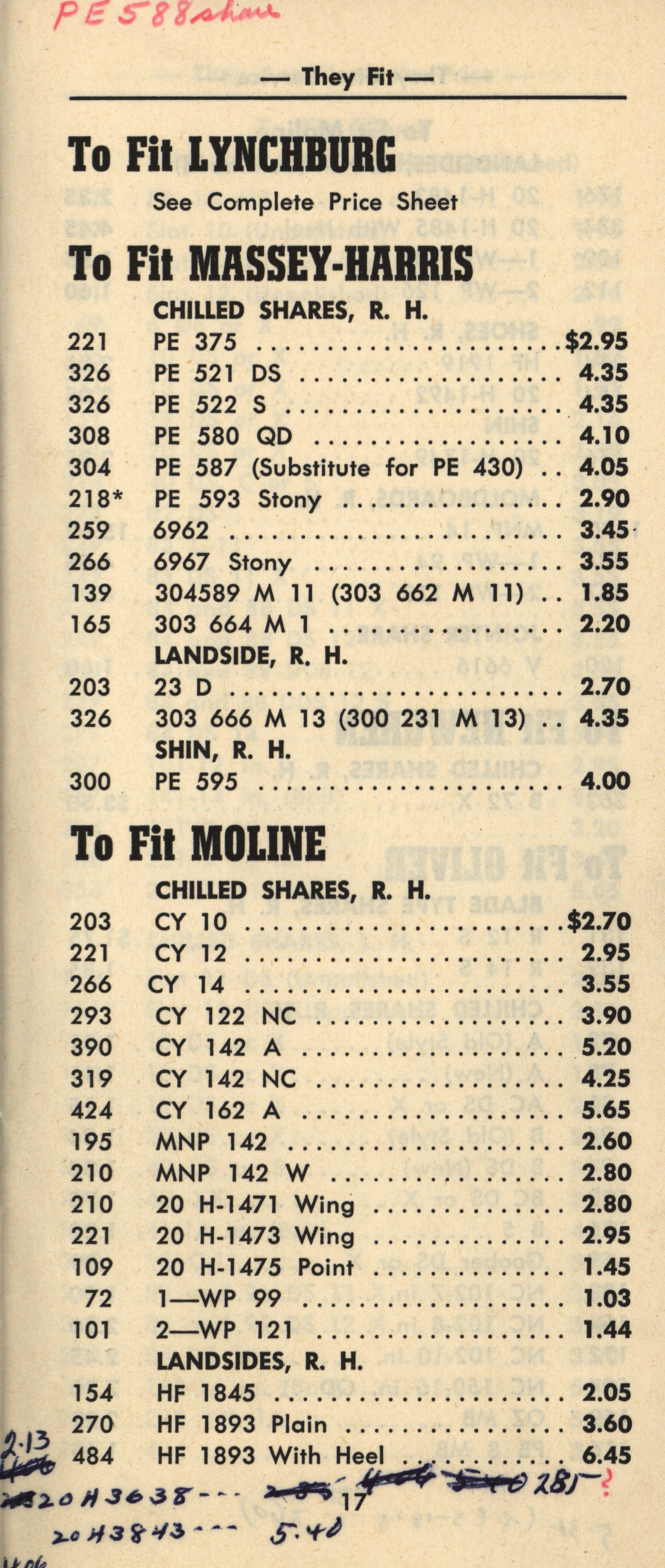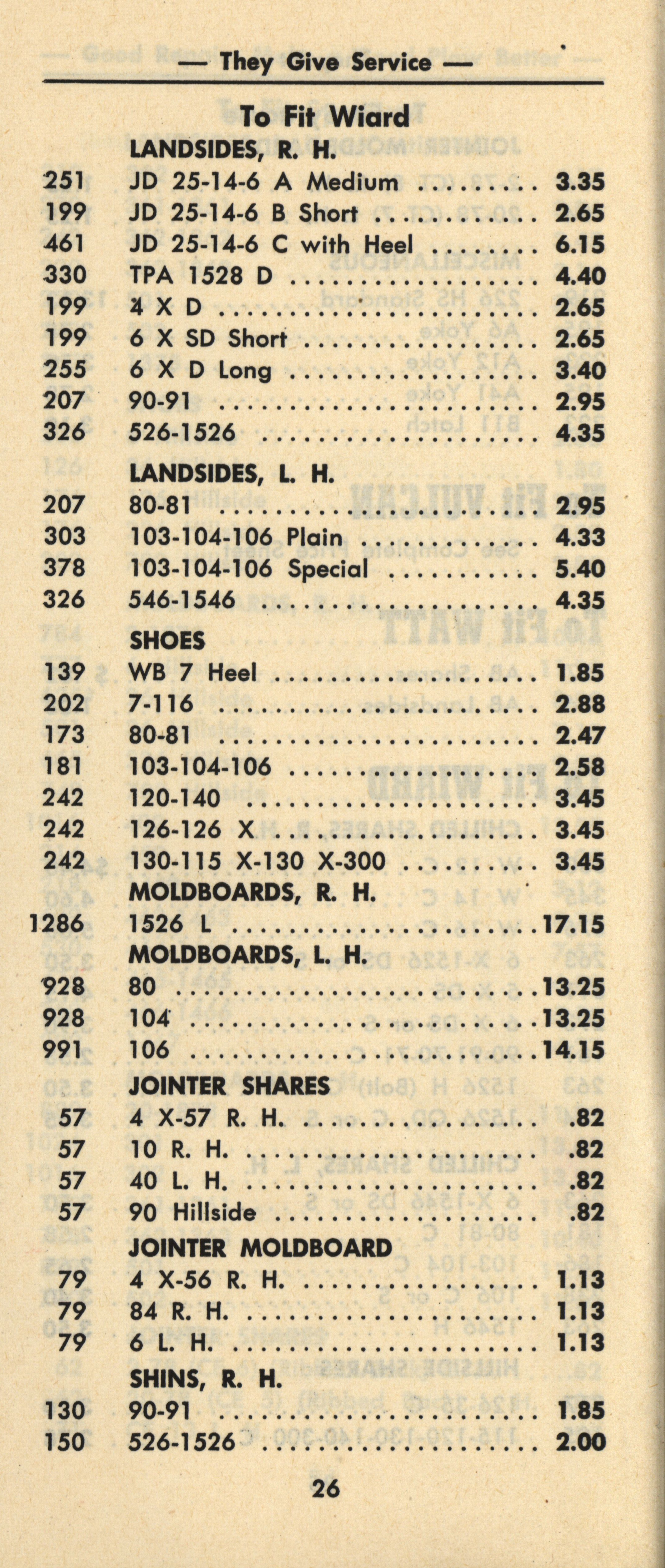 - Price list for repairs and parts offered by Hamburg Plow Works in 1961.