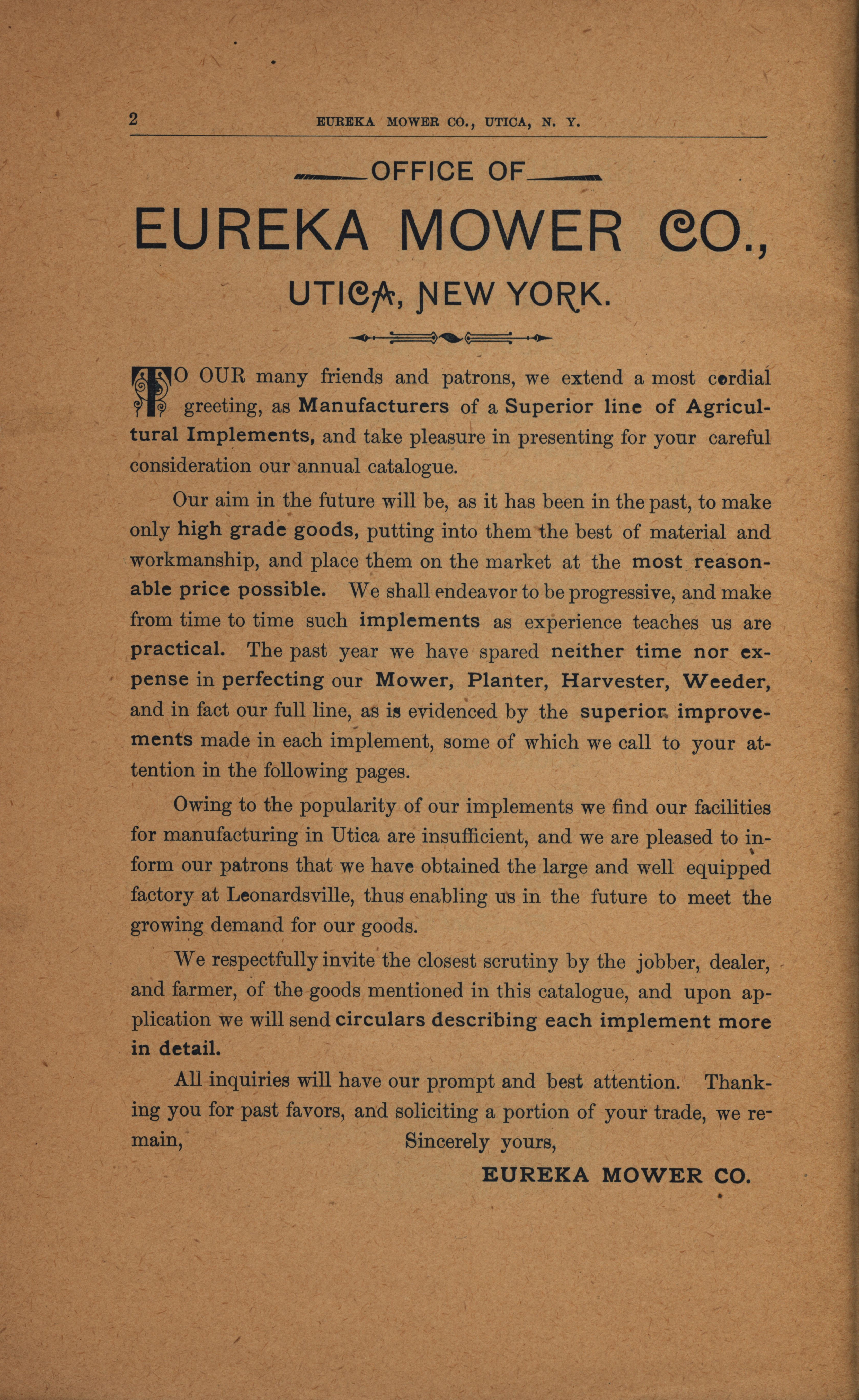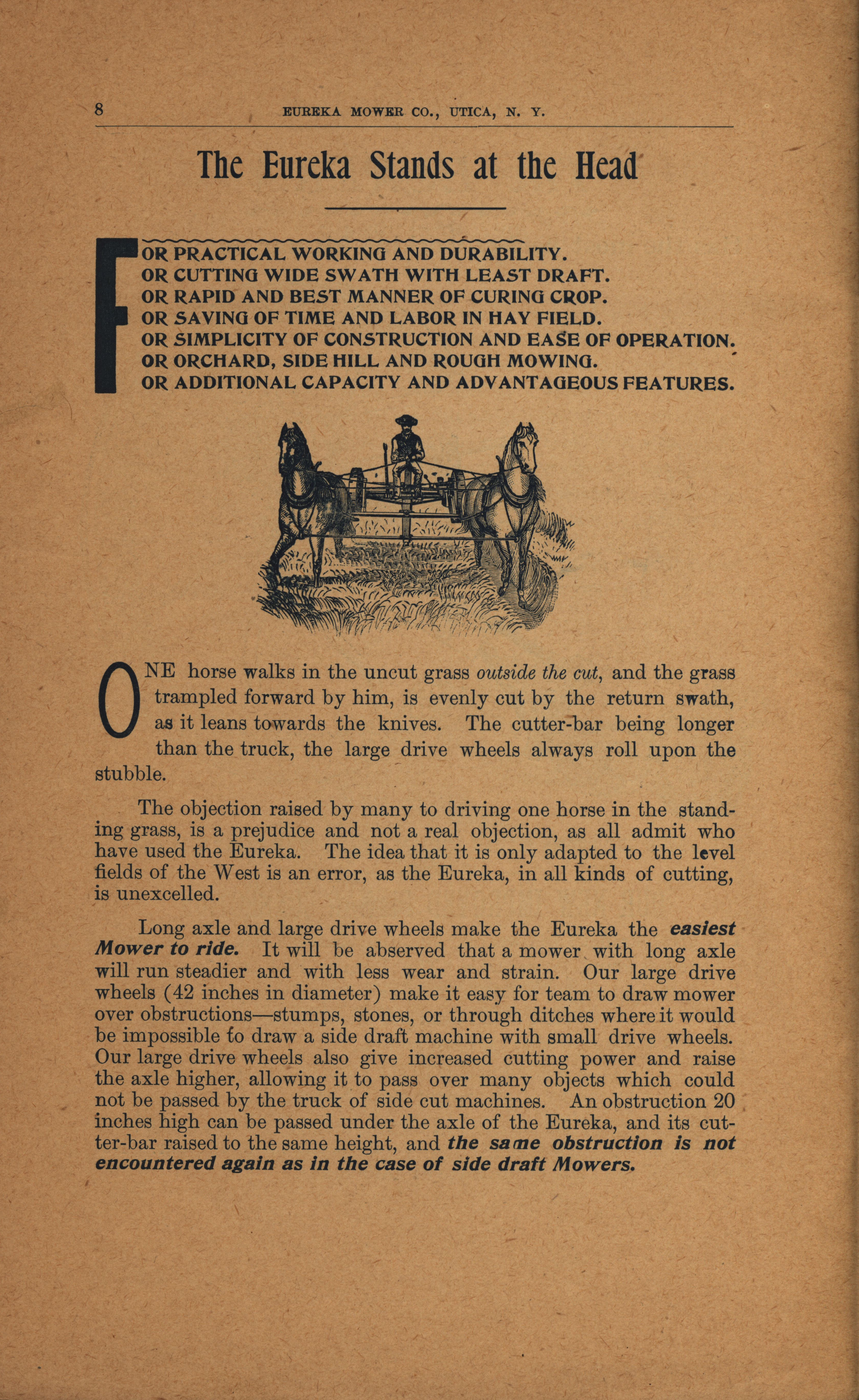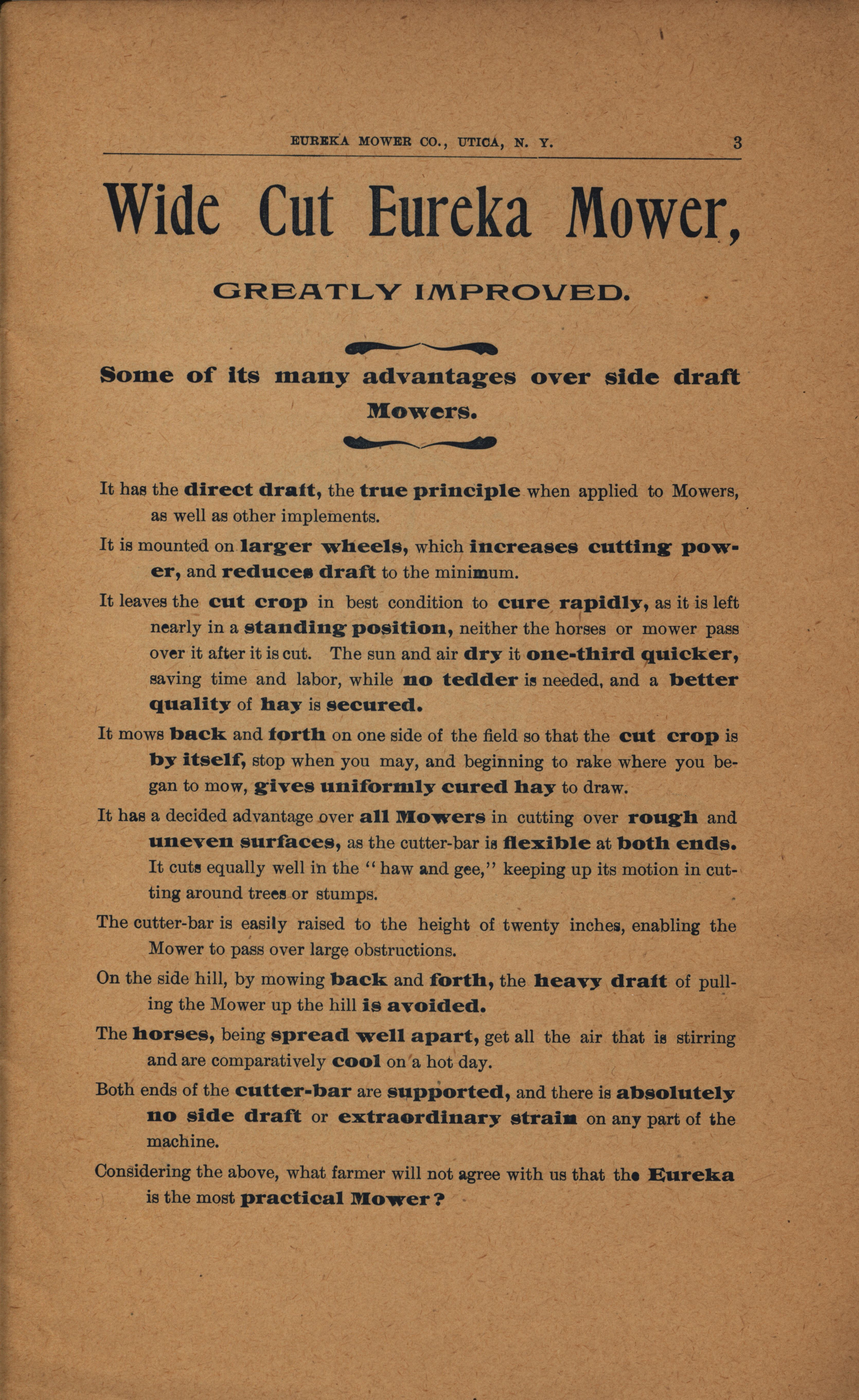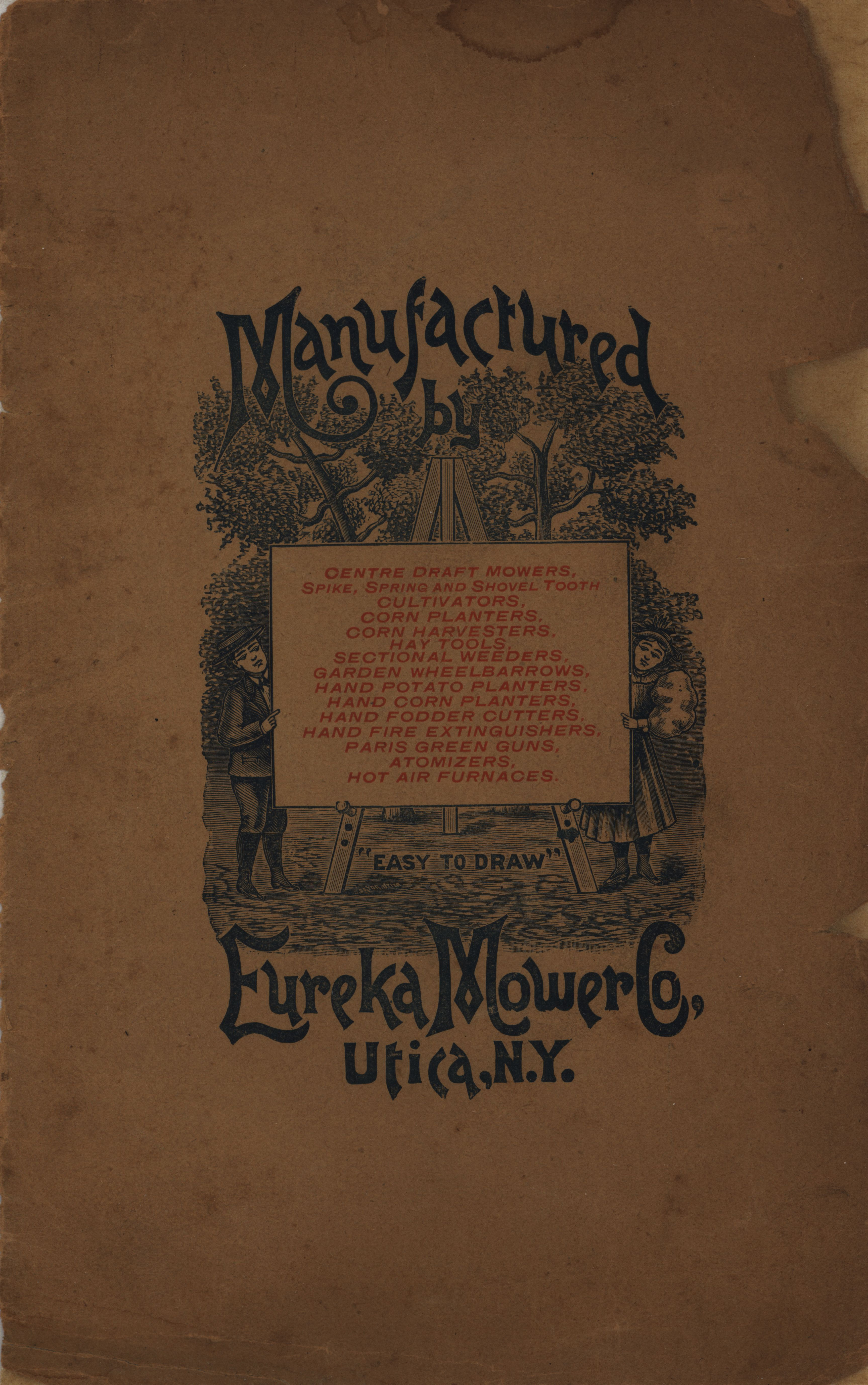 - Illustrated catalog describing the agricultural implements offered by the Eureka Mower Company.