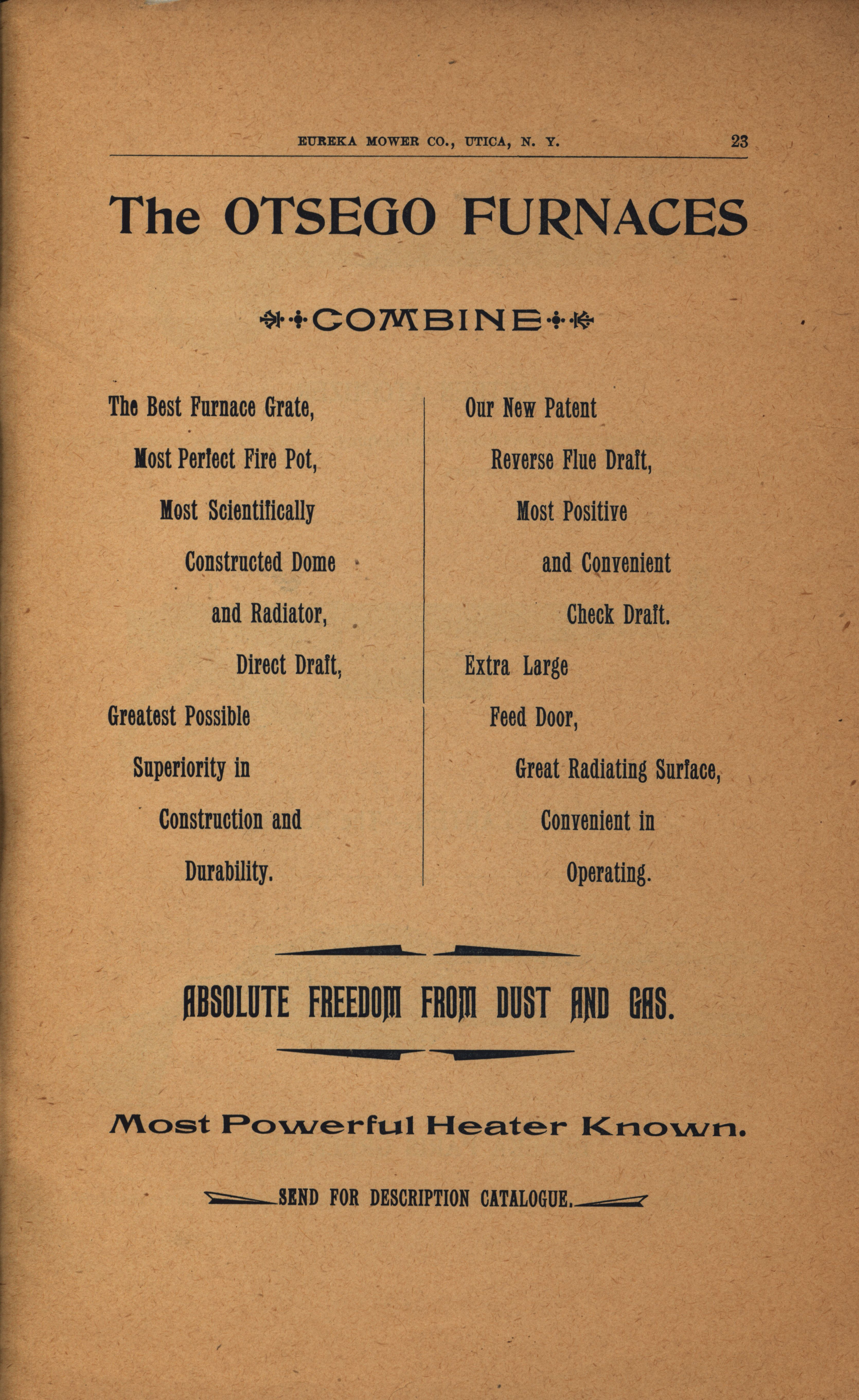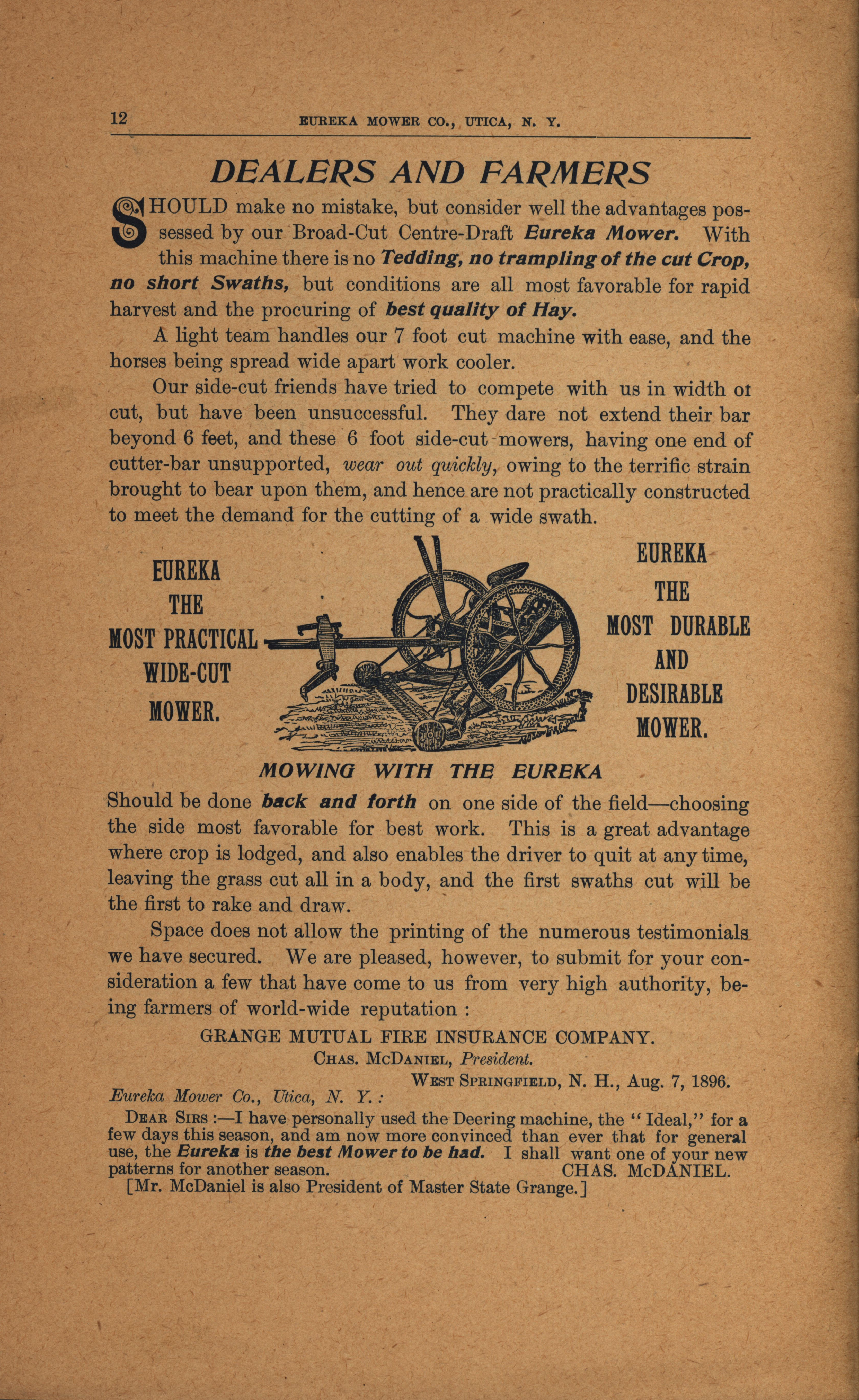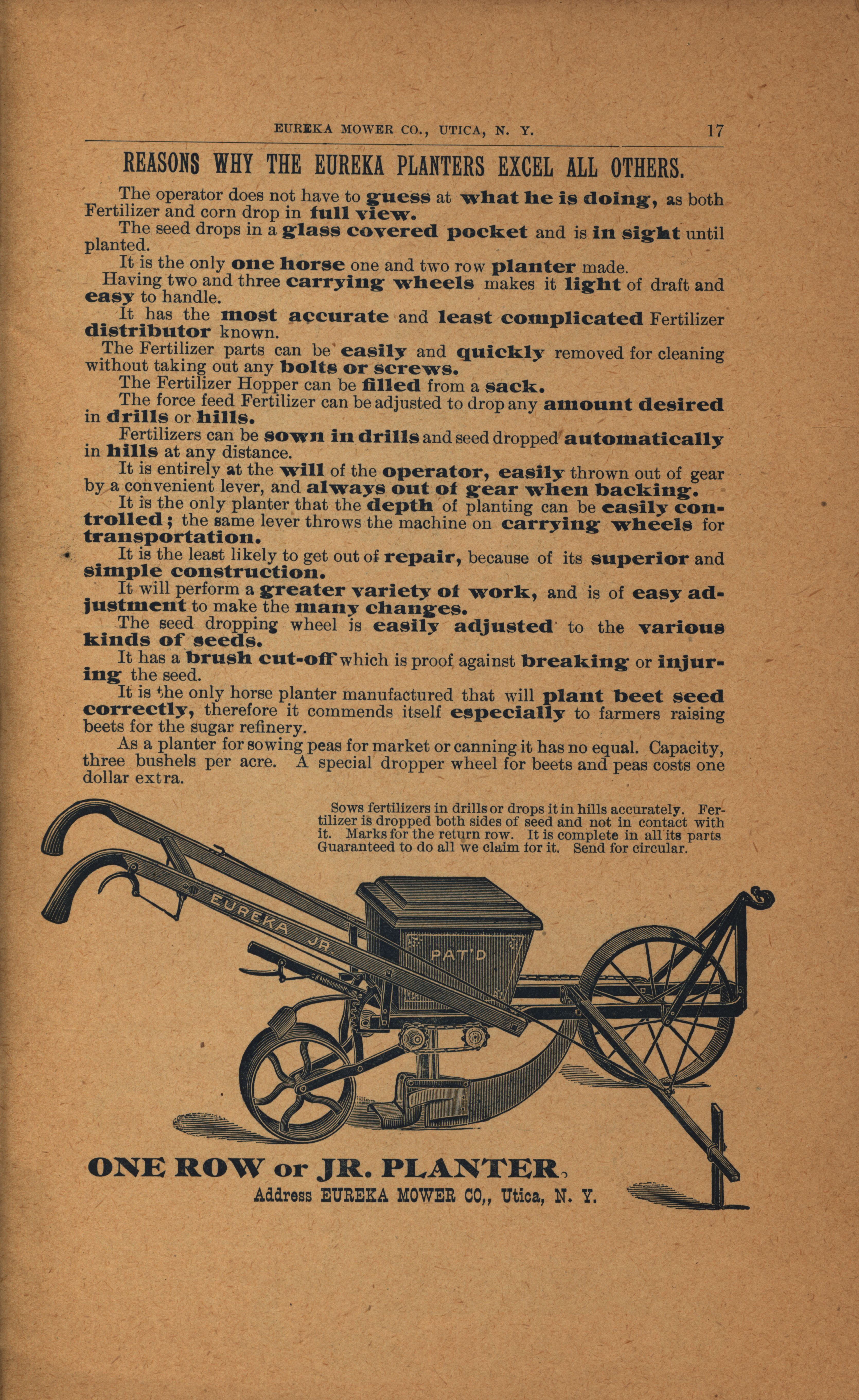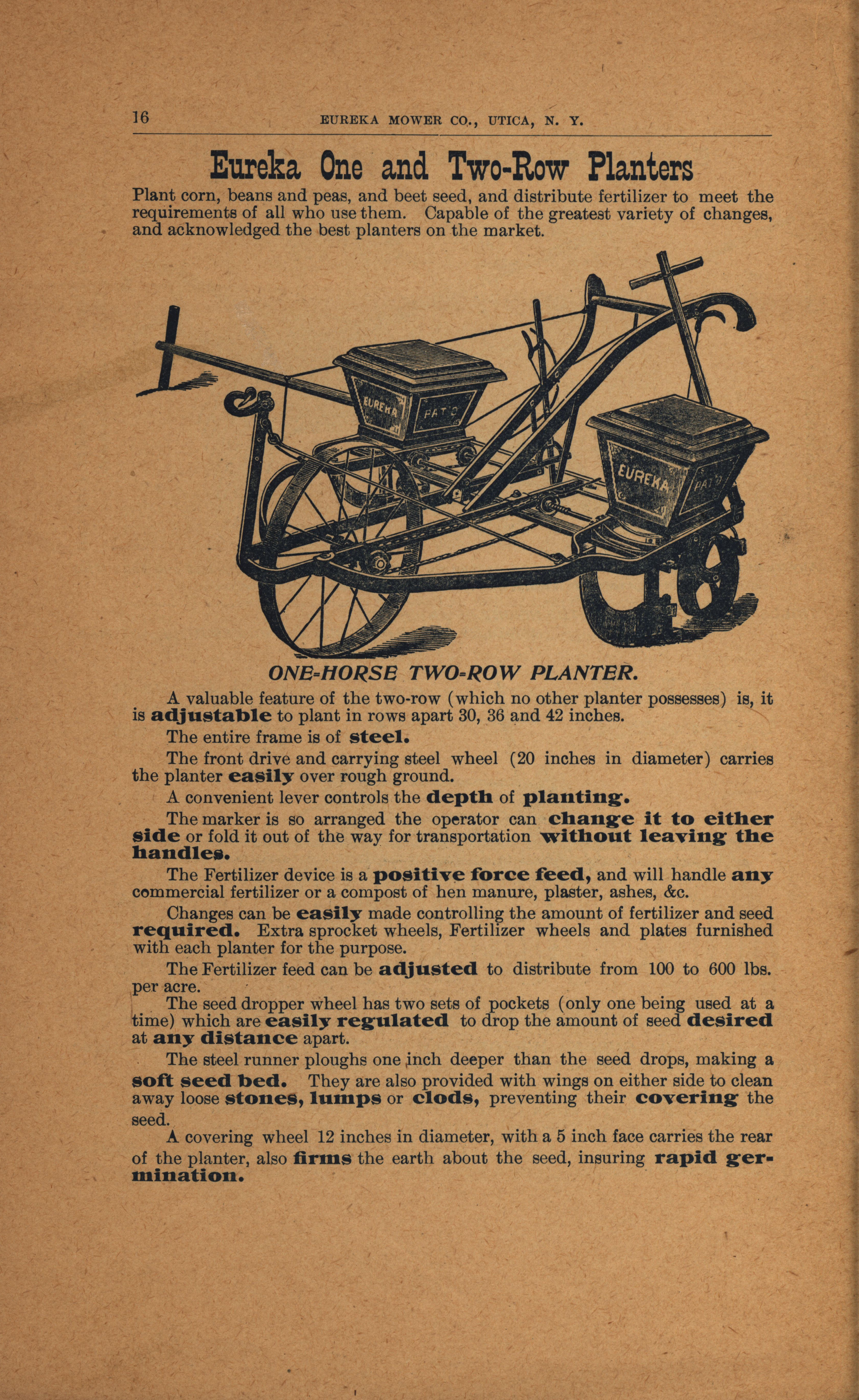 - Illustrated catalog describing the agricultural implements offered by the Eureka Mower Company.
