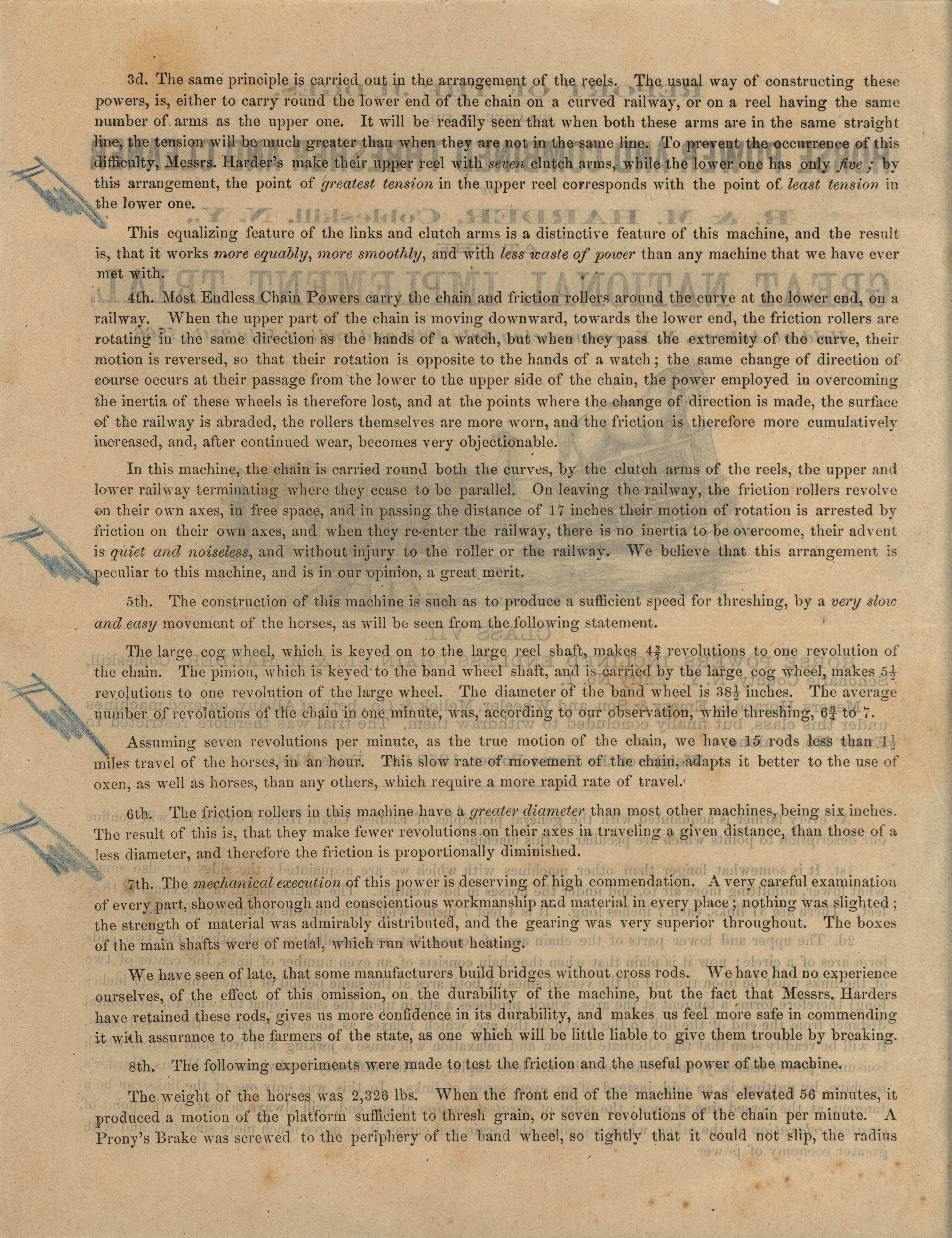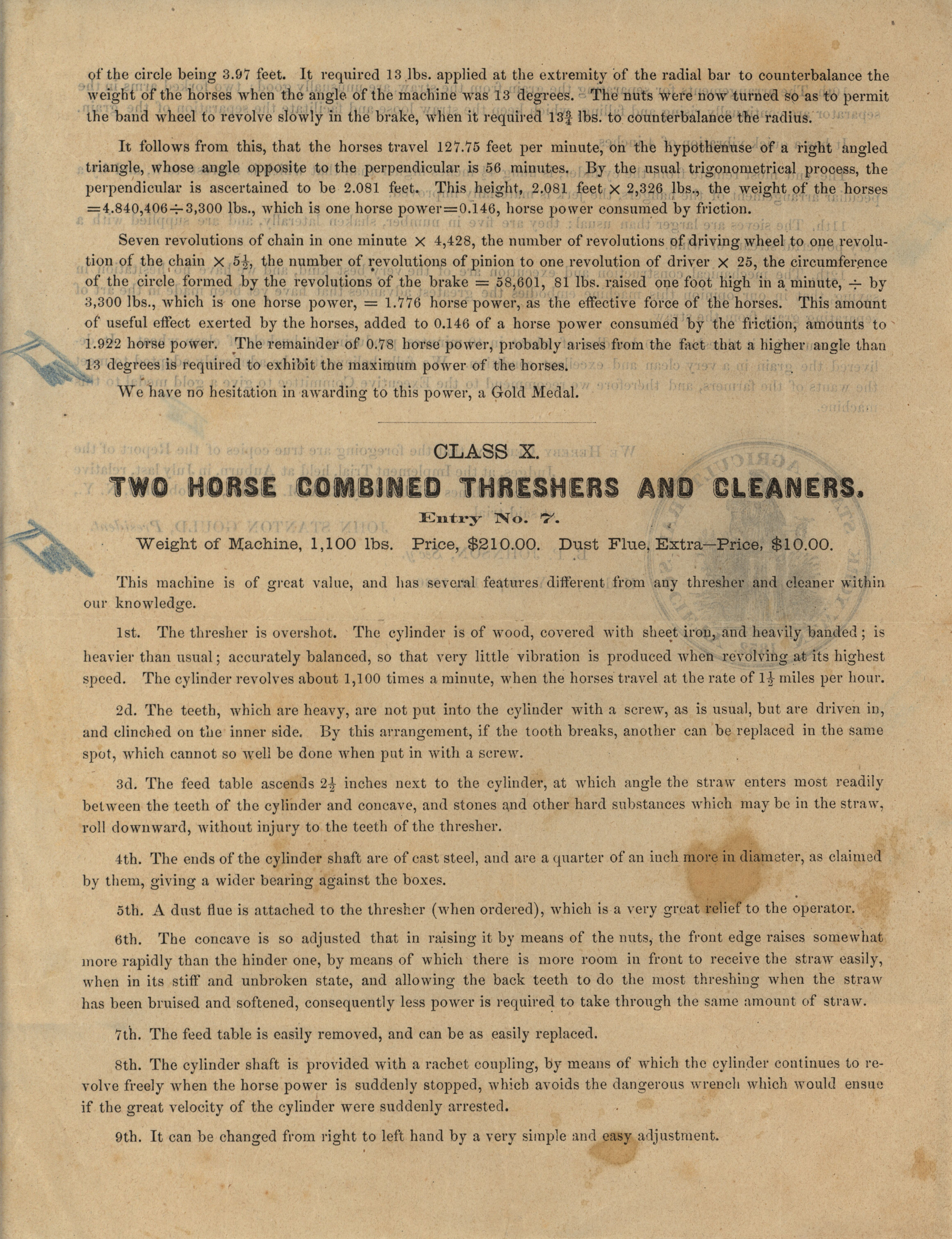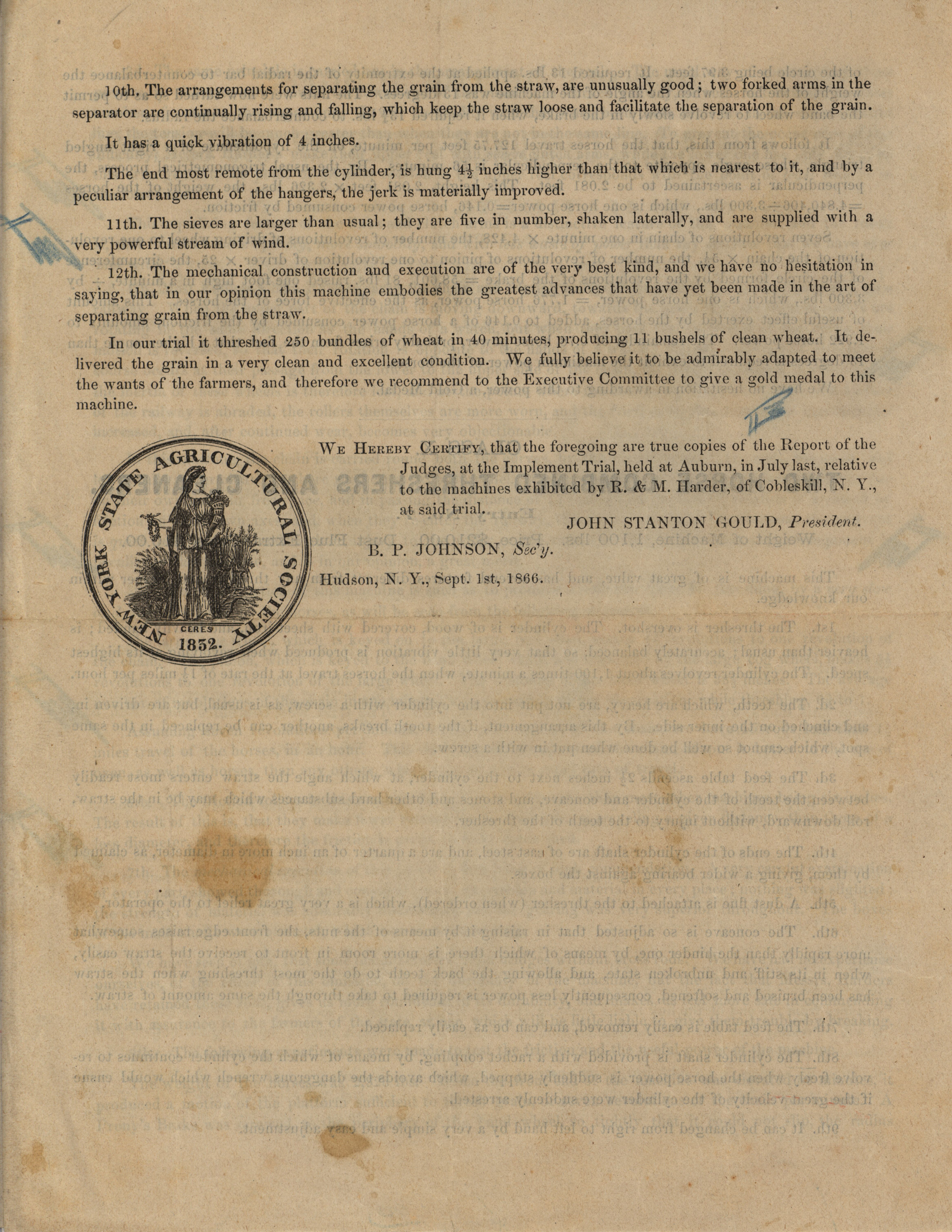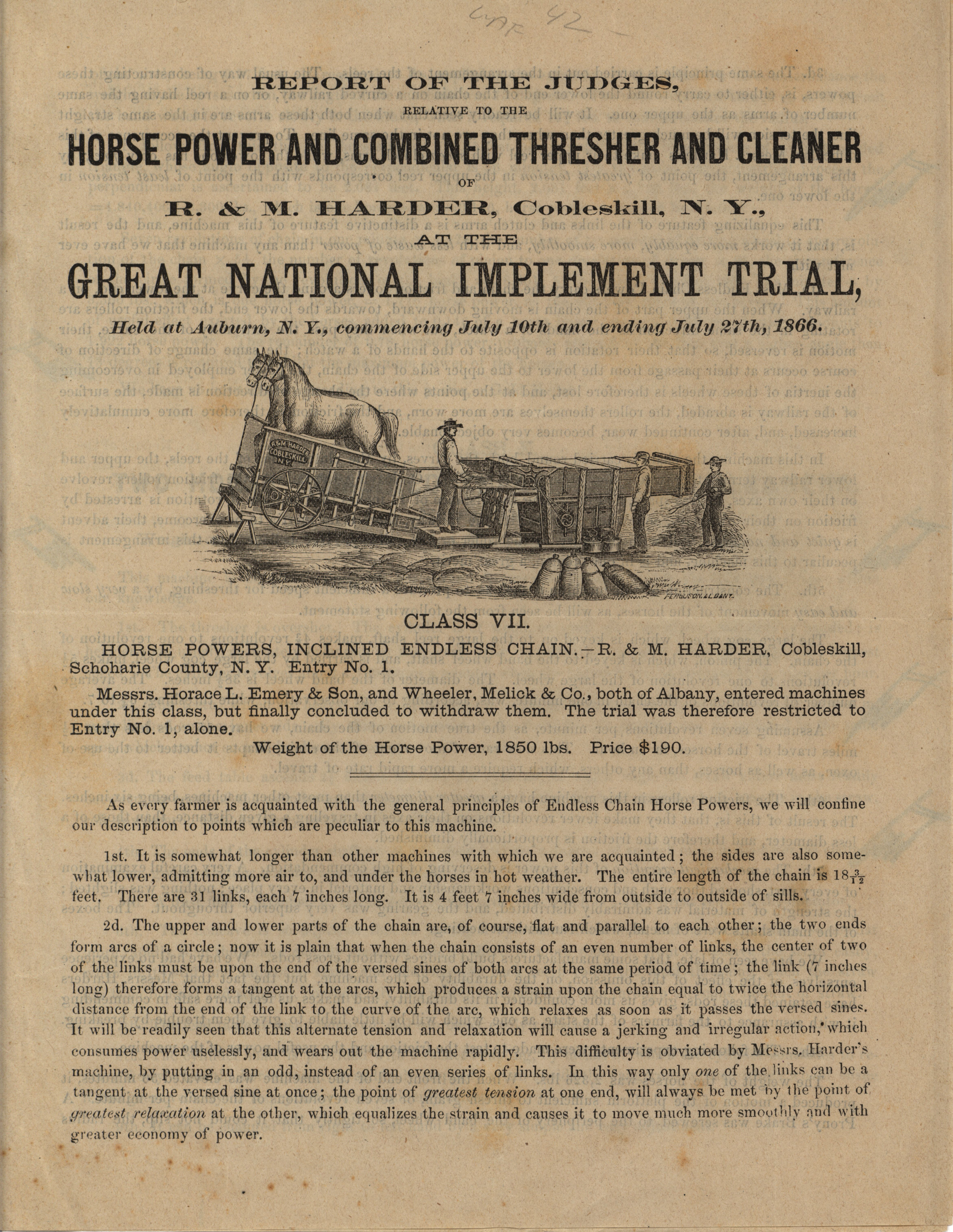 - Report describing the unique features of the horse power and combined thresher and cleaner offered by R. and M. Harder in 1866.