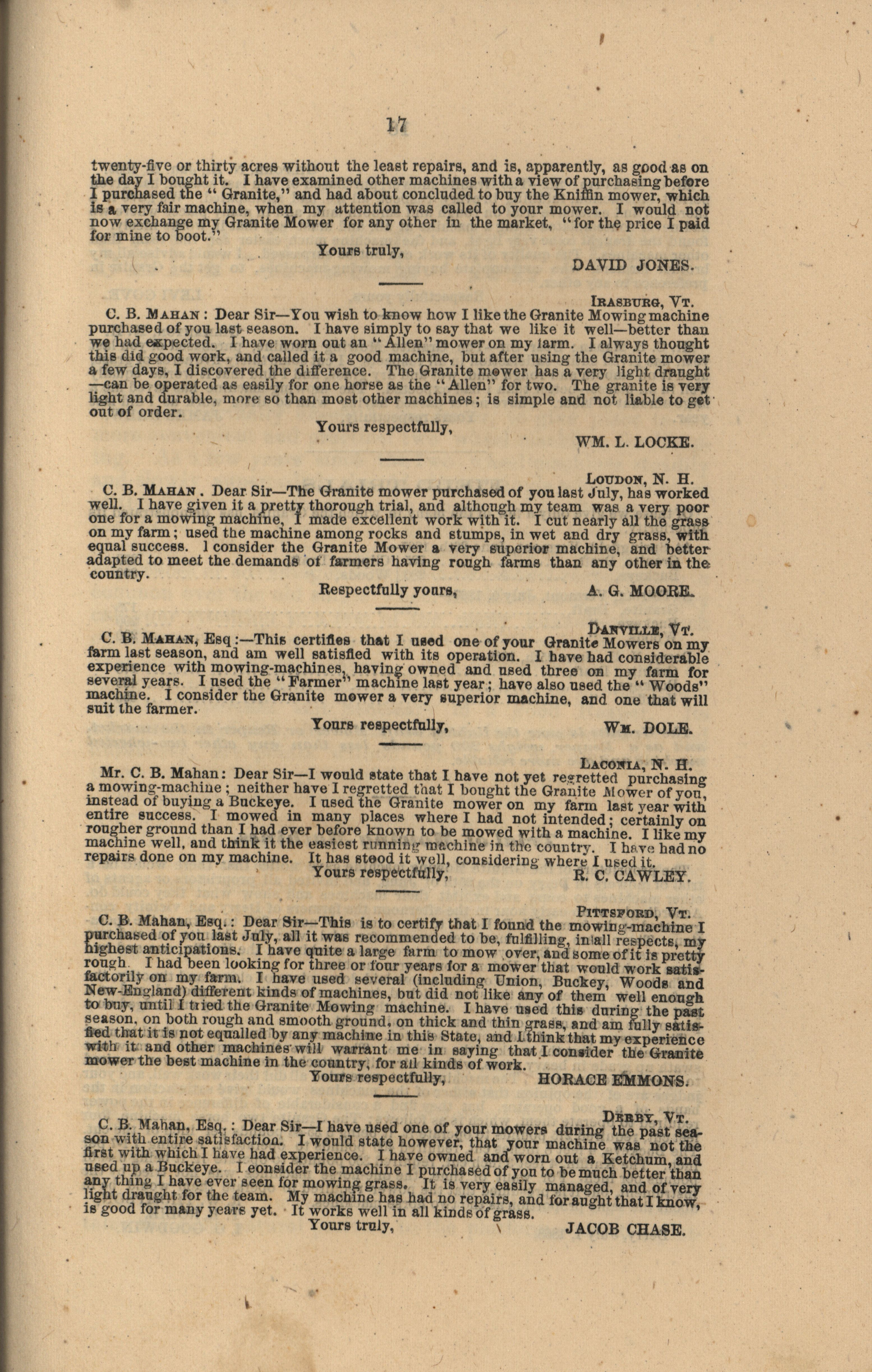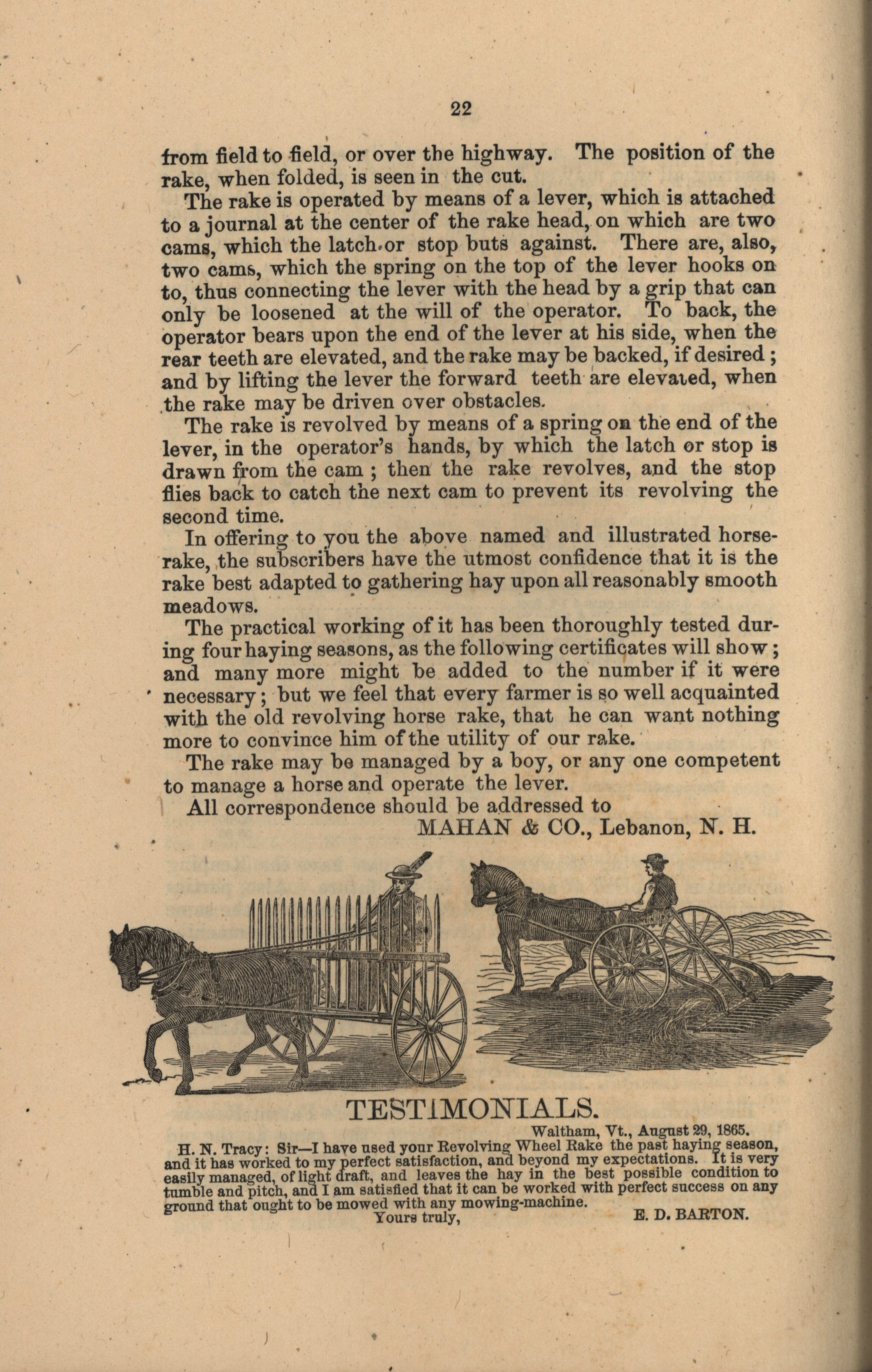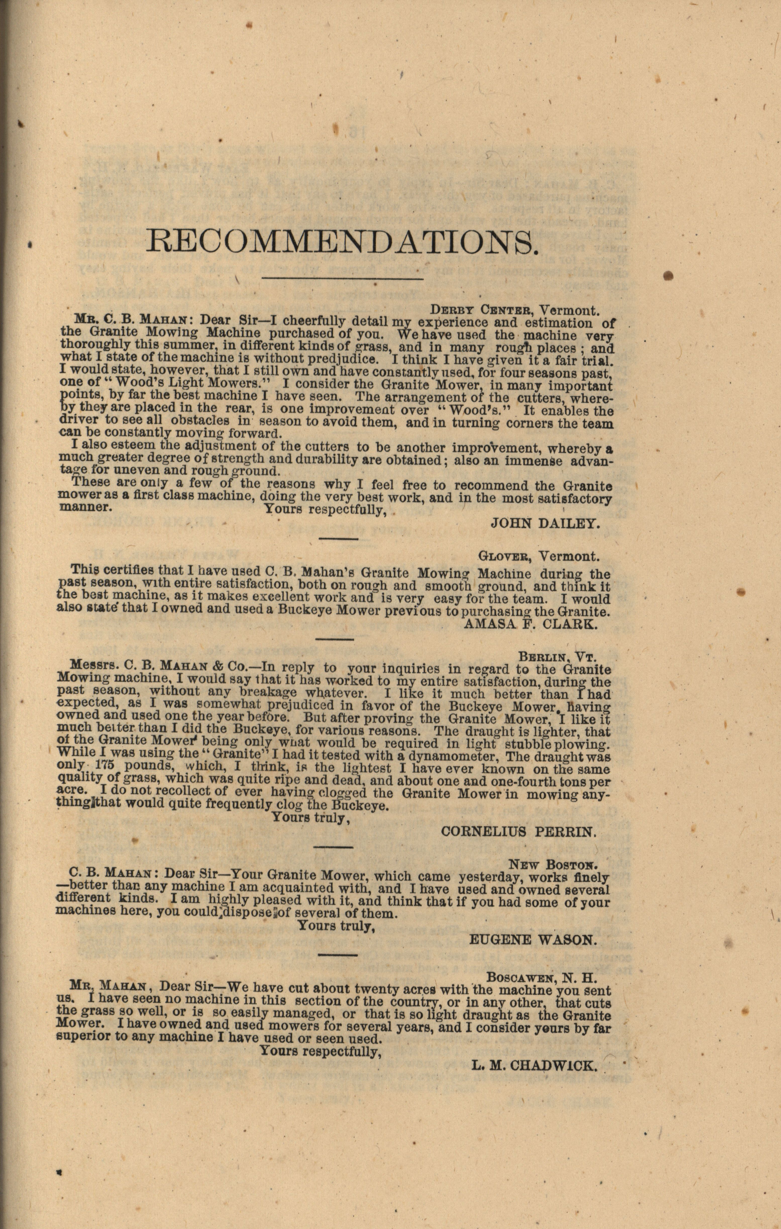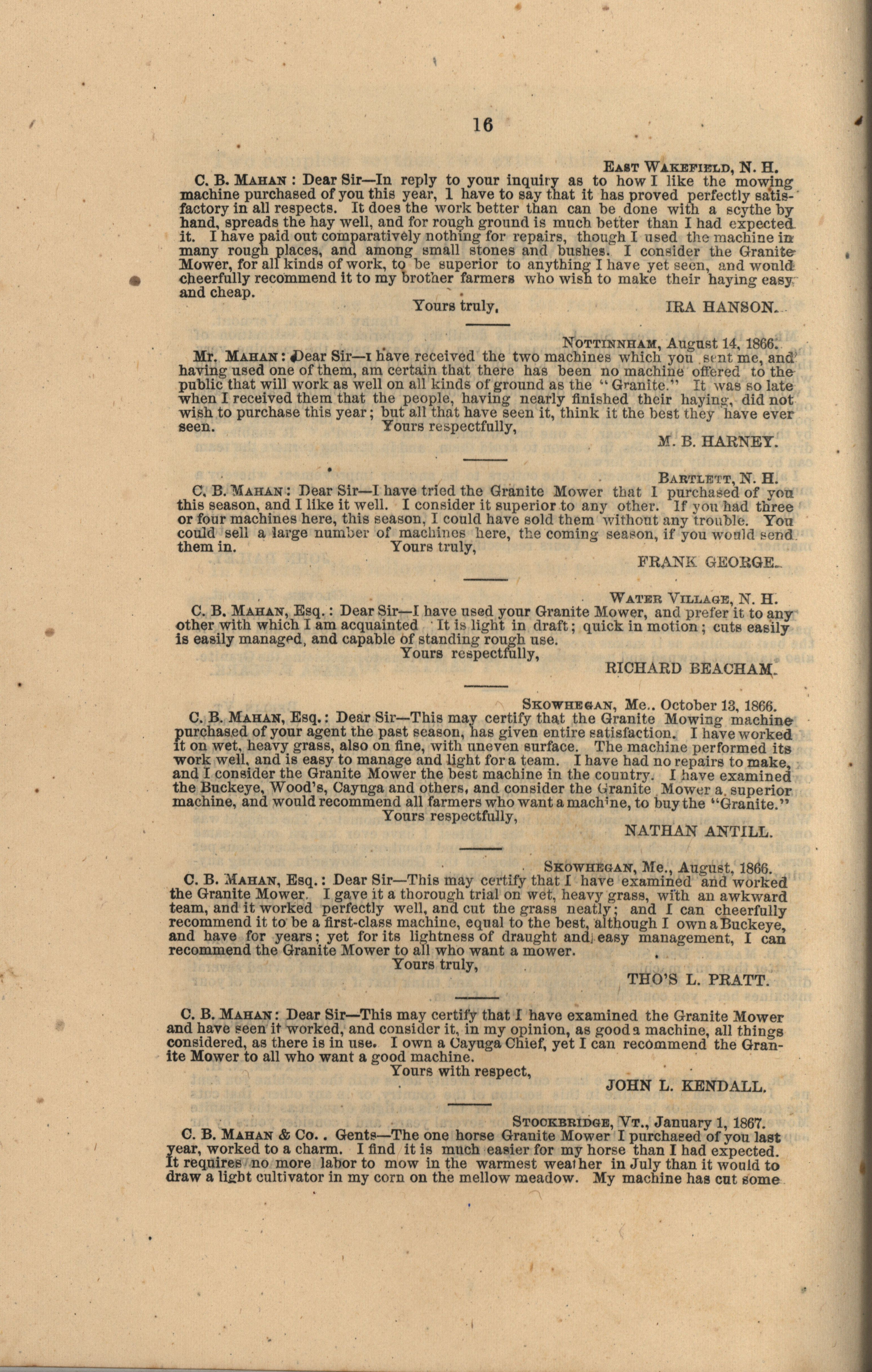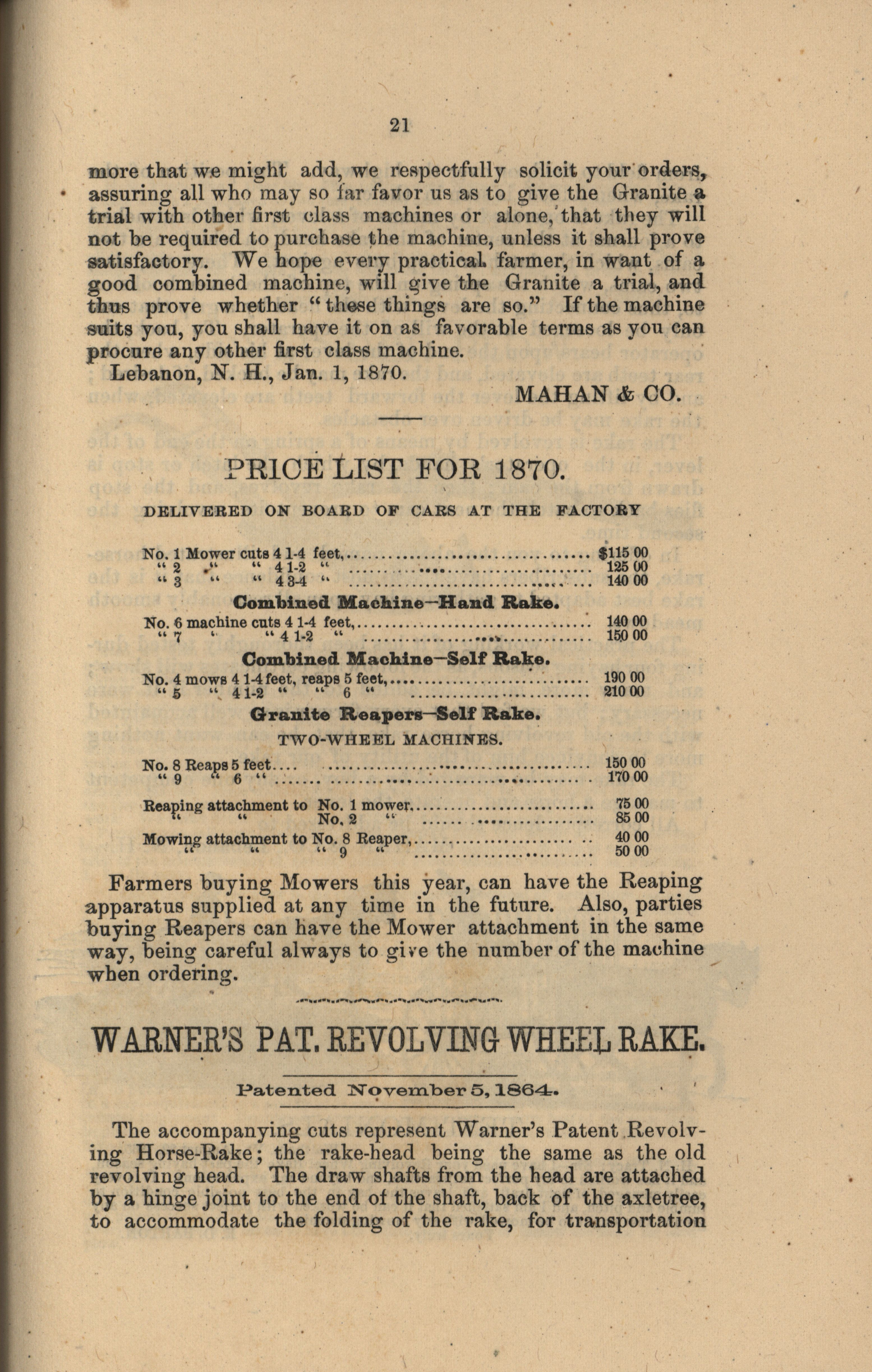 - "Mahan and Company Granite Agricultural Works catalog", Agricultural Machinery Literature Collection, Iowa State University Library Digital Collections