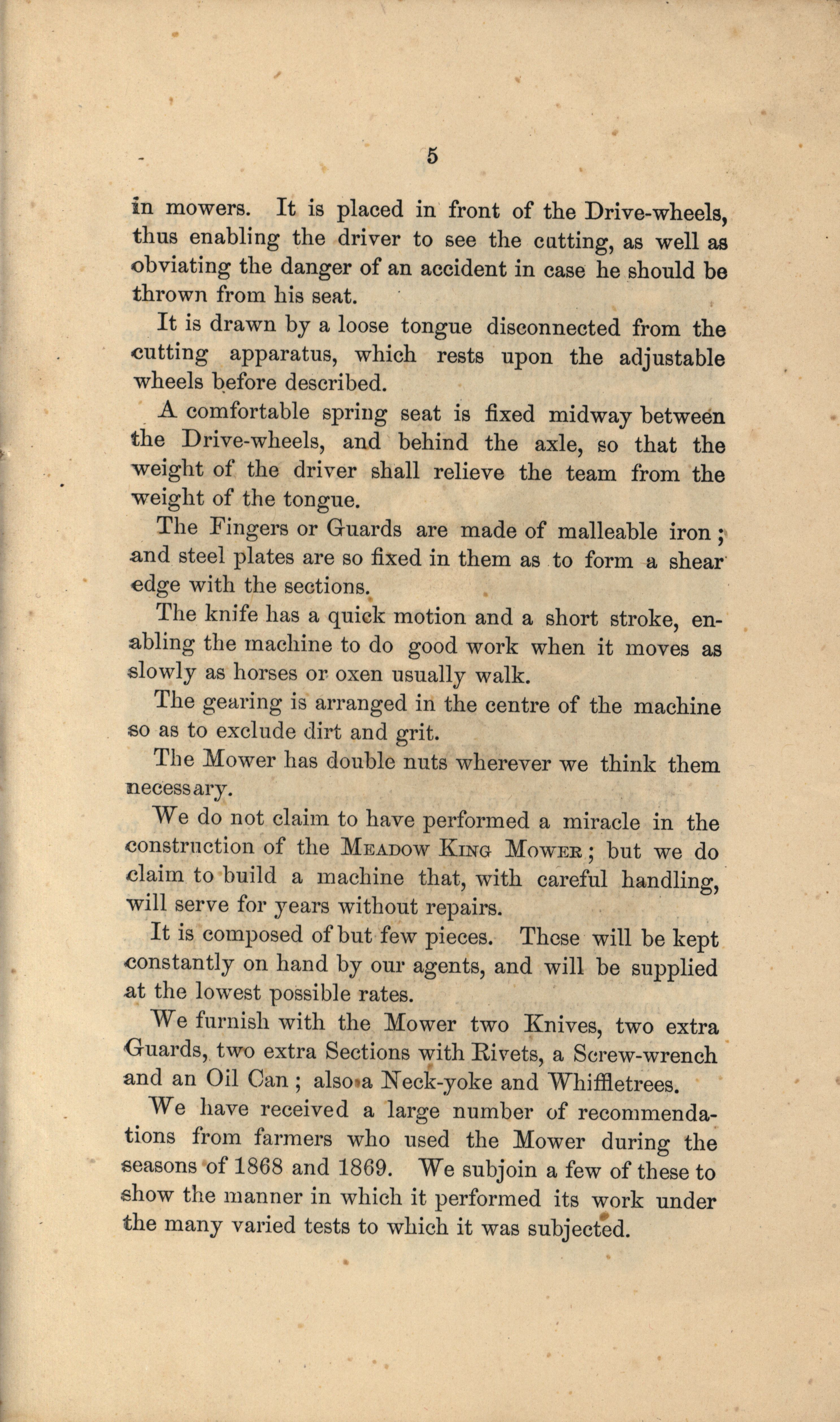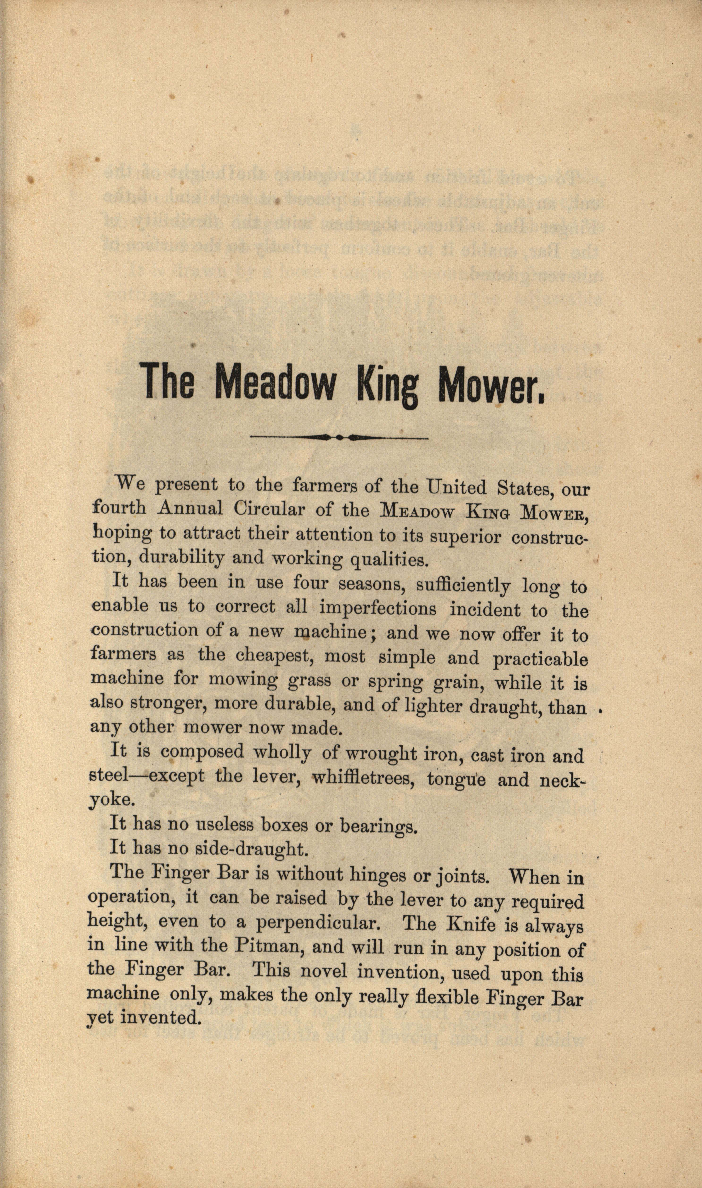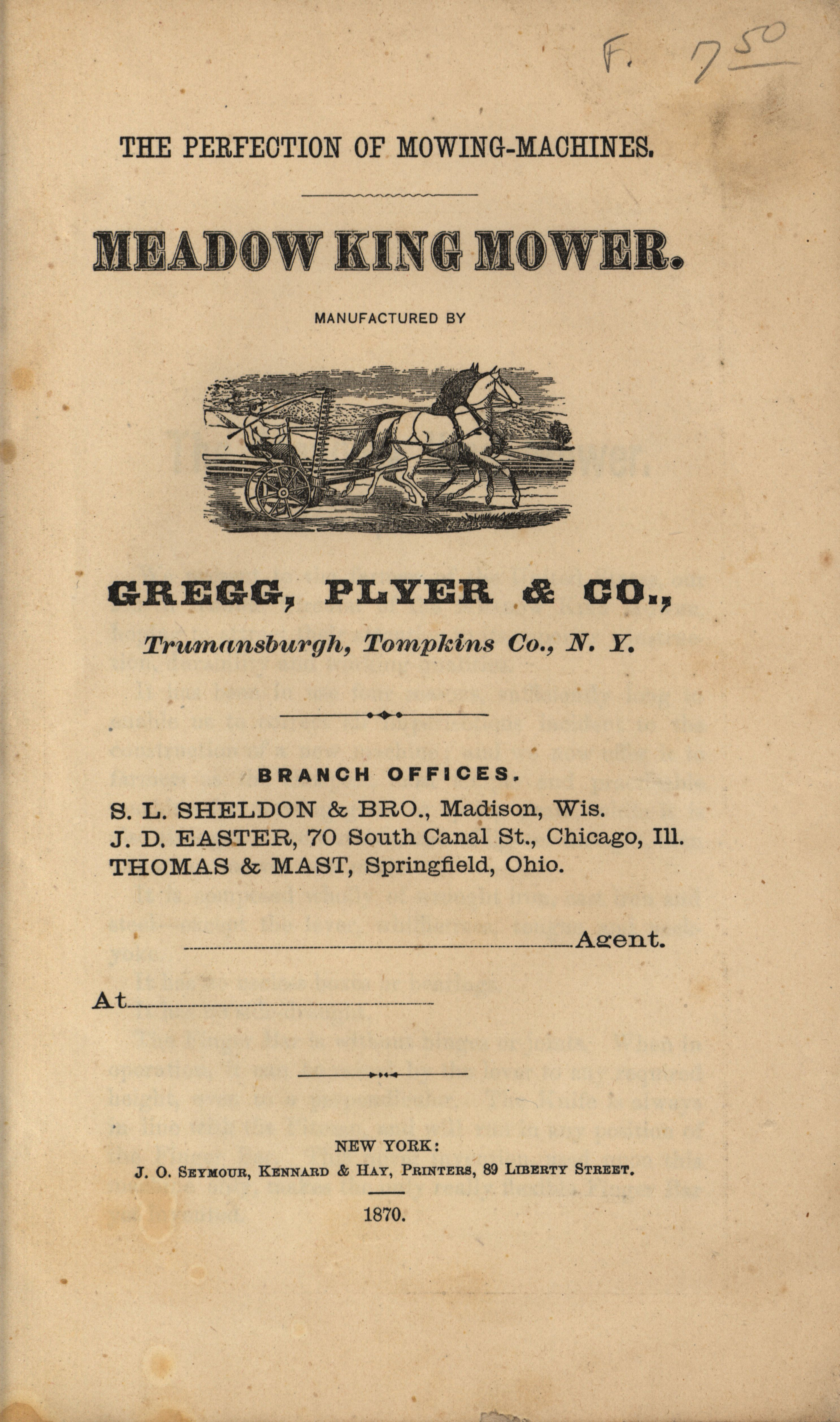 - Illustrated catalog describing the meadow king mower and related agricultural products offered by Gregg, Plyer and Company in 1870.