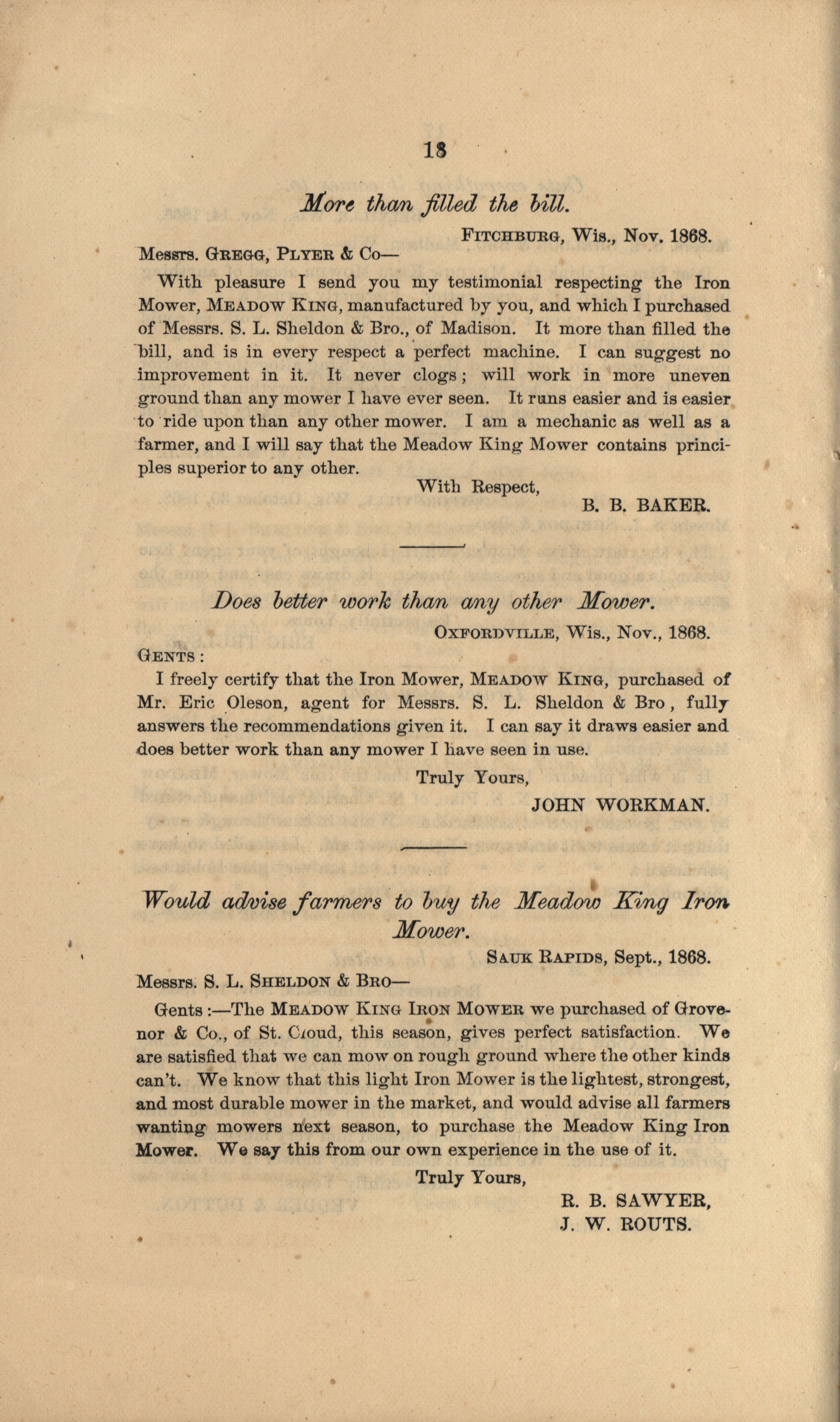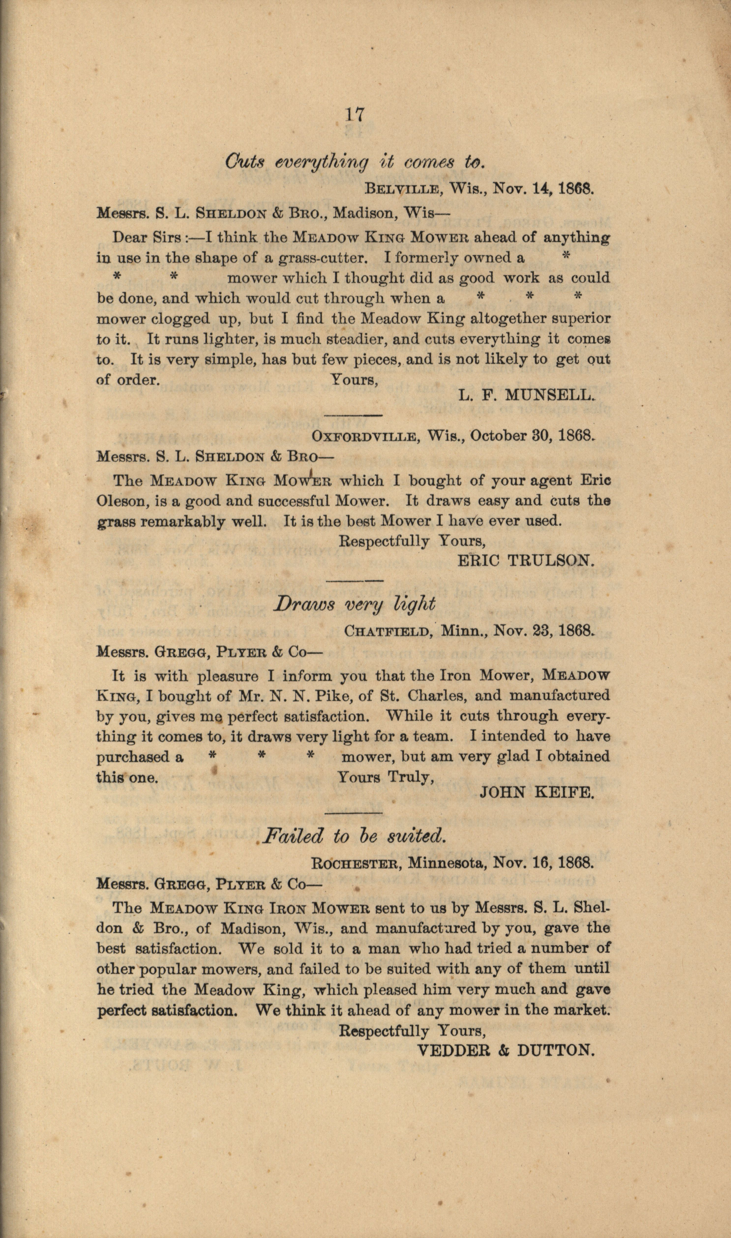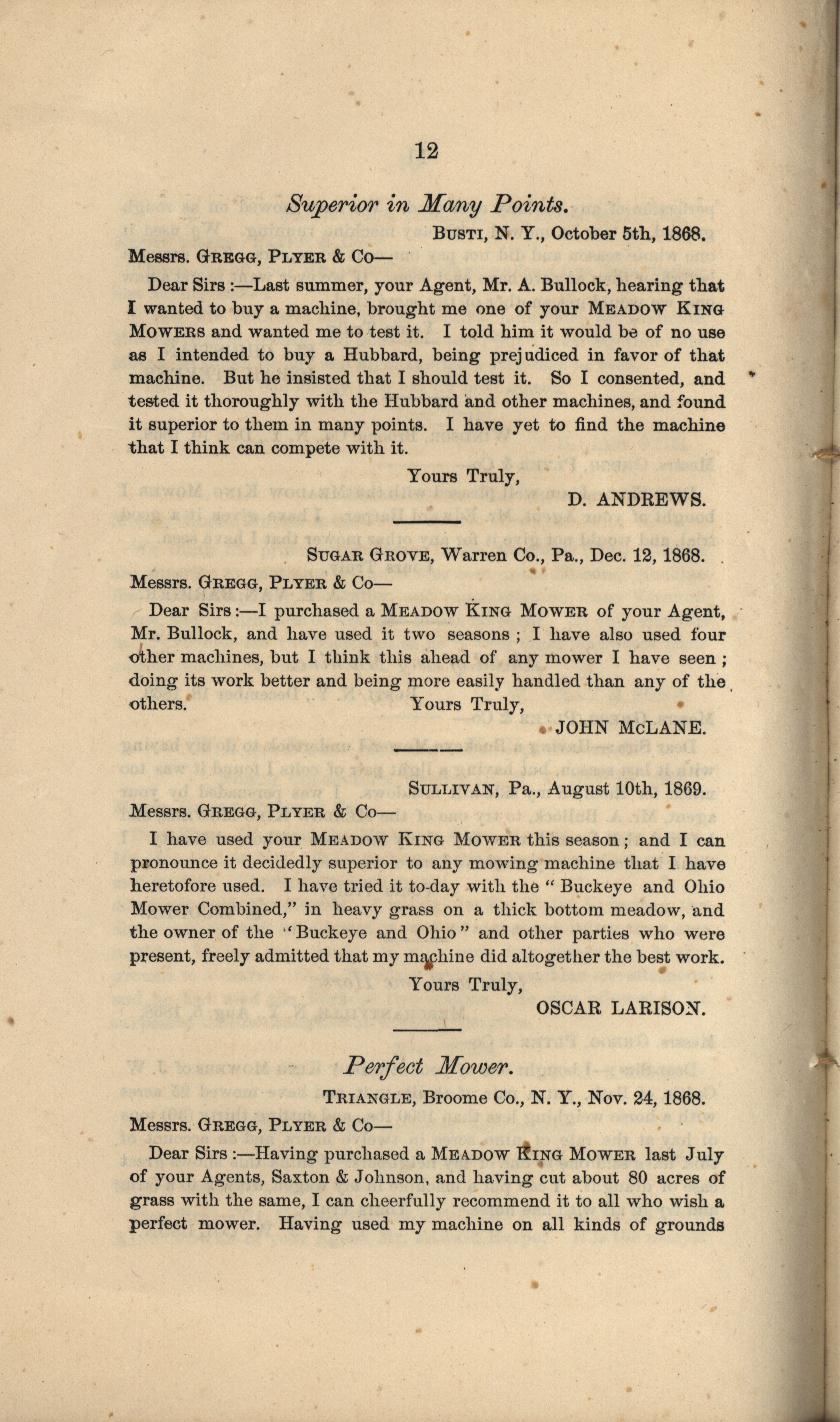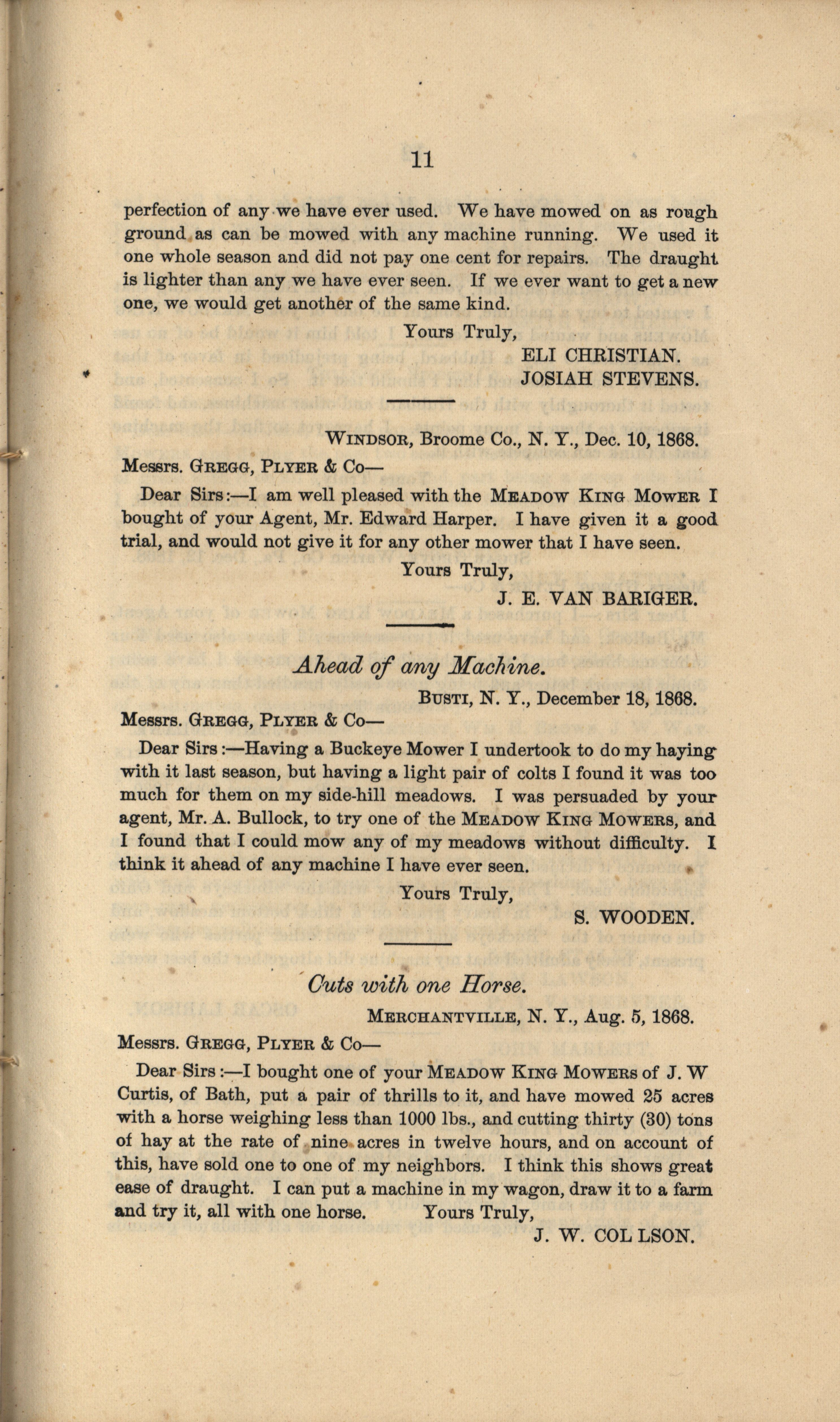- "Gregg, Plyer and Company Meadow King Mower catalog", Agricultural Machinery Literature Collection, Iowa State University Library Digital Collections
