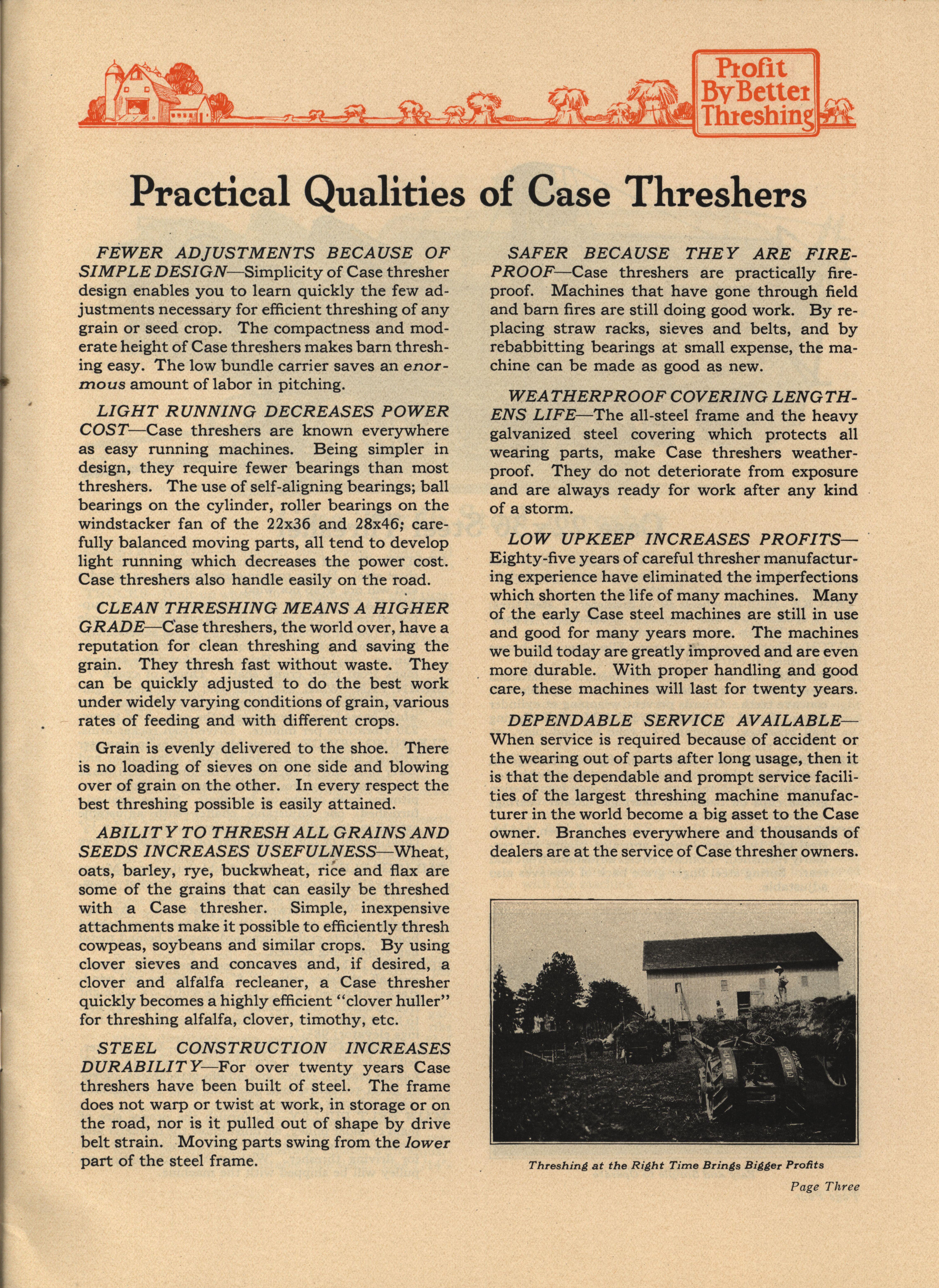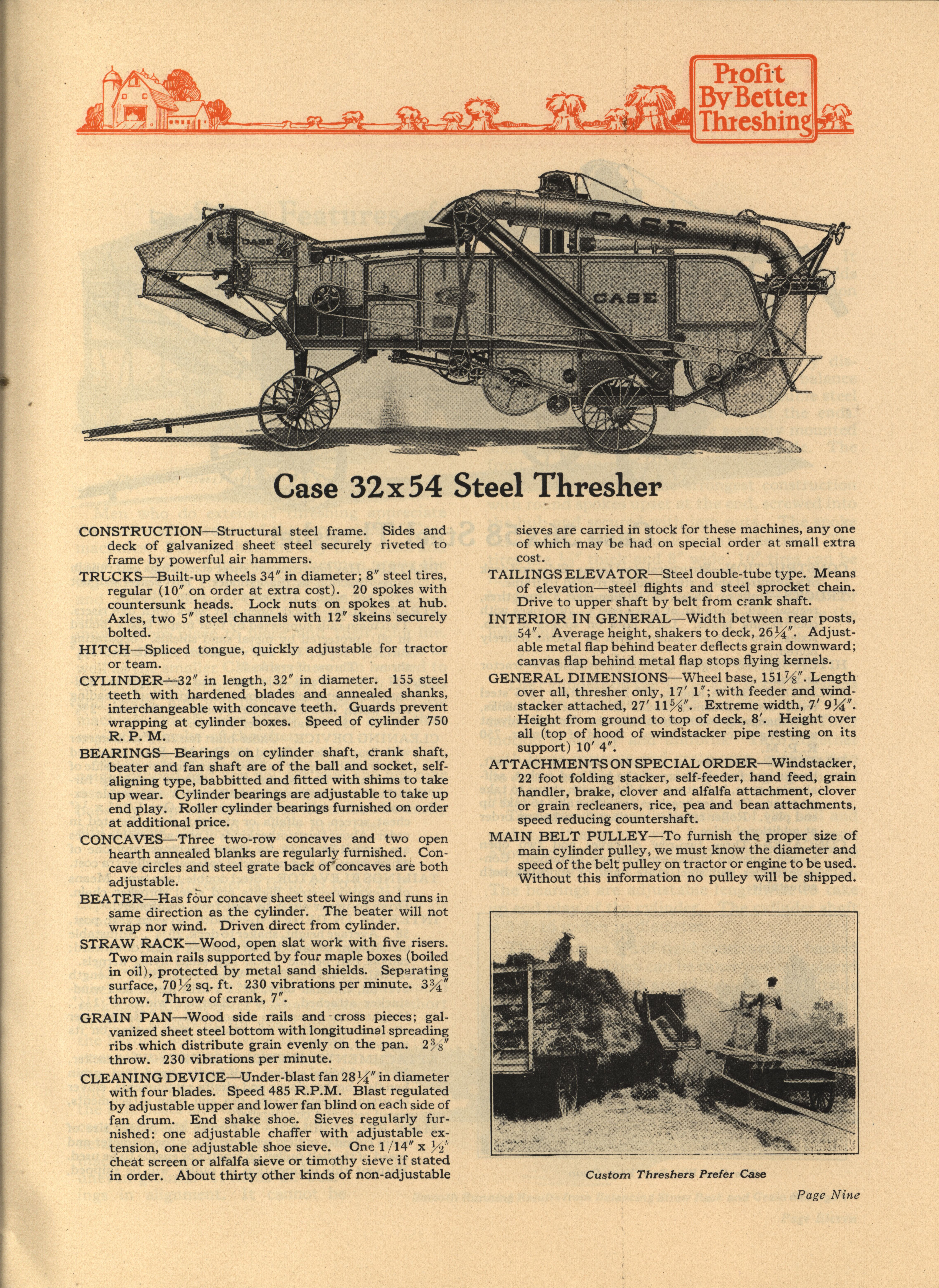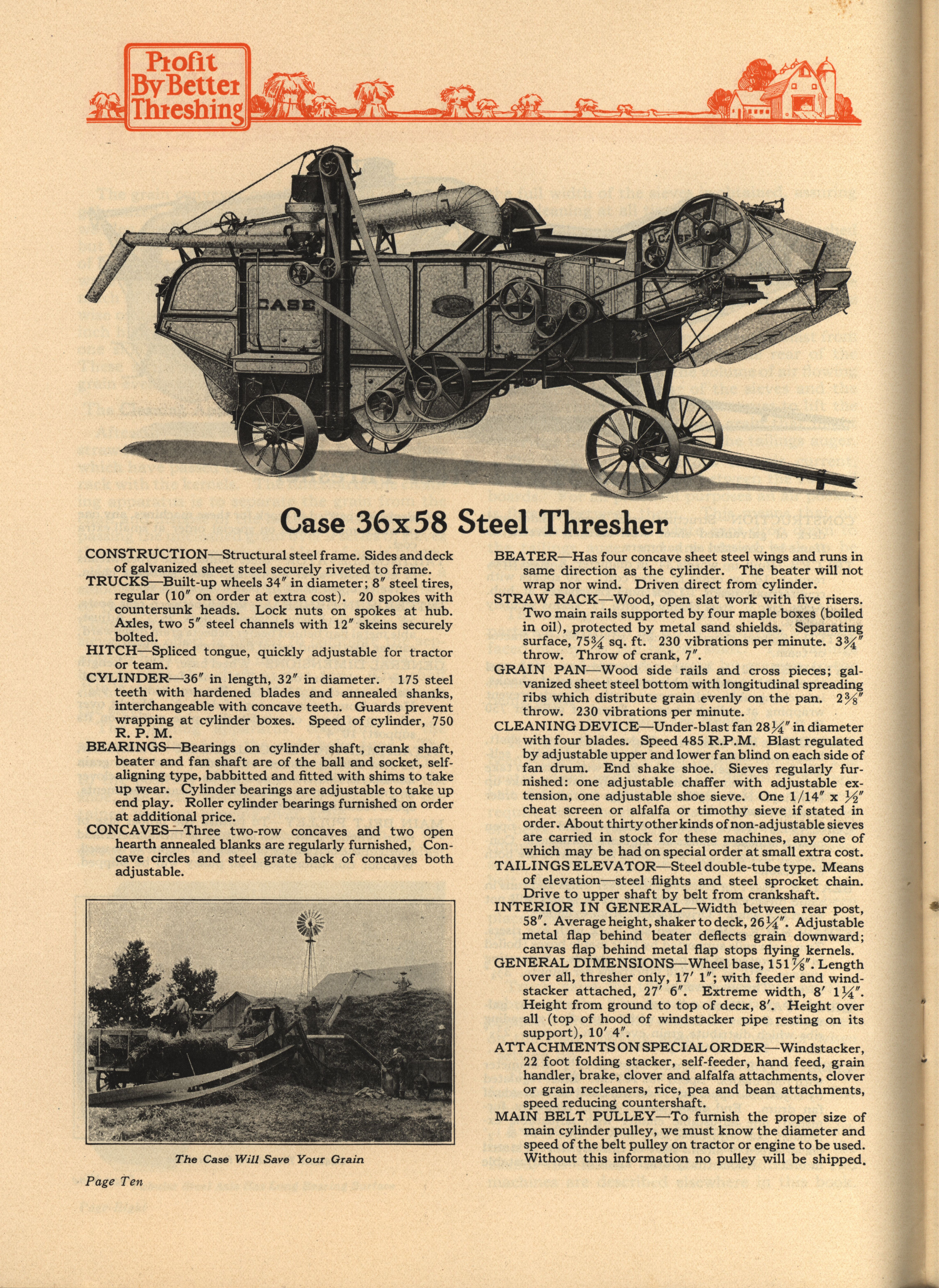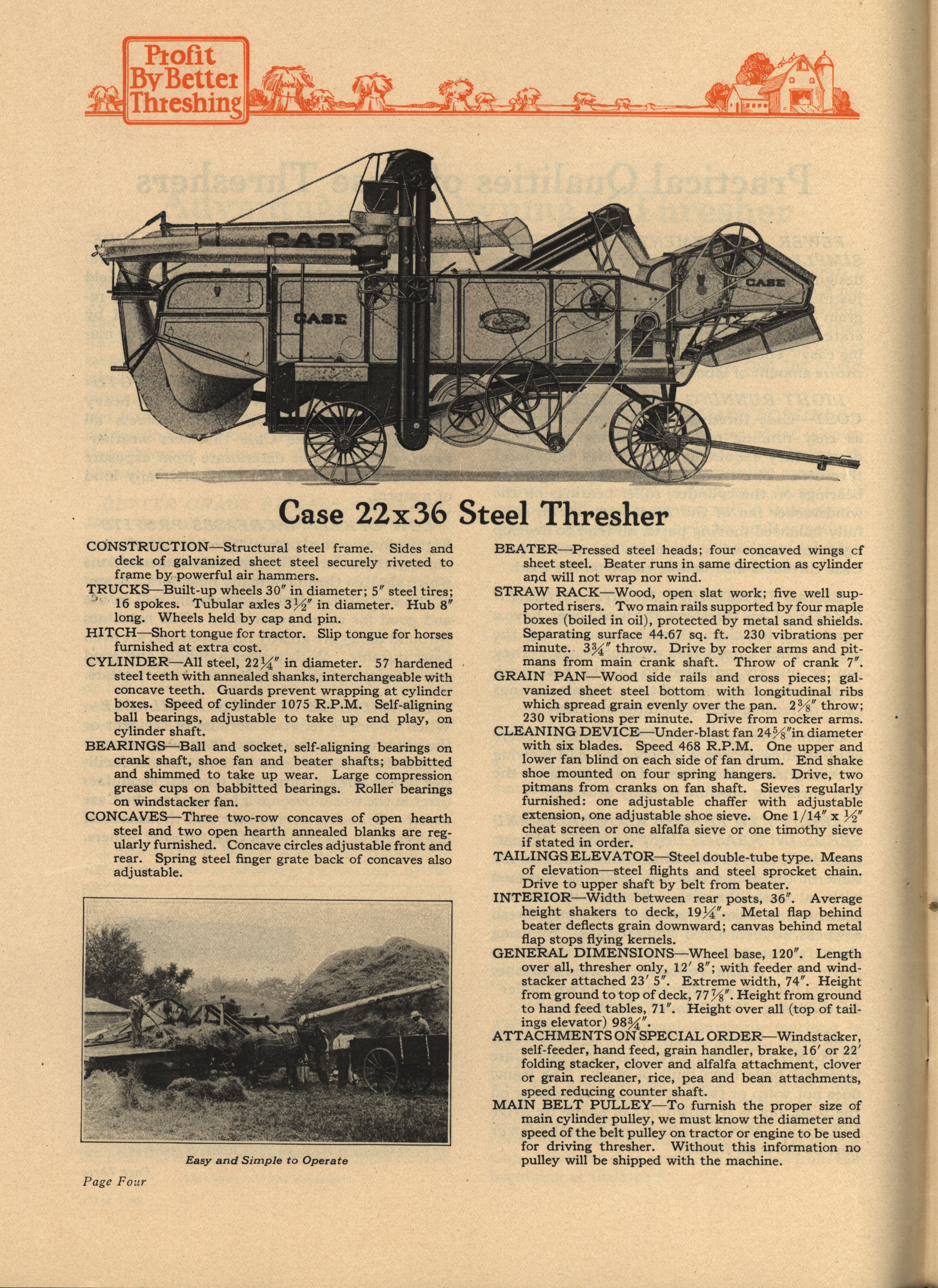 - Illustrated catalog for the Case Steel Built Threshing Machine product line offered by J. I. Case Threshing Machine Company.