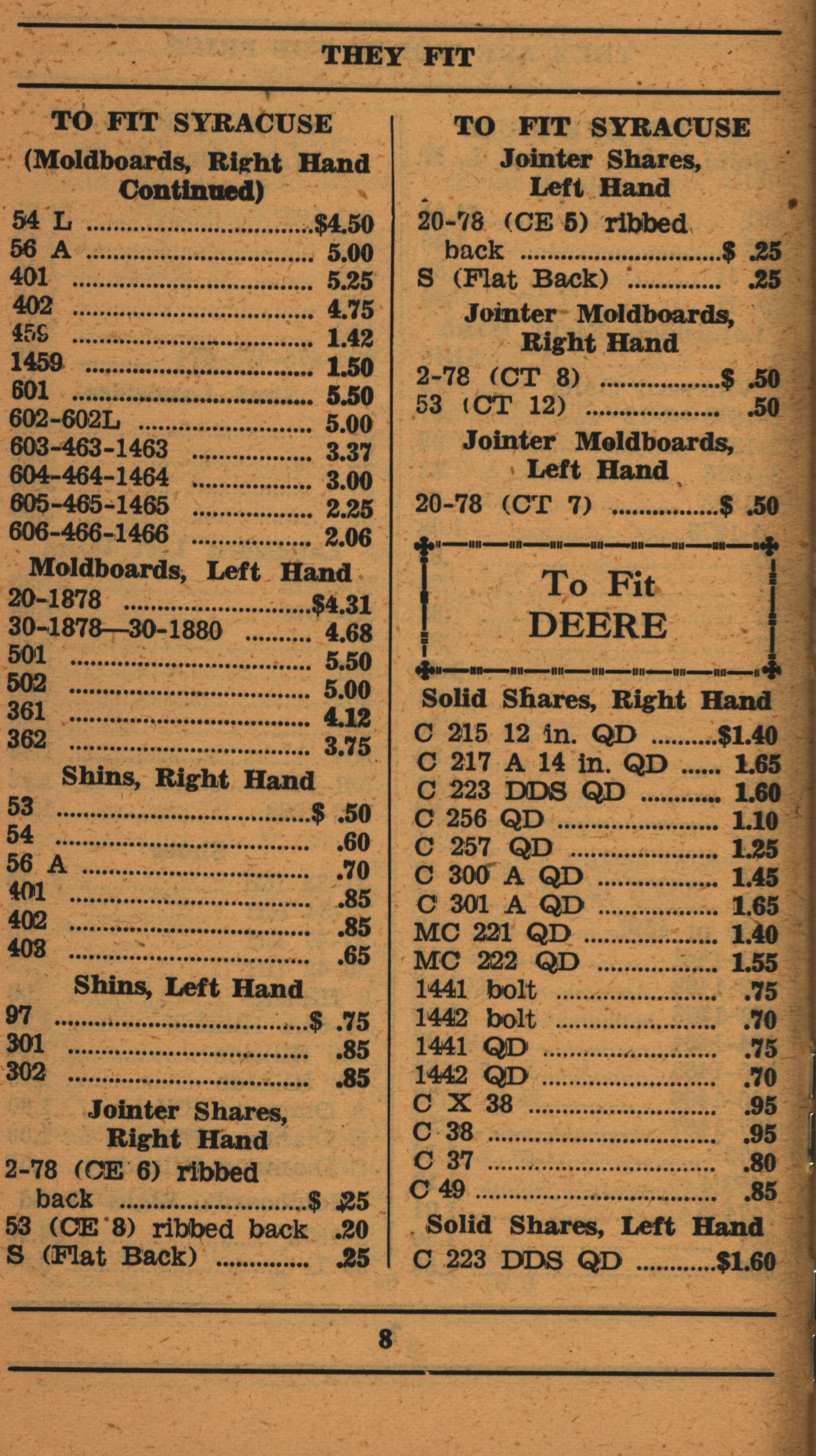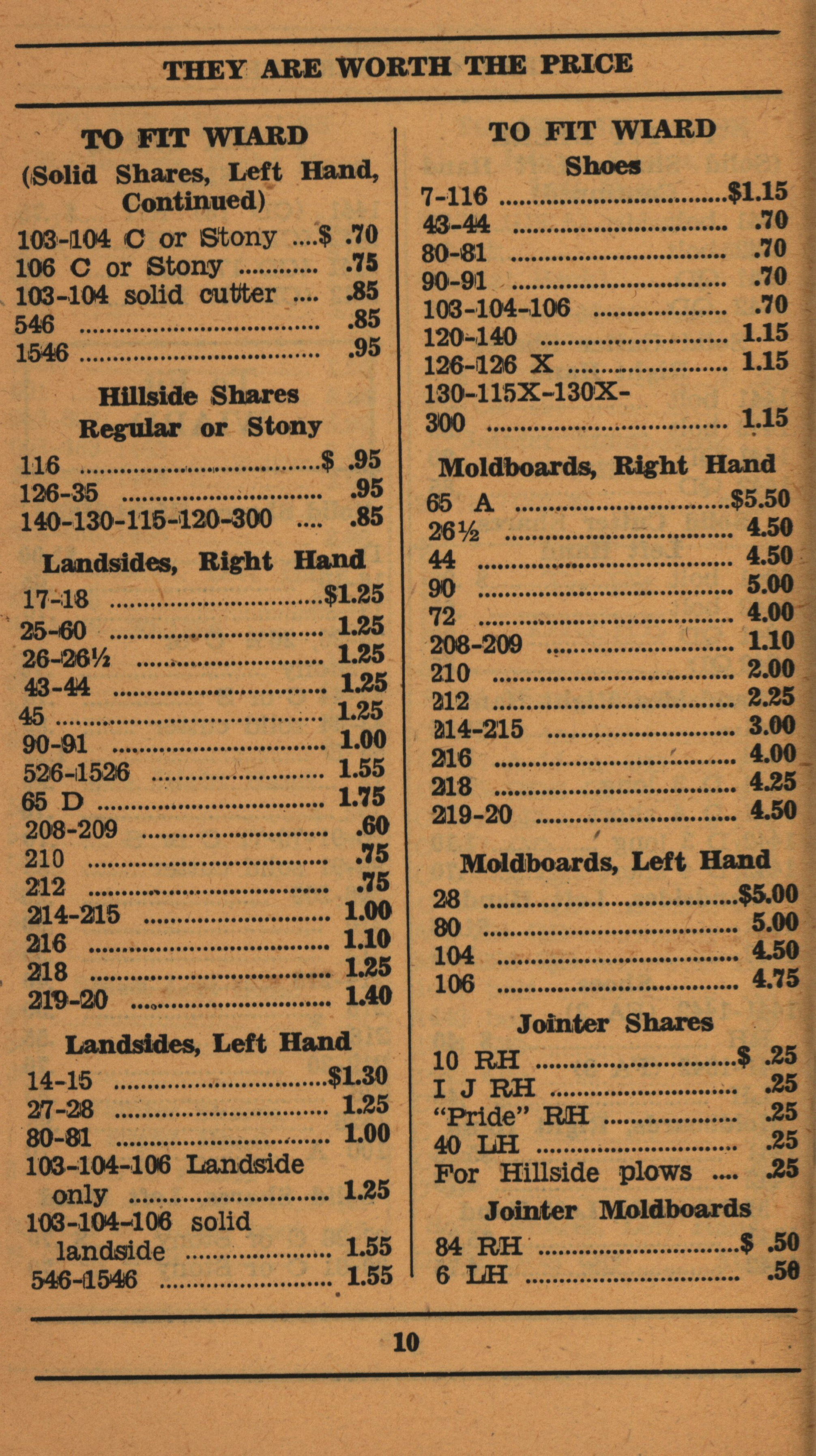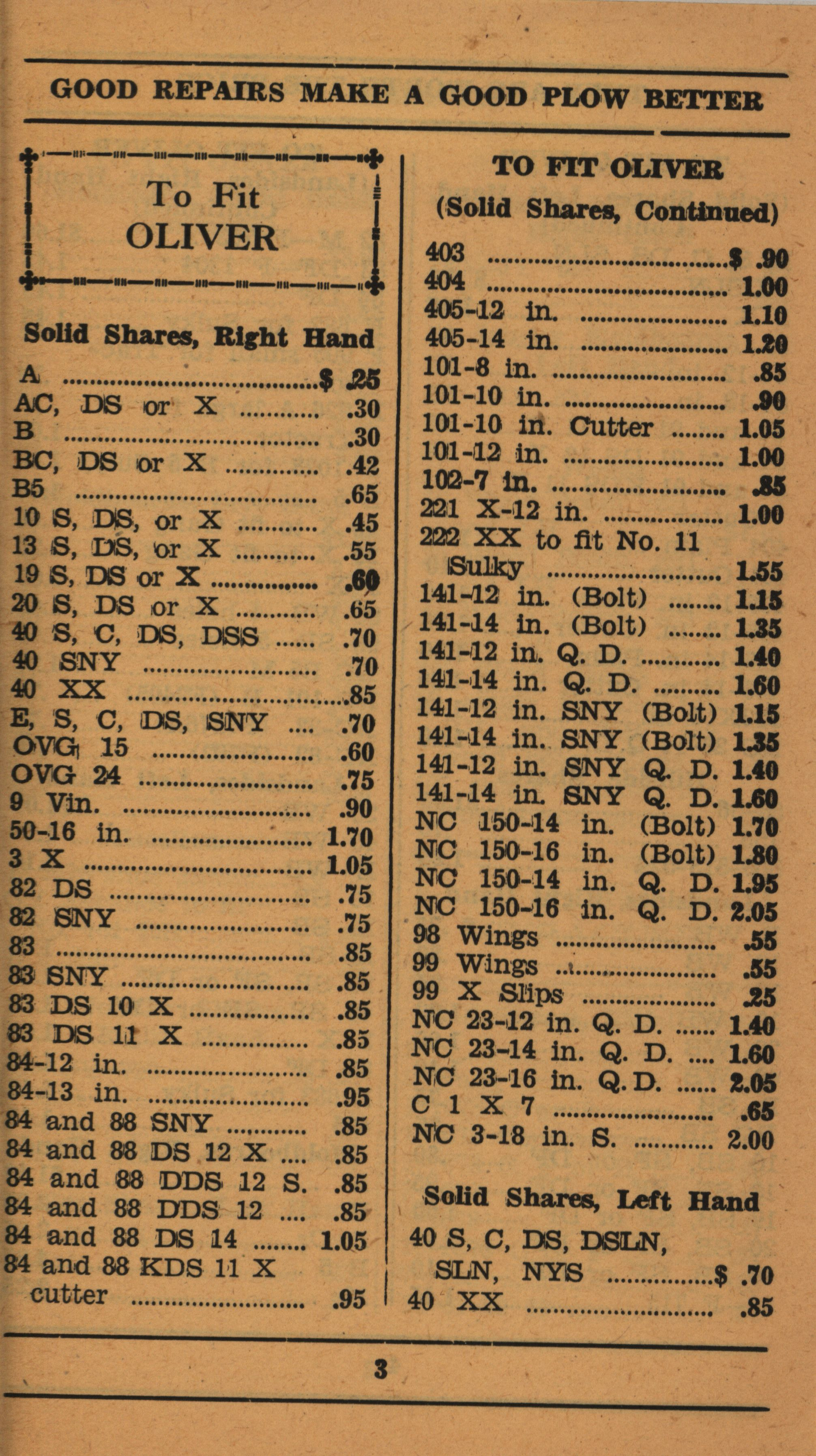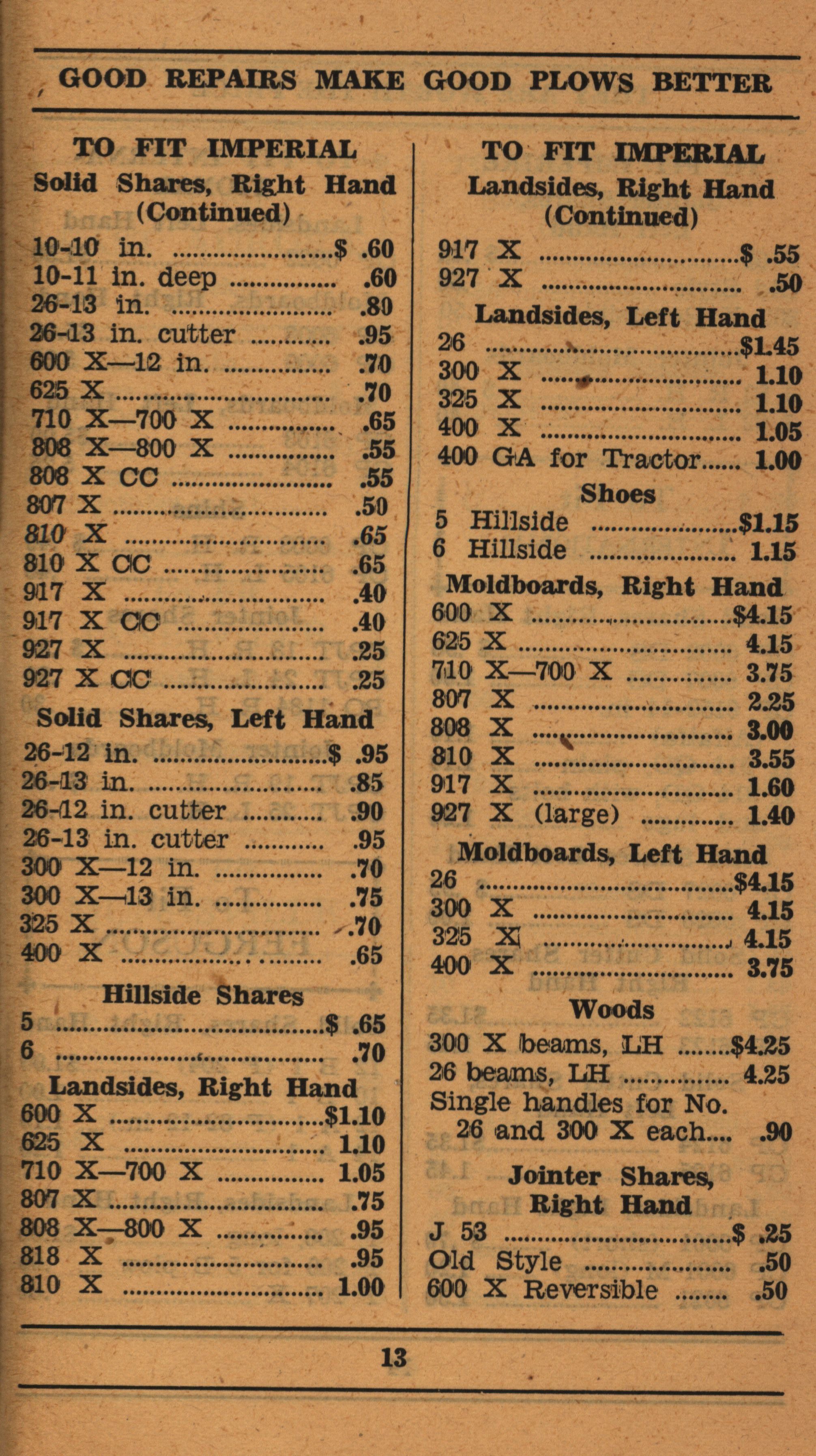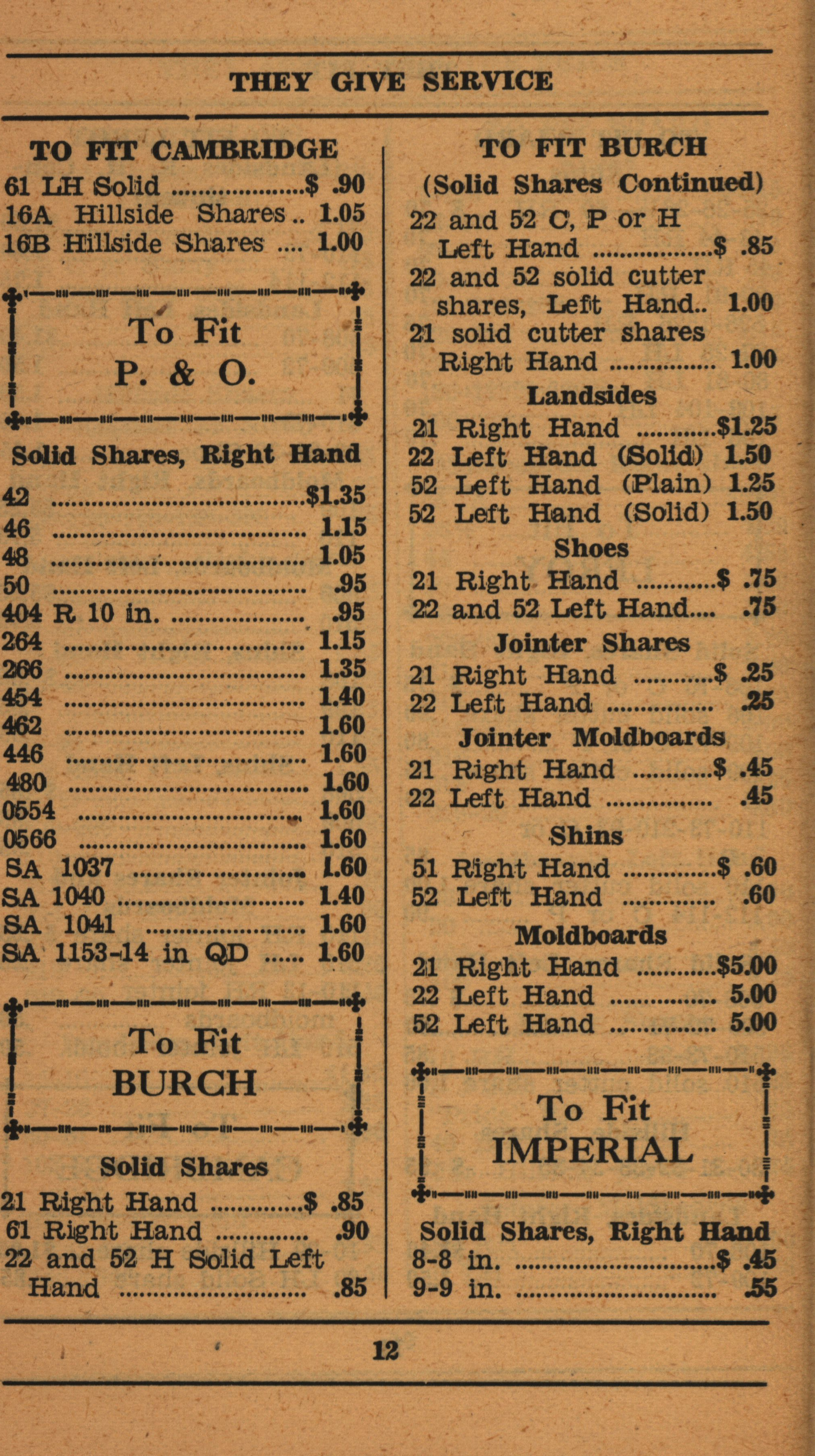- Price list for repairs and parts for agricultural implements offered by Hamburg Plow Works.