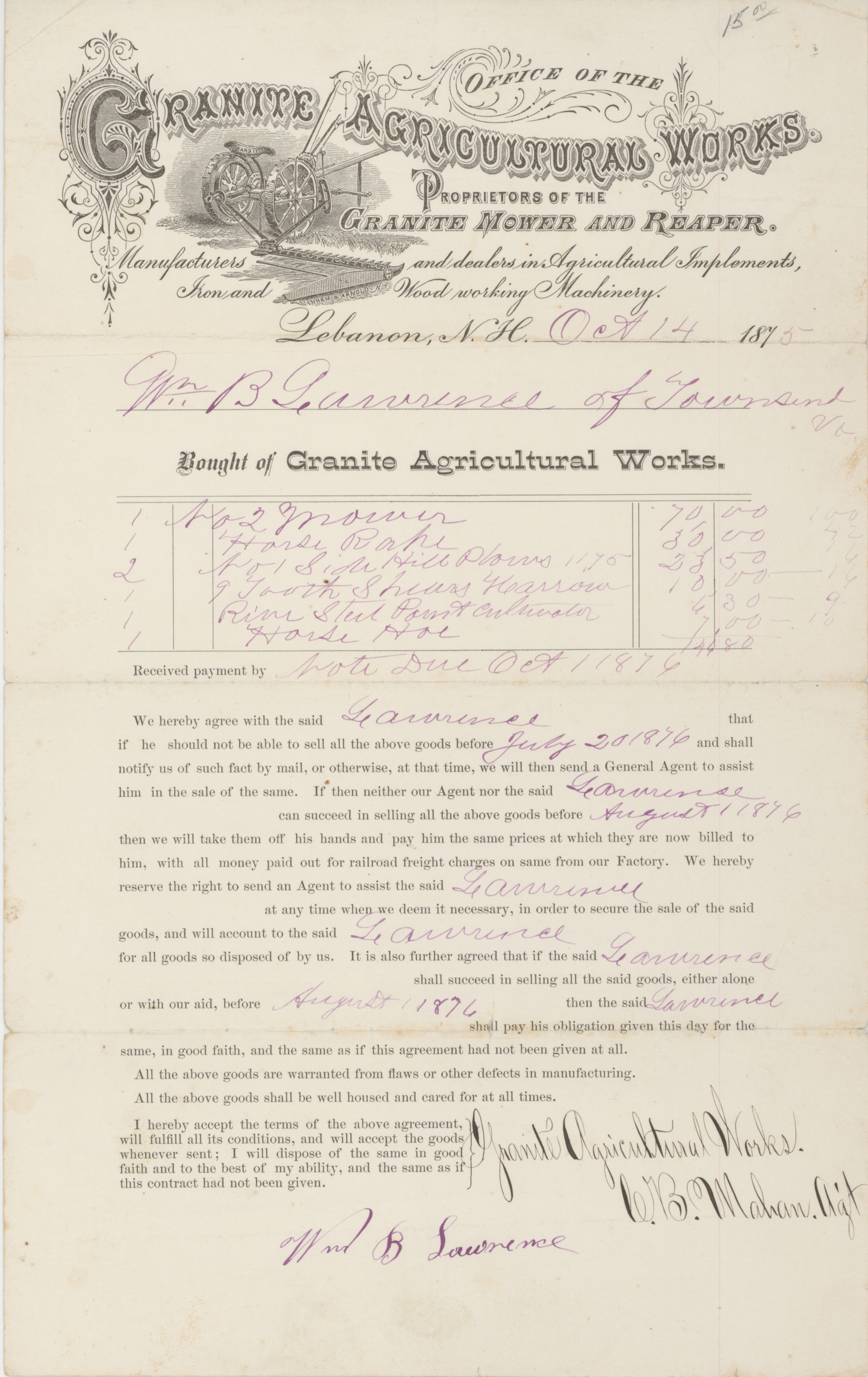 - Receipt of purchase dated October 14, 1875 from Granite Agricultural Works.