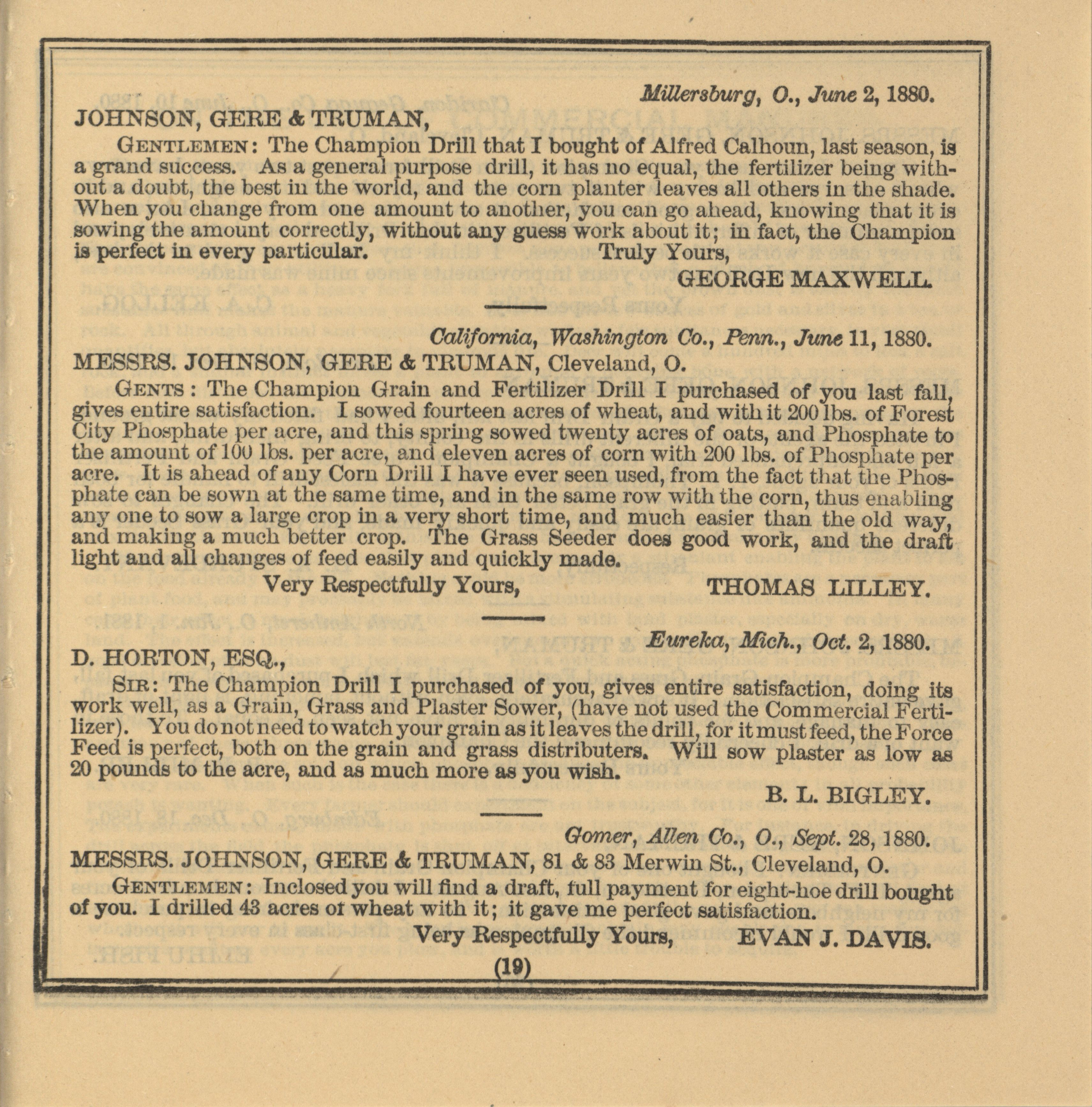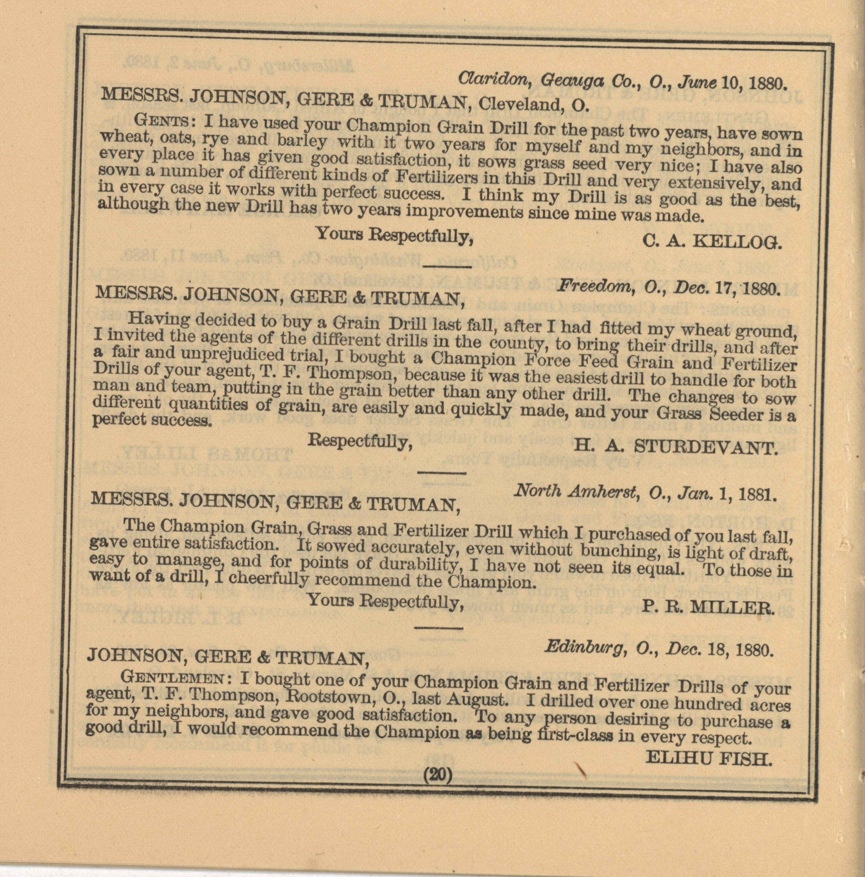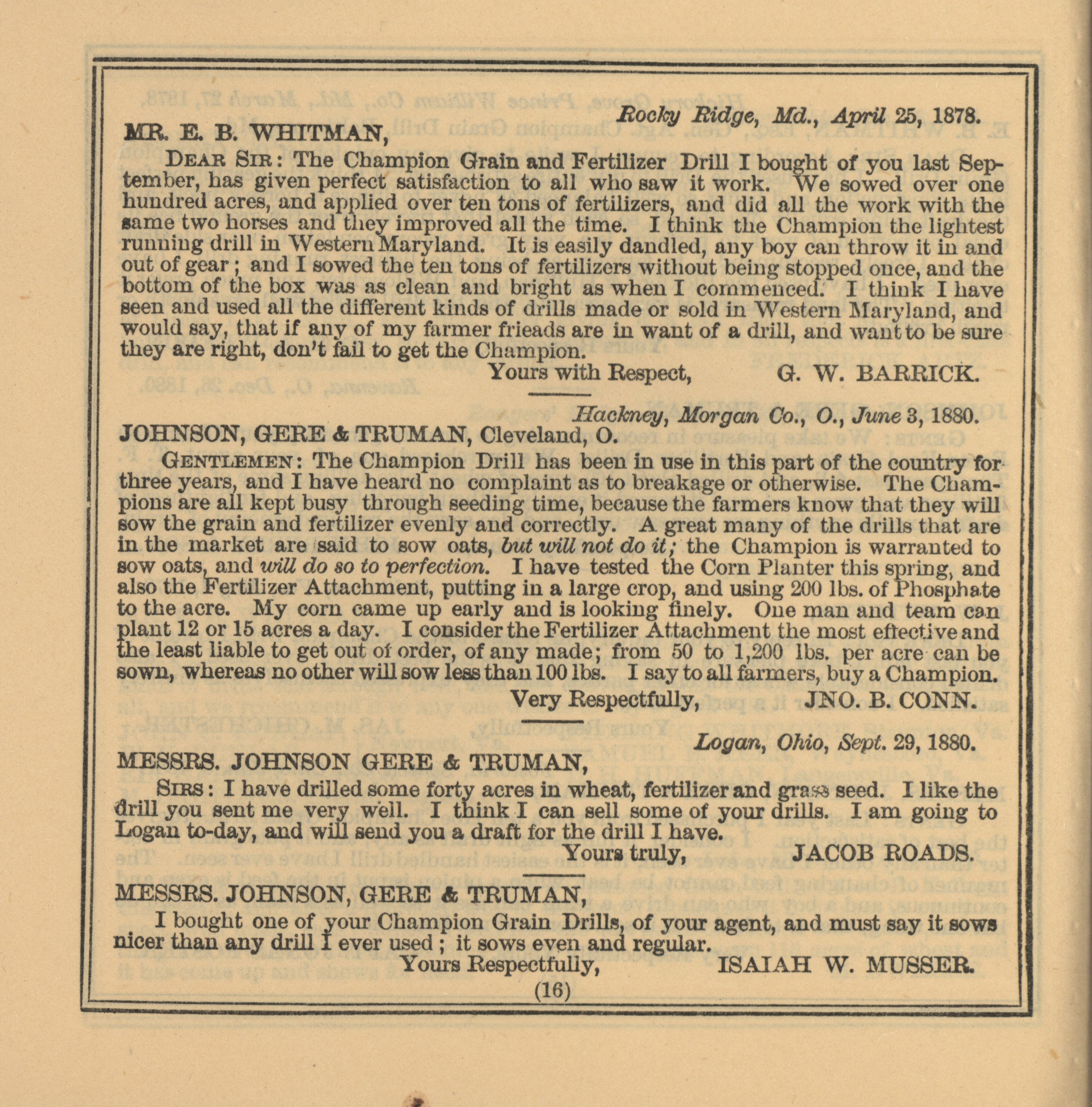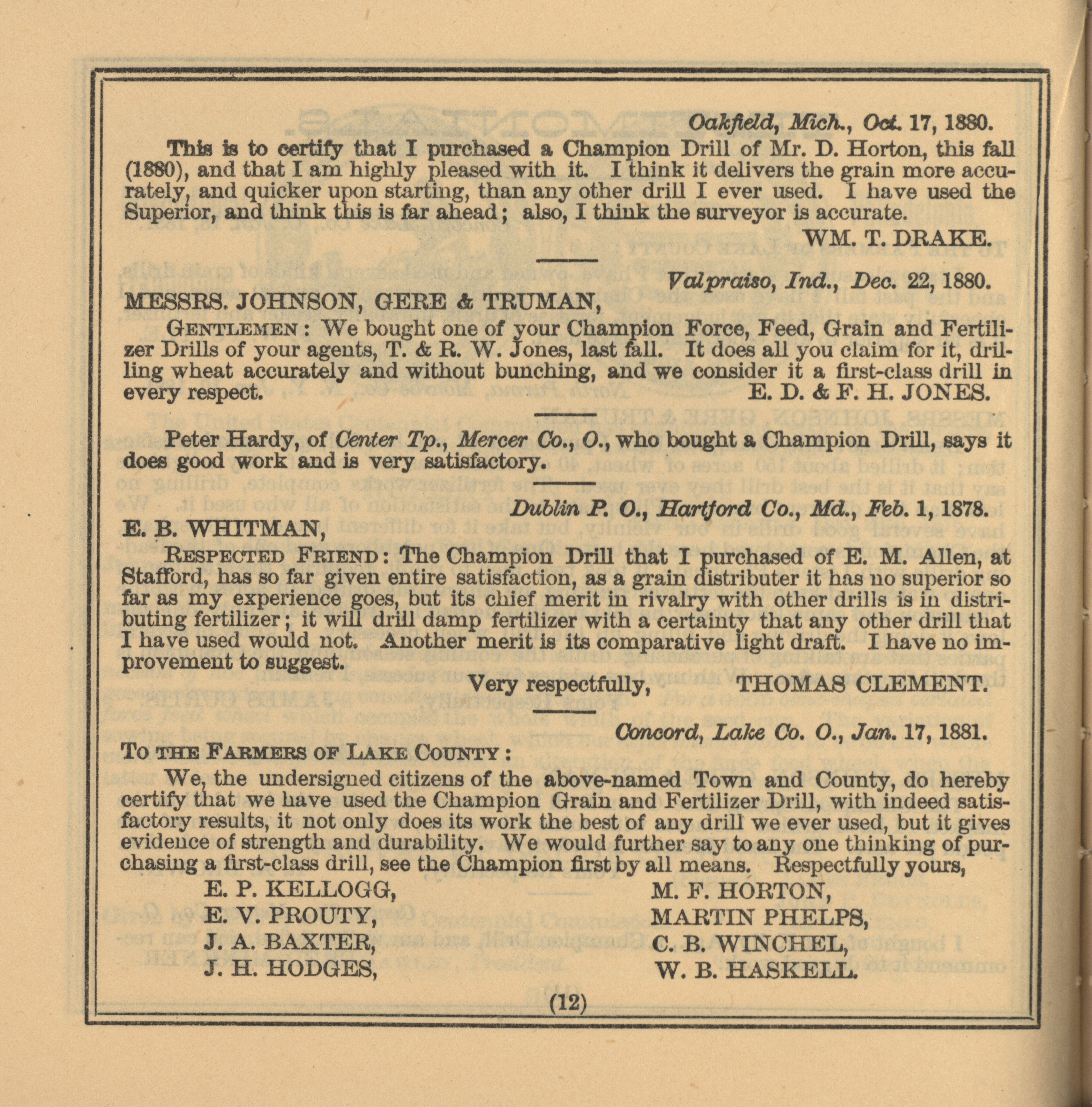 - "Johnson, Gere and Truman Champion Grain Drill catalog", Agricultural Machinery Literature Collection, Iowa State University Library Digital Collections
