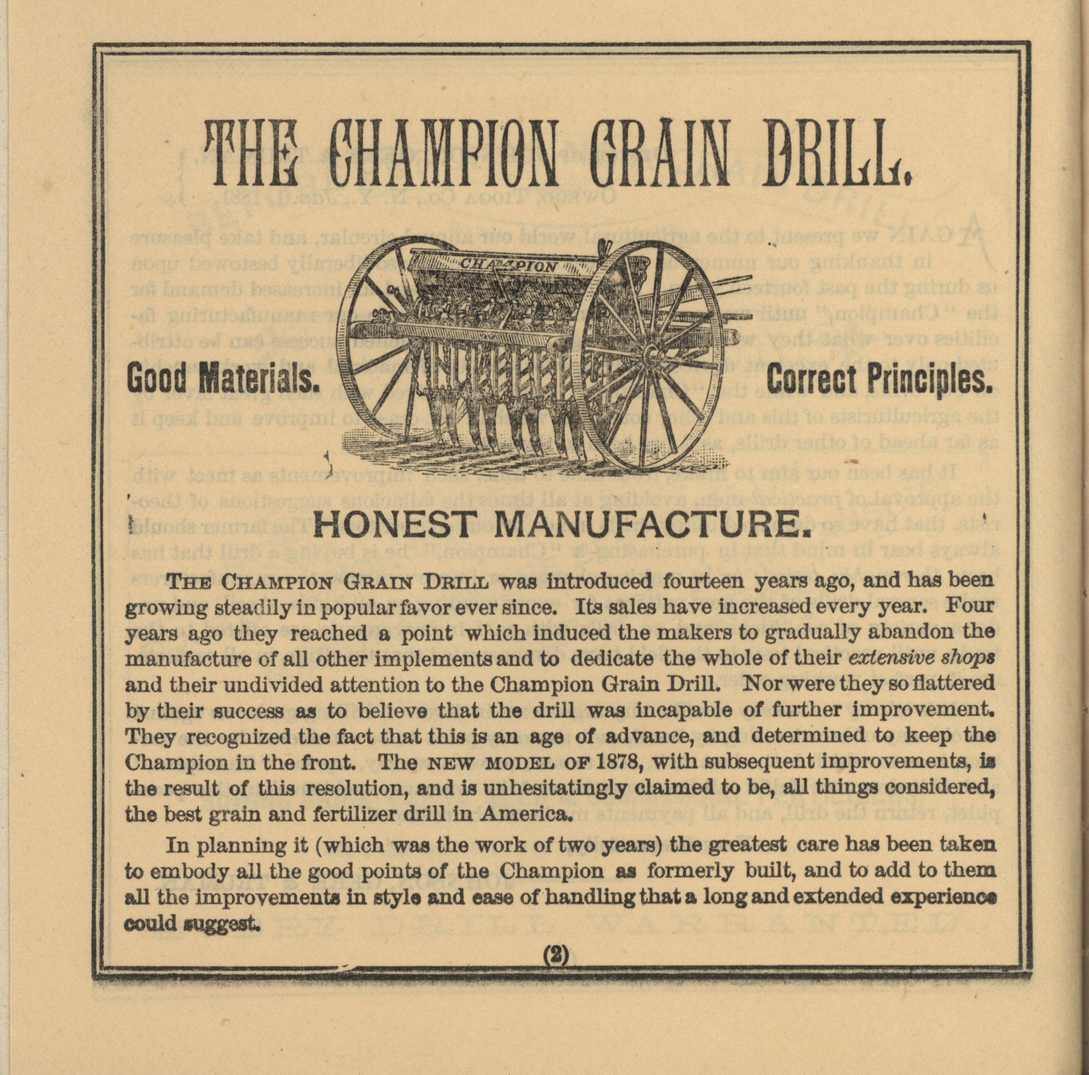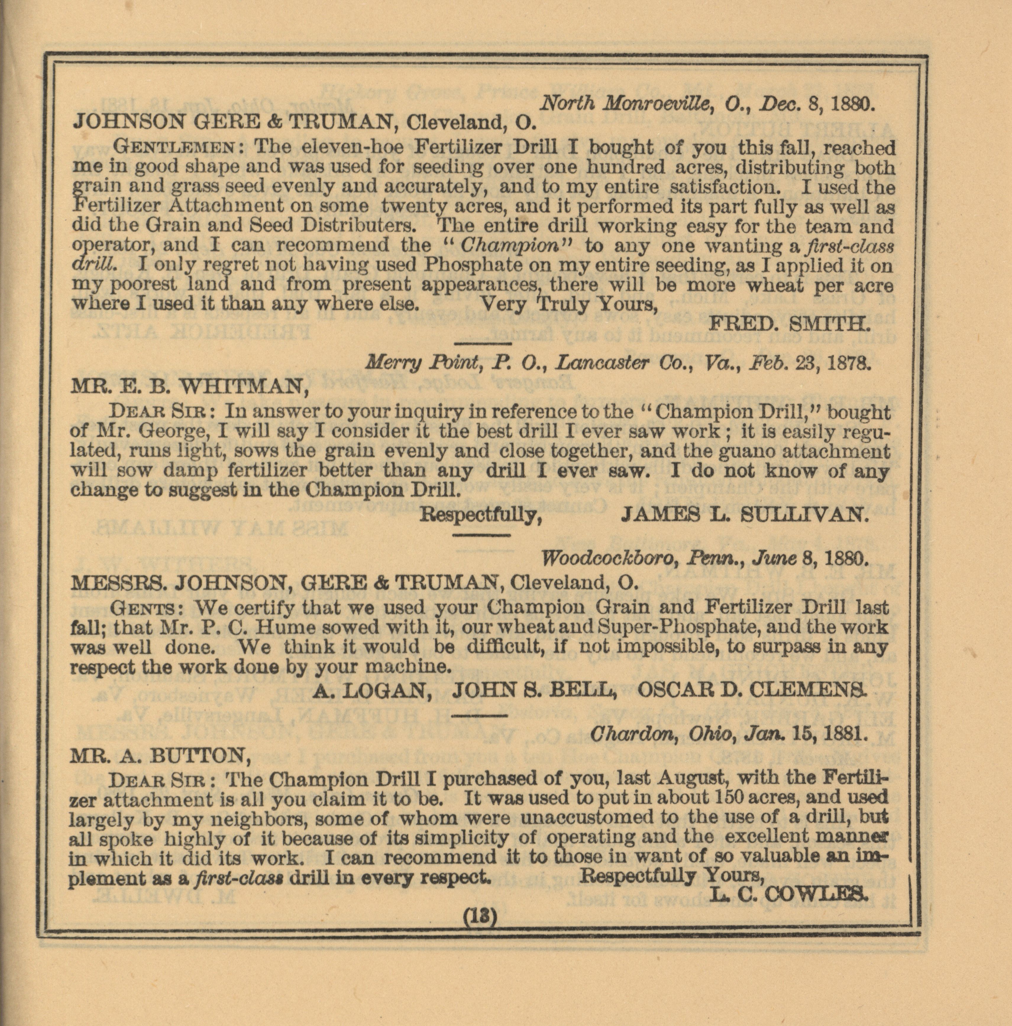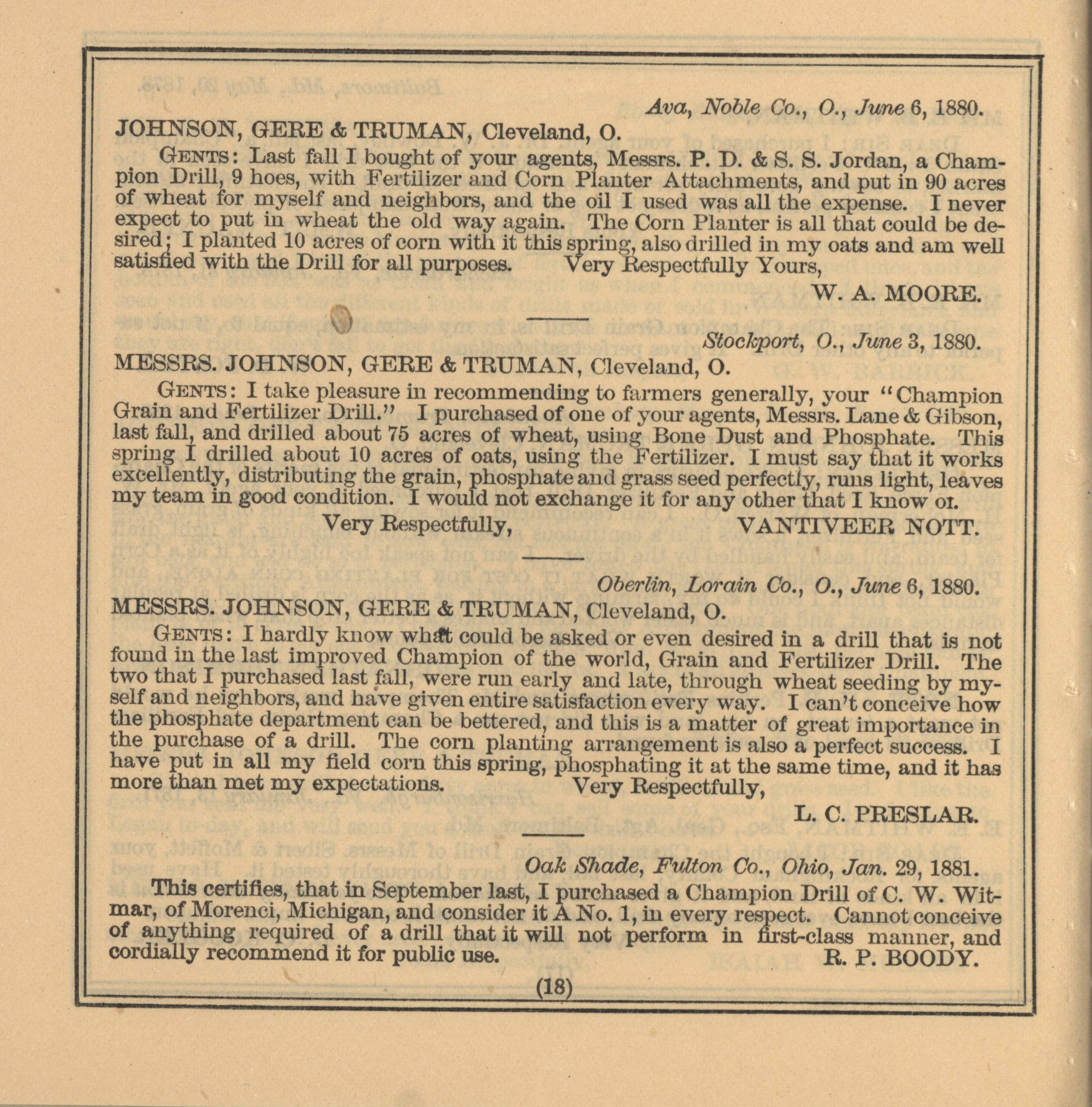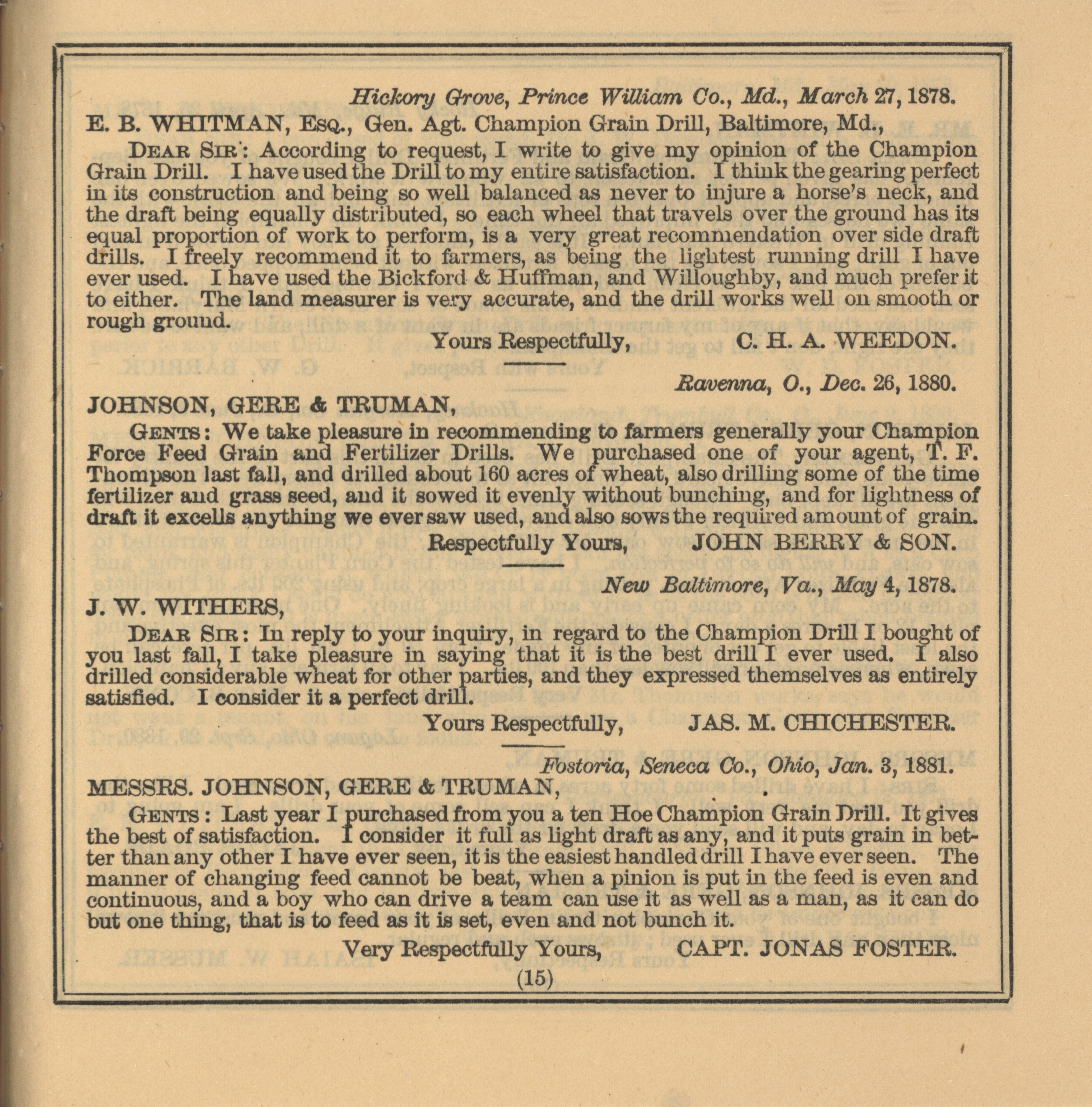 - "Johnson, Gere and Truman Champion Grain Drill catalog", Agricultural Machinery Literature Collection, Iowa State University Library Digital Collections