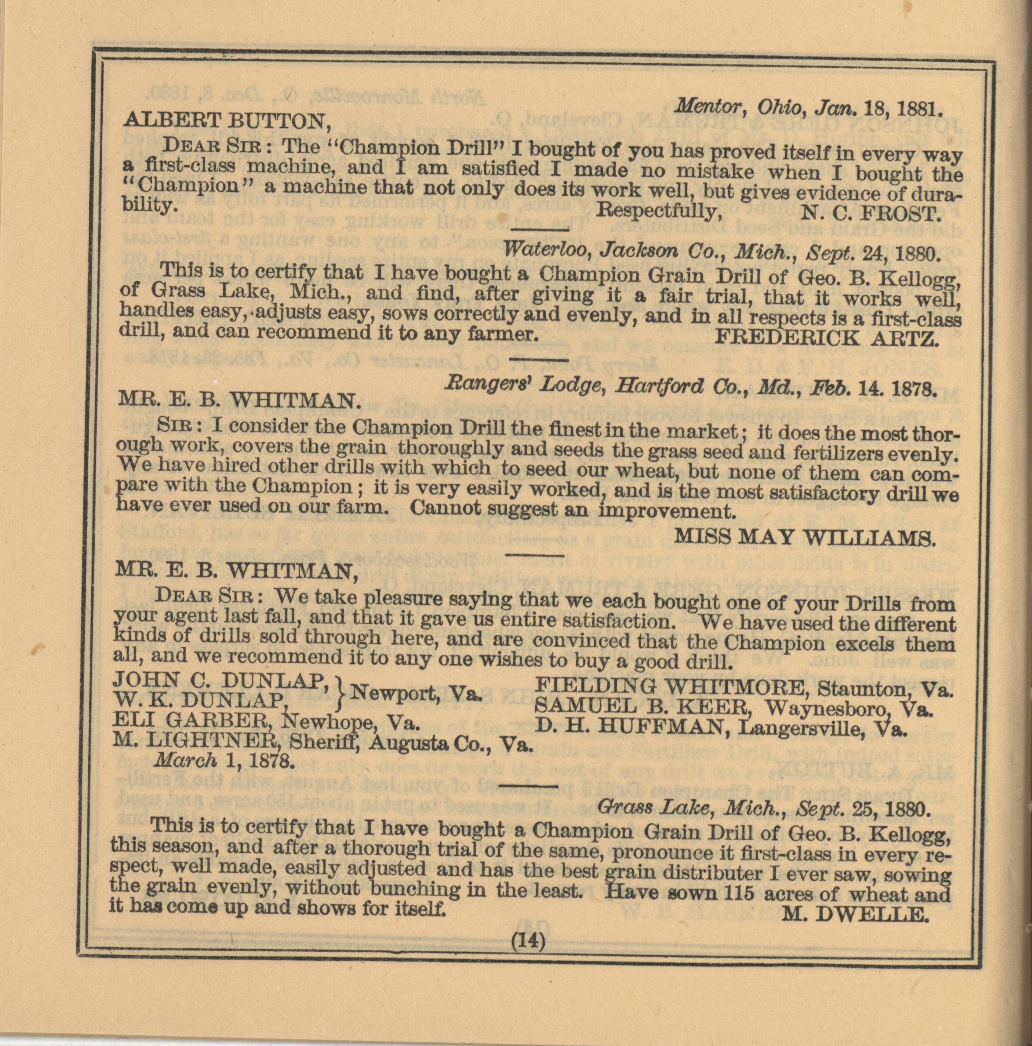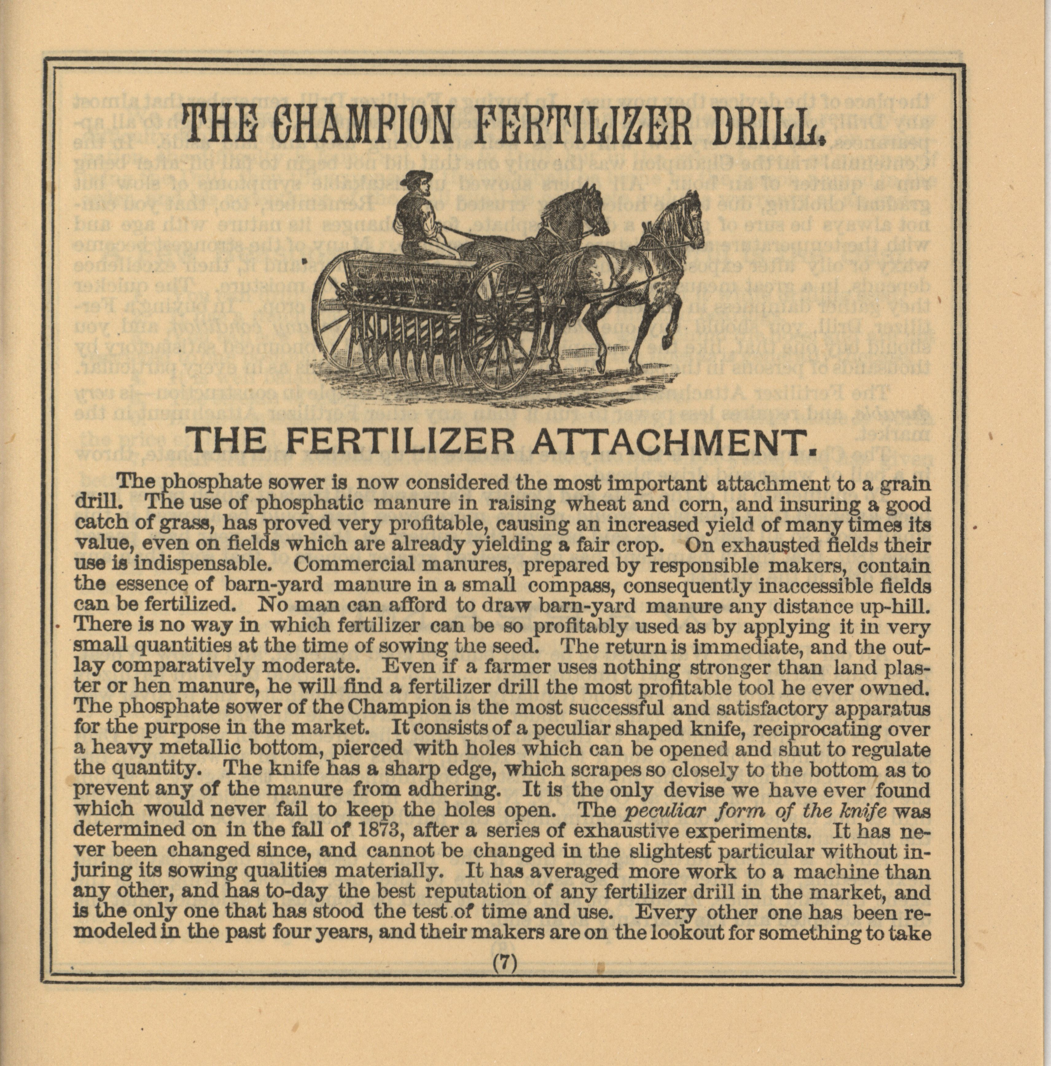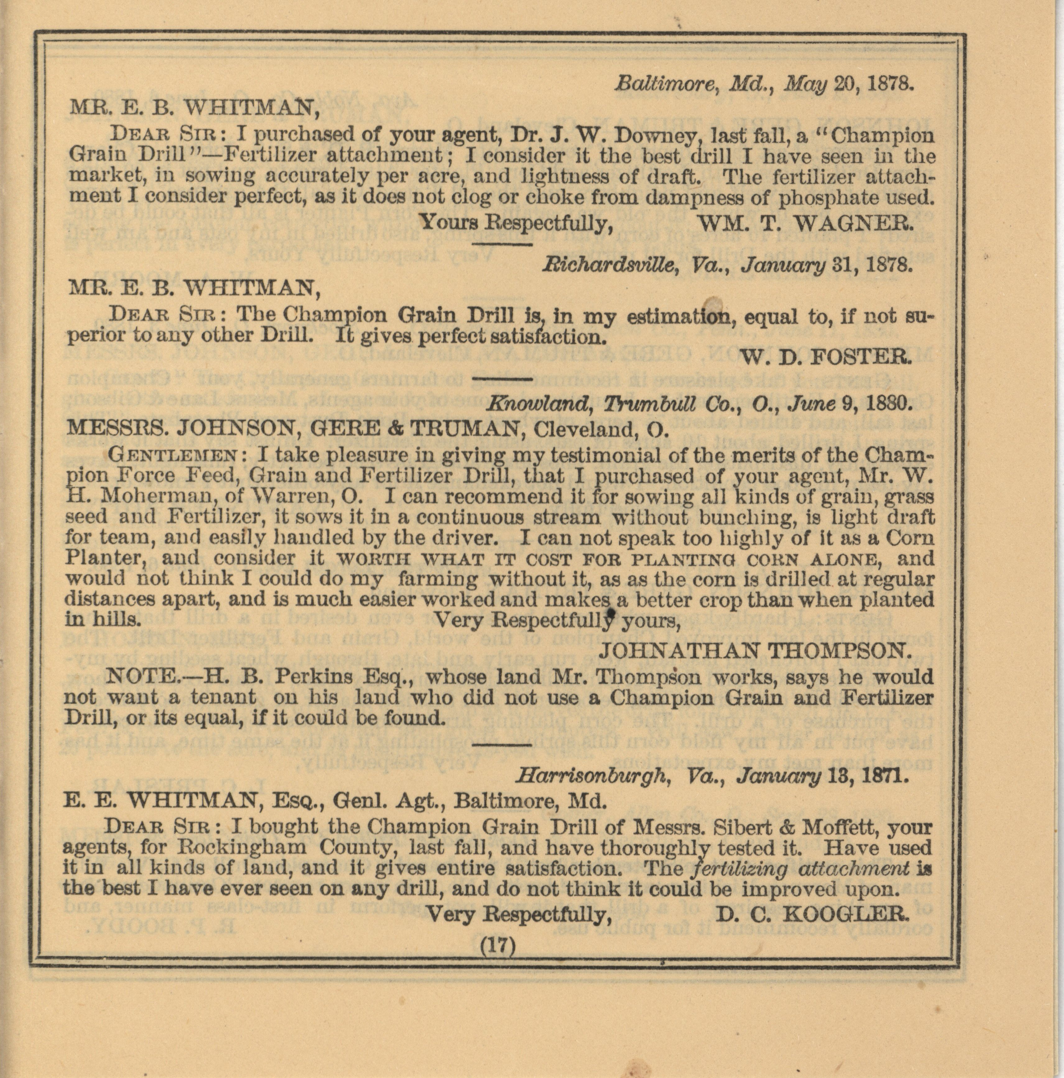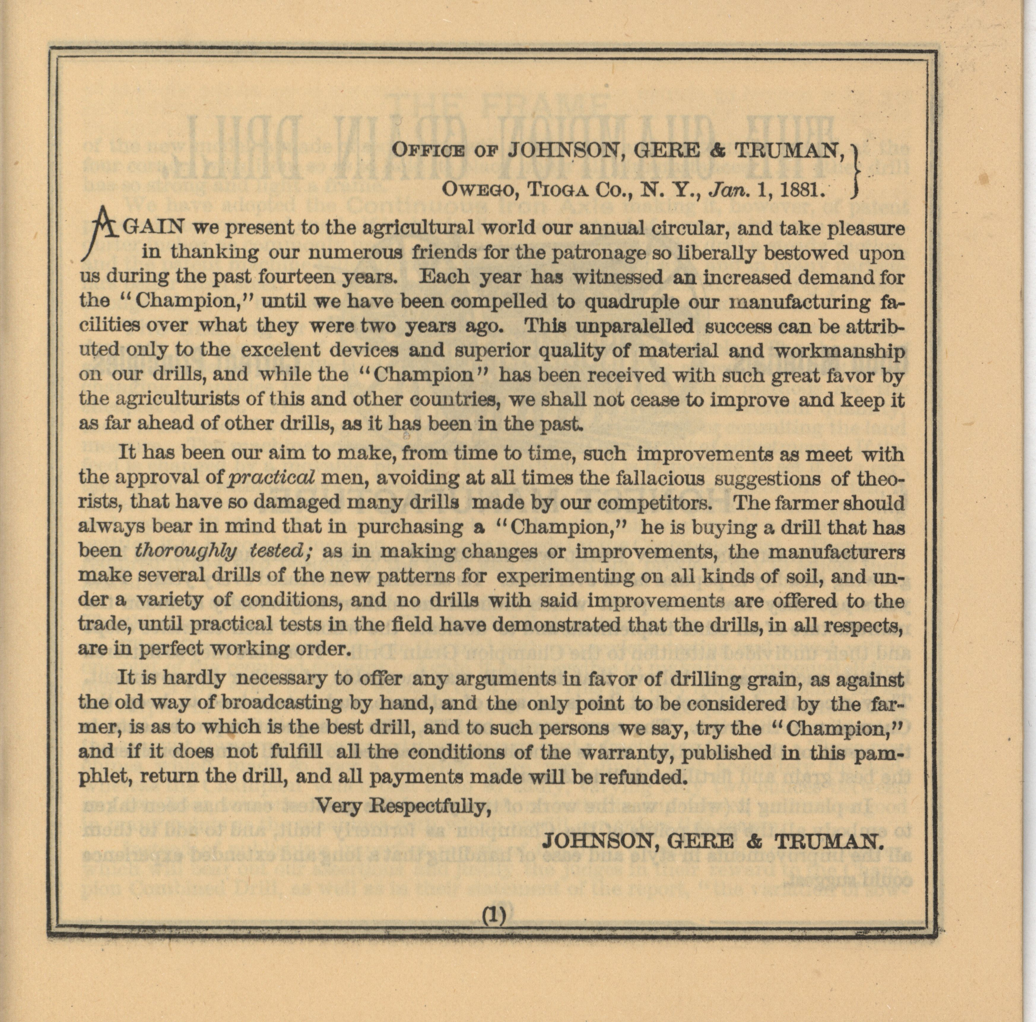 - "Johnson, Gere and Truman Champion Grain Drill catalog", Agricultural Machinery Literature Collection, Iowa State University Library Digital Collections