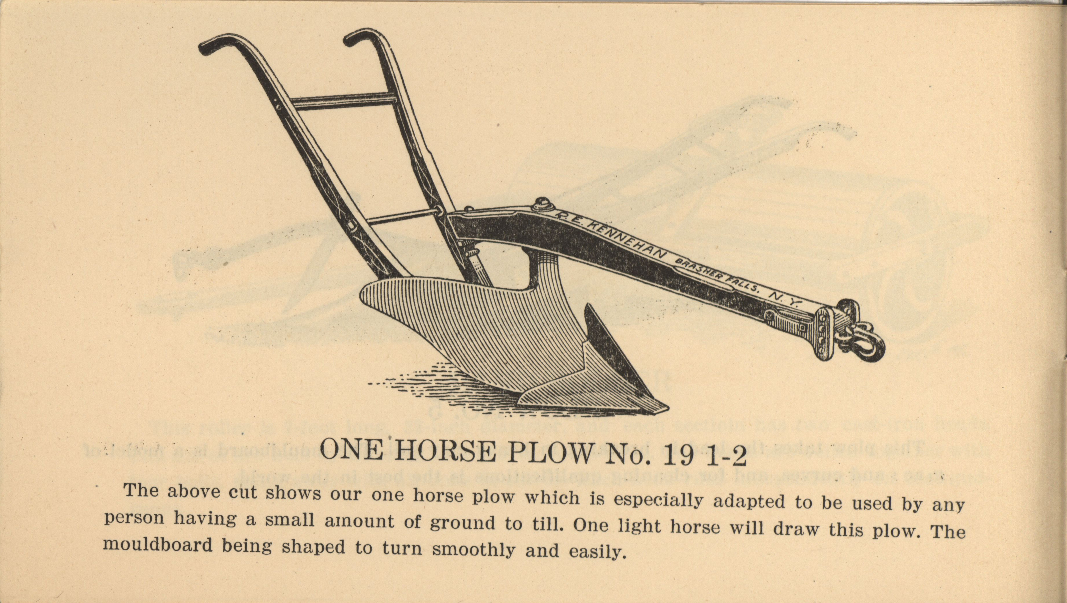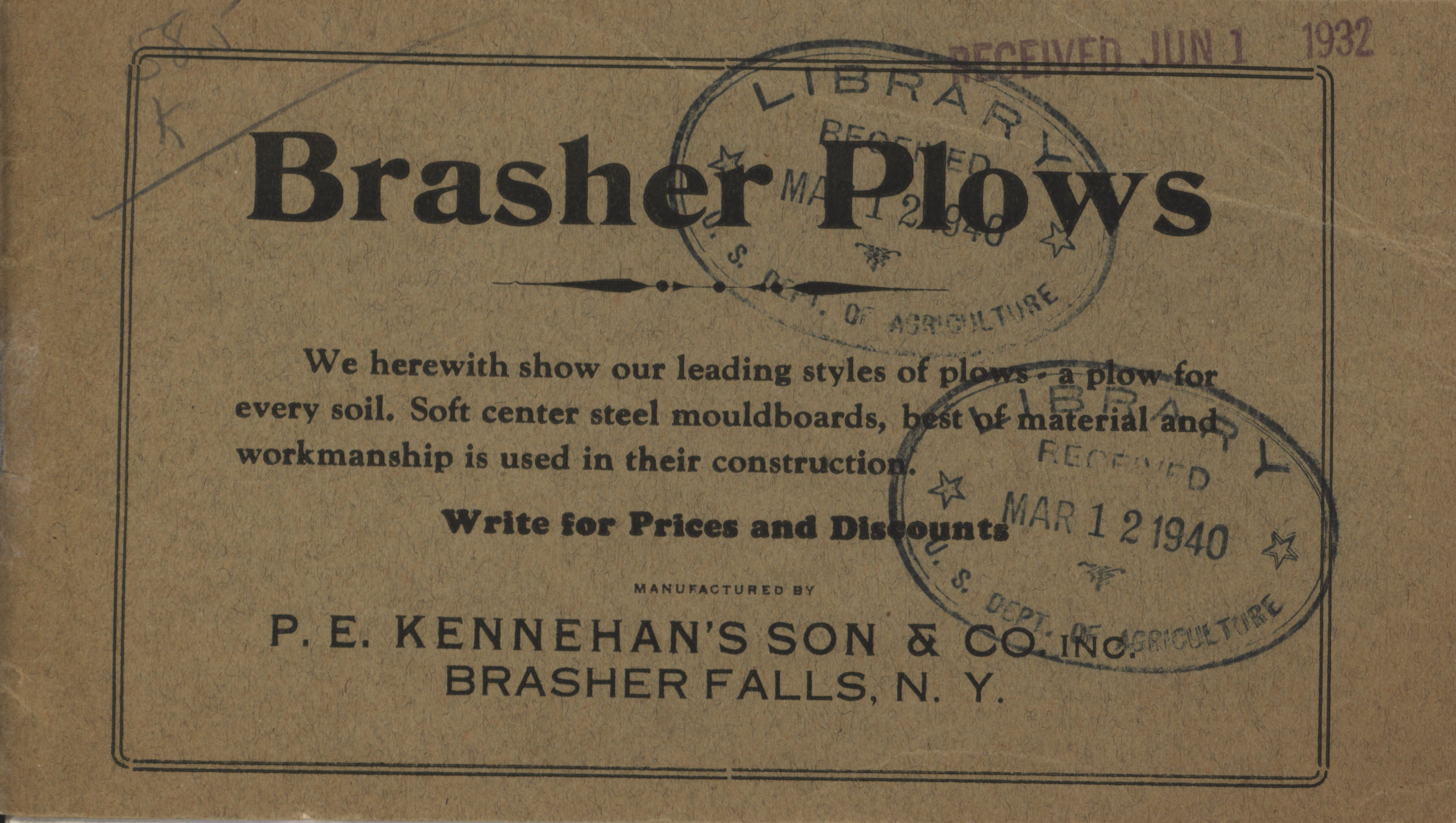 - Illustrated catalog describing the Brasher Plows product line offered by P. E. Kennehan's Son and Company in 1932.