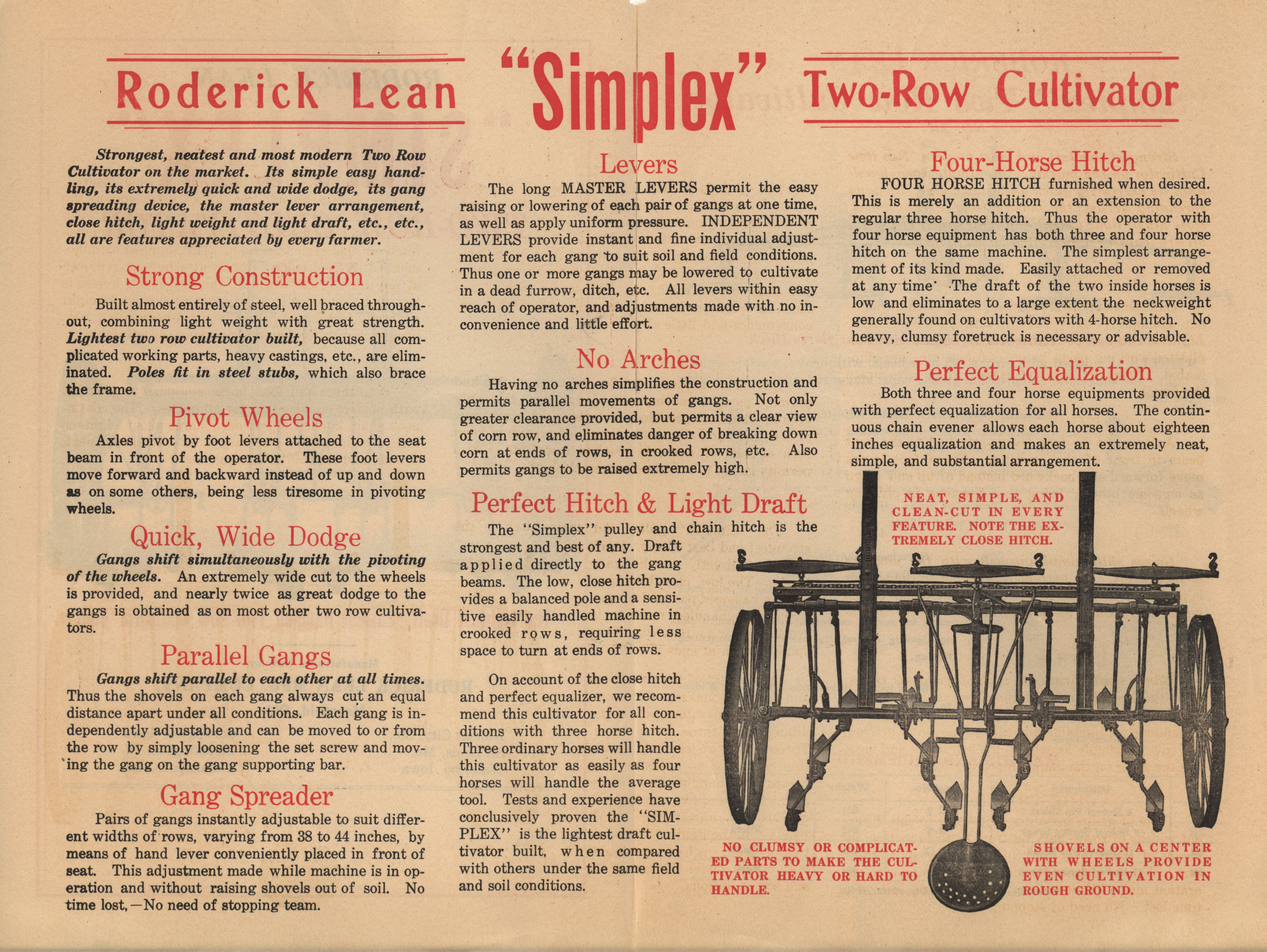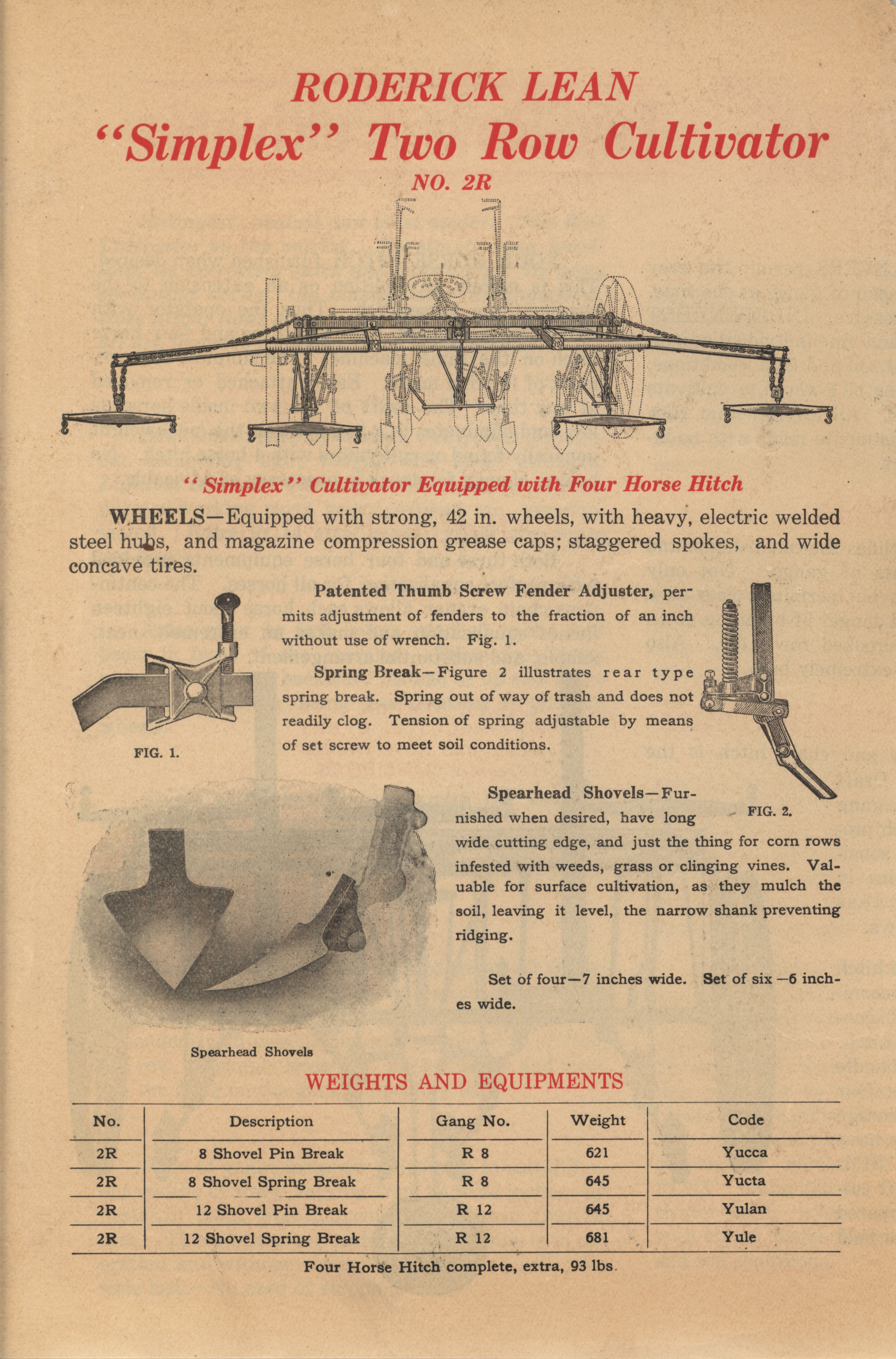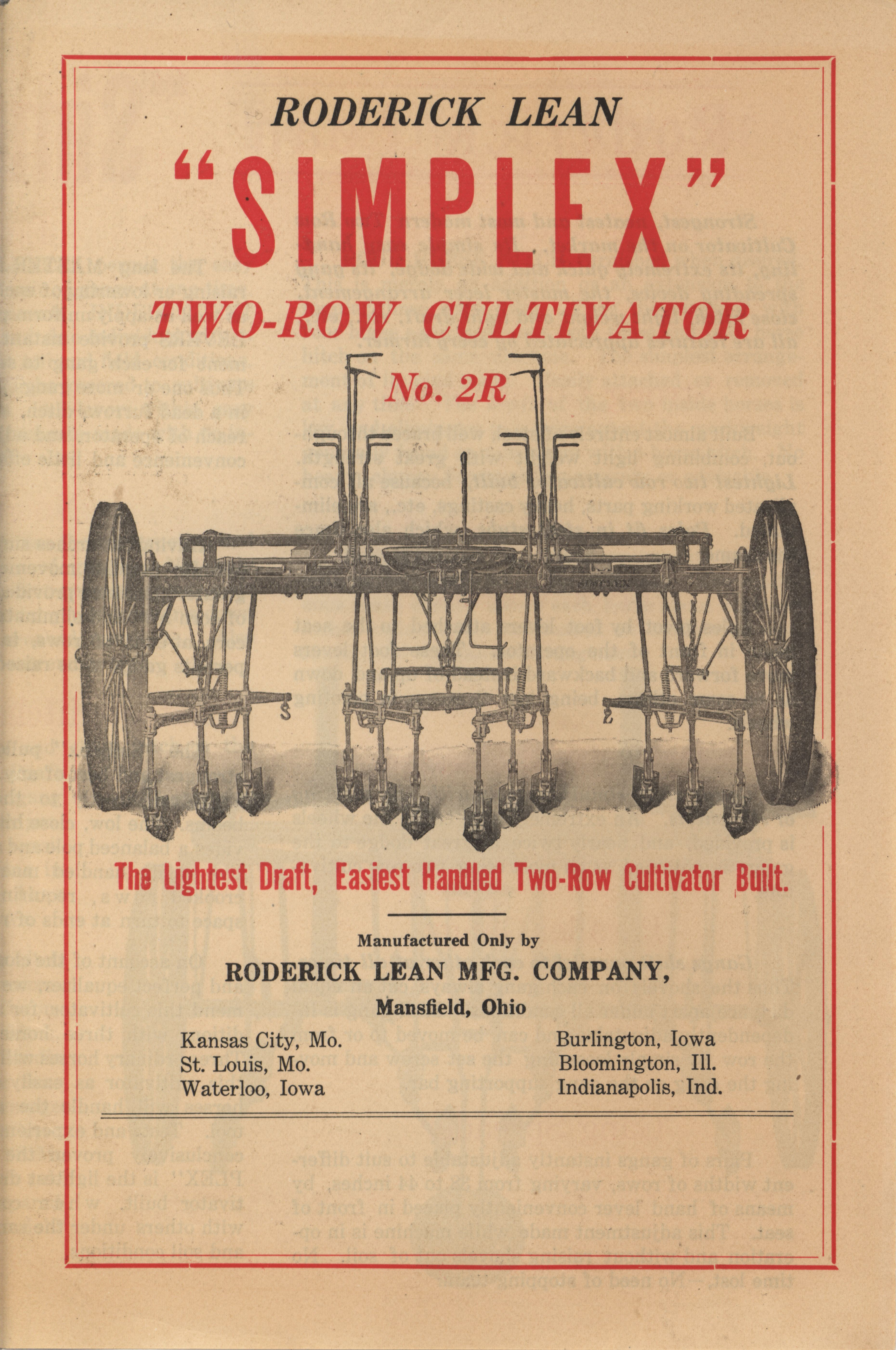 - "Roderick Lean Manufacturing Company two-row cultivator advertisement", Agricultural Machinery Literature Collection, Iowa State University Library Digital Collections