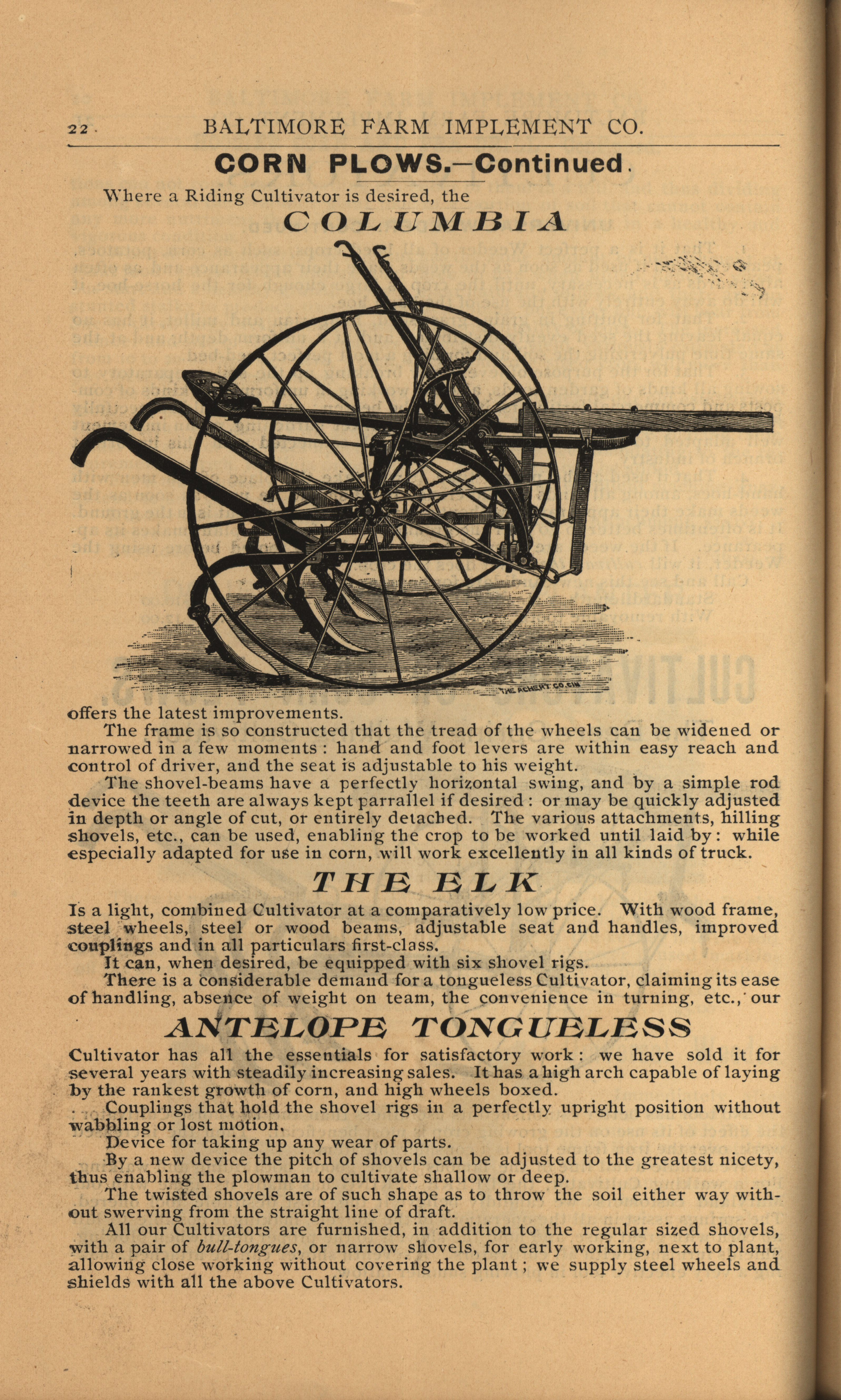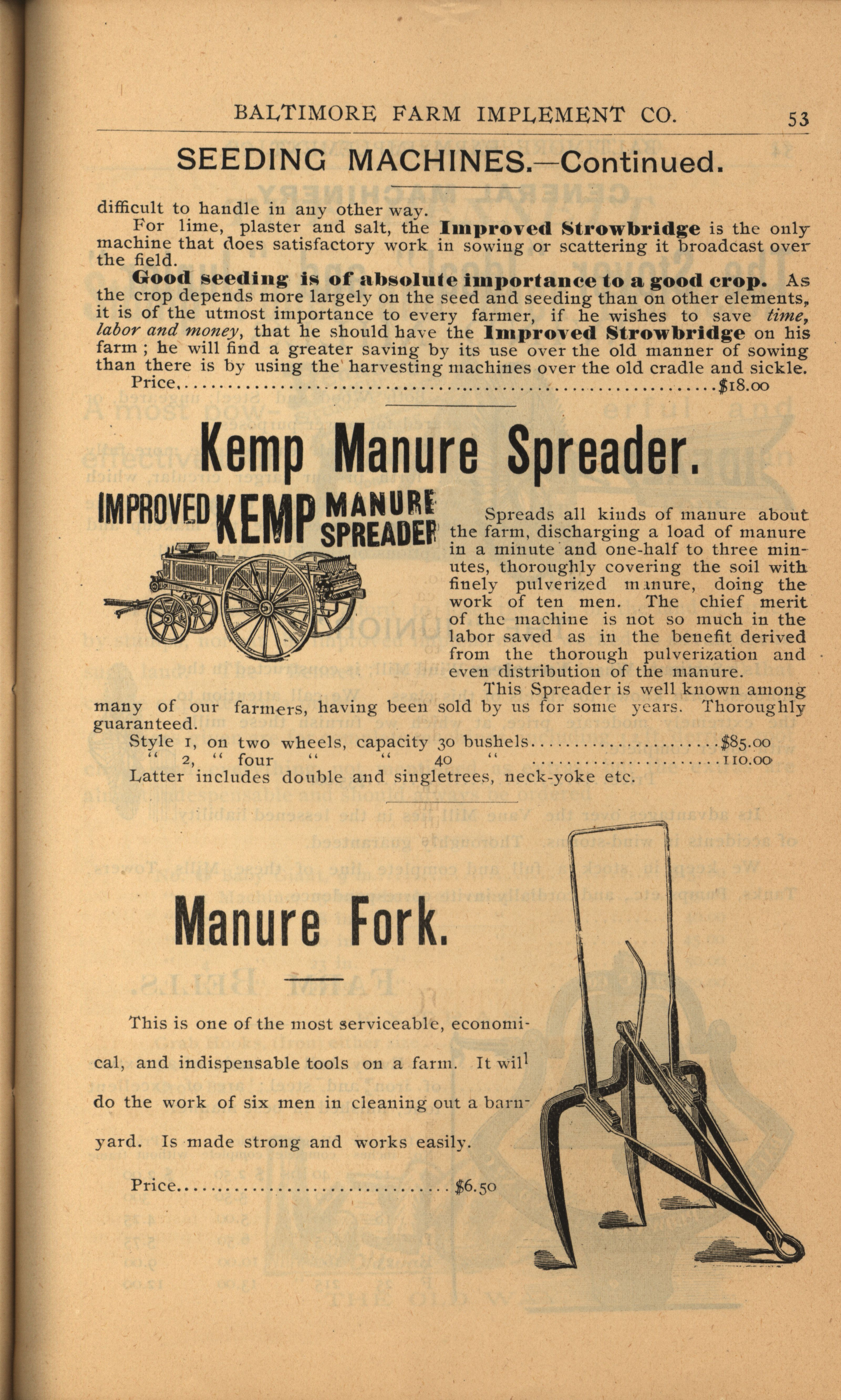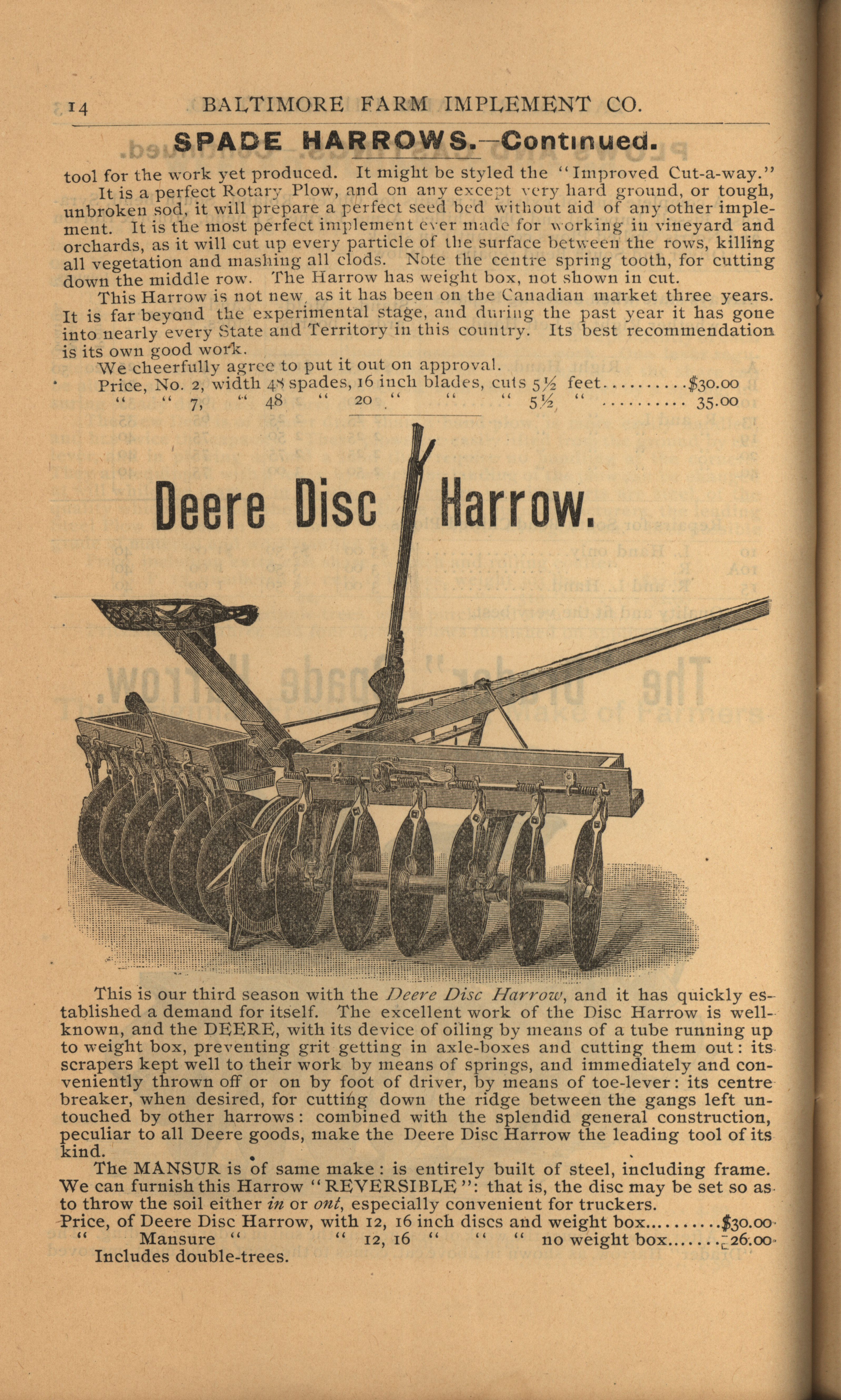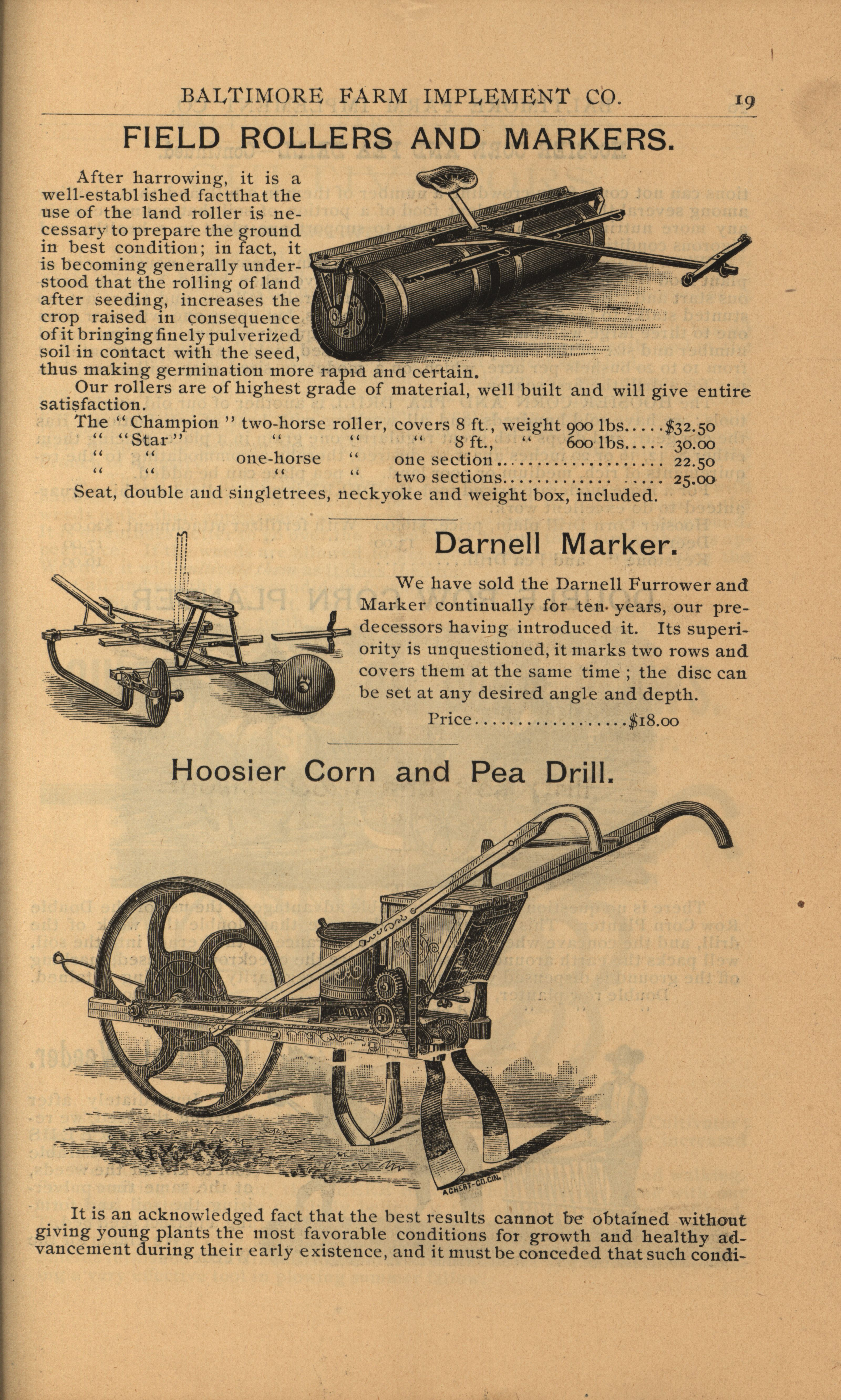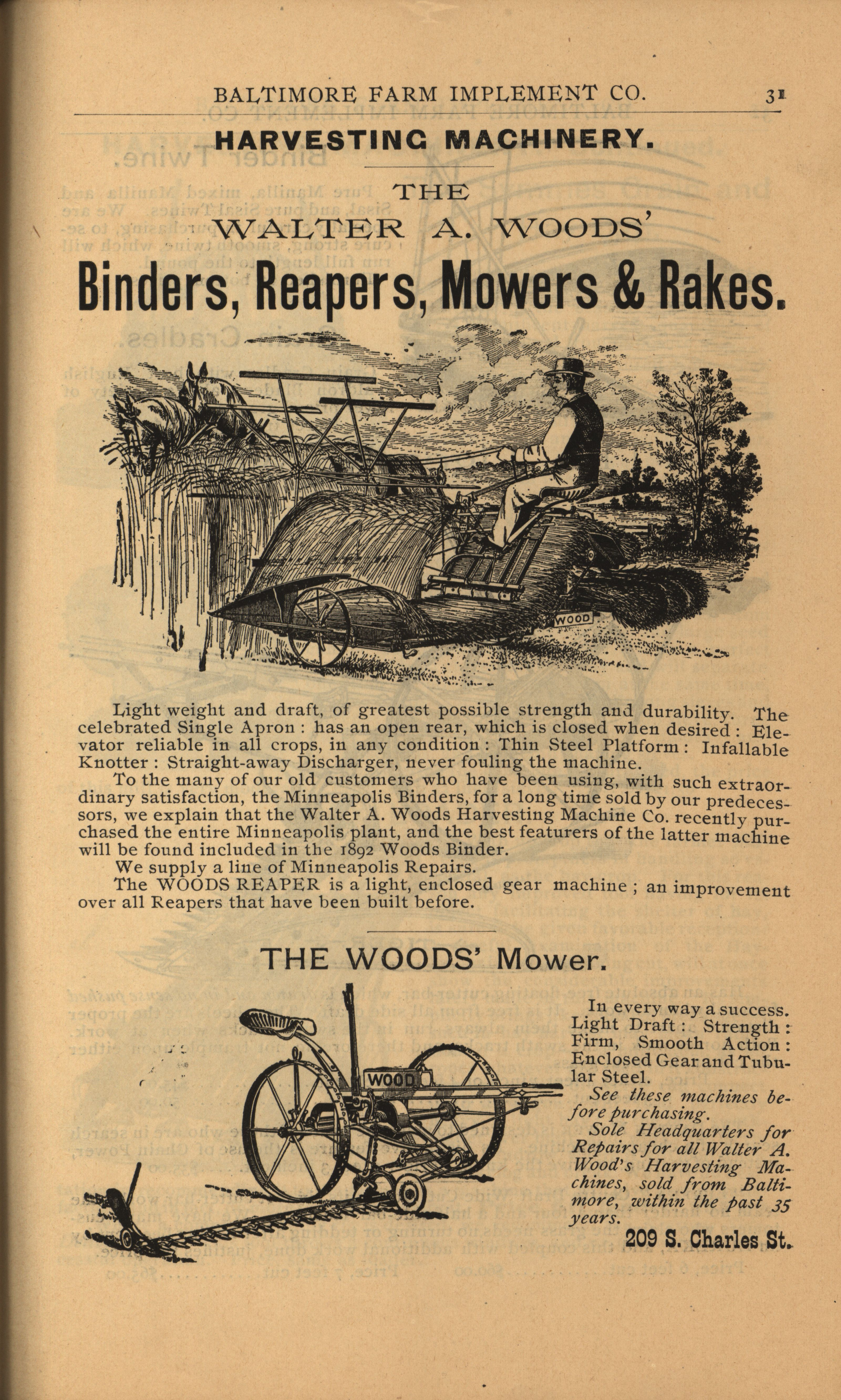 - Illustrated catalog describing the agricultural implements and related products offered by the Baltimore Farm Implement Company in 1892.