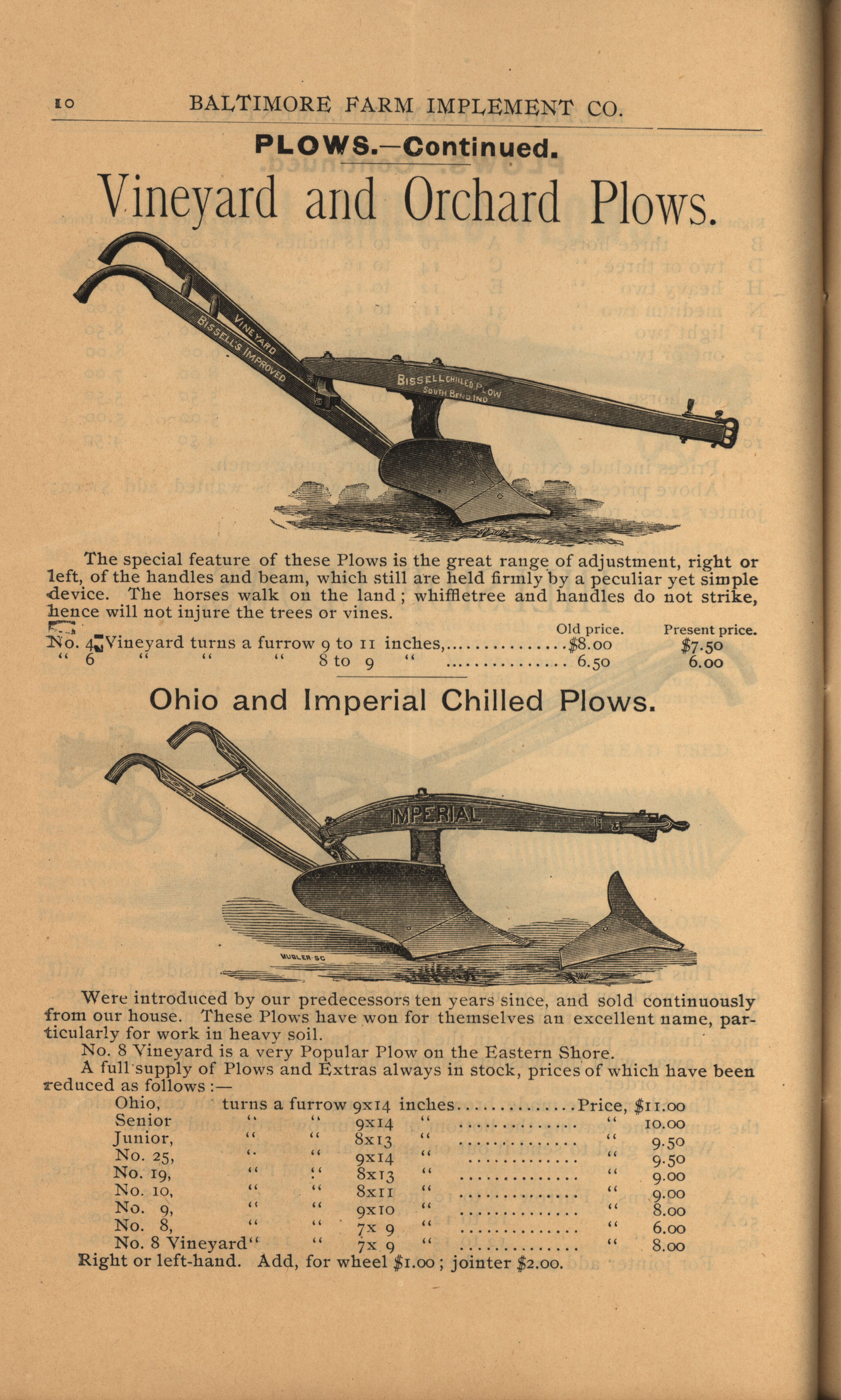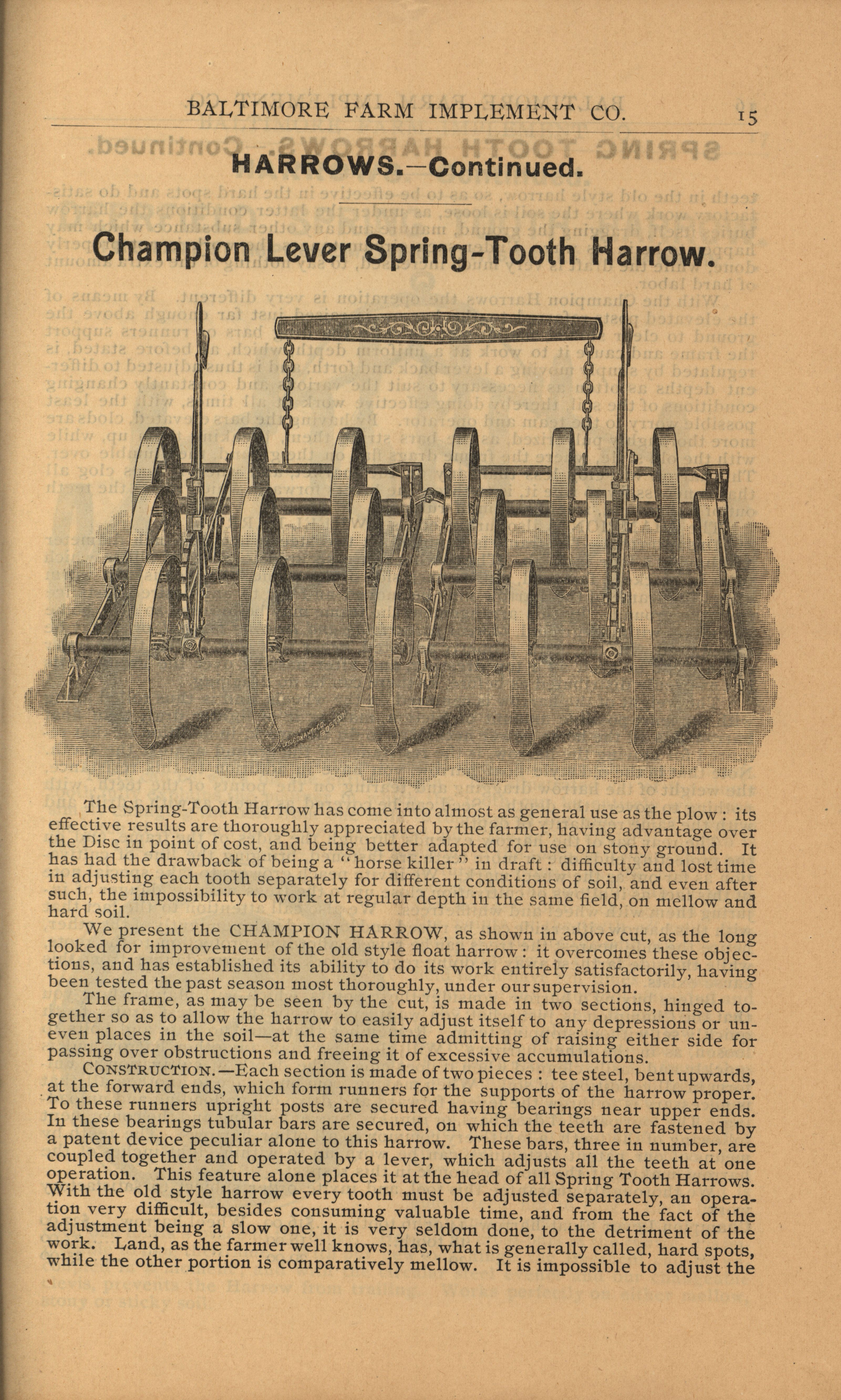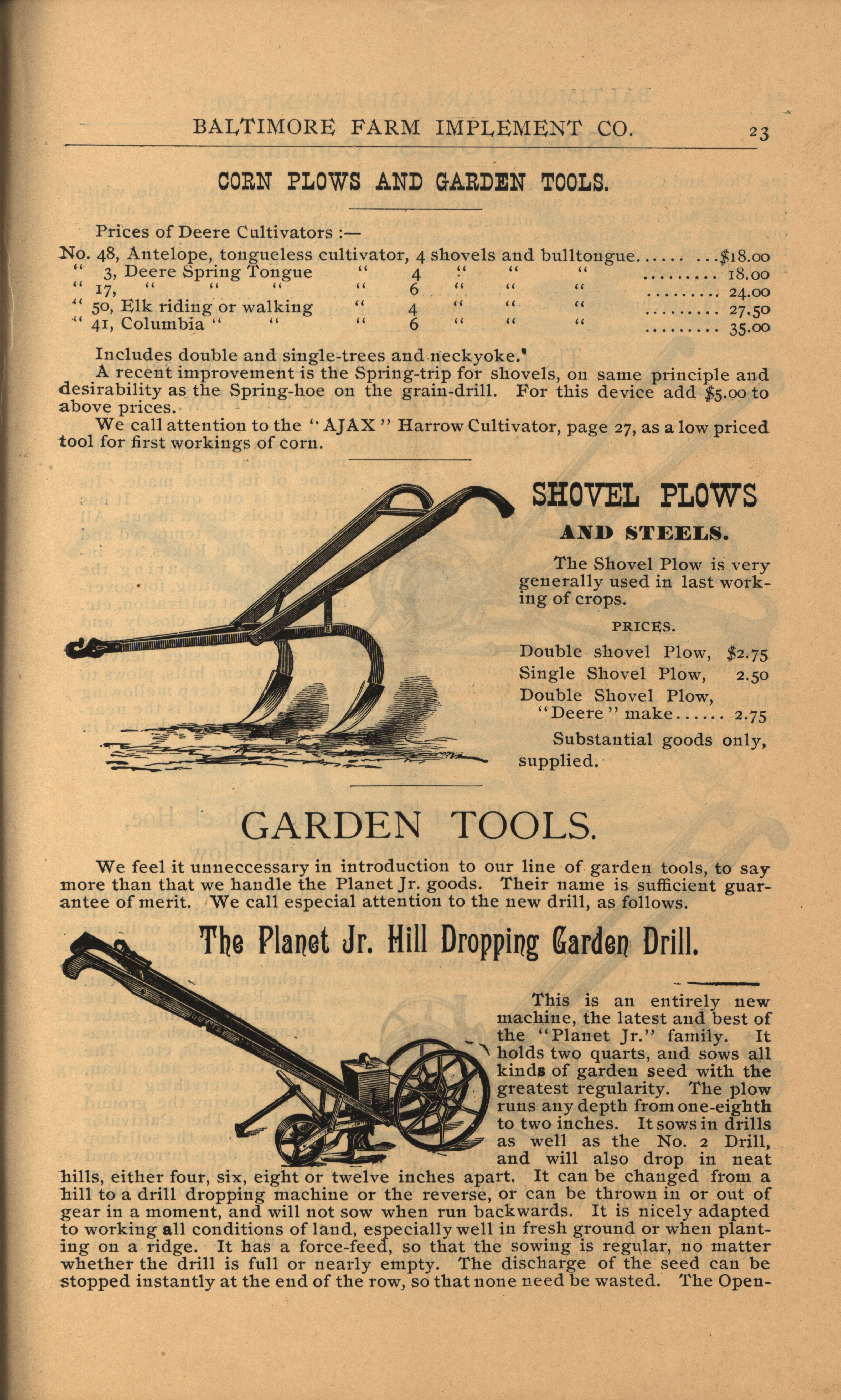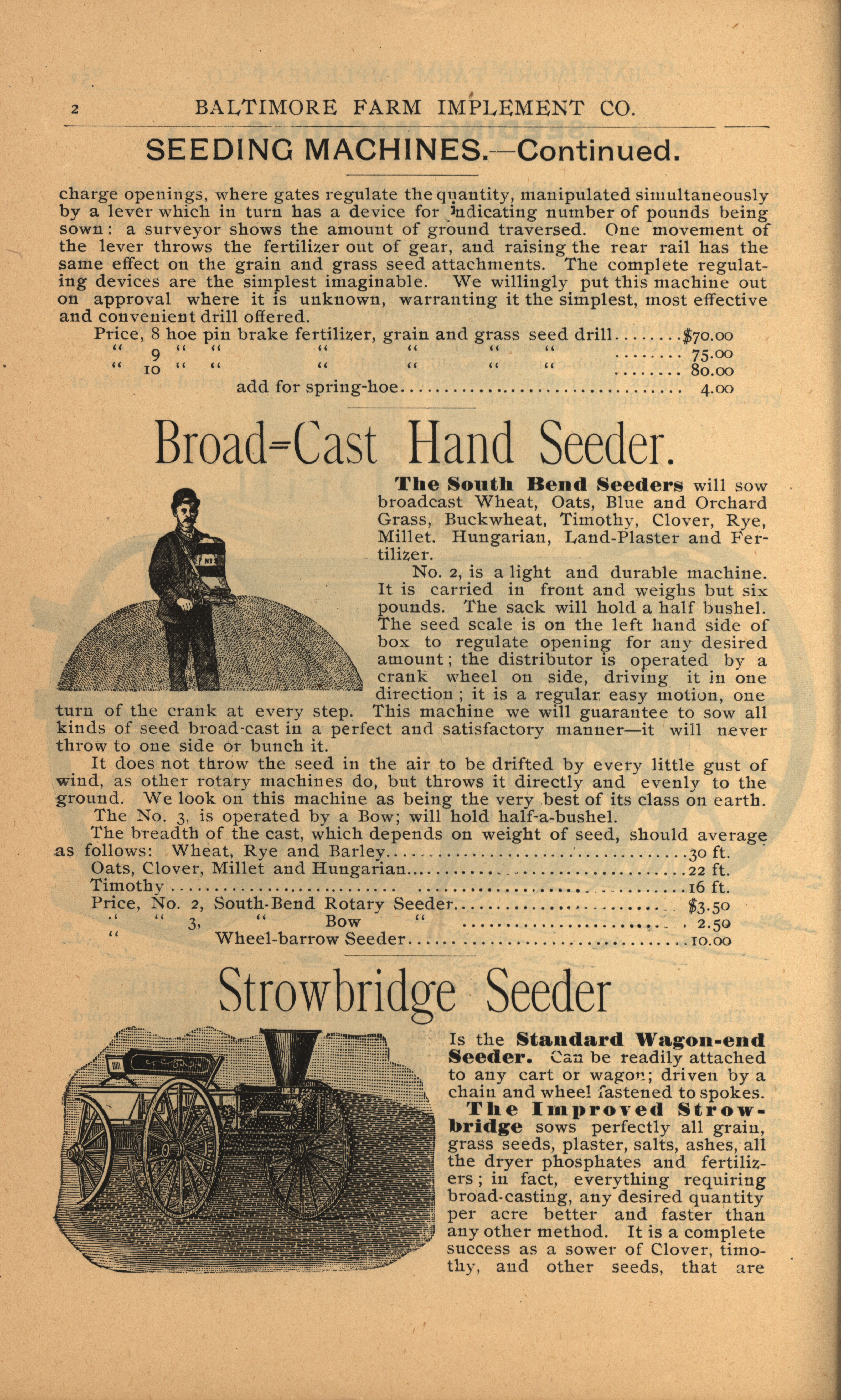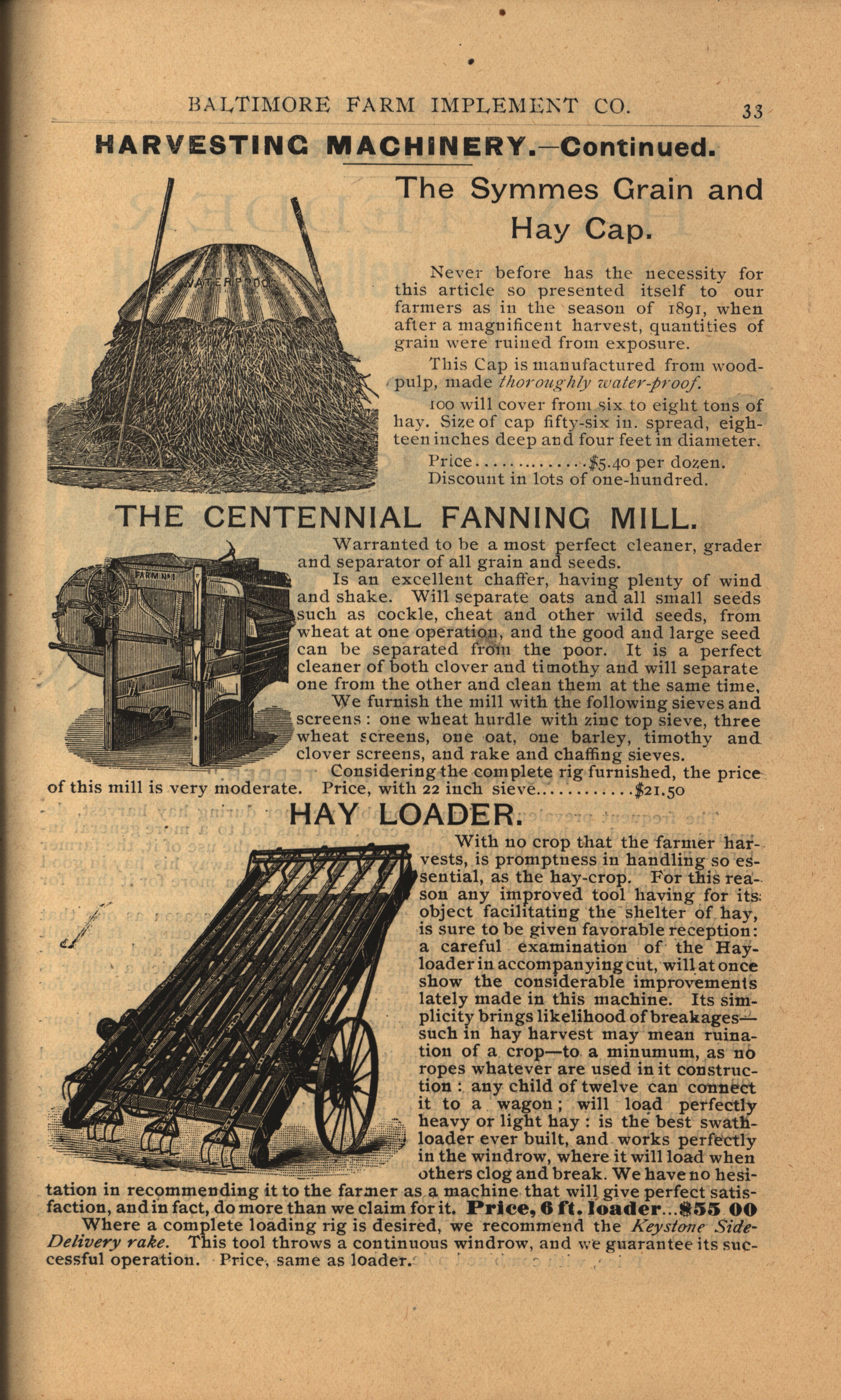 - Illustrated catalog describing the agricultural implements and related products offered by the Baltimore Farm Implement Company in 1892.
