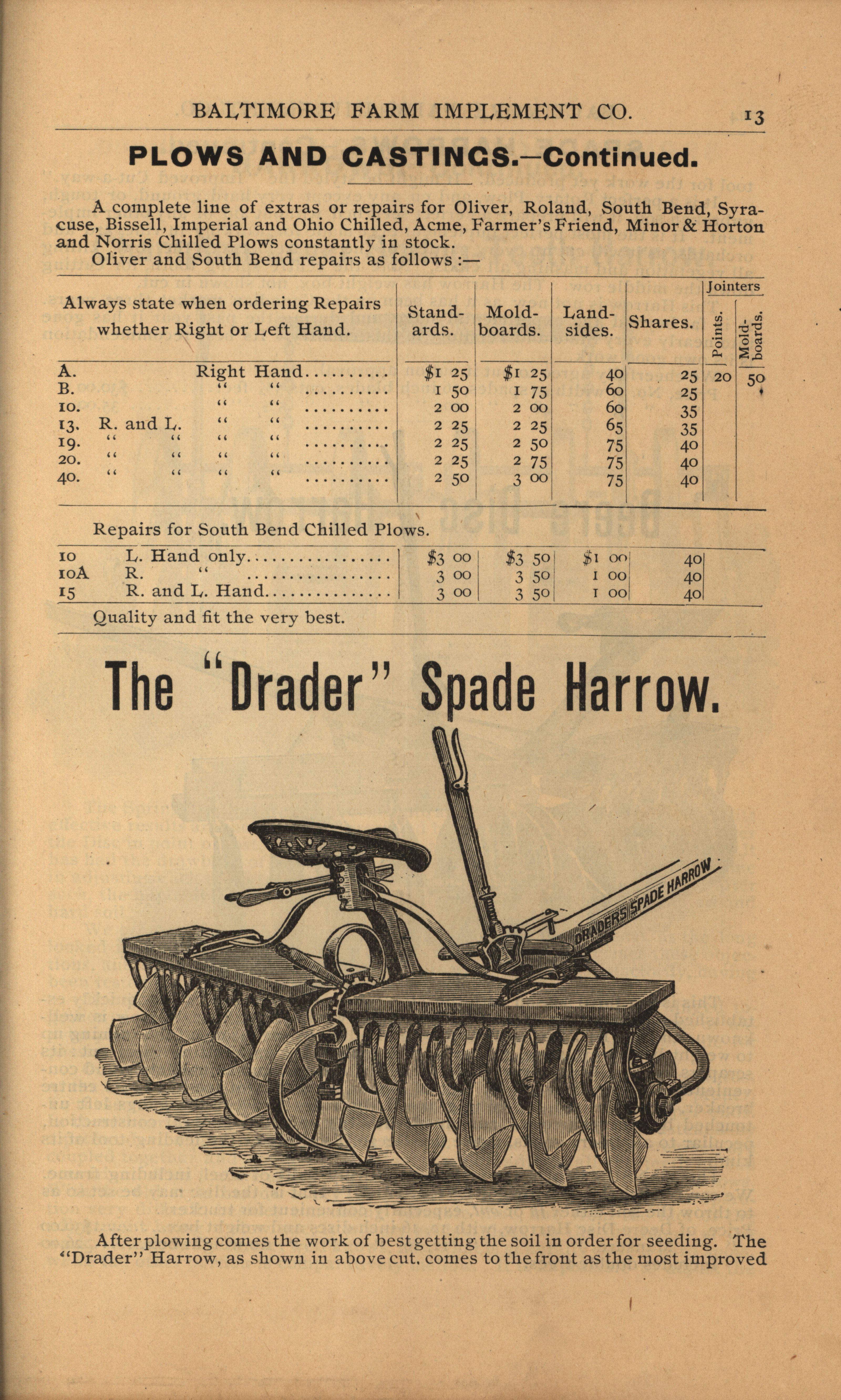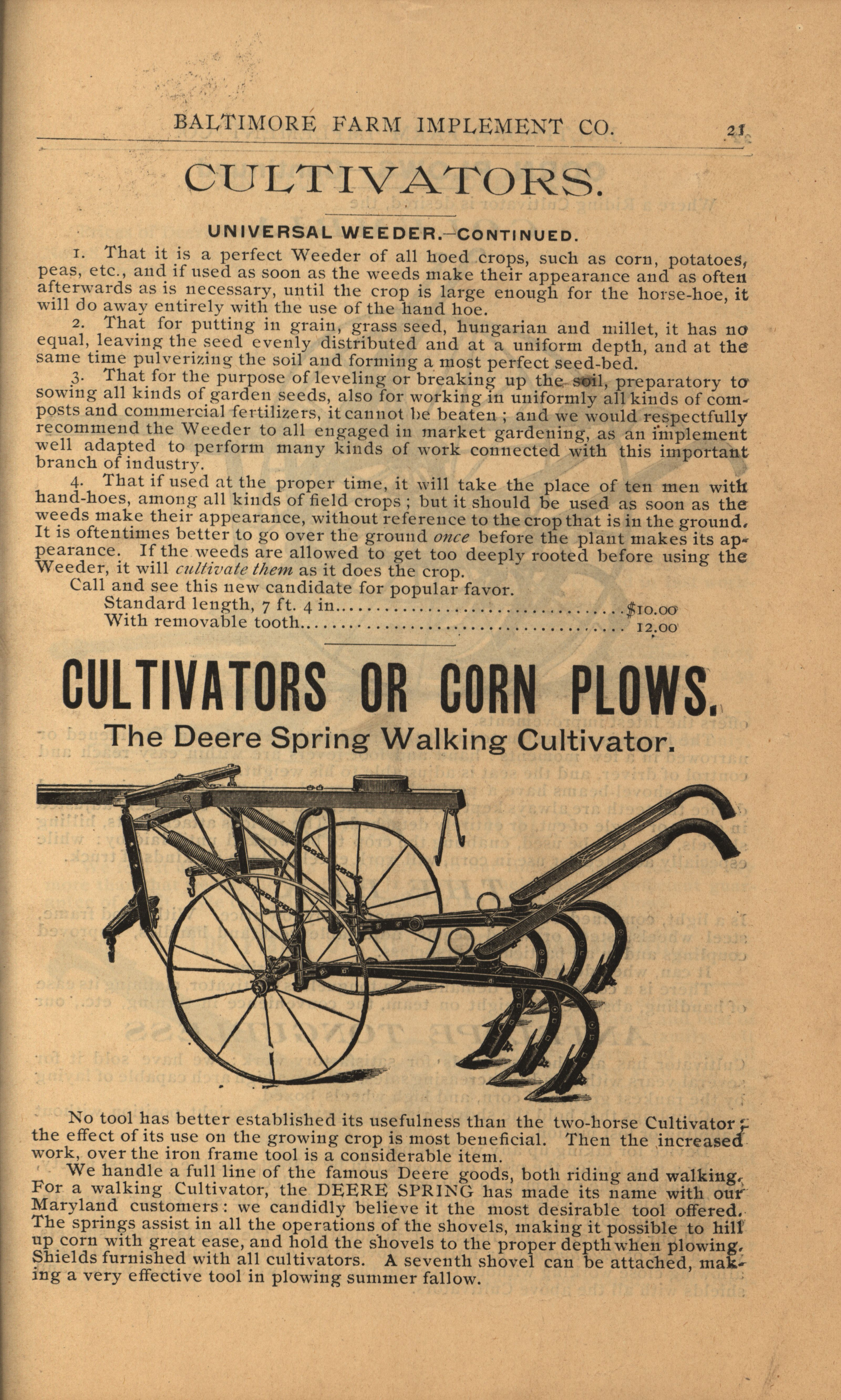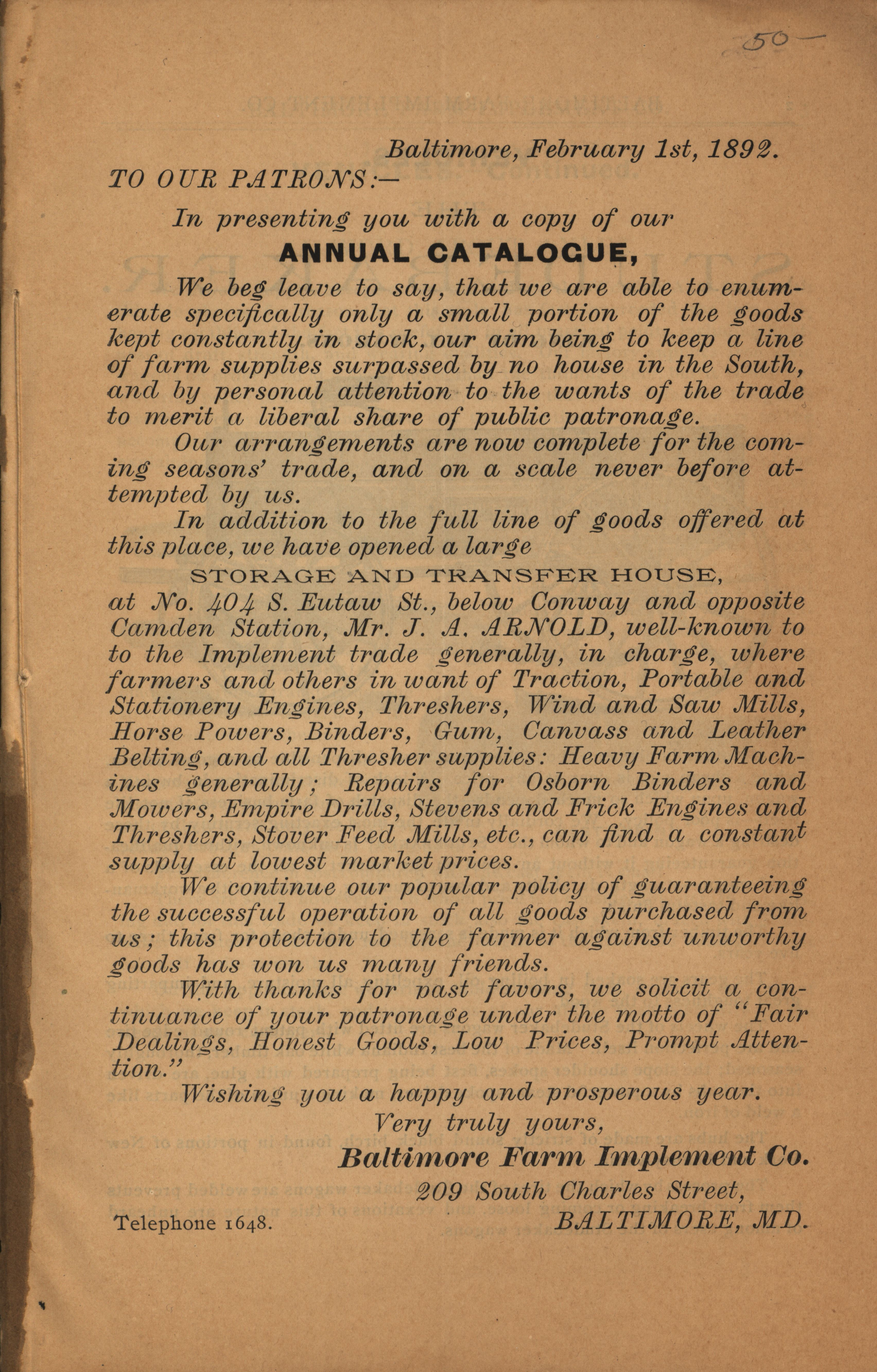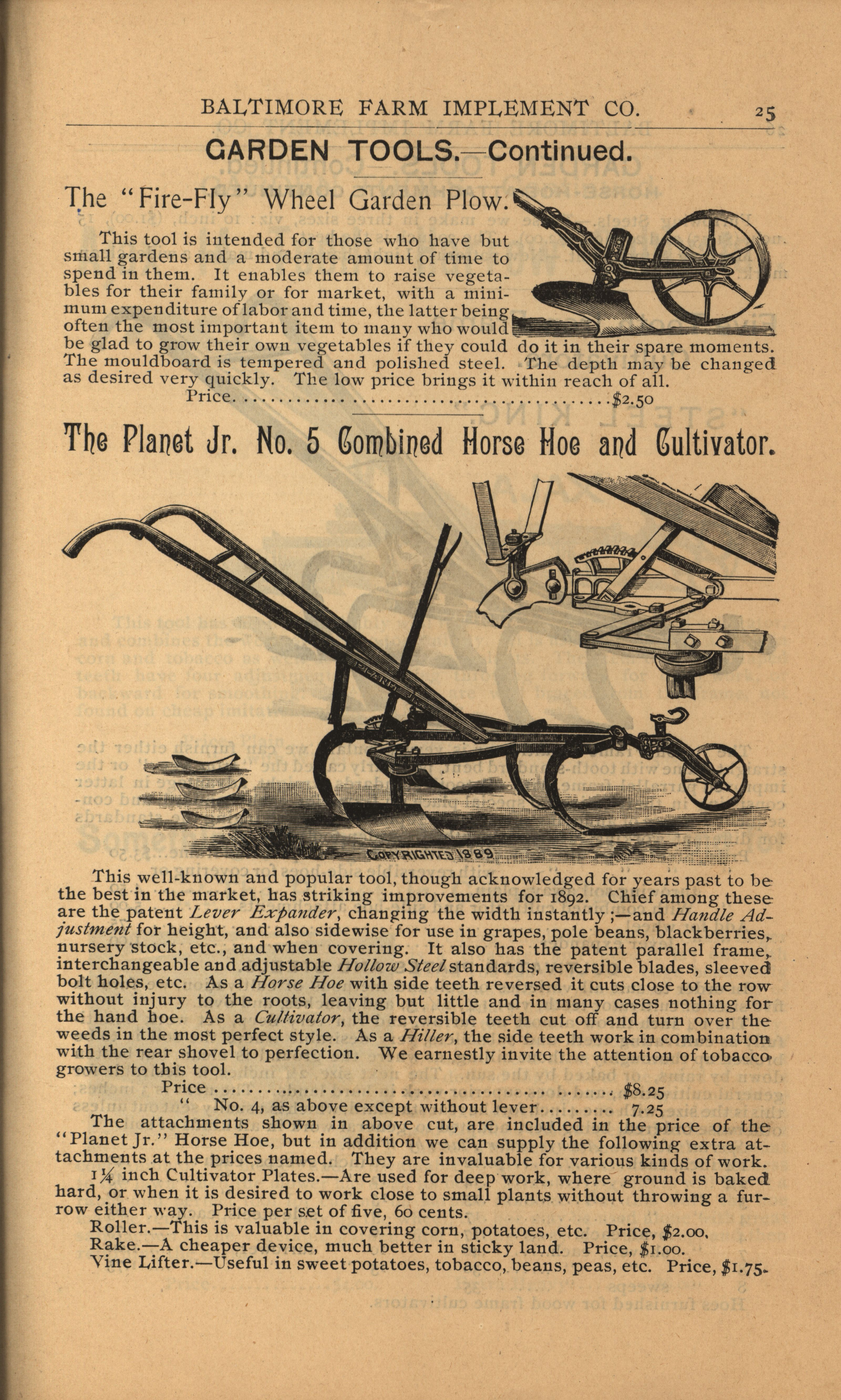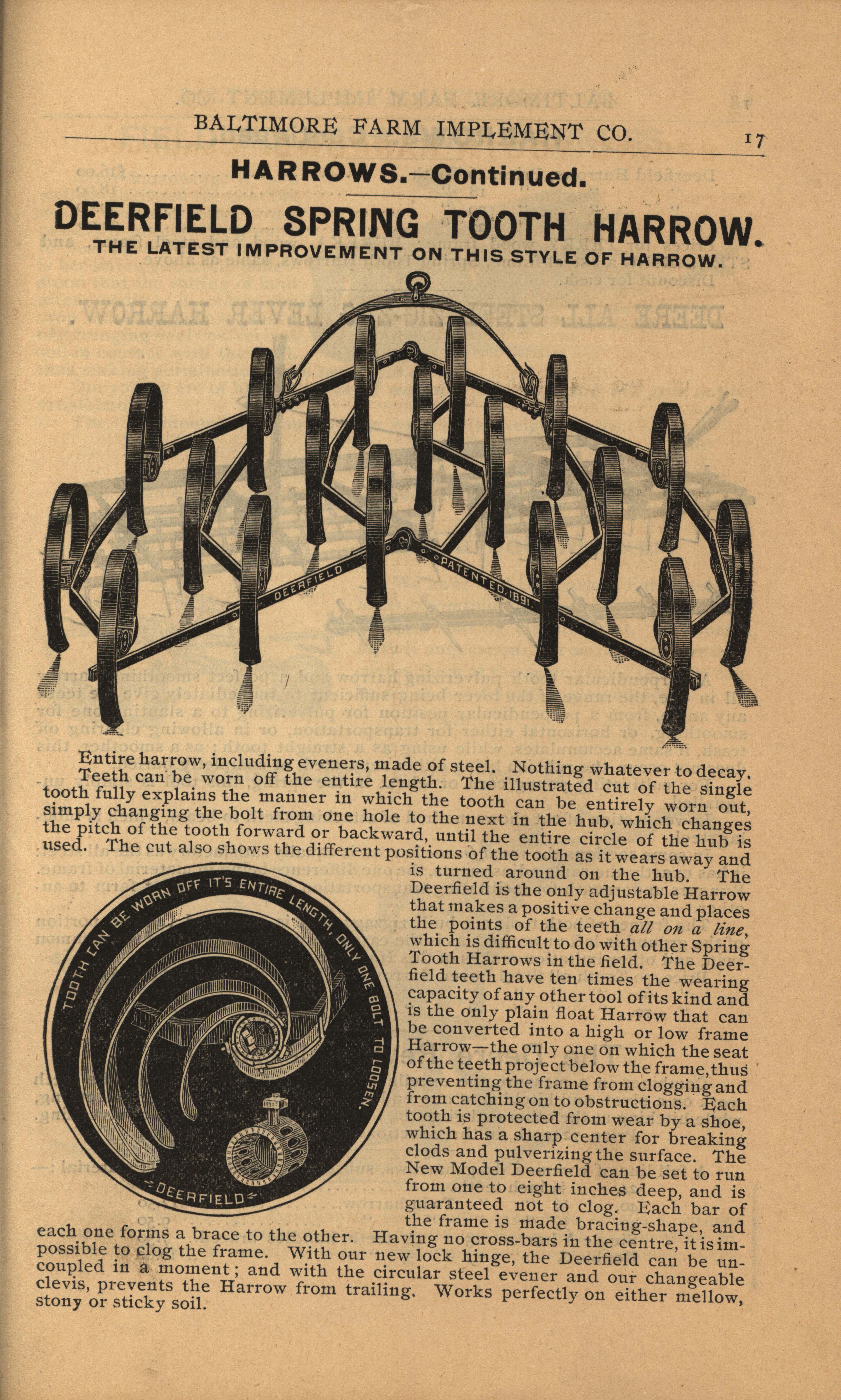 - Illustrated catalog describing the agricultural implements and related products offered by the Baltimore Farm Implement Company in 1892.