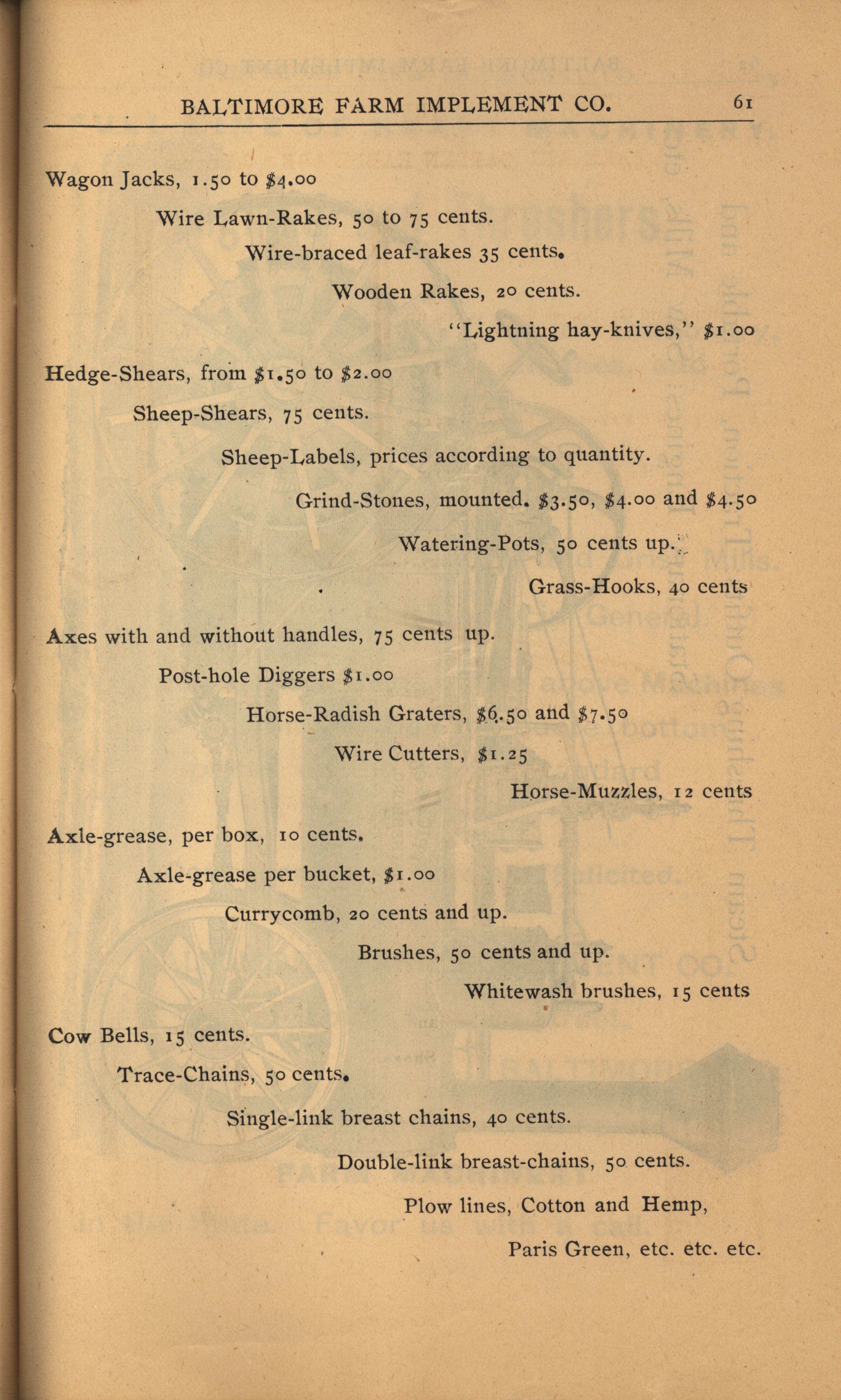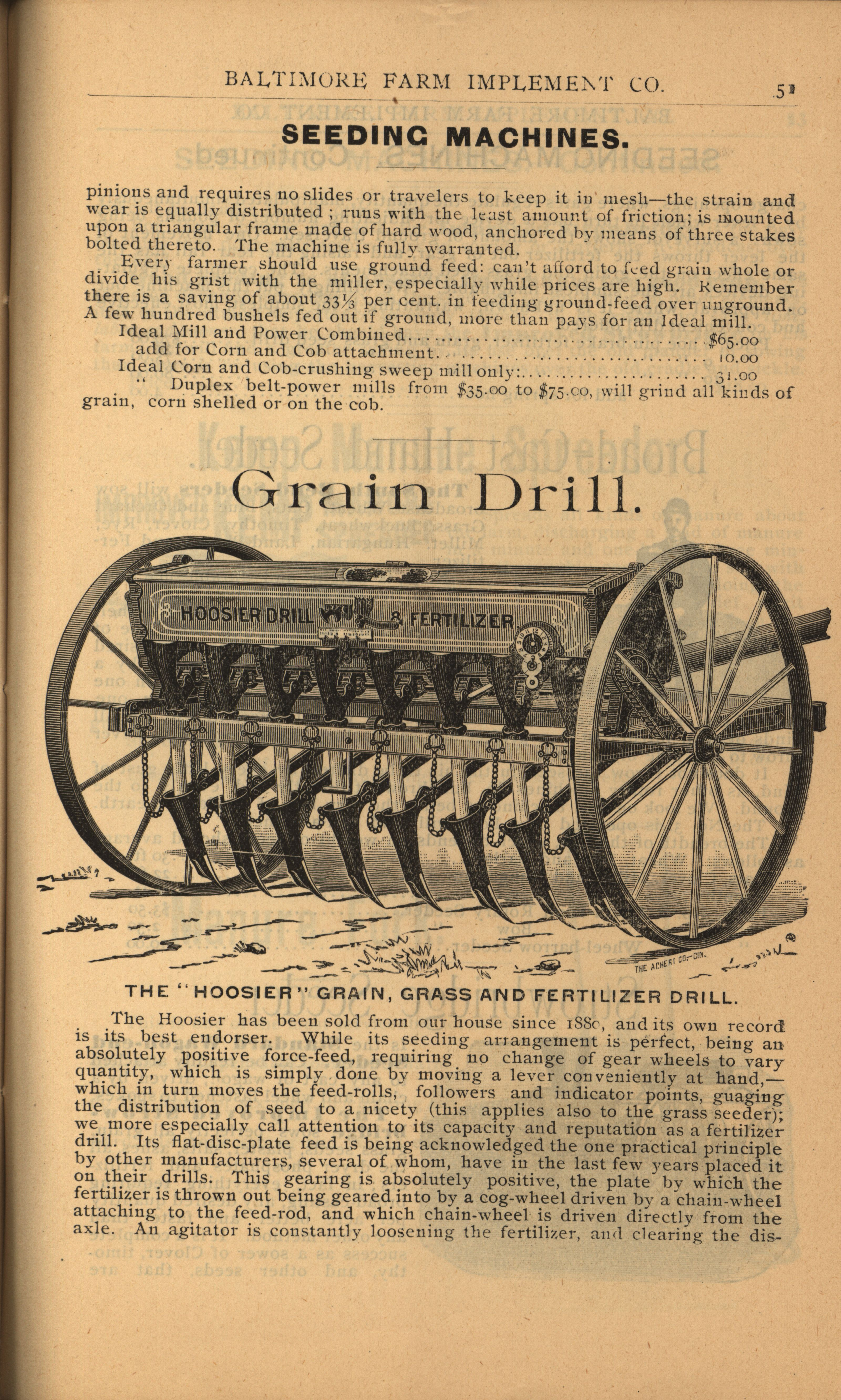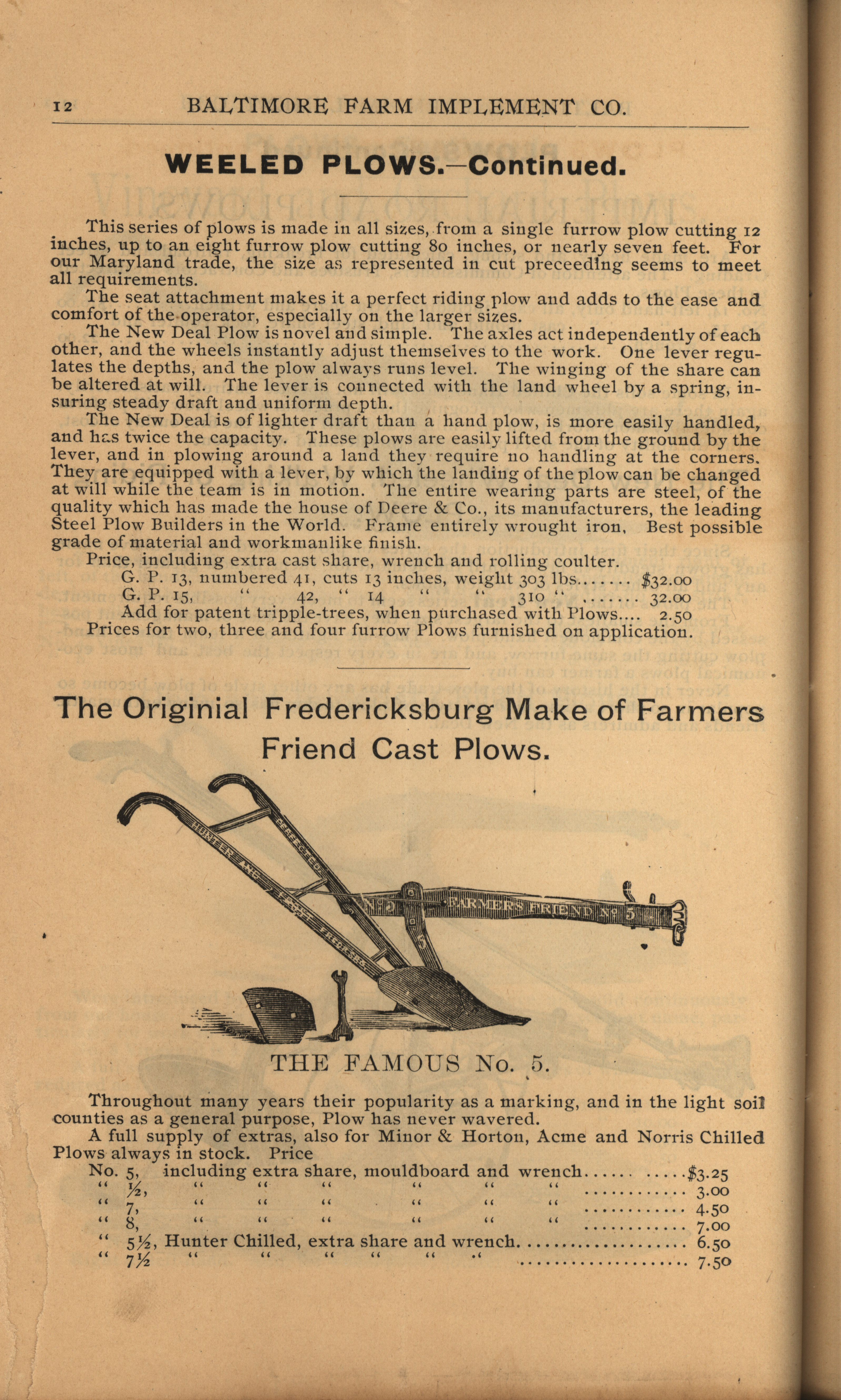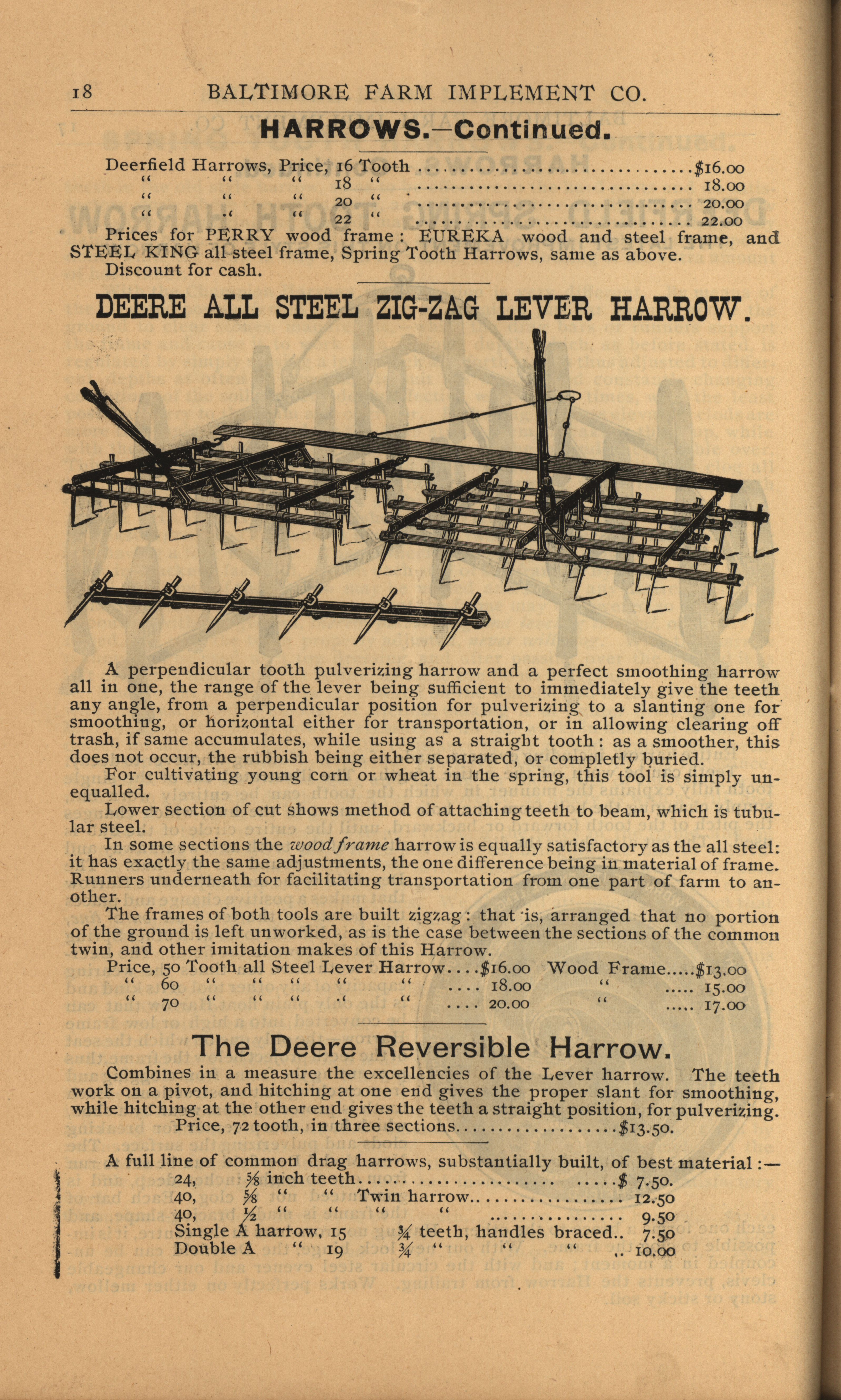 - Illustrated catalog describing the agricultural implements and related products offered by the Baltimore Farm Implement Company in 1892.
