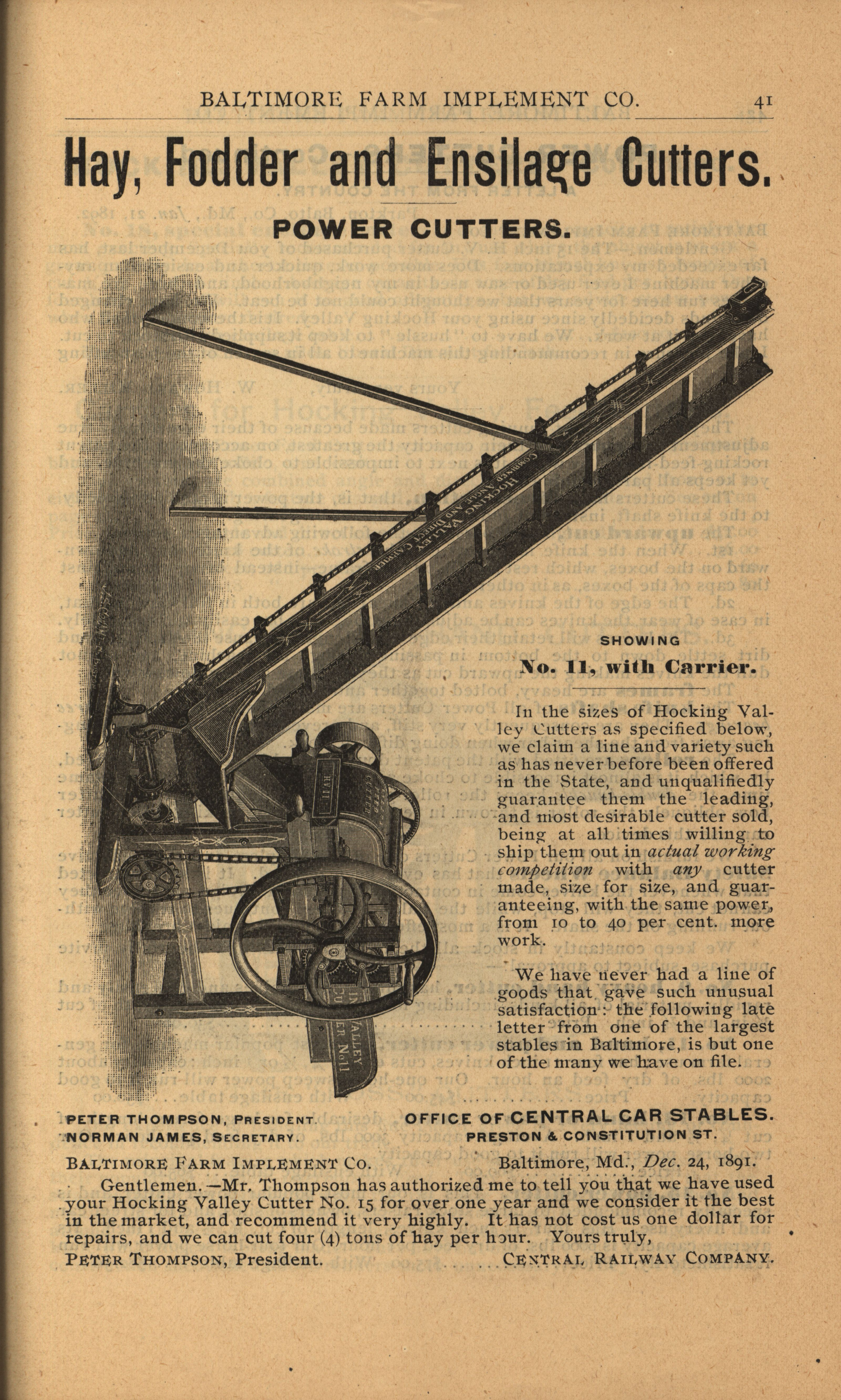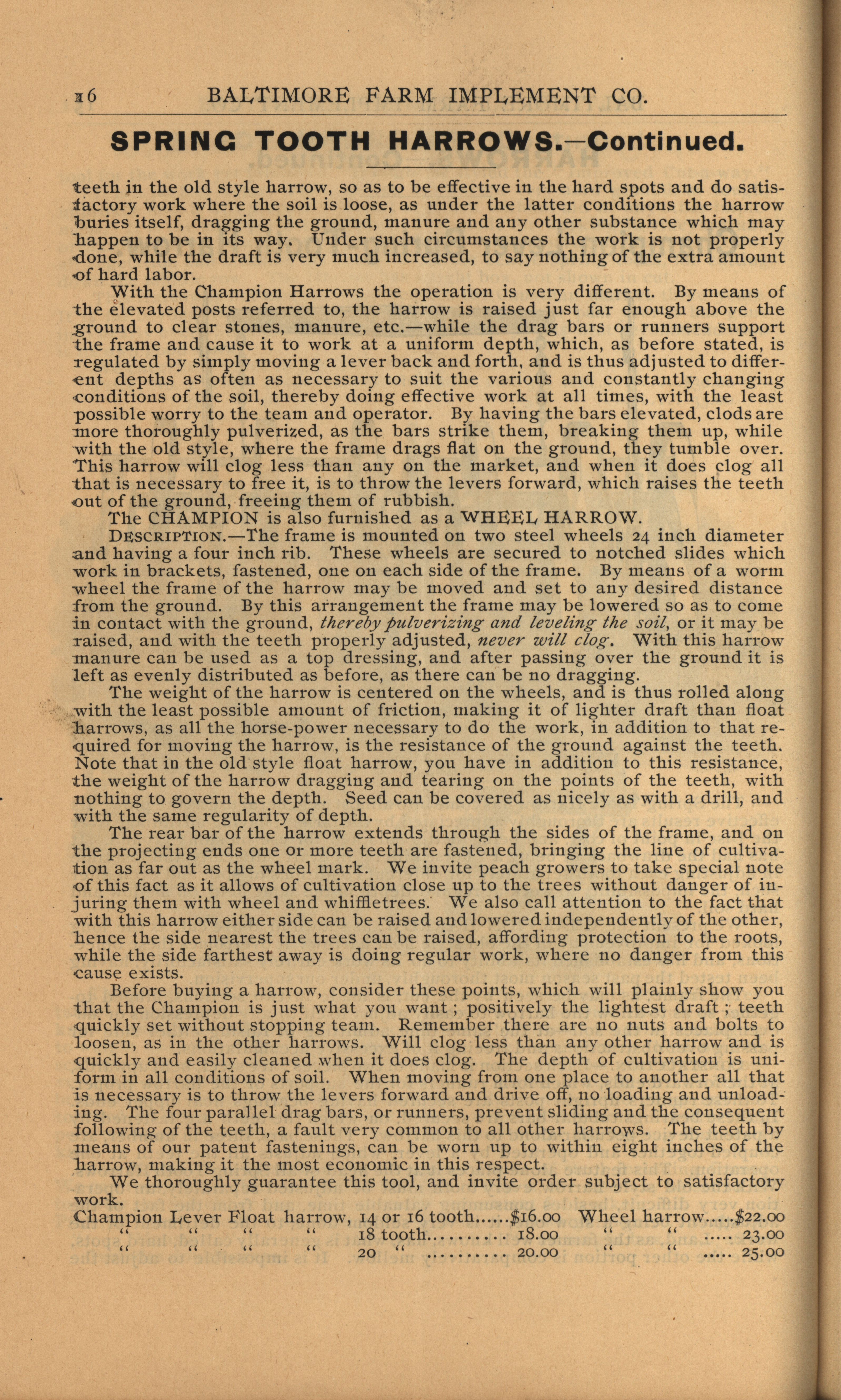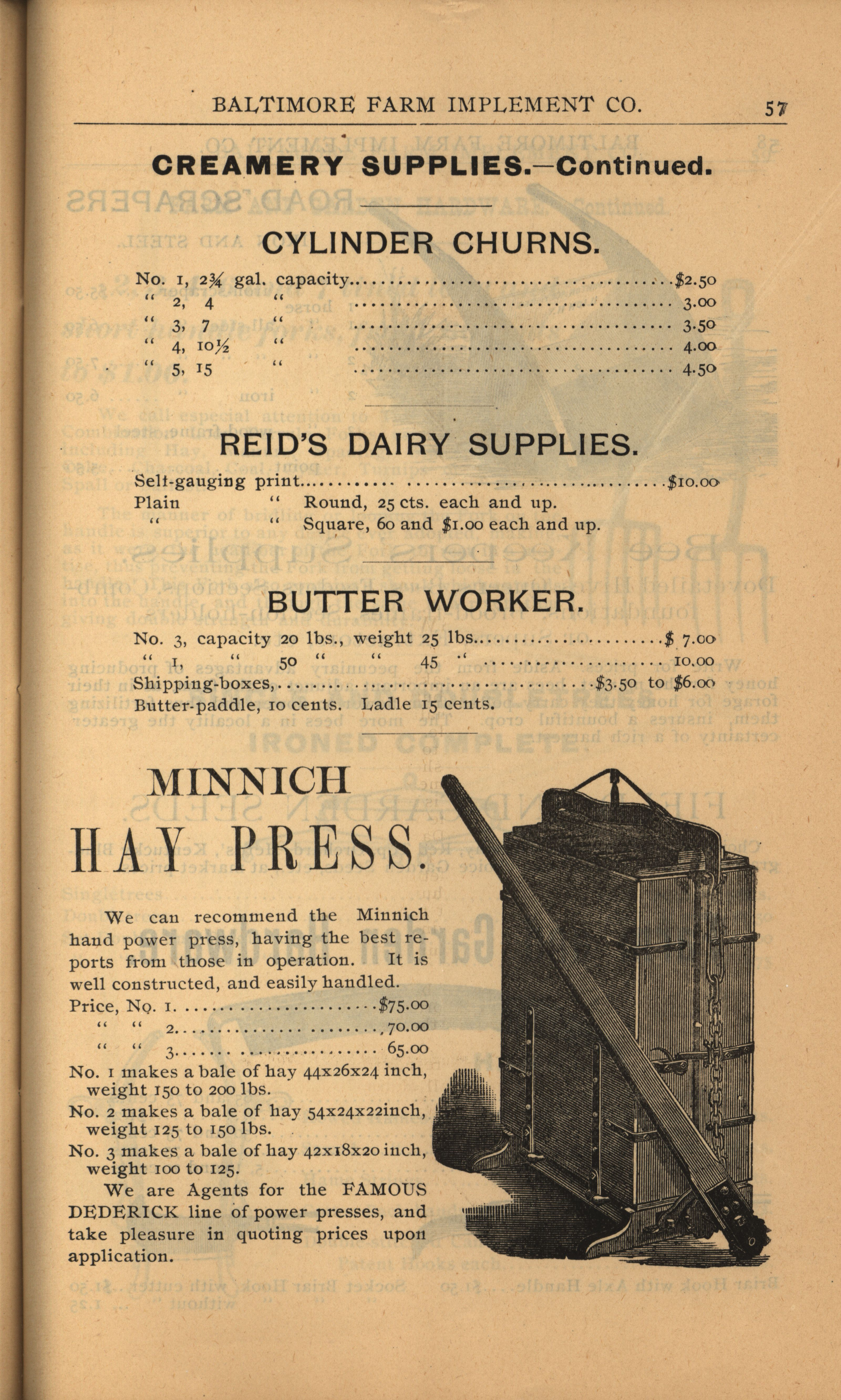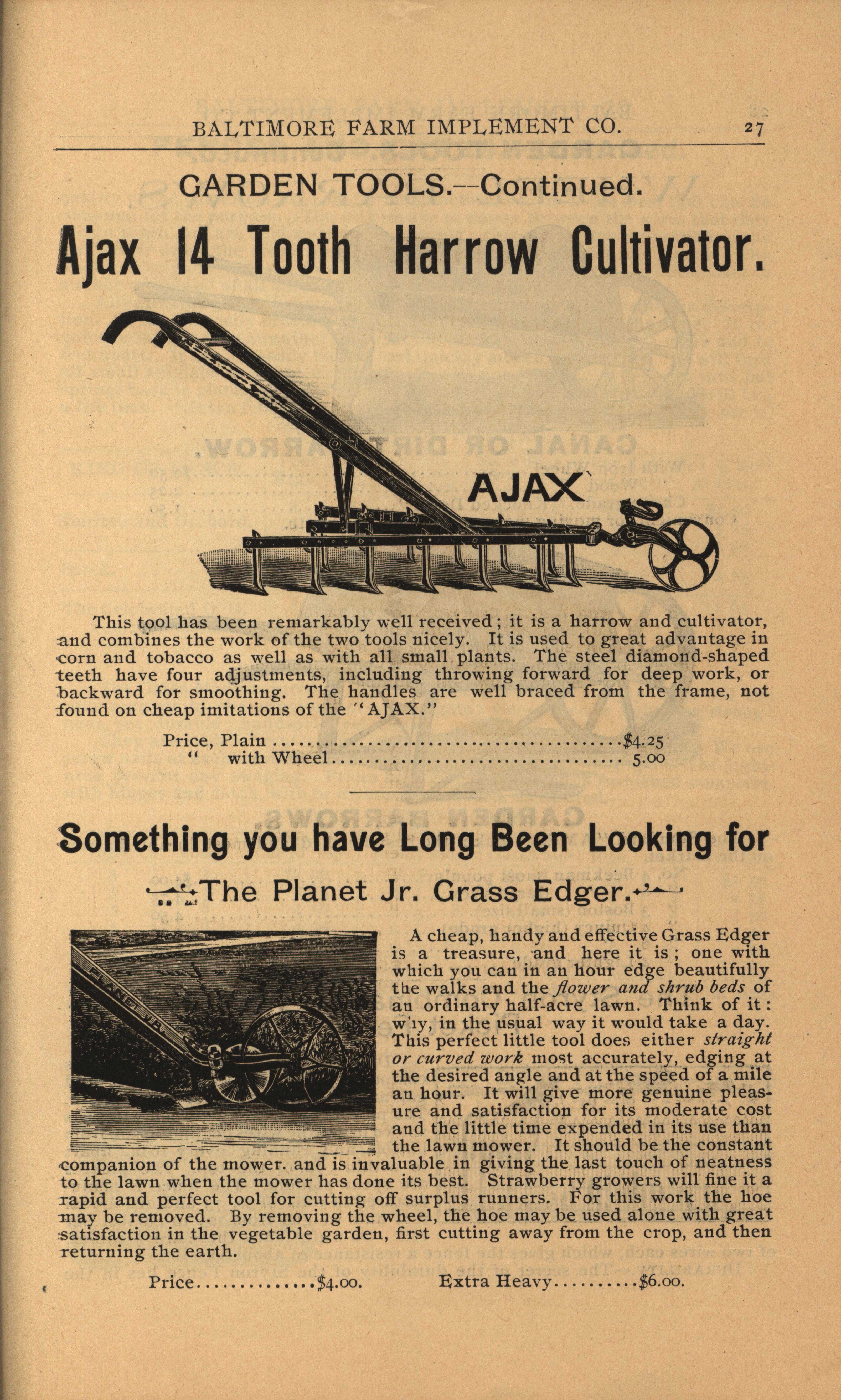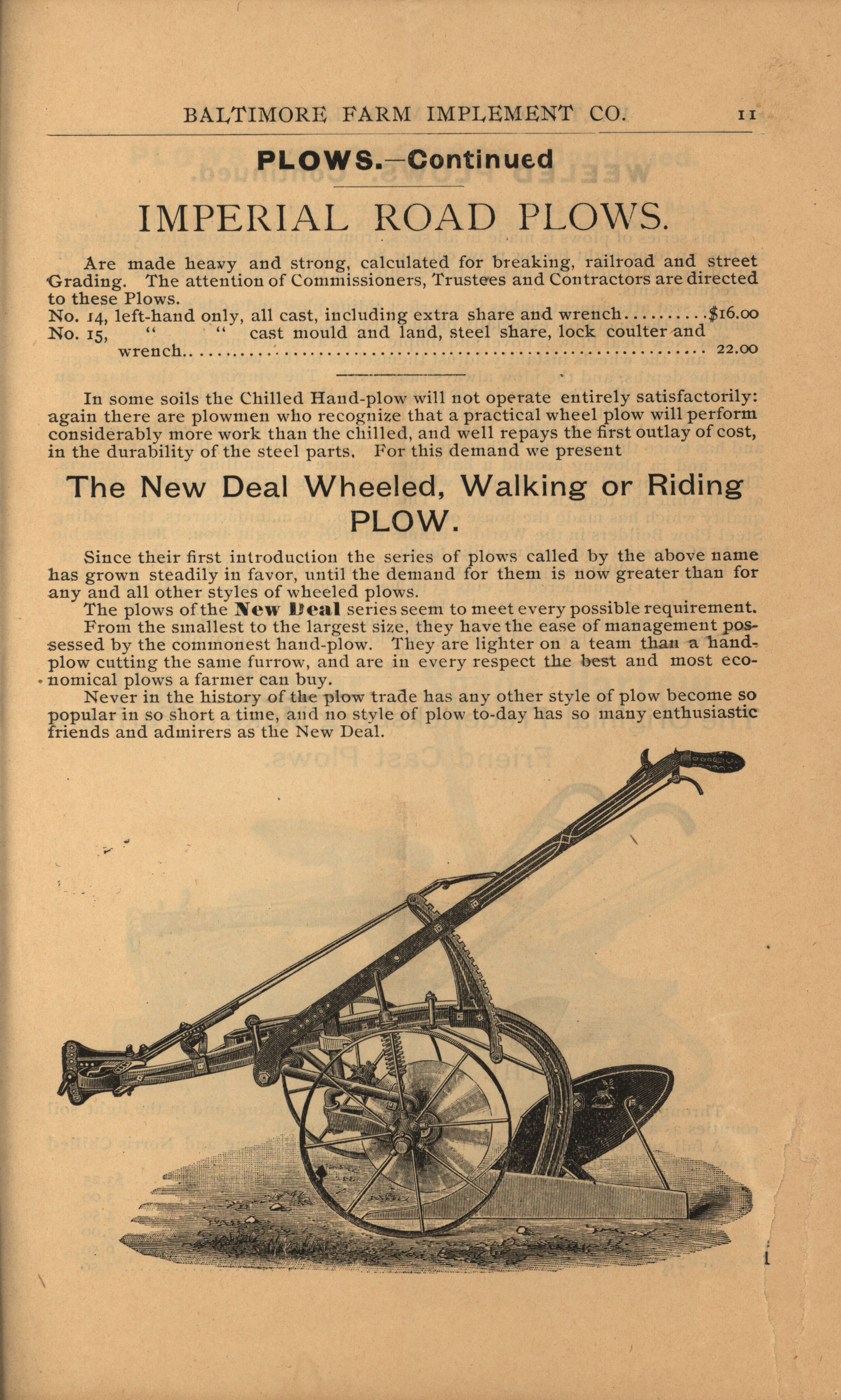 - Illustrated catalog describing the agricultural implements and related products offered by the Baltimore Farm Implement Company in 1892.