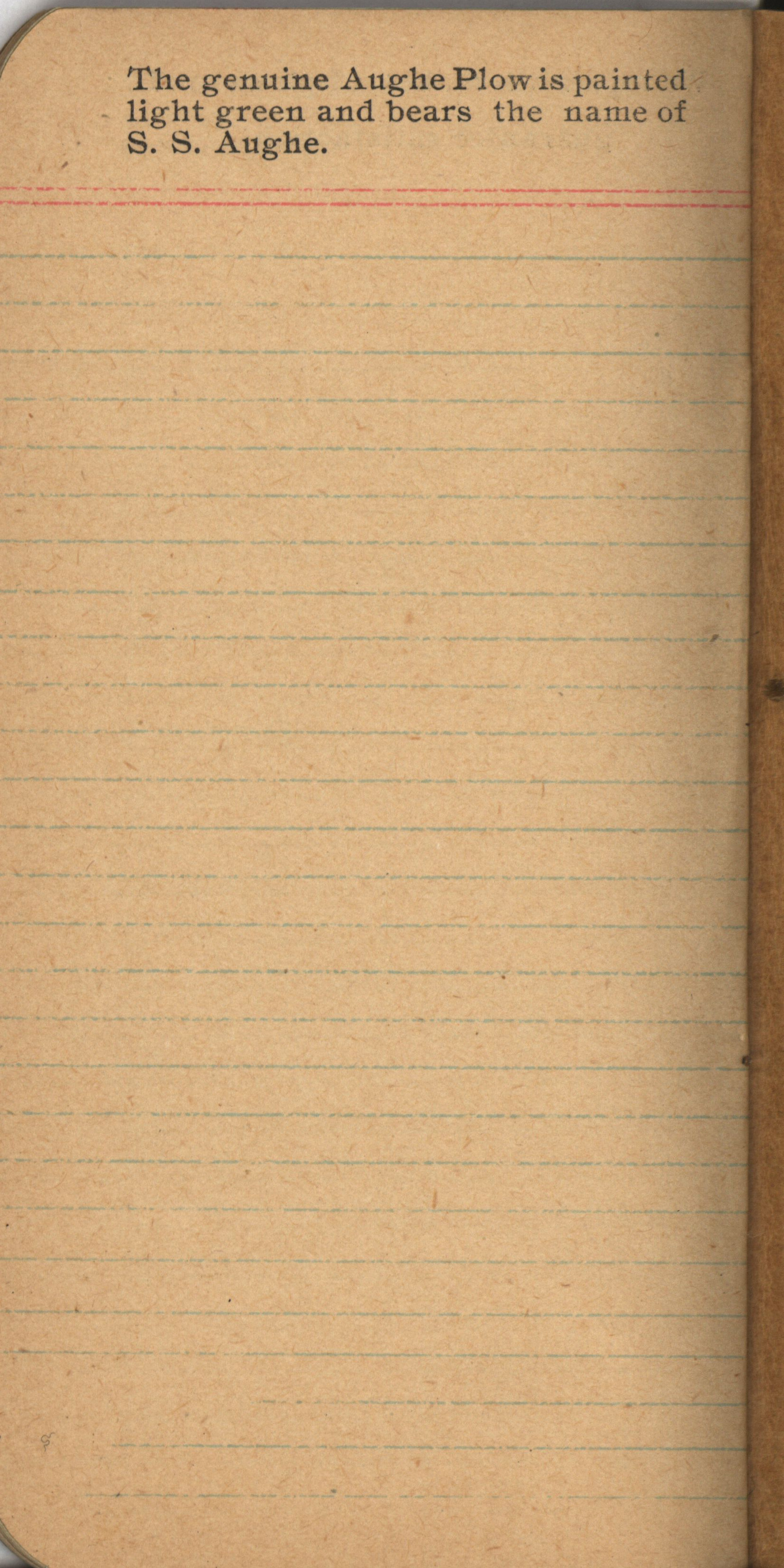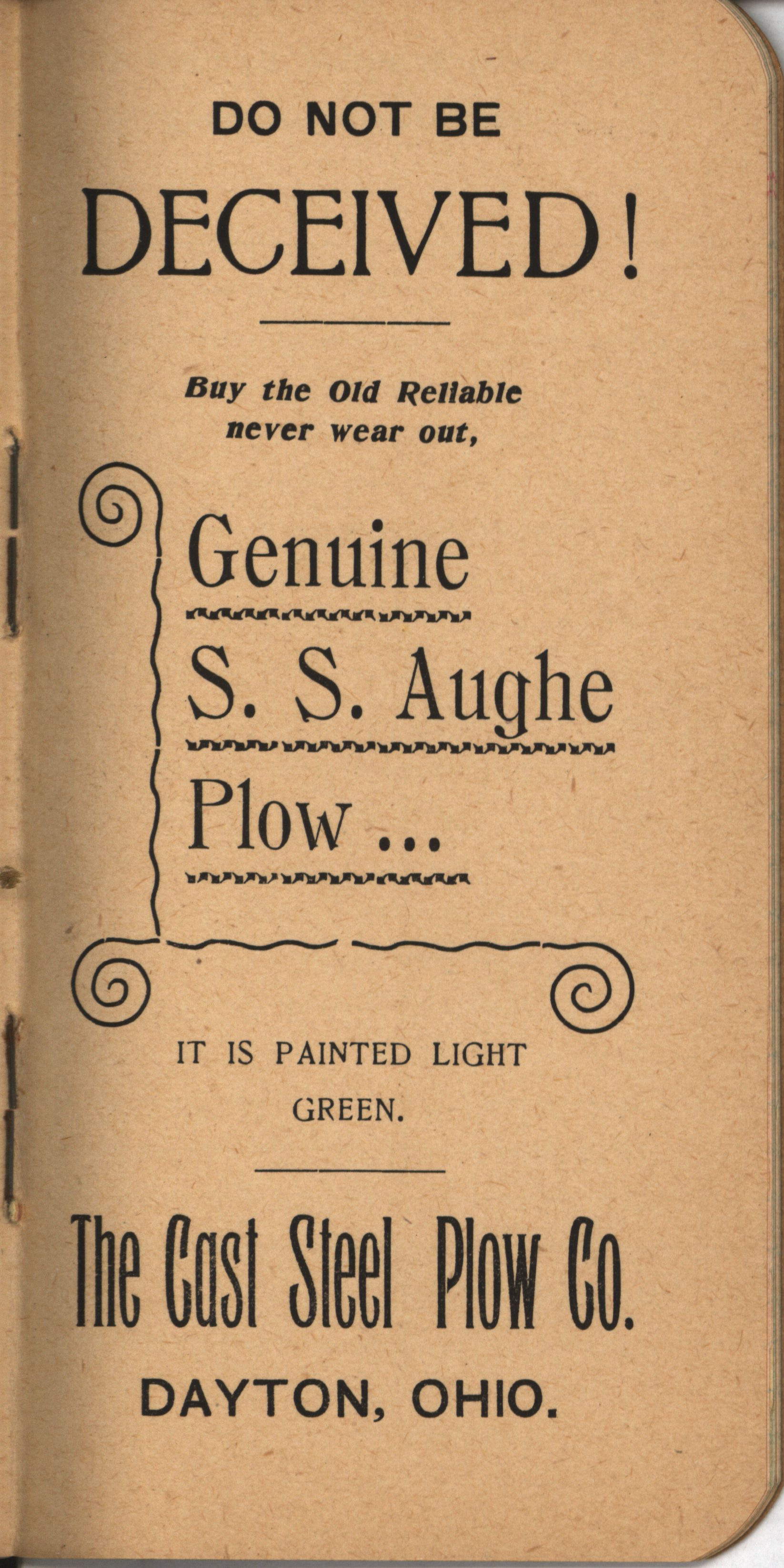 - "Advertisement pocket book for the Cast Steel Plow Company Aughe Plow", Agricultural Machinery Literature Collection, Iowa State University Library Digital Collections