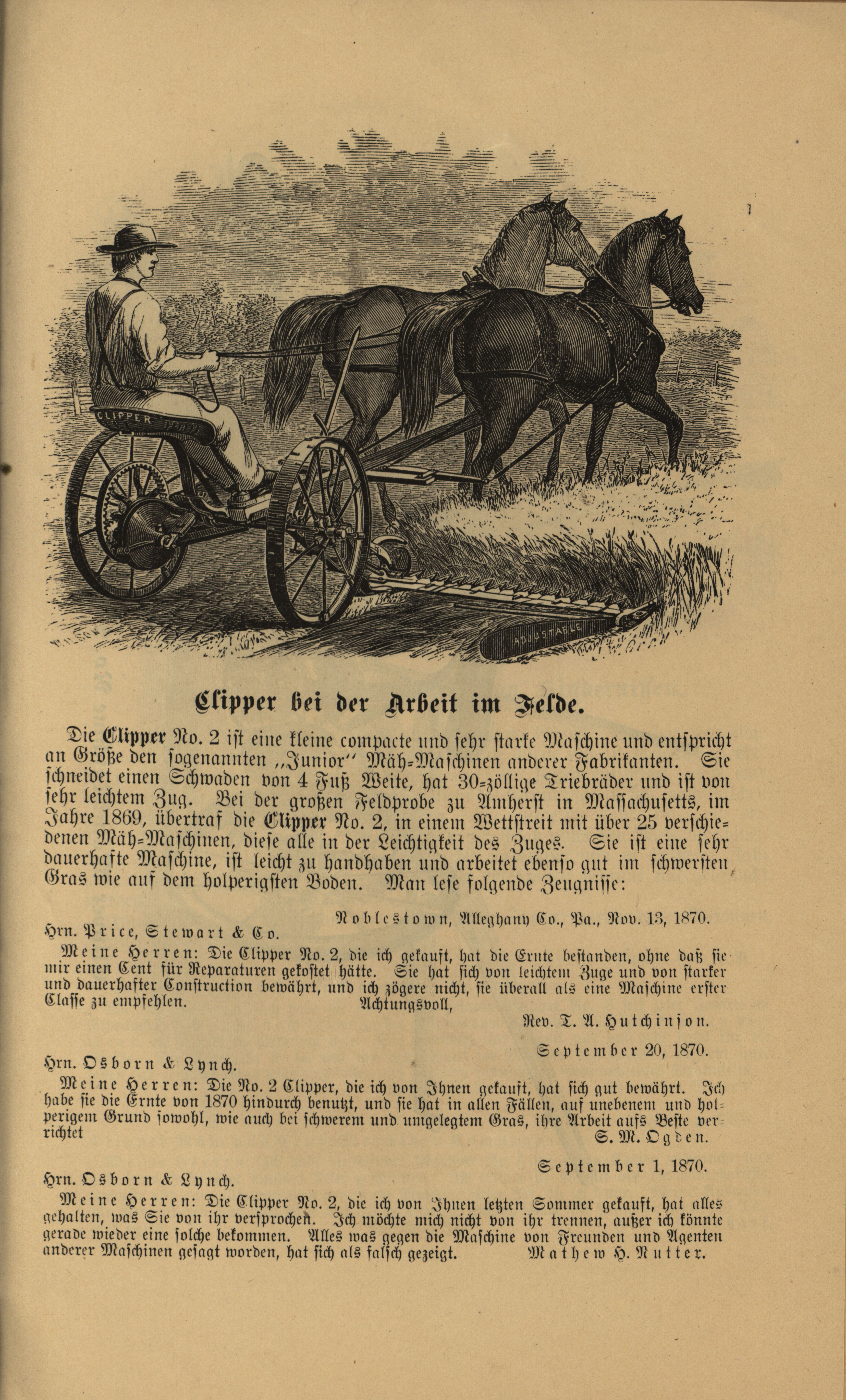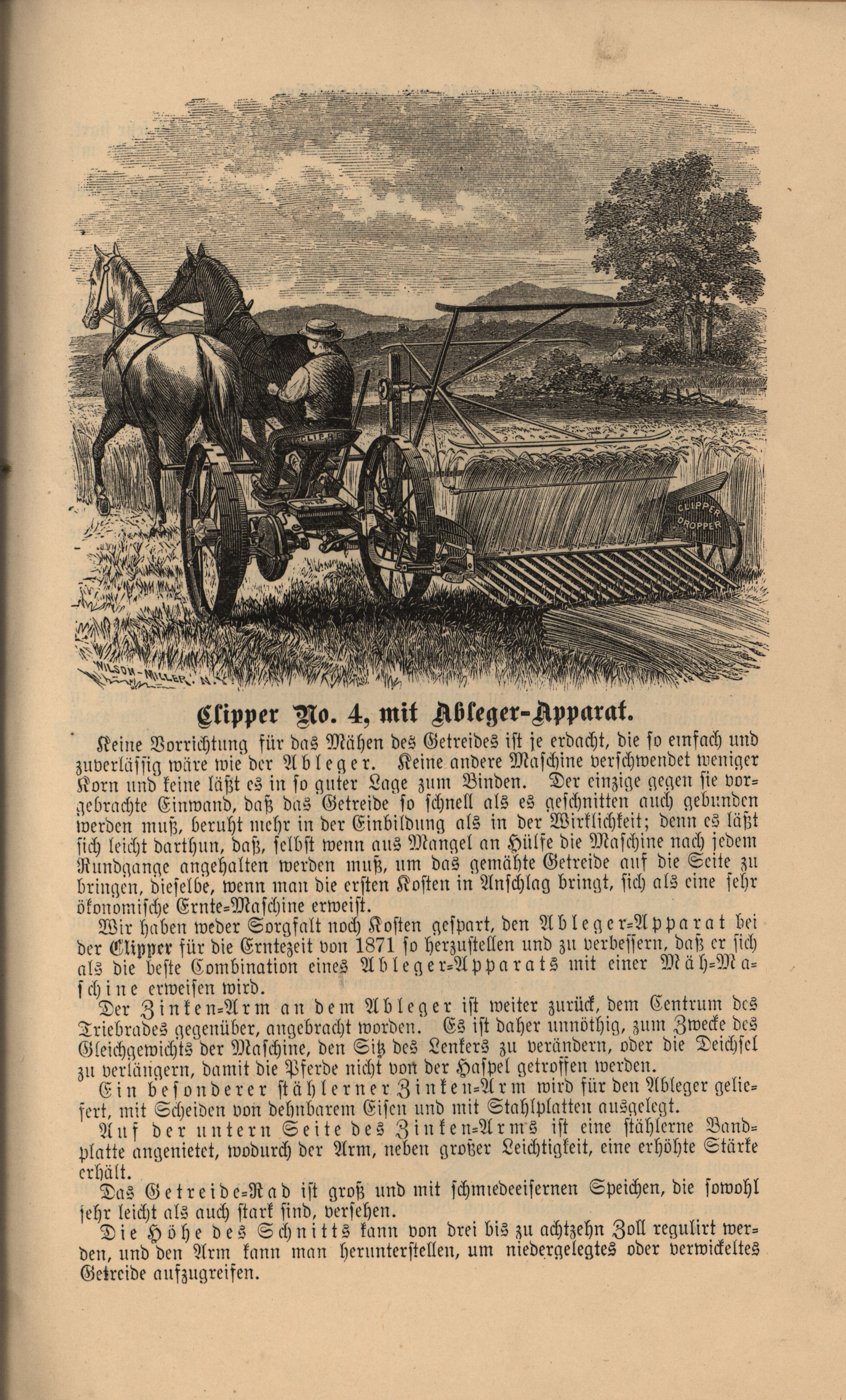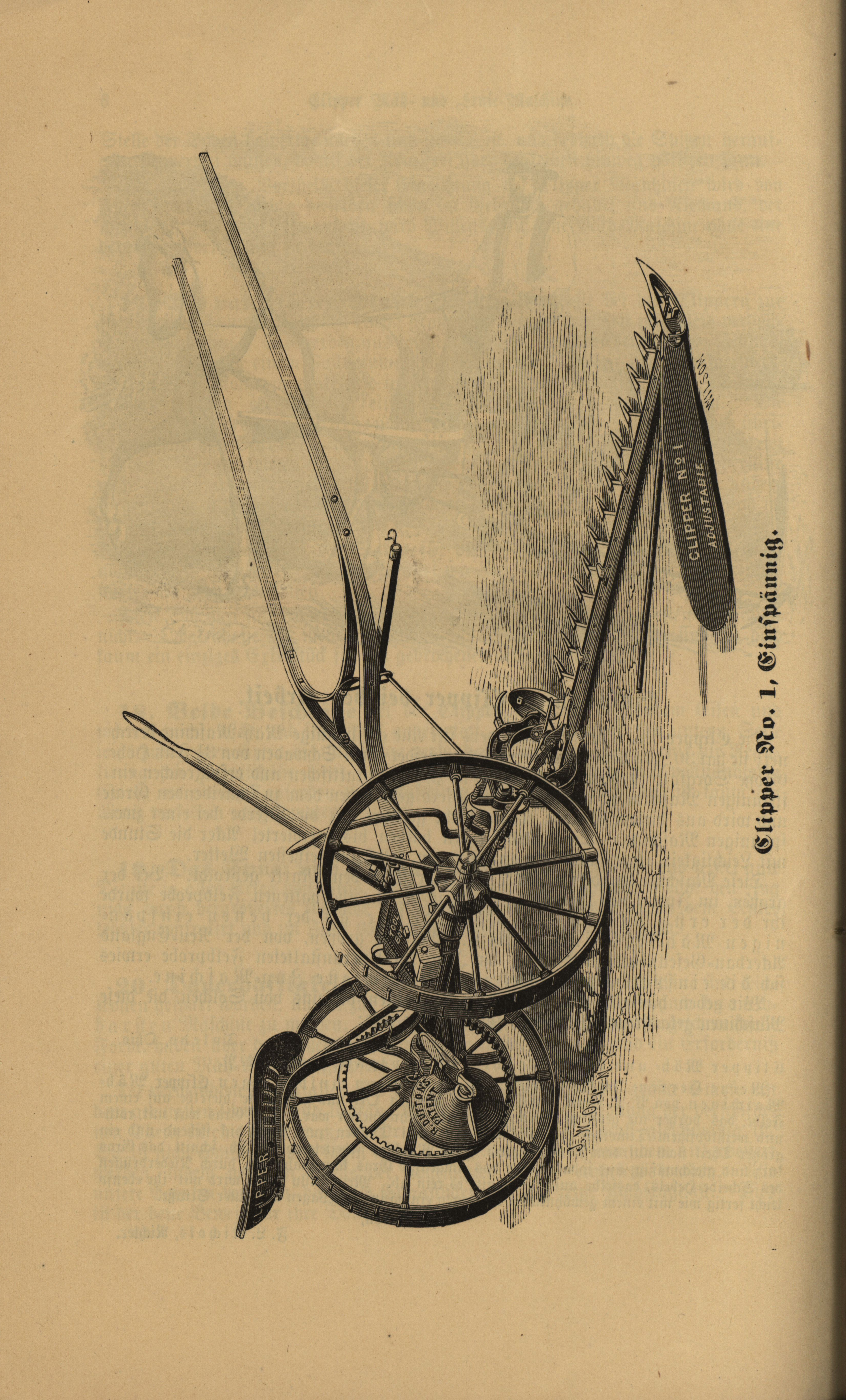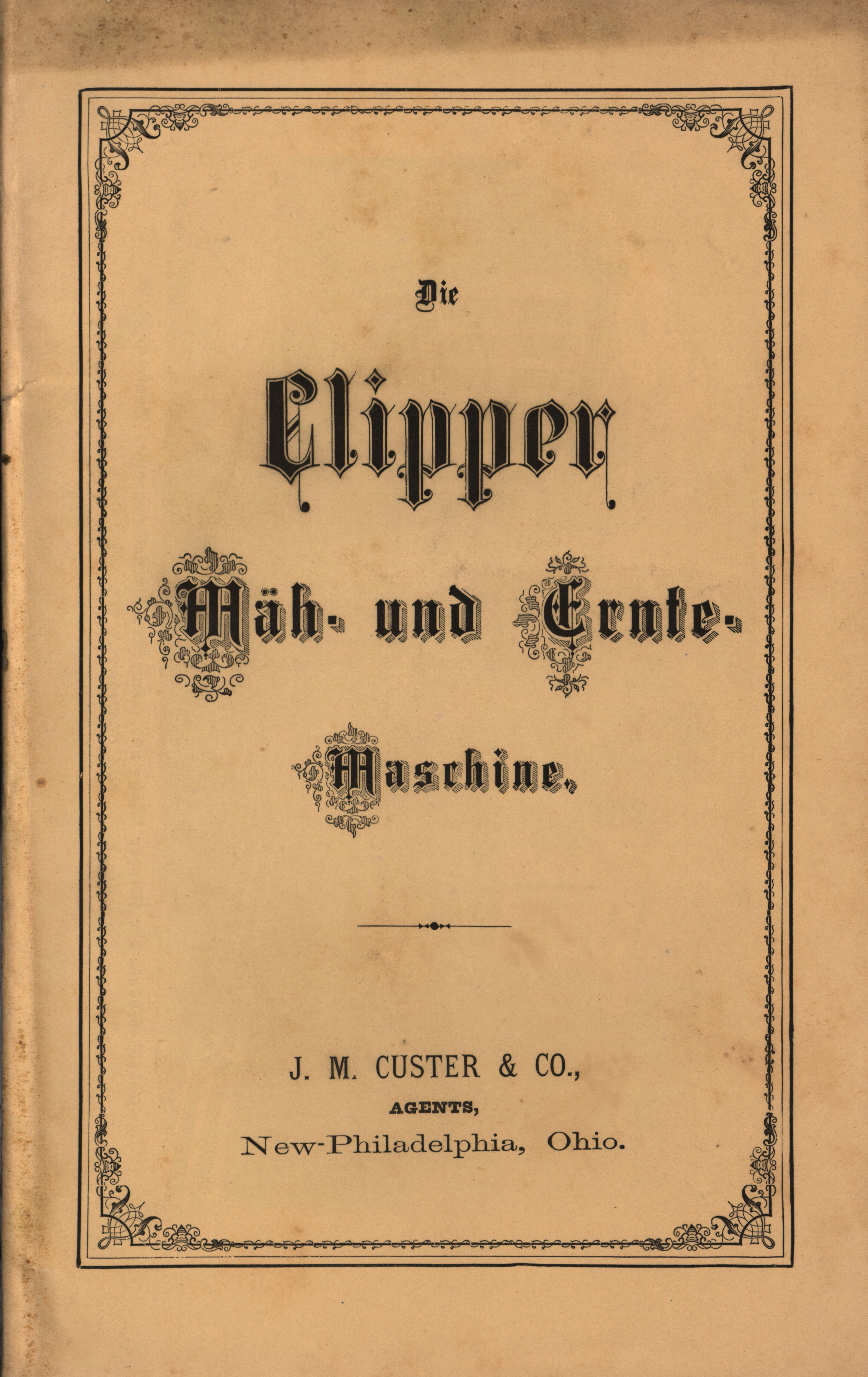 - "J. M. Custer and Company 1871 Clipper Mah und Ernte-Maschine", Agricultural Machinery Literature Collection, Iowa State University Library Digital Collections