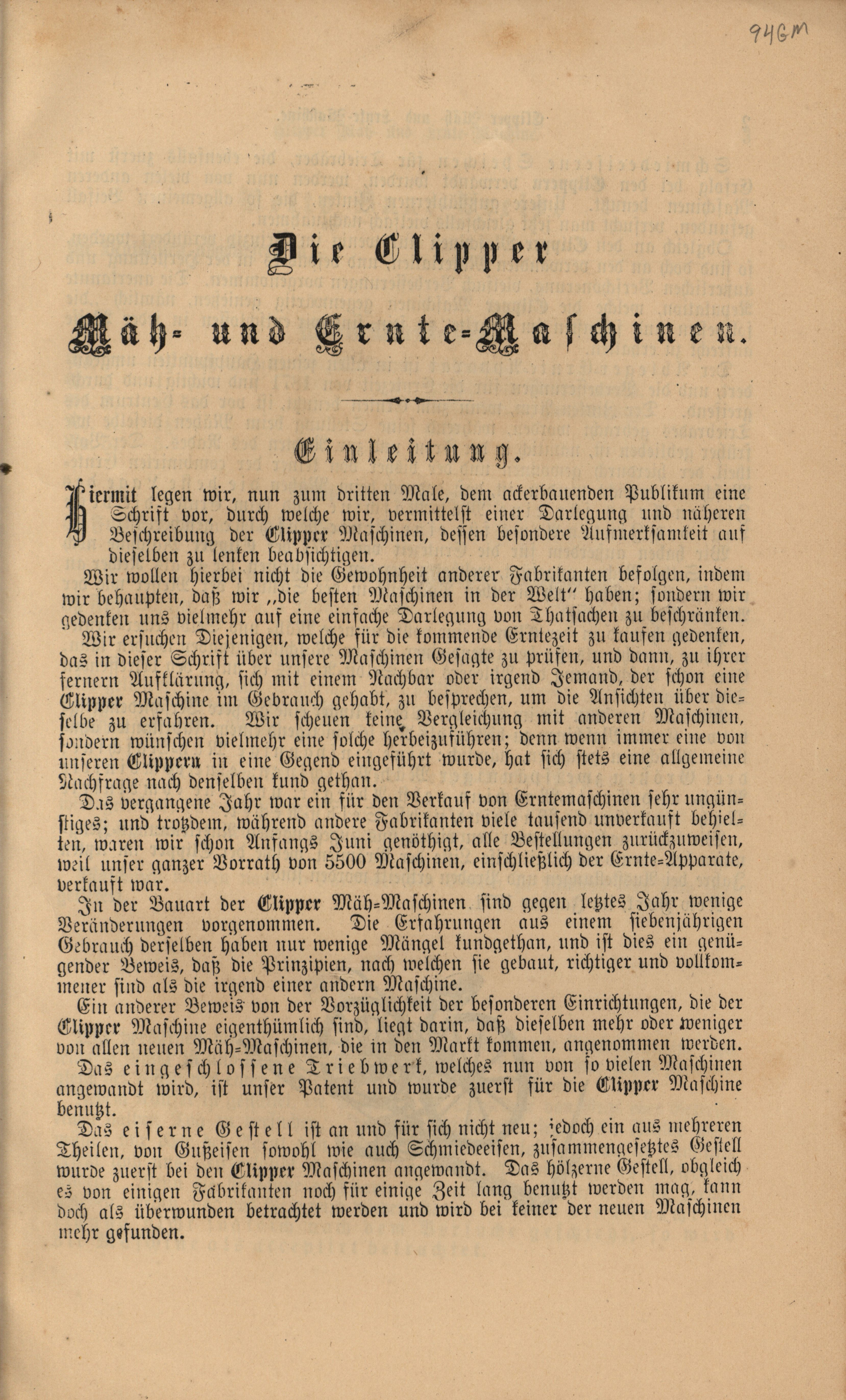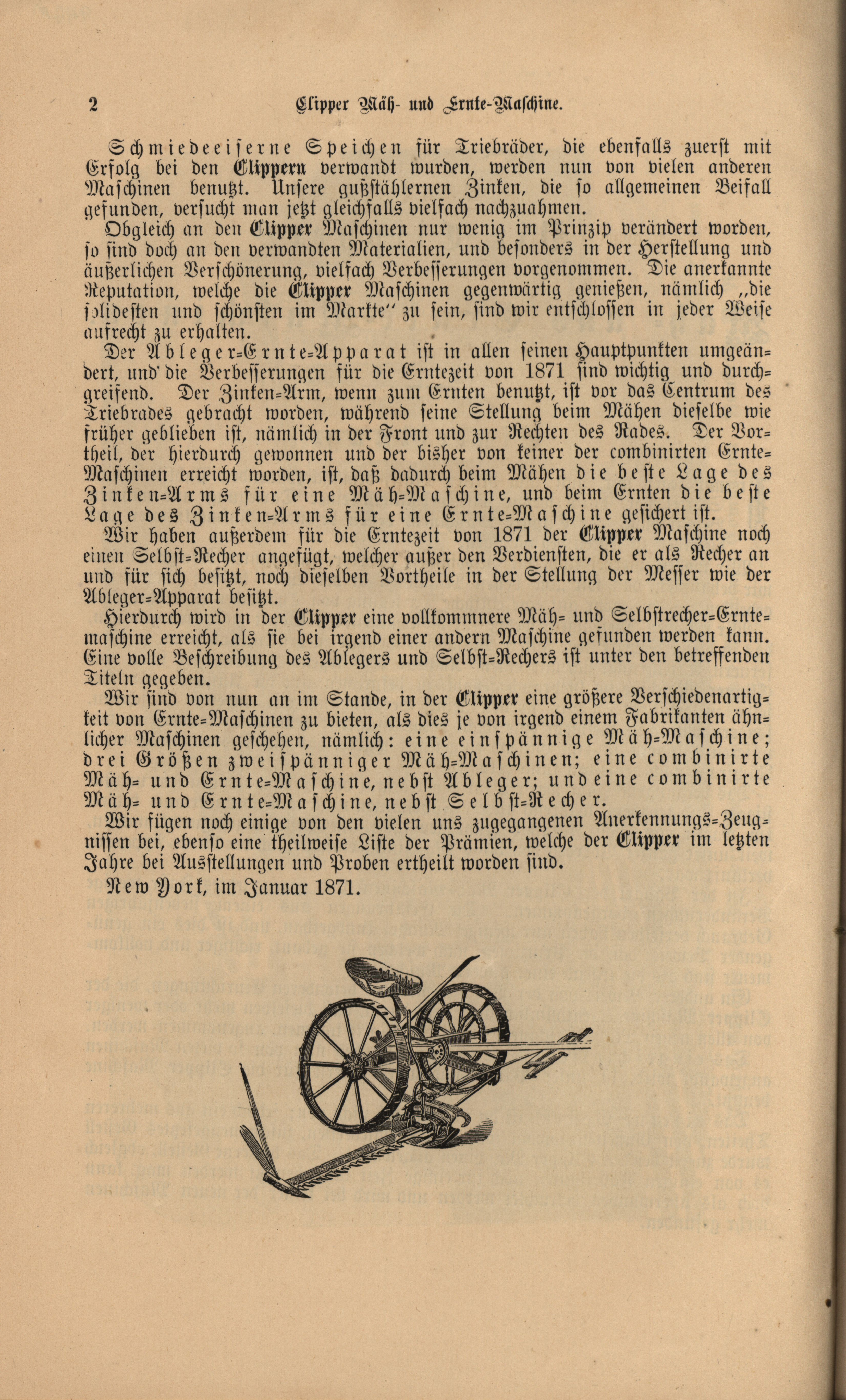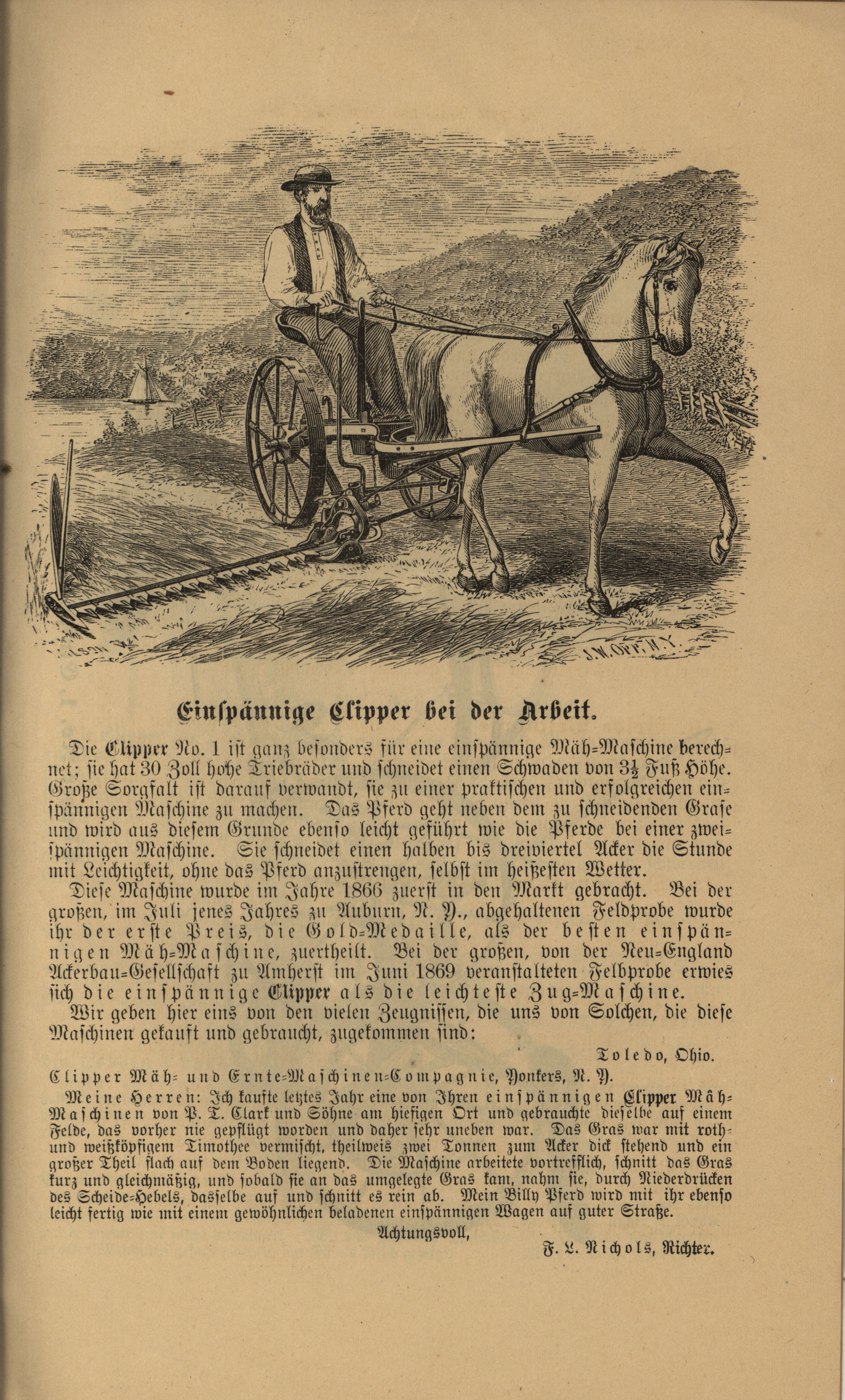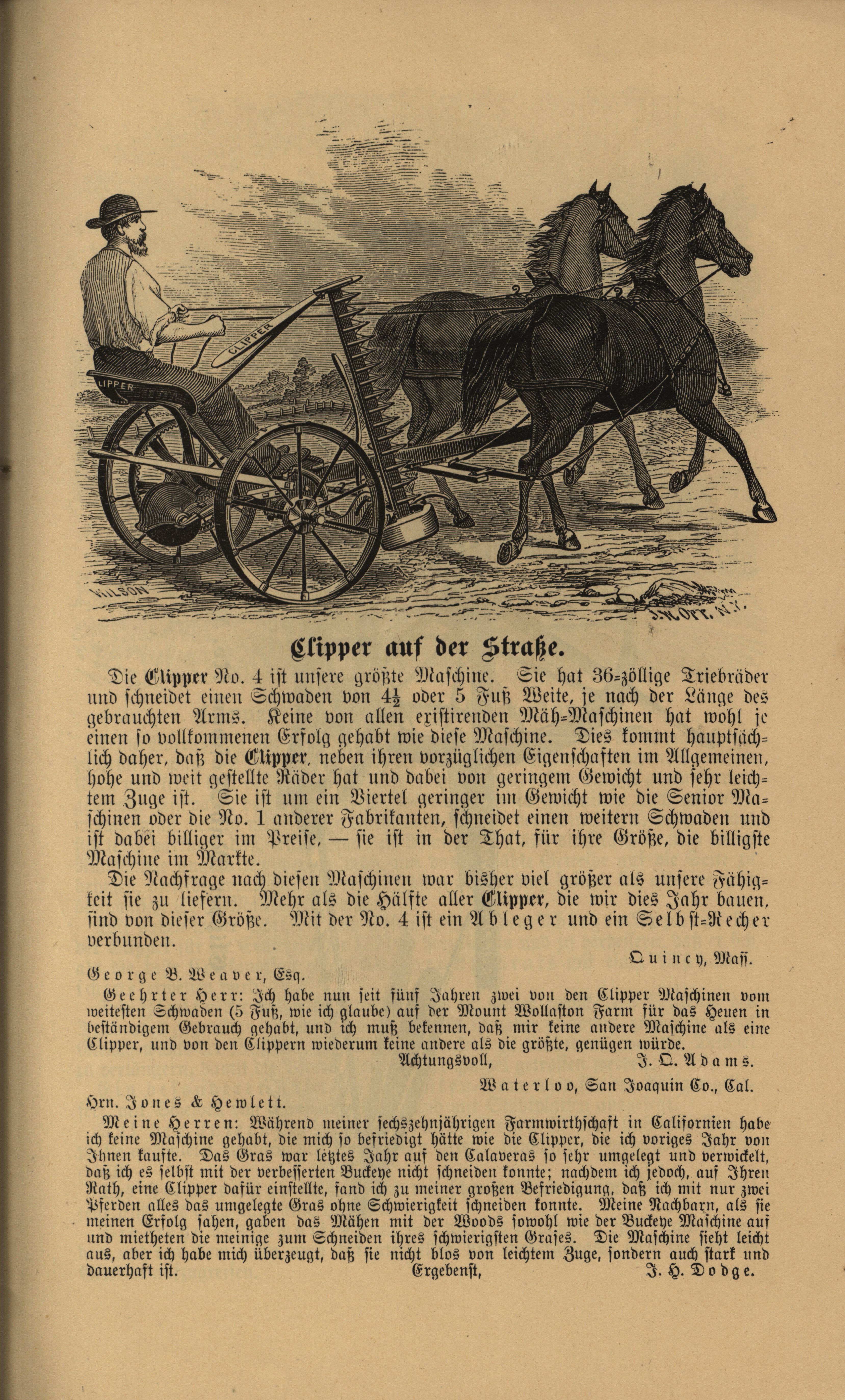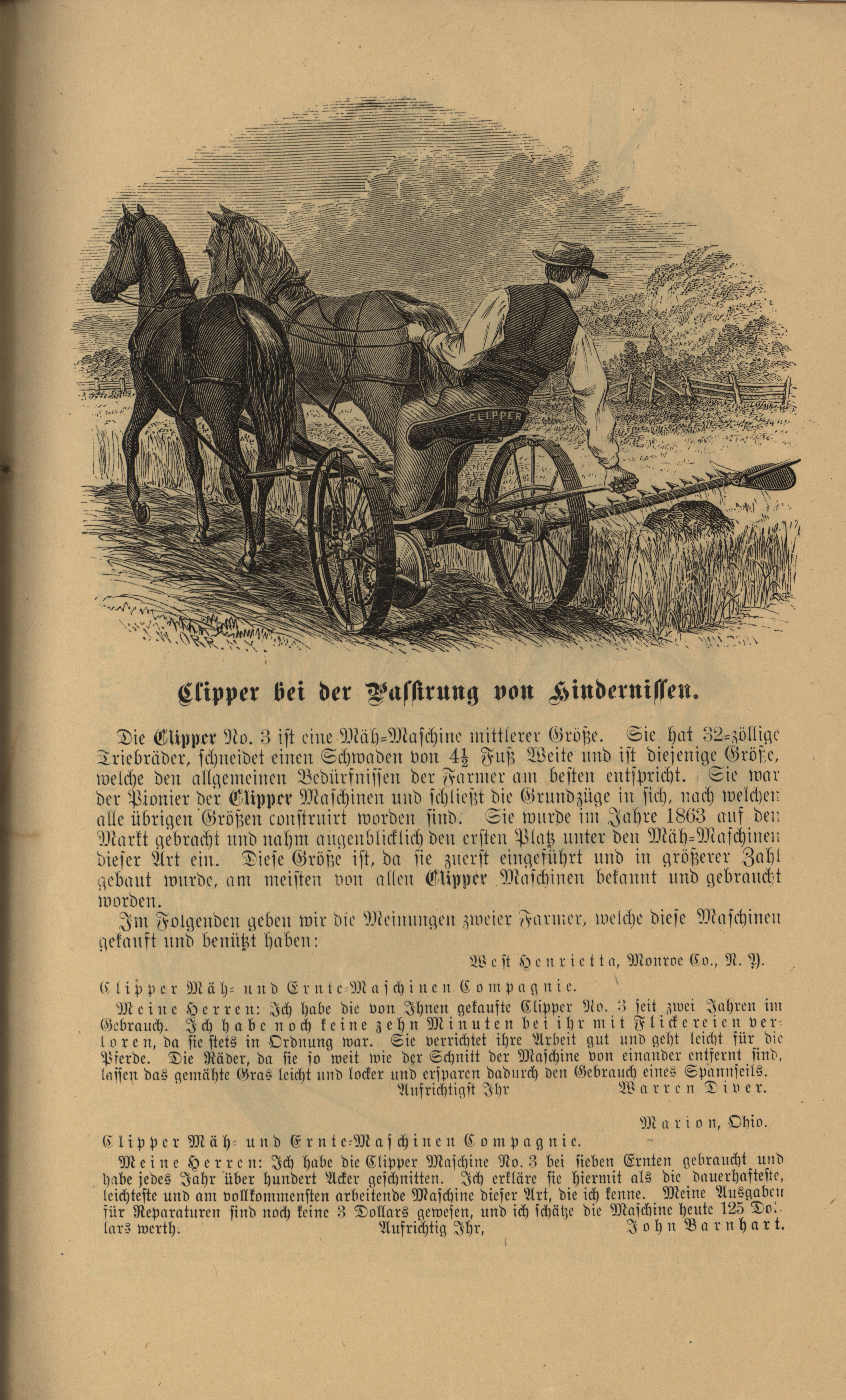 - "J. M. Custer and Company 1871 Clipper Mah und Ernte-Maschine", Agricultural Machinery Literature Collection, Iowa State University Library Digital Collections