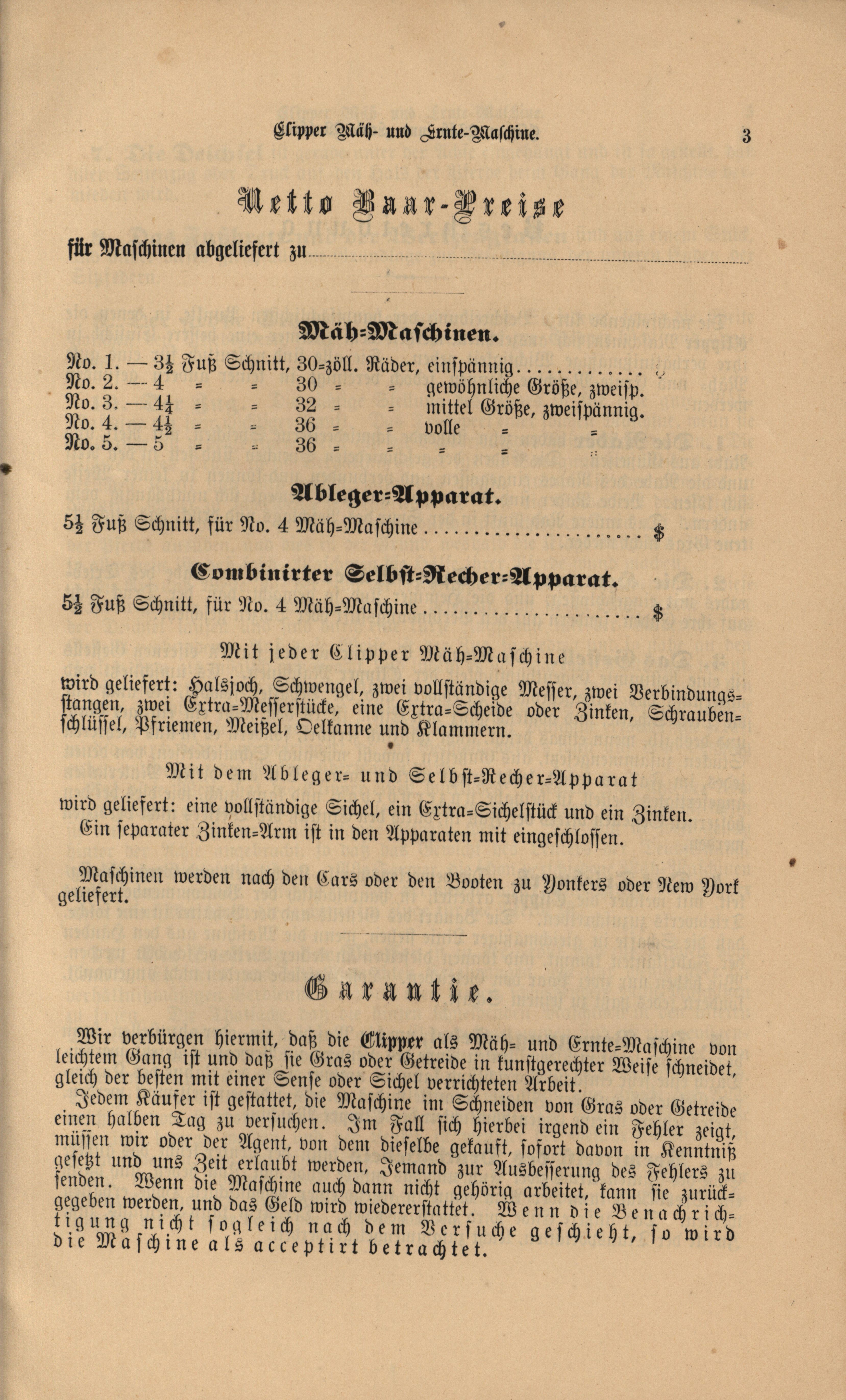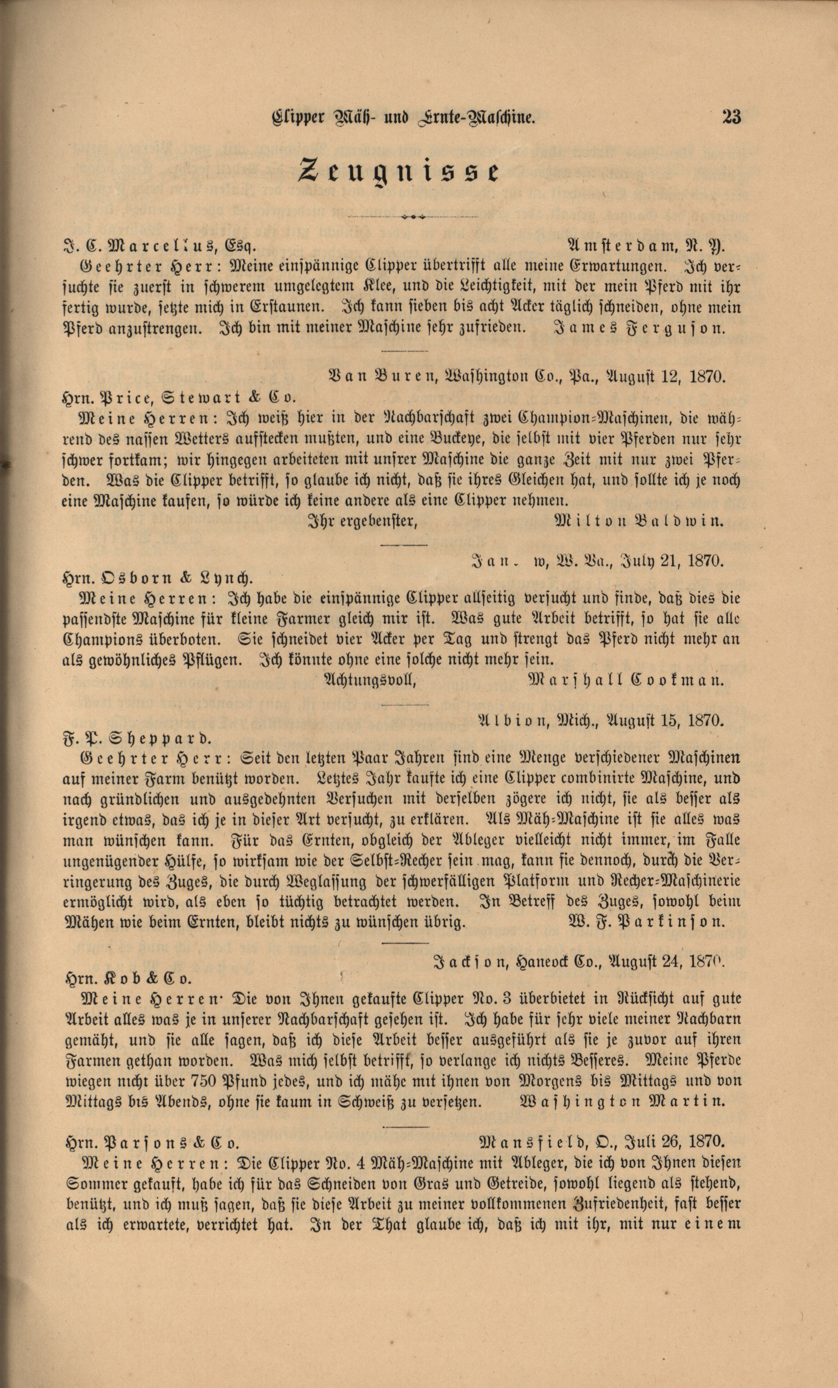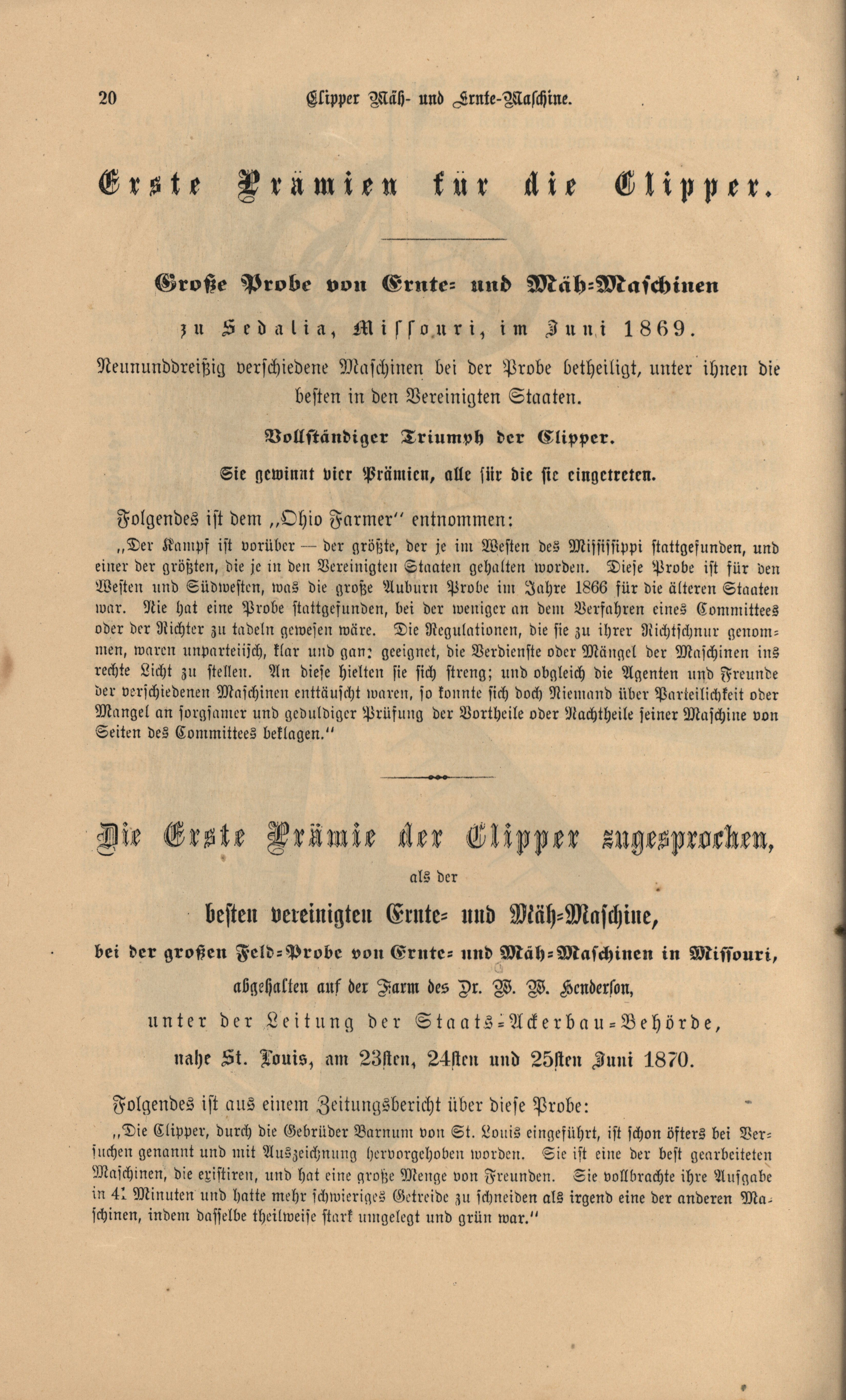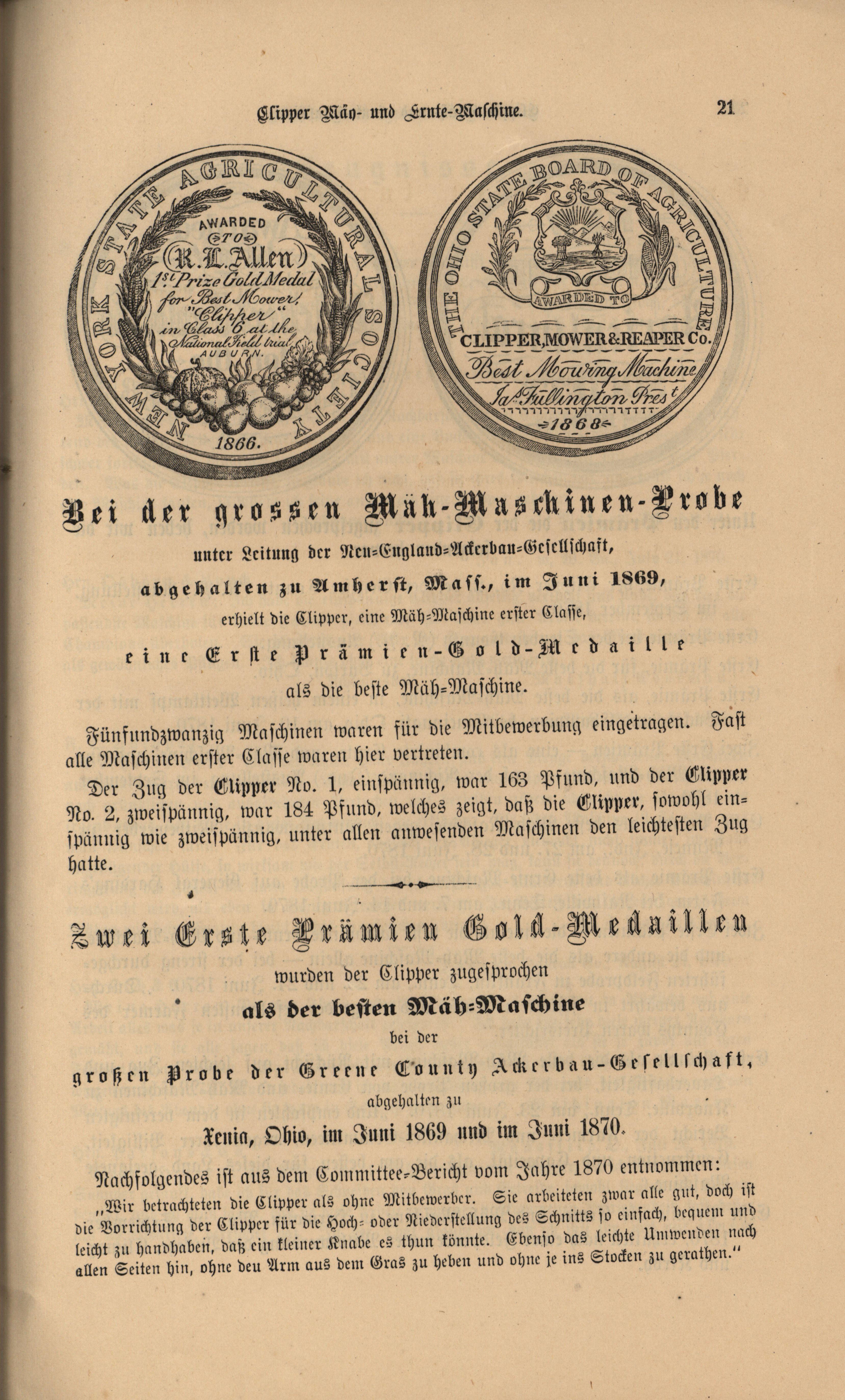 - "J. M. Custer and Company 1871 Clipper Mah und Ernte-Maschine", Agricultural Machinery Literature Collection, Iowa State University Library Digital Collections