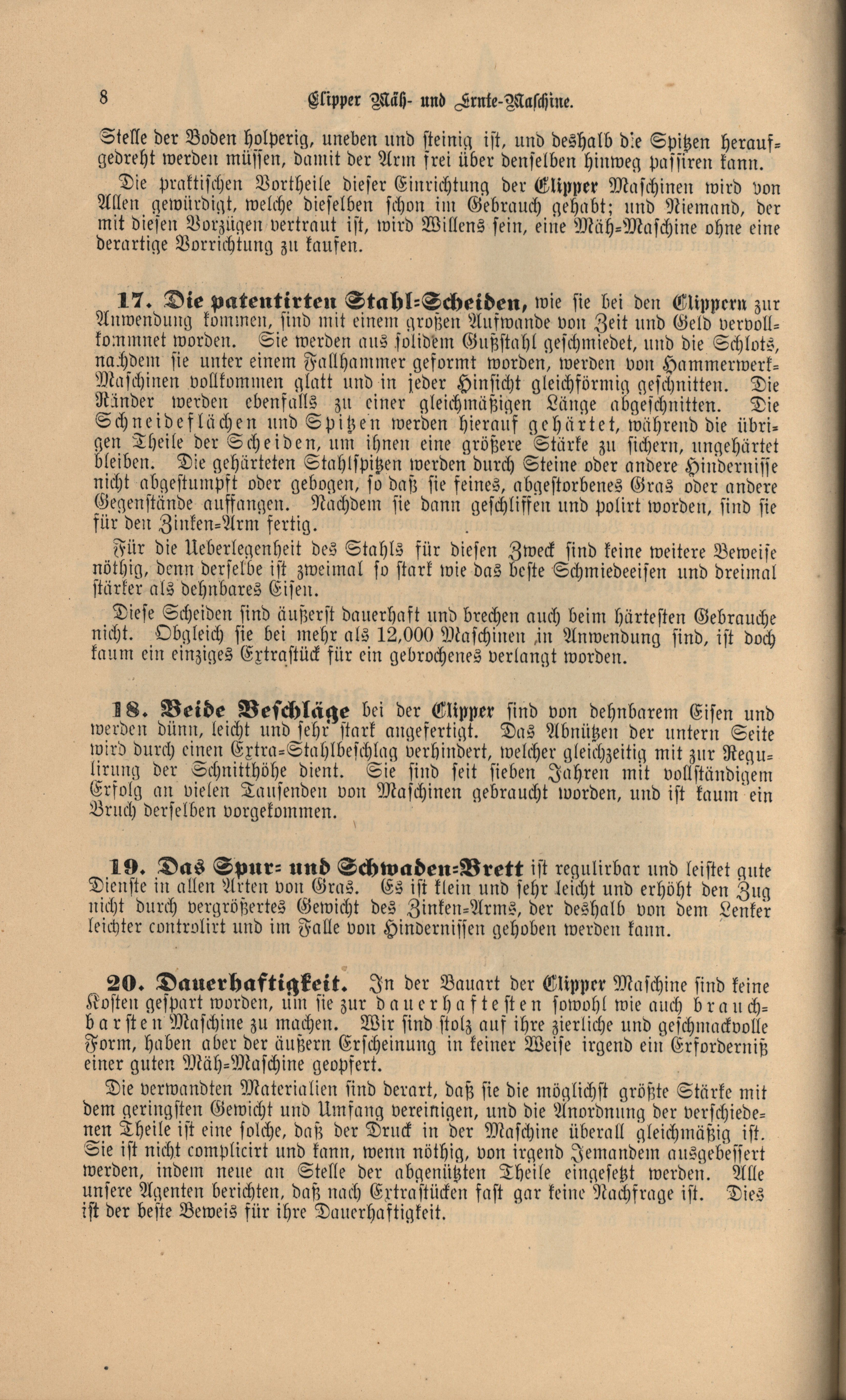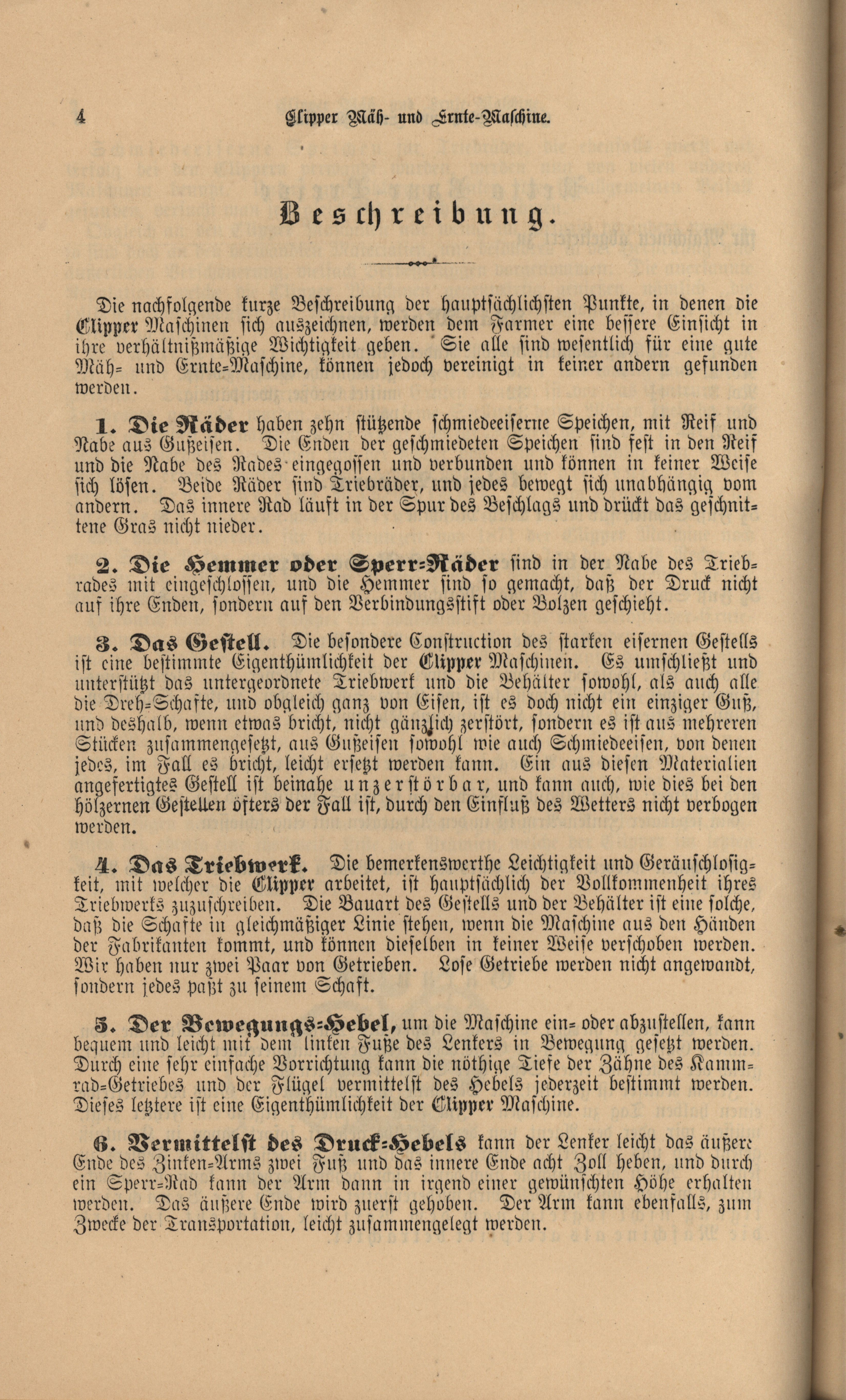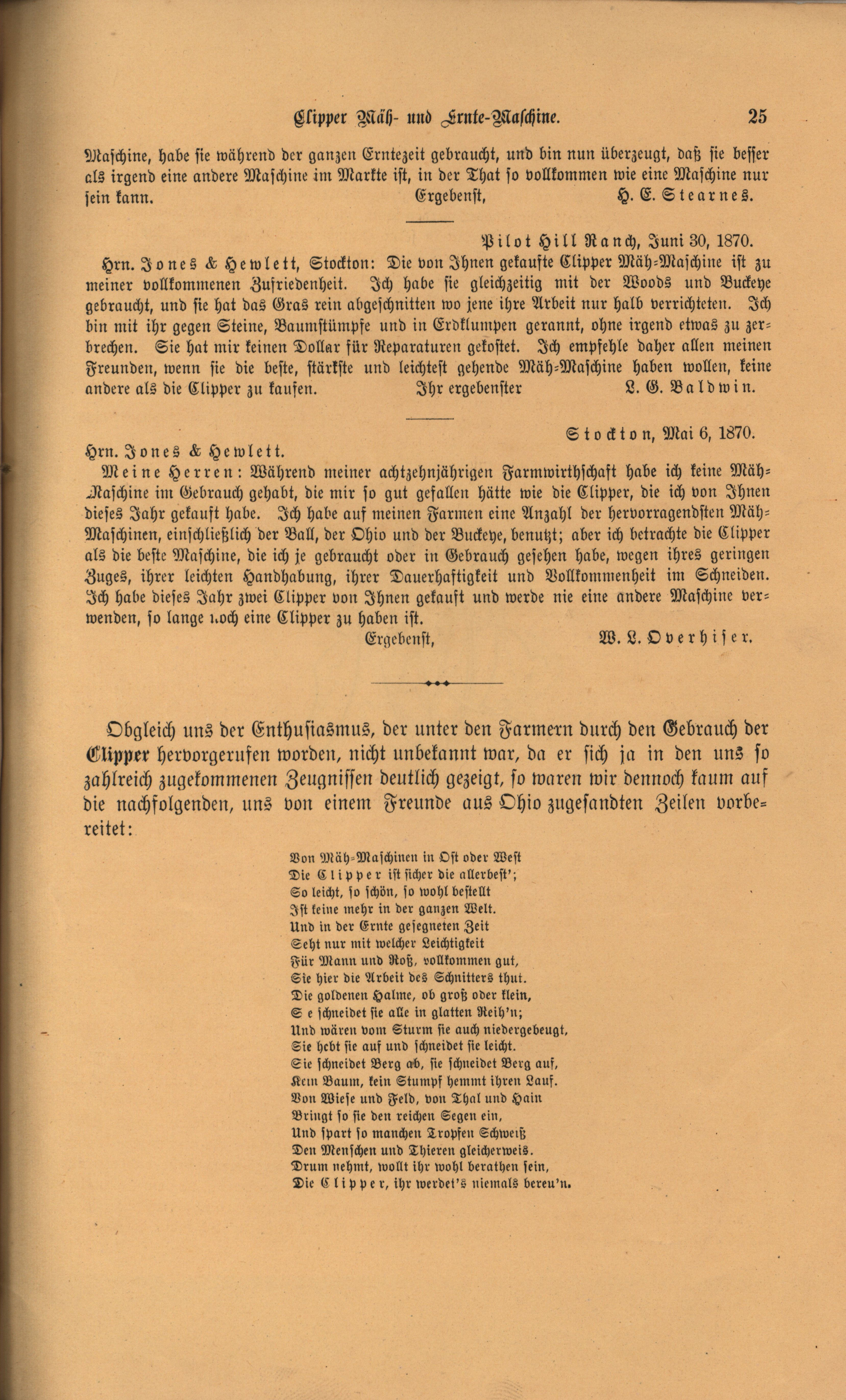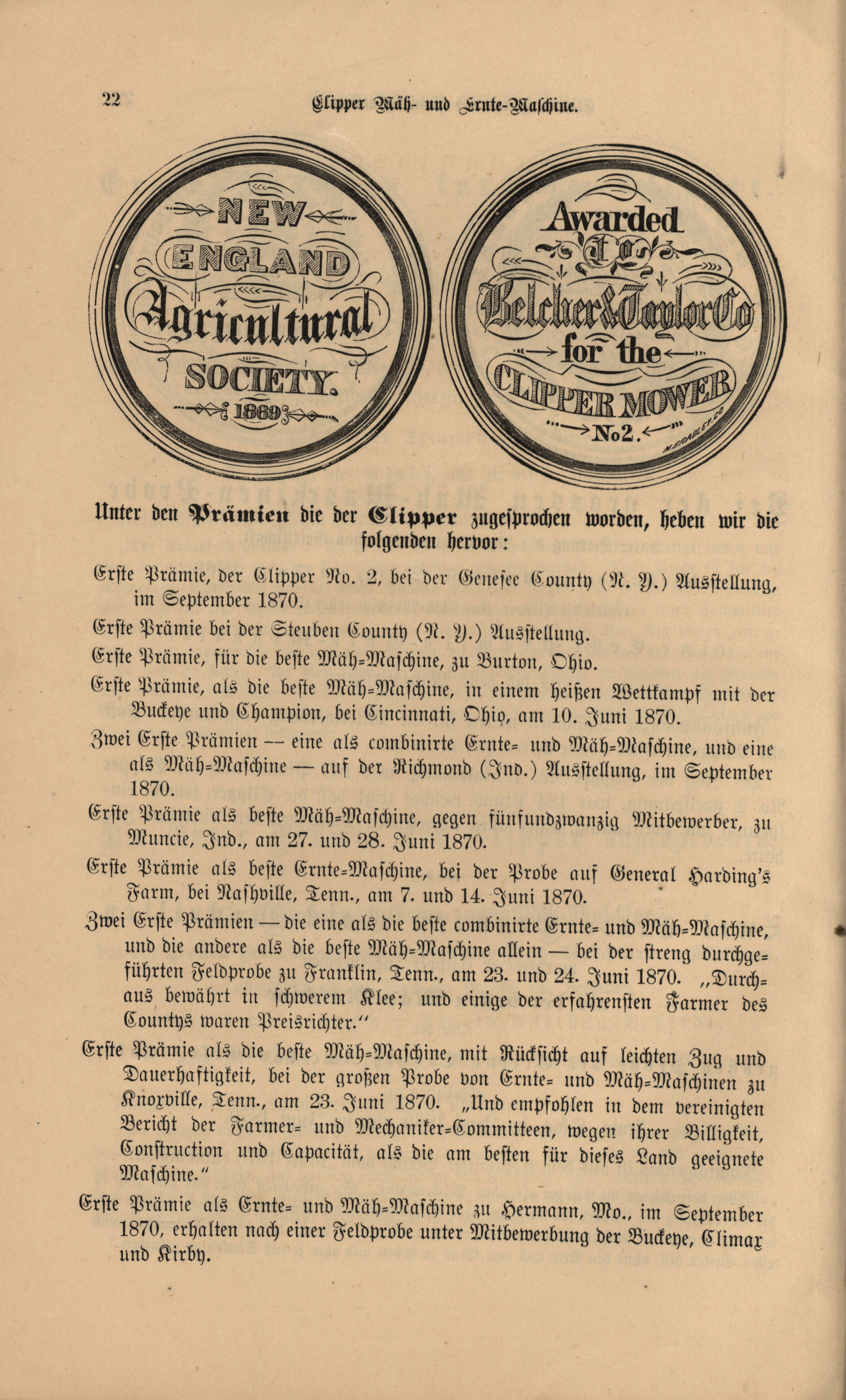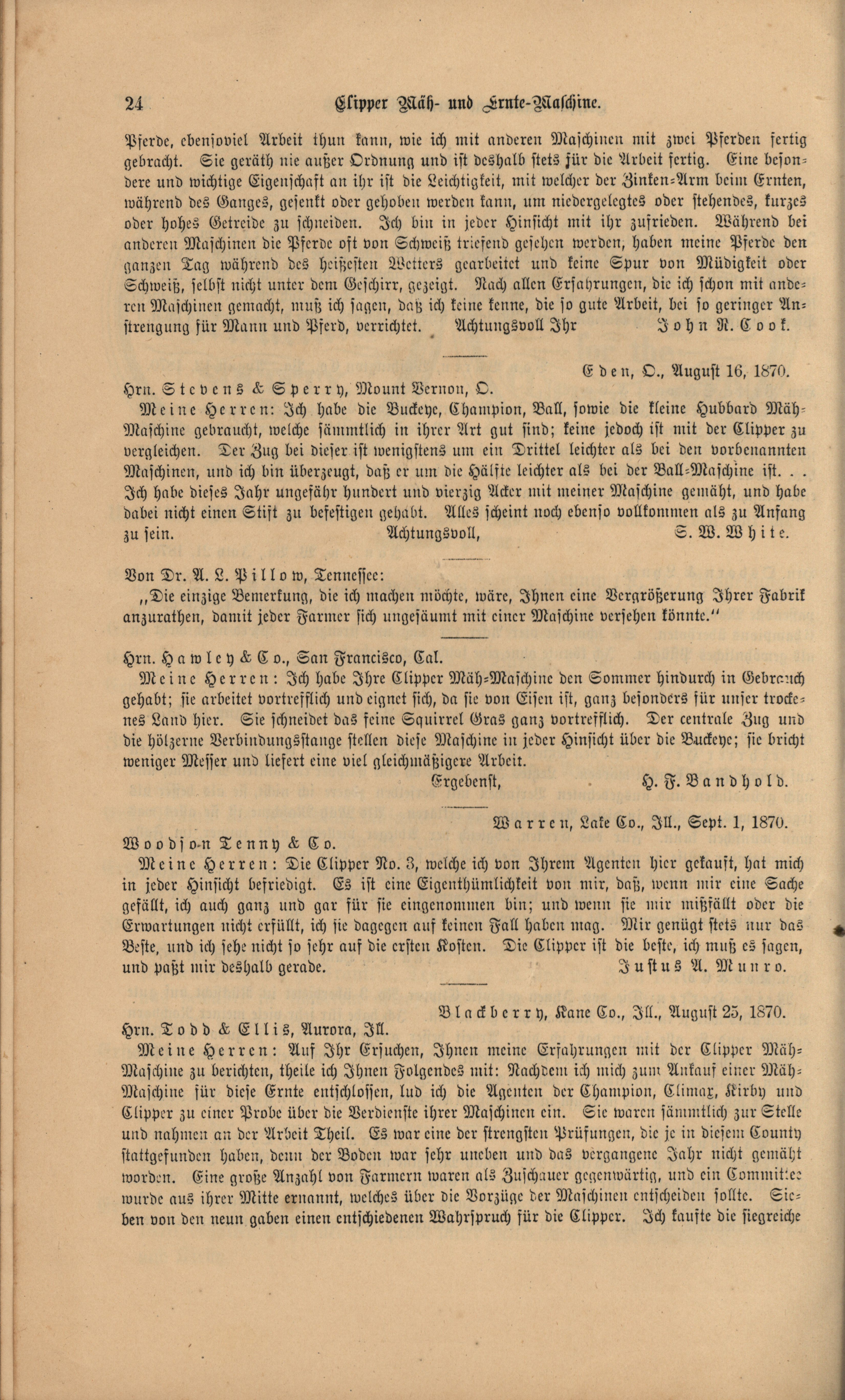 - "J. M. Custer and Company 1871 Clipper Mah und Ernte-Maschine", Agricultural Machinery Literature Collection, Iowa State University Library Digital Collections