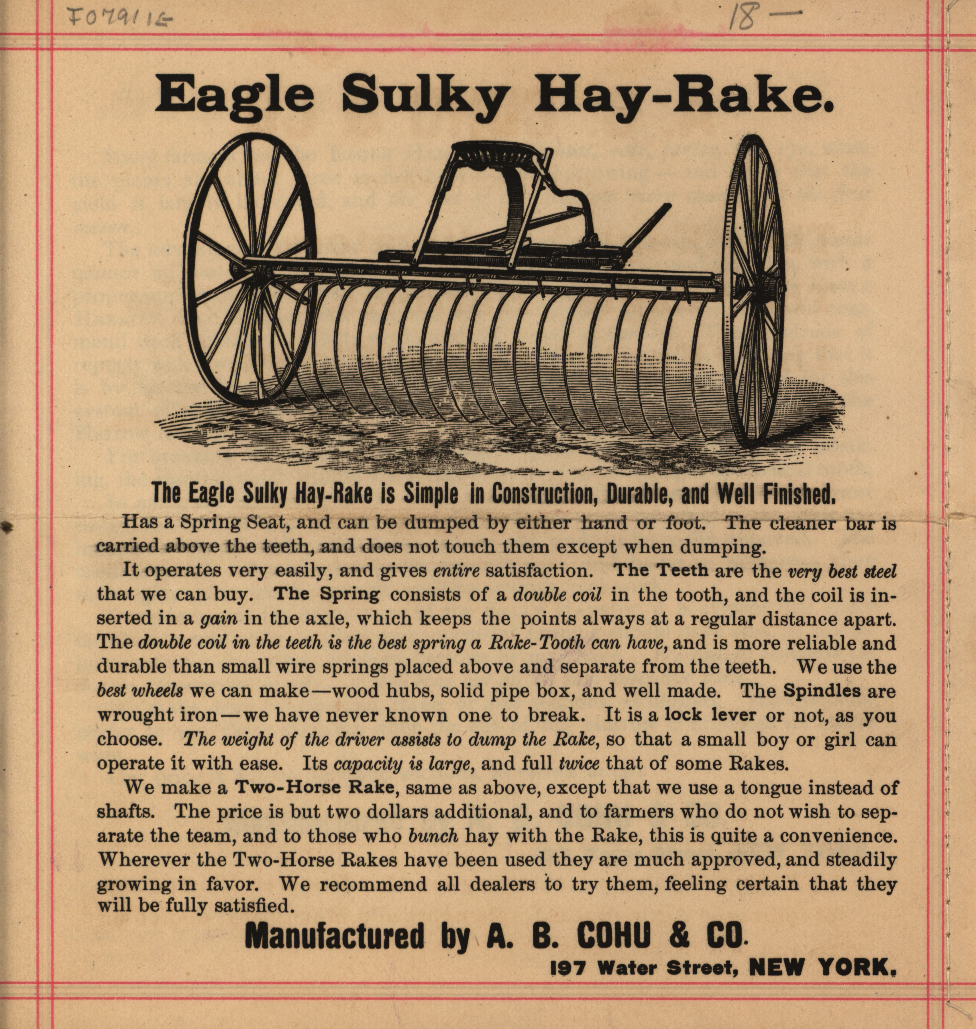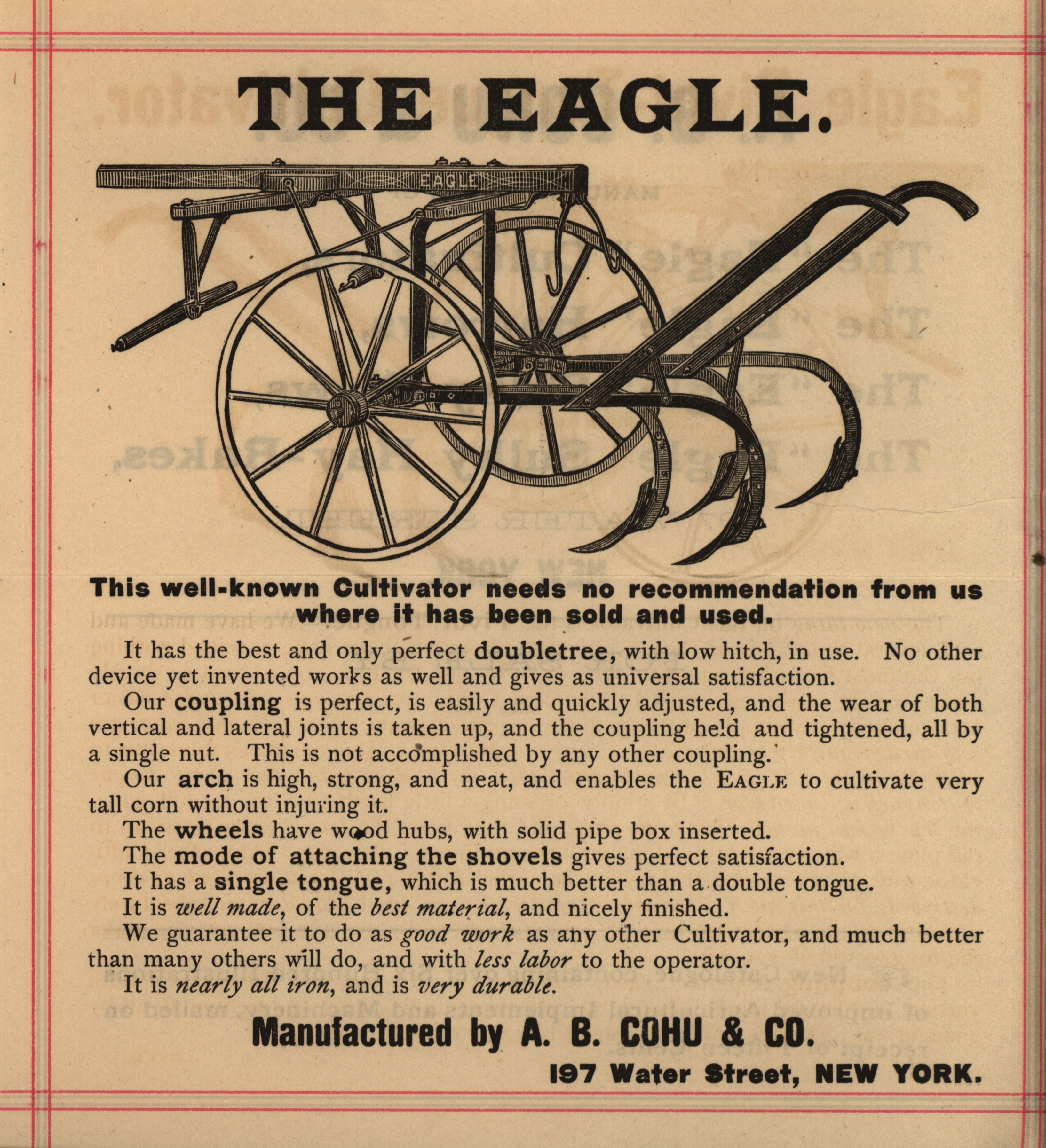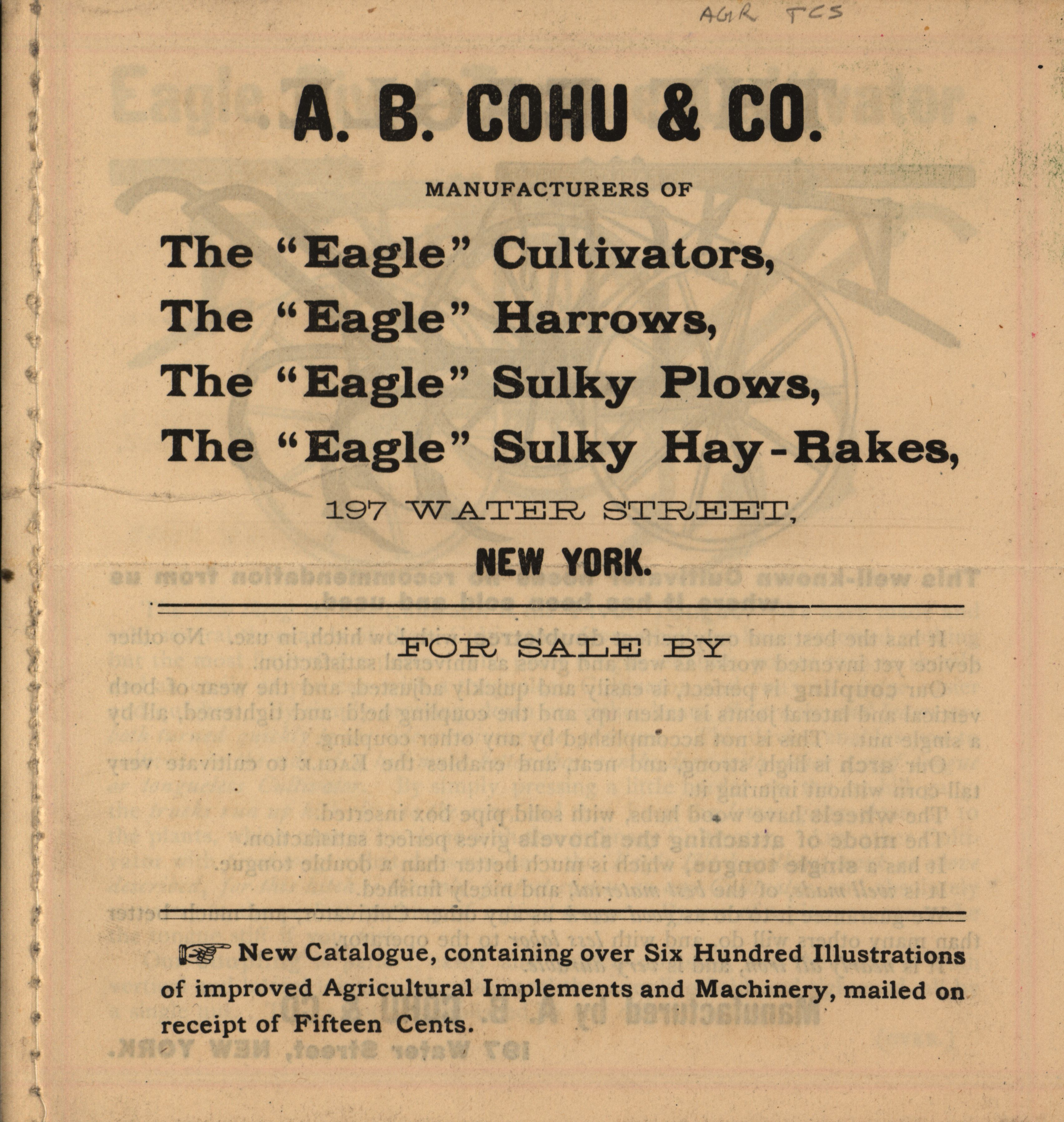 - Illustrated catalog for the Eagle cultivators, harrows, sulky plows, sulky hay-rakes and related products offered by A. B. Cohu and Company.