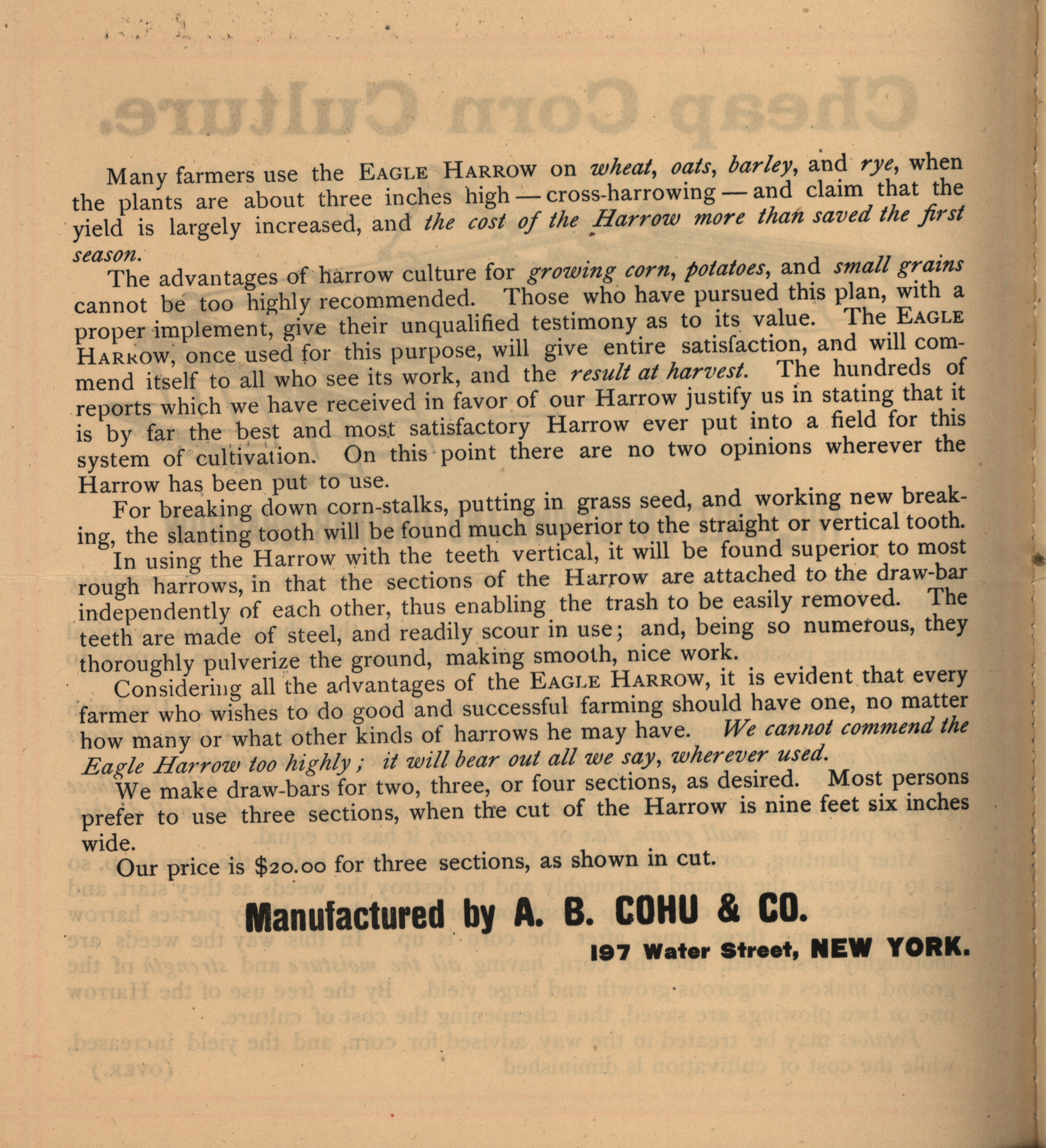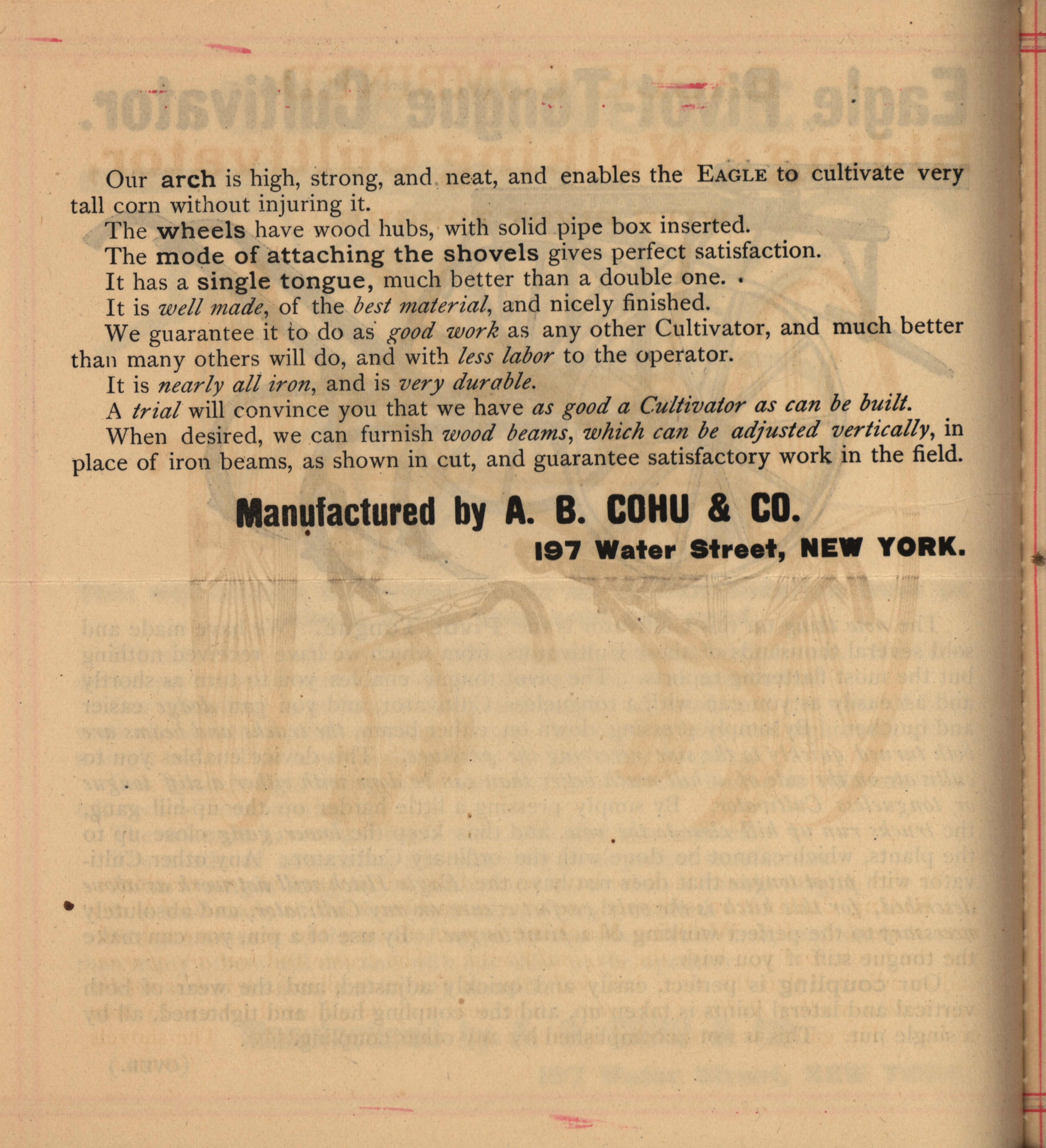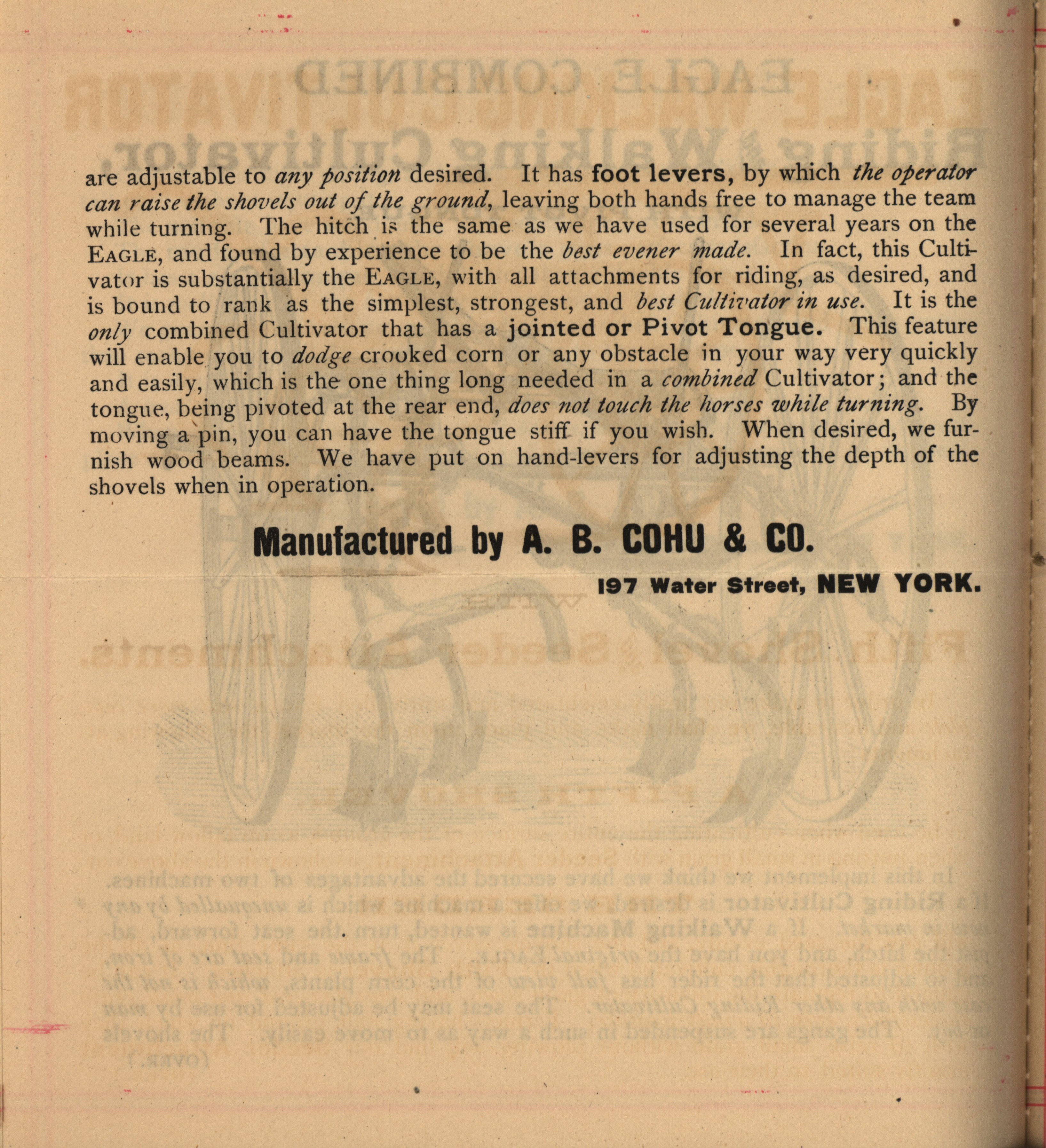 - Illustrated catalog for the Eagle cultivators, harrows, sulky plows, sulky hay-rakes and related products offered by A. B. Cohu and Company.