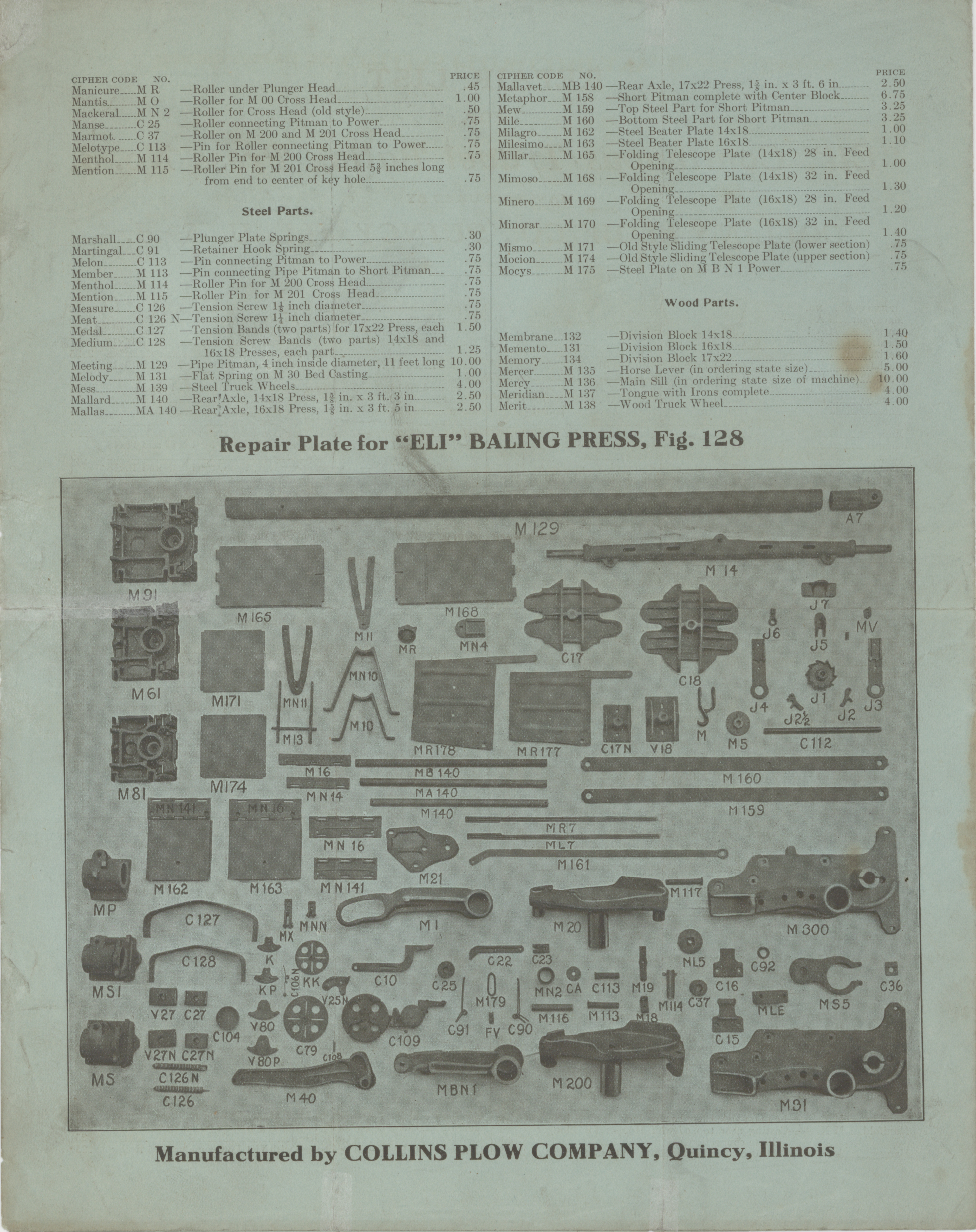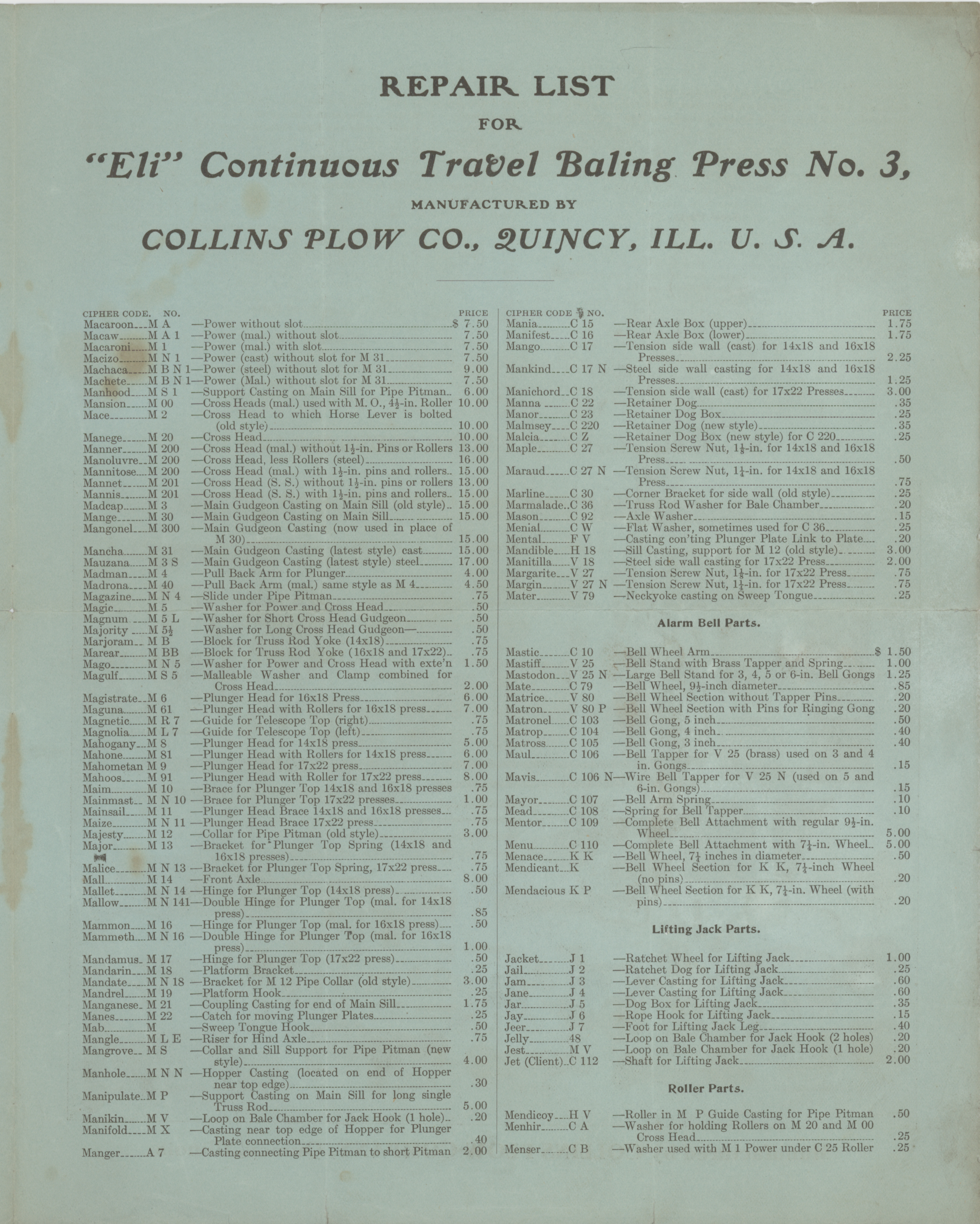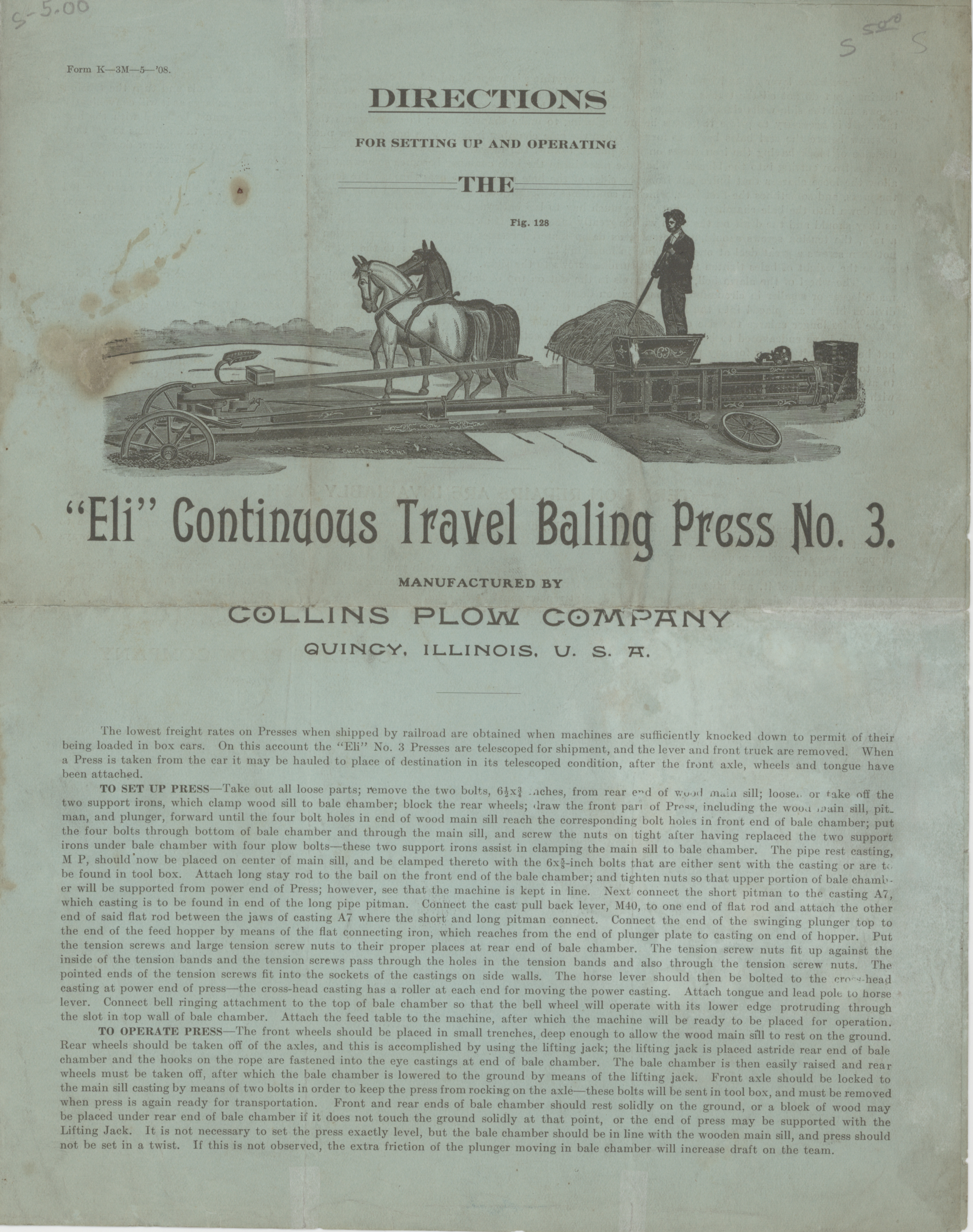 - "Collins Plow Company Eli Continuous Travel Baling Press No. 3", Agricultural Machinery Literature Collection, Iowa State University Library Digital Collections