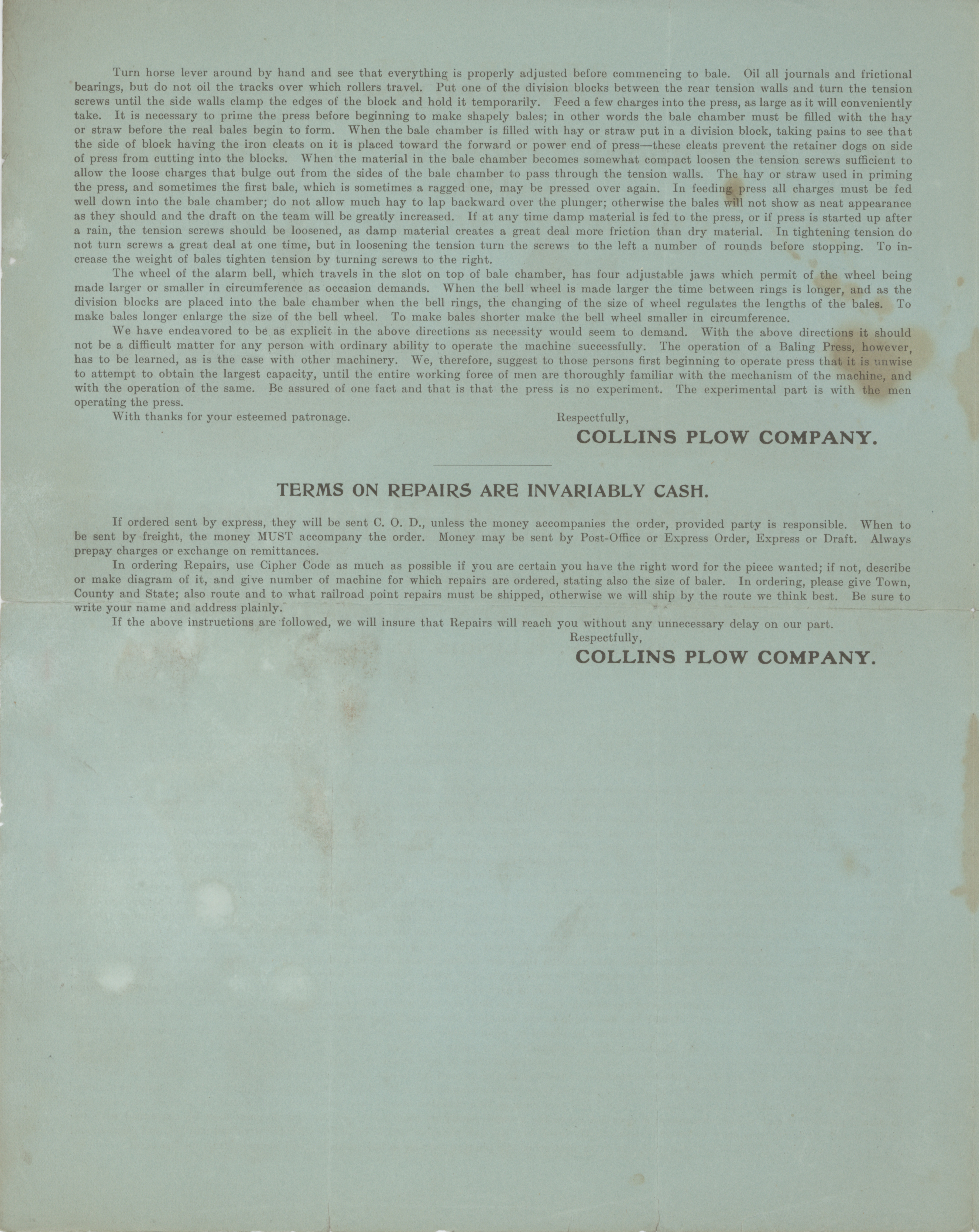 - Collins Plow Company Eli Continuous Travel Baling Press No. 3