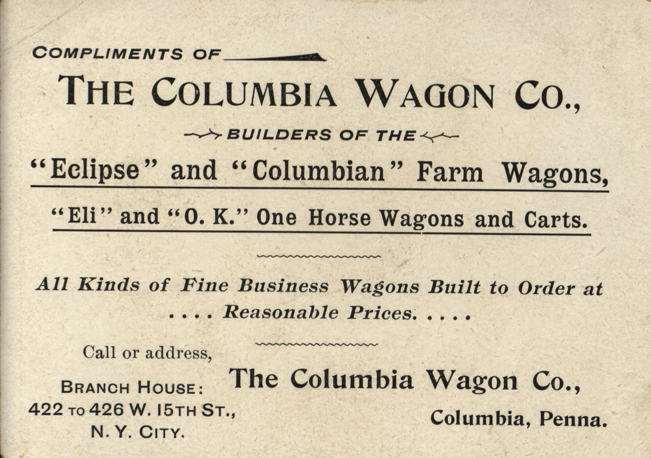 - "Columbia Wagon Company advertisement card", Agricultural Machinery Literature Collection, Iowa State University Library Digital Collections