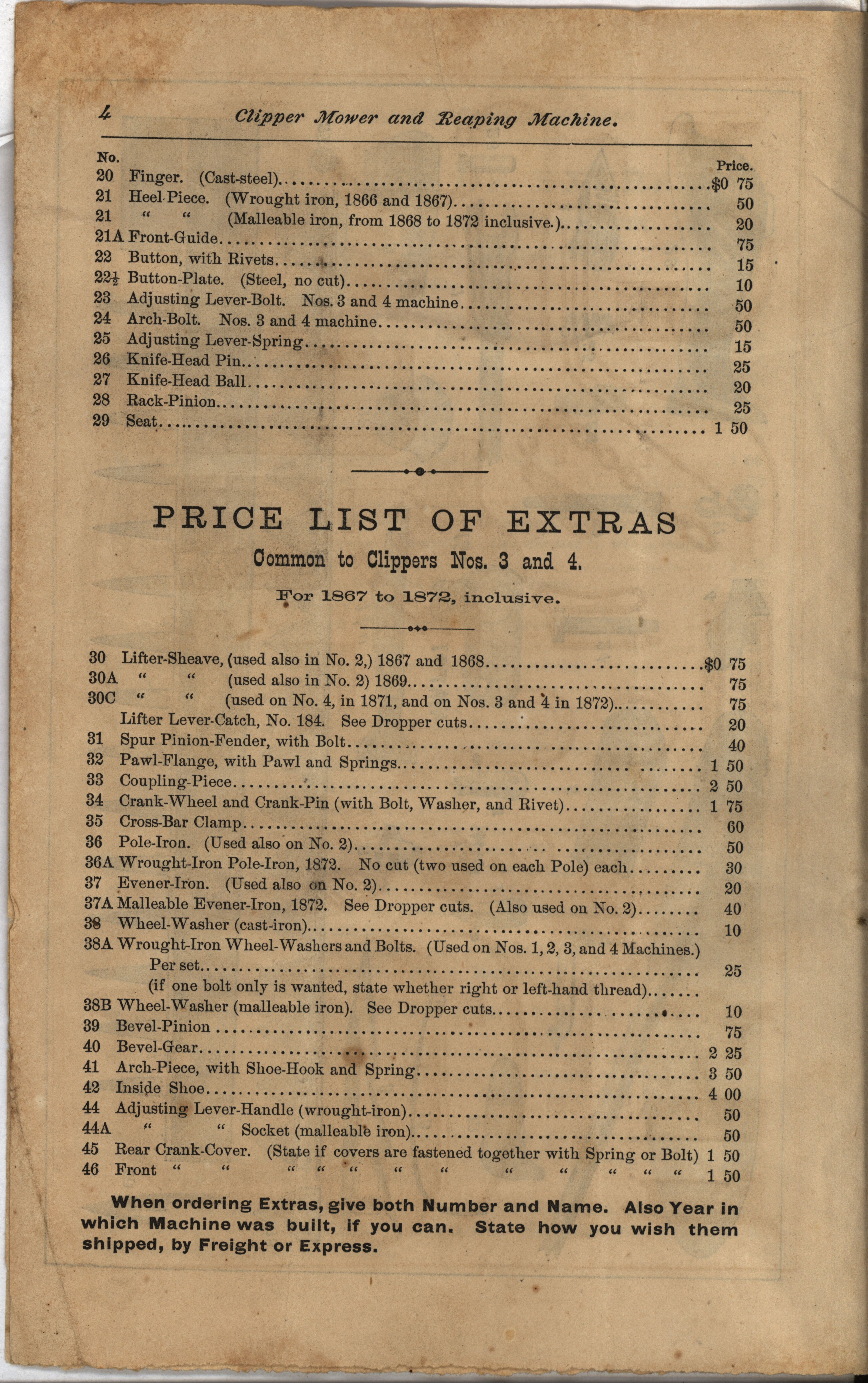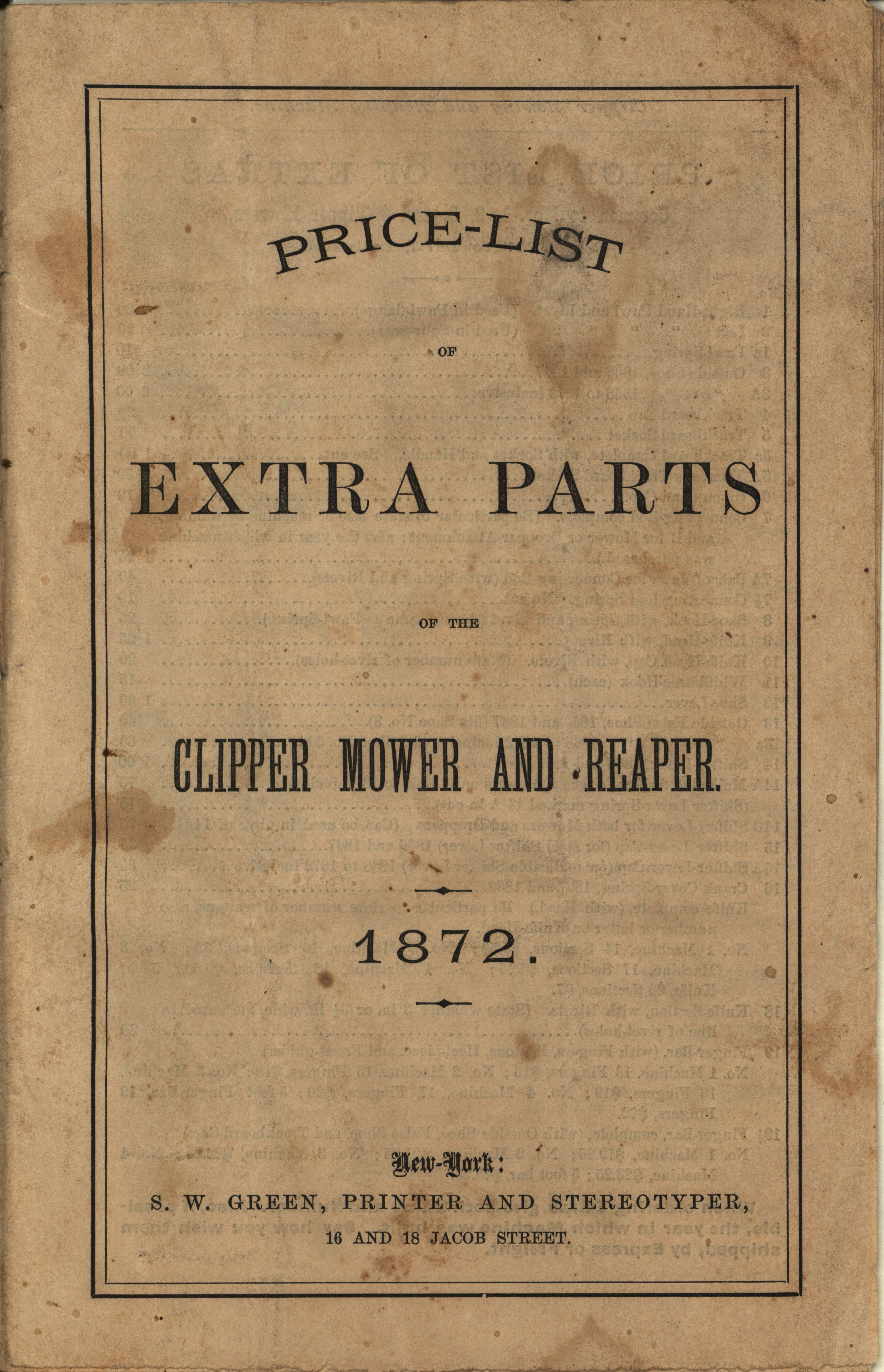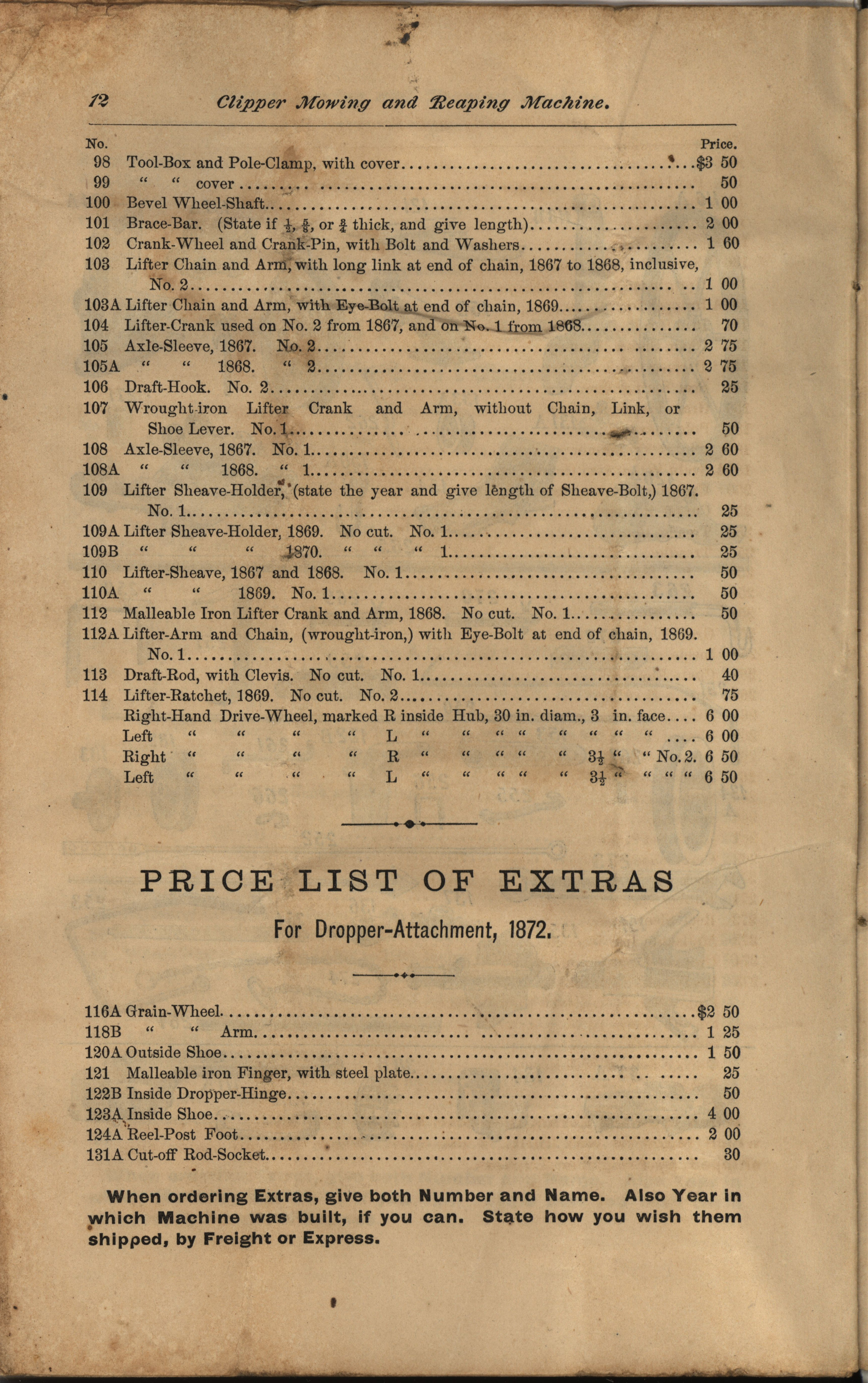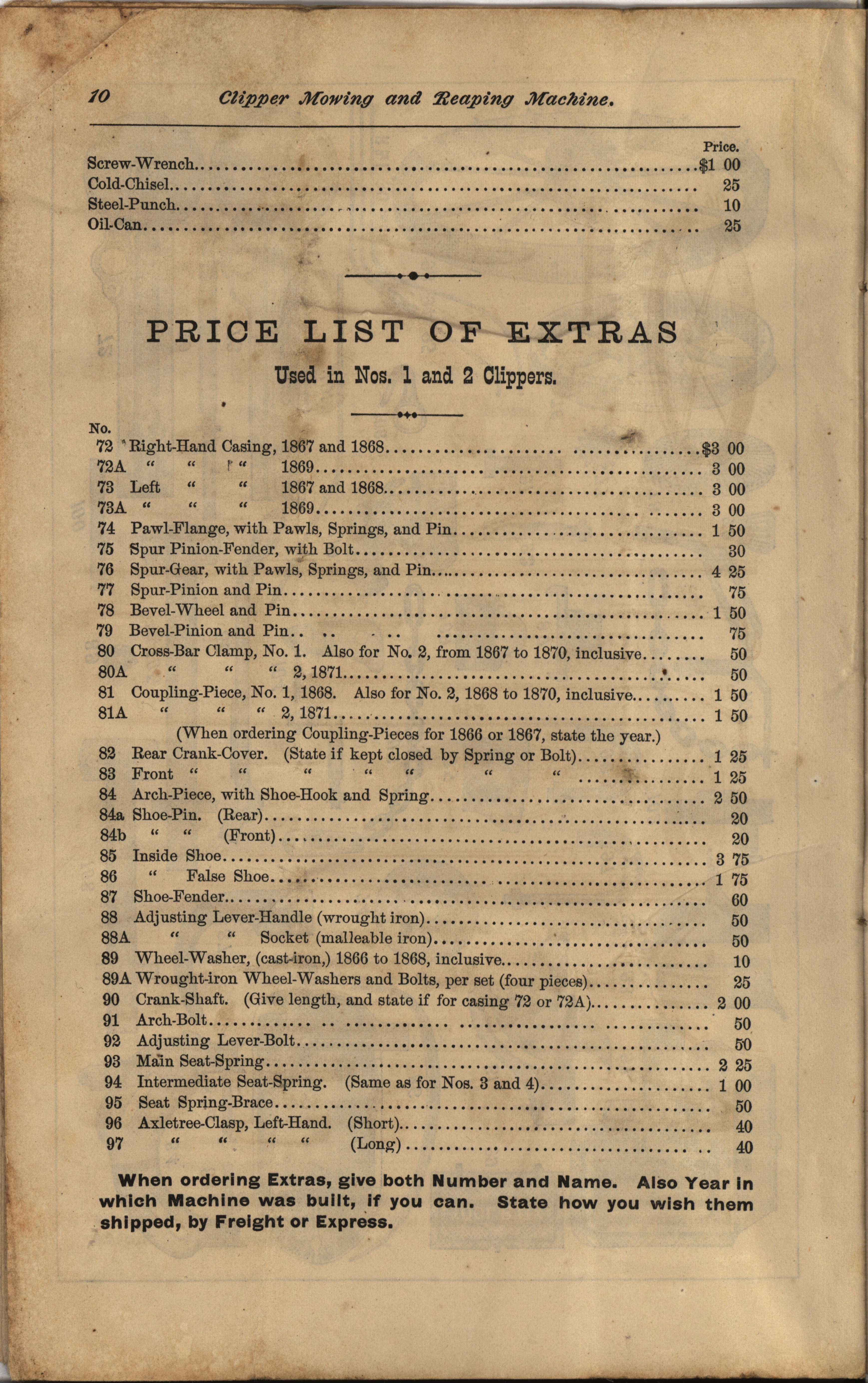 - Price list for extra parts offered by the Clipper Mower and Reaper Company in 1872, includes illustrations.
