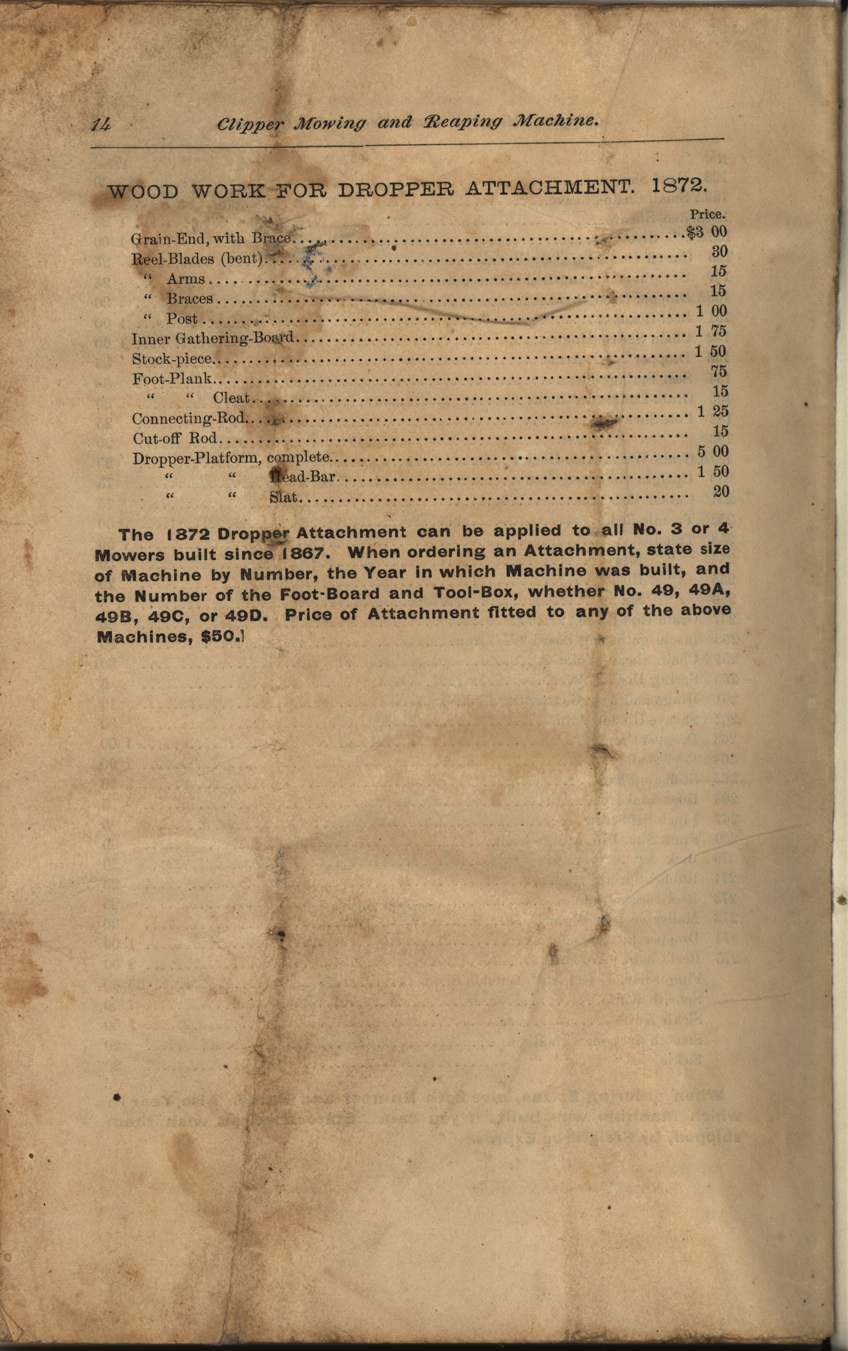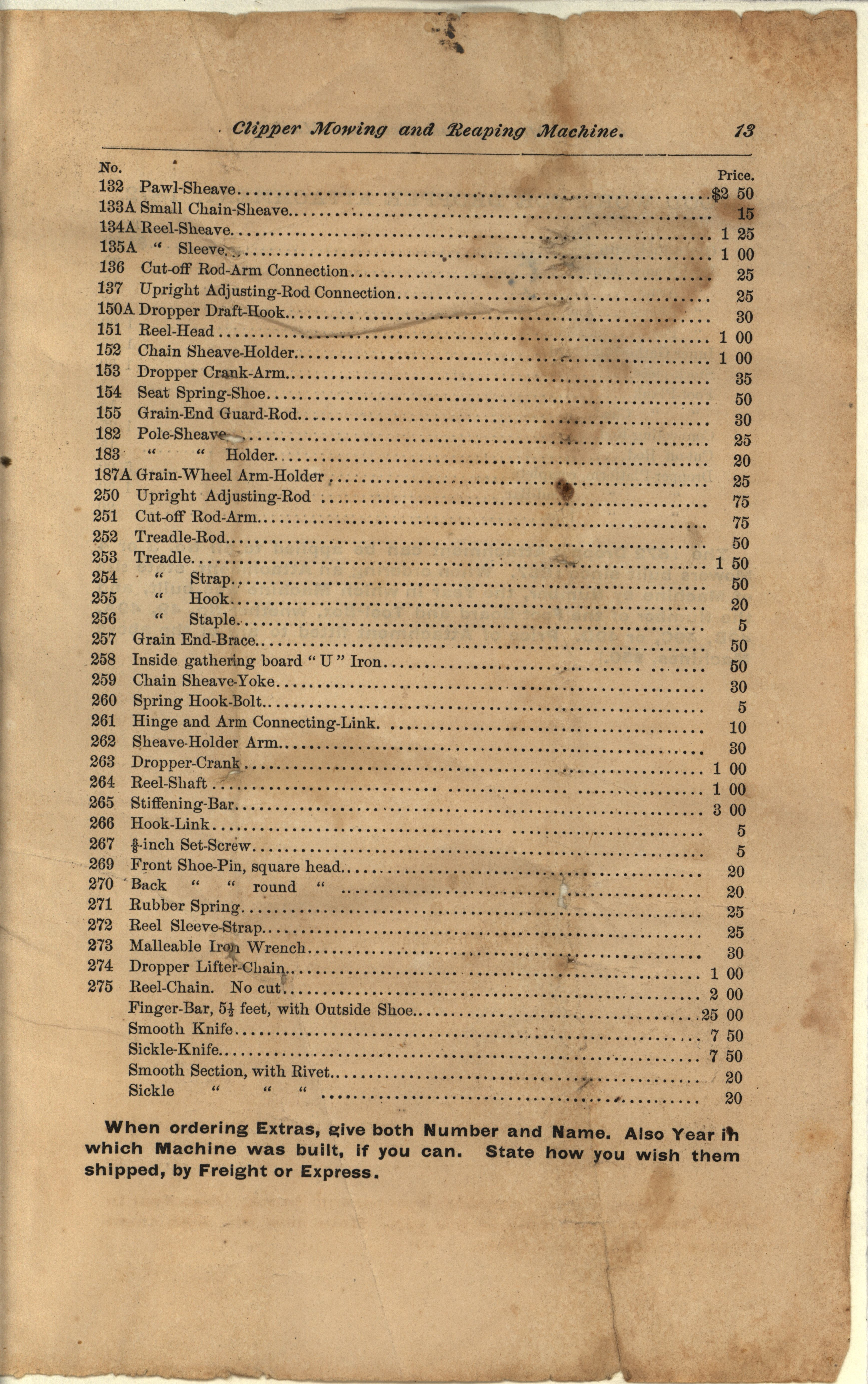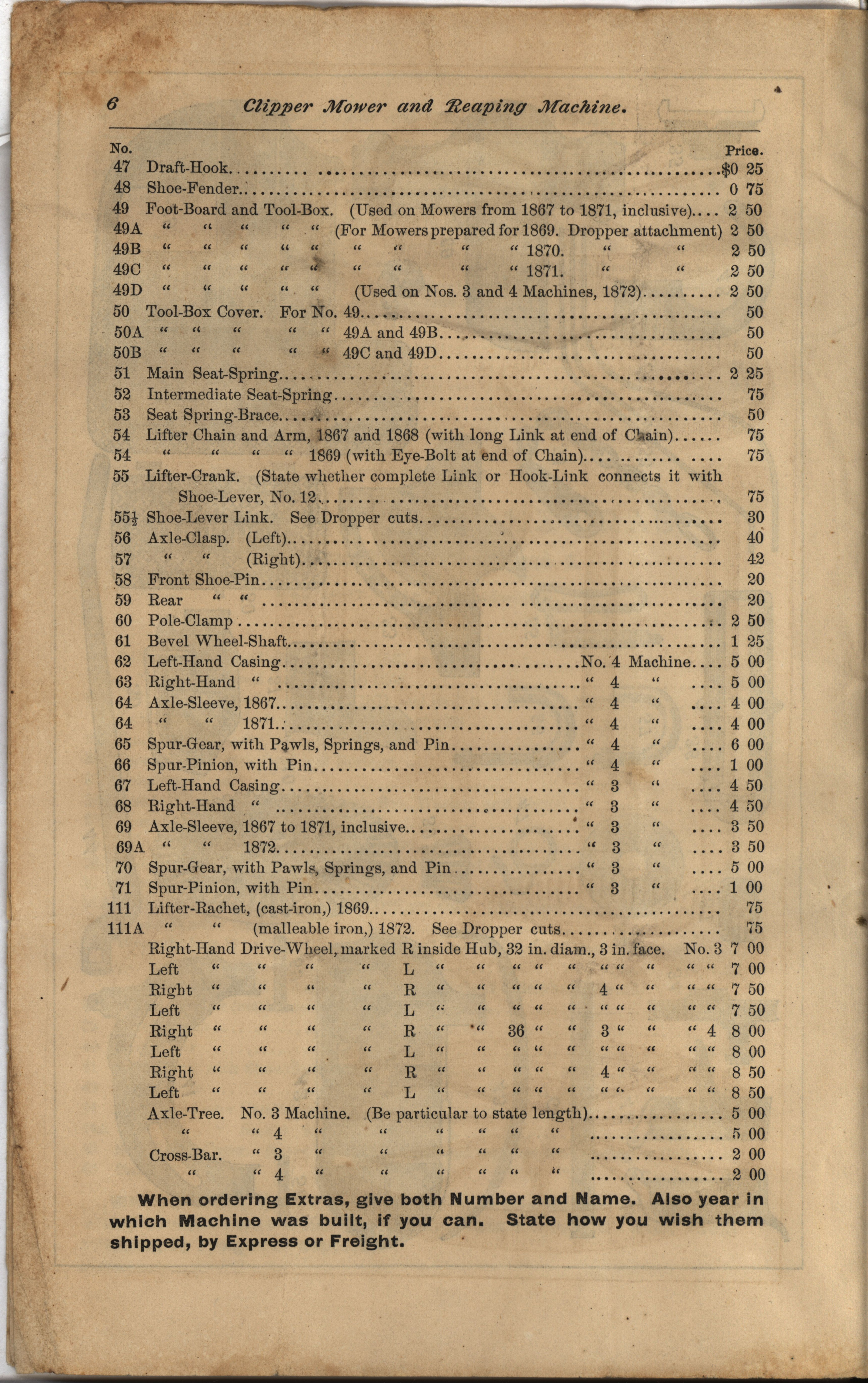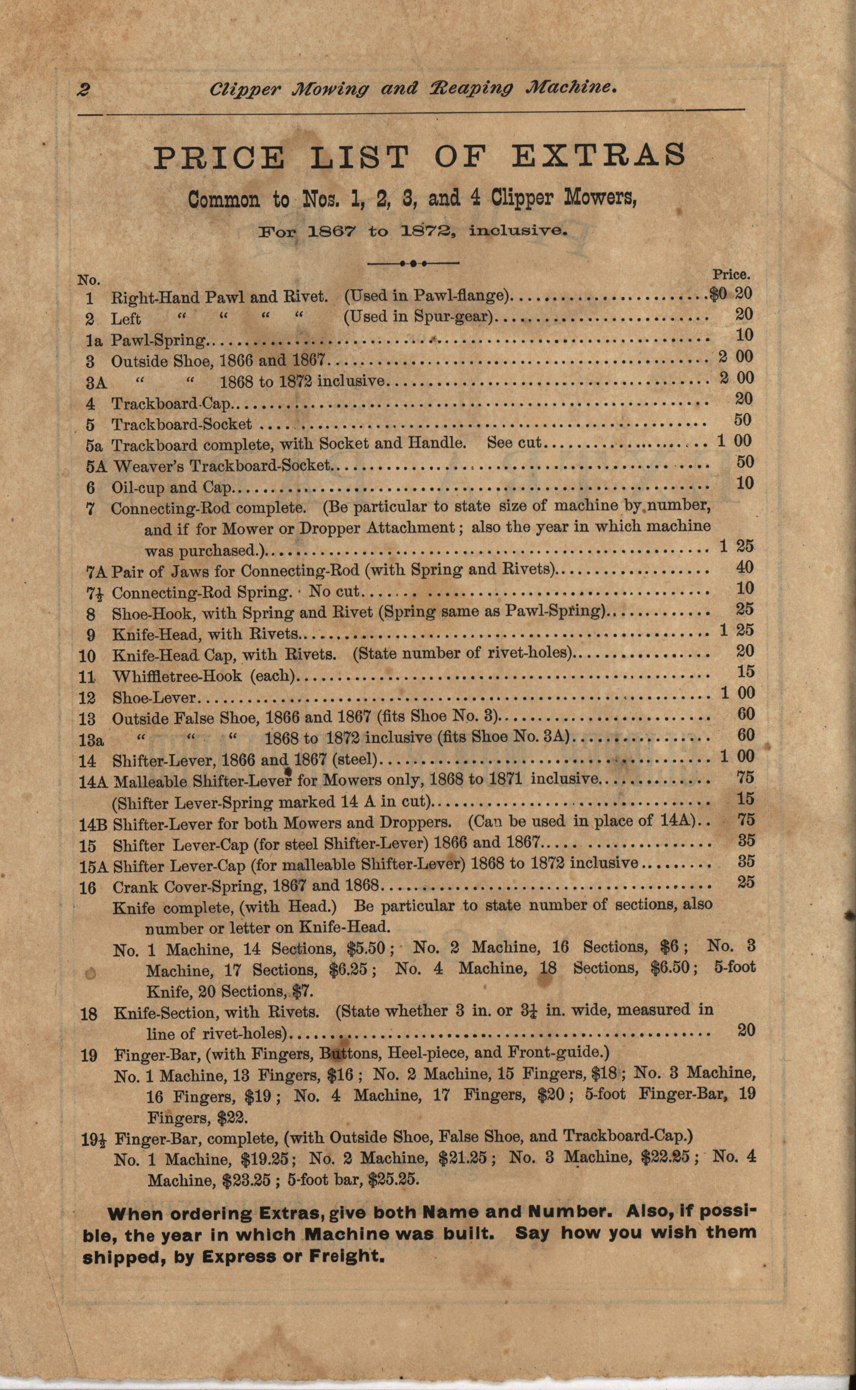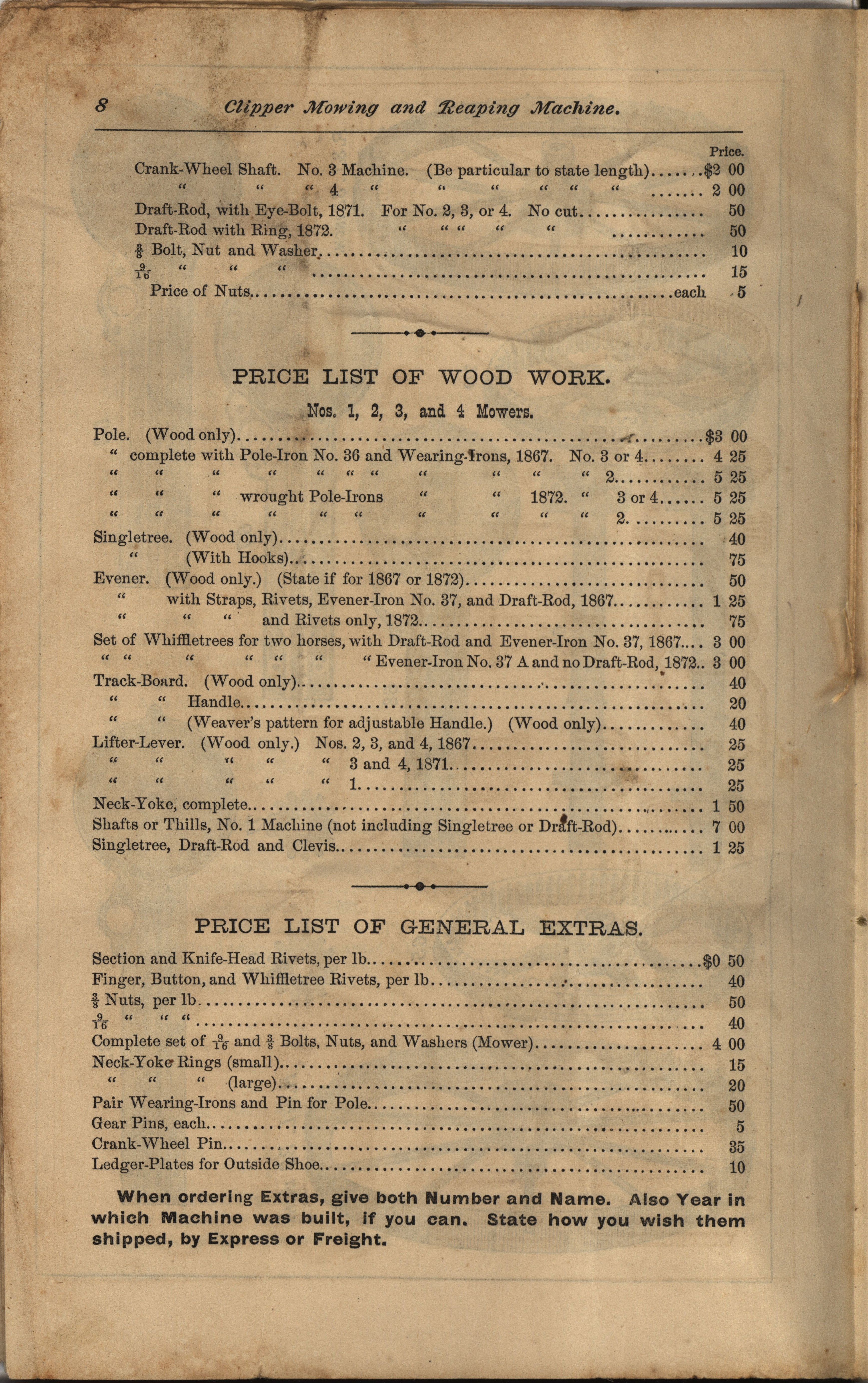 - Price list for extra parts offered by the Clipper Mower and Reaper Company in 1872, includes illustrations.