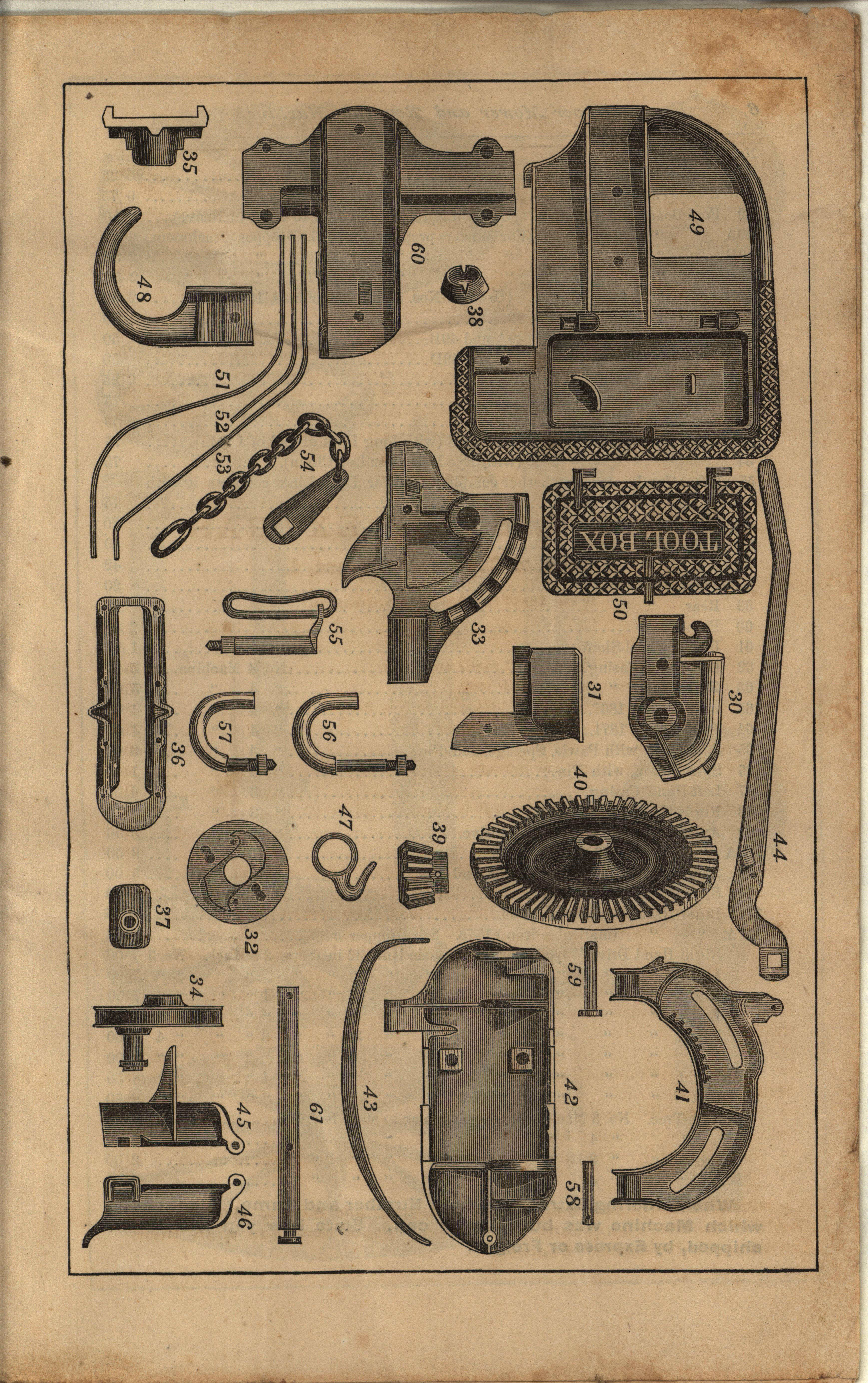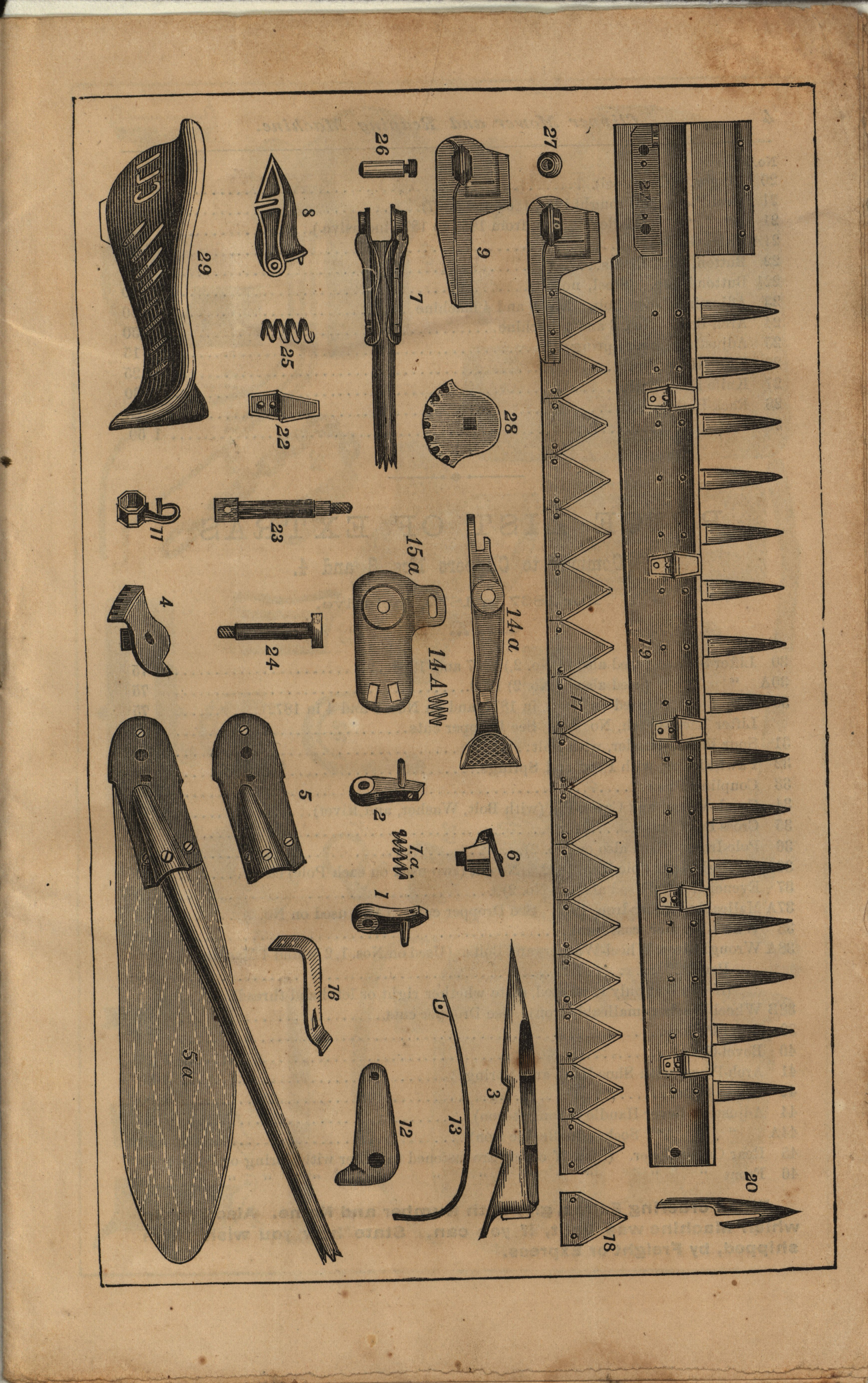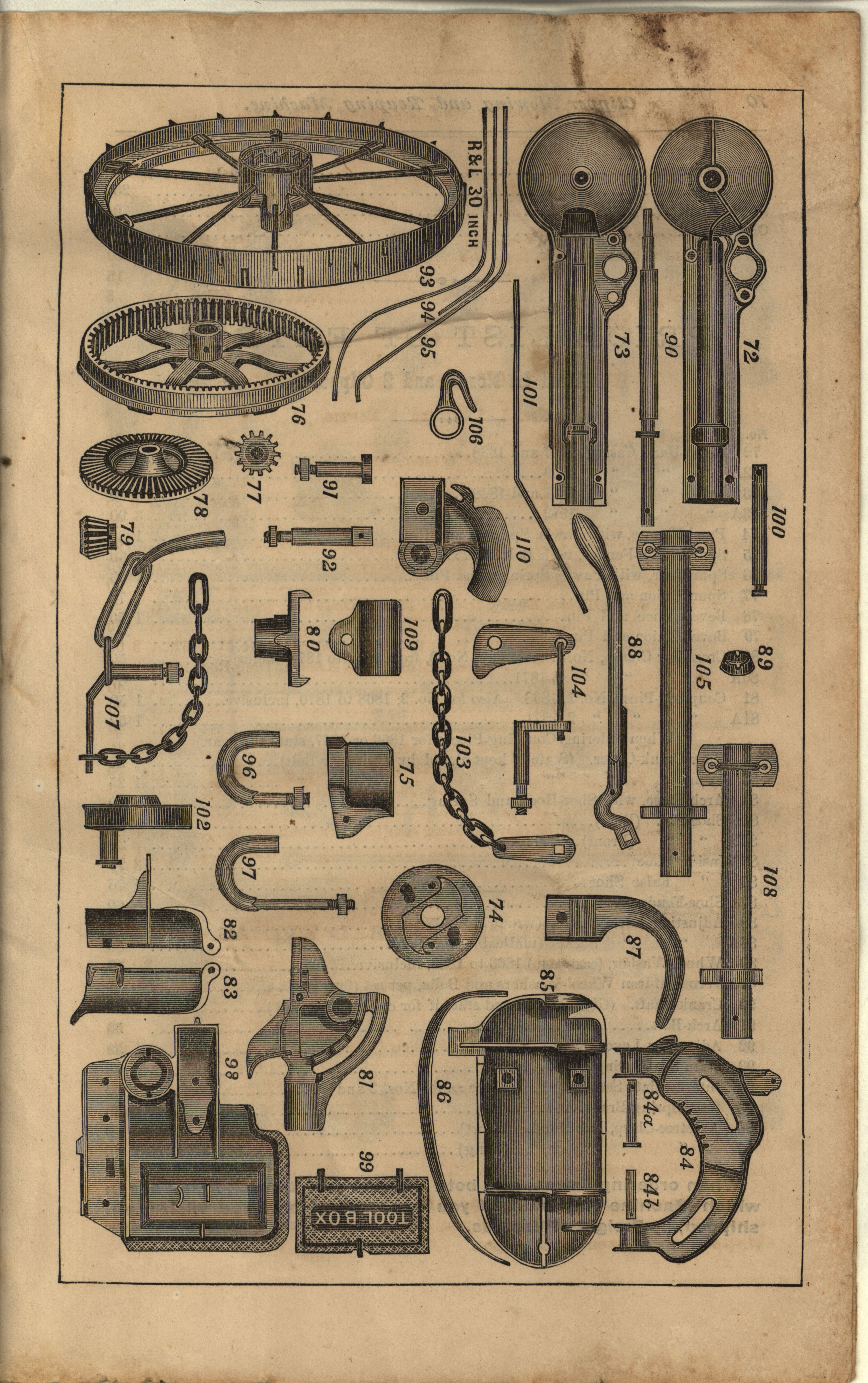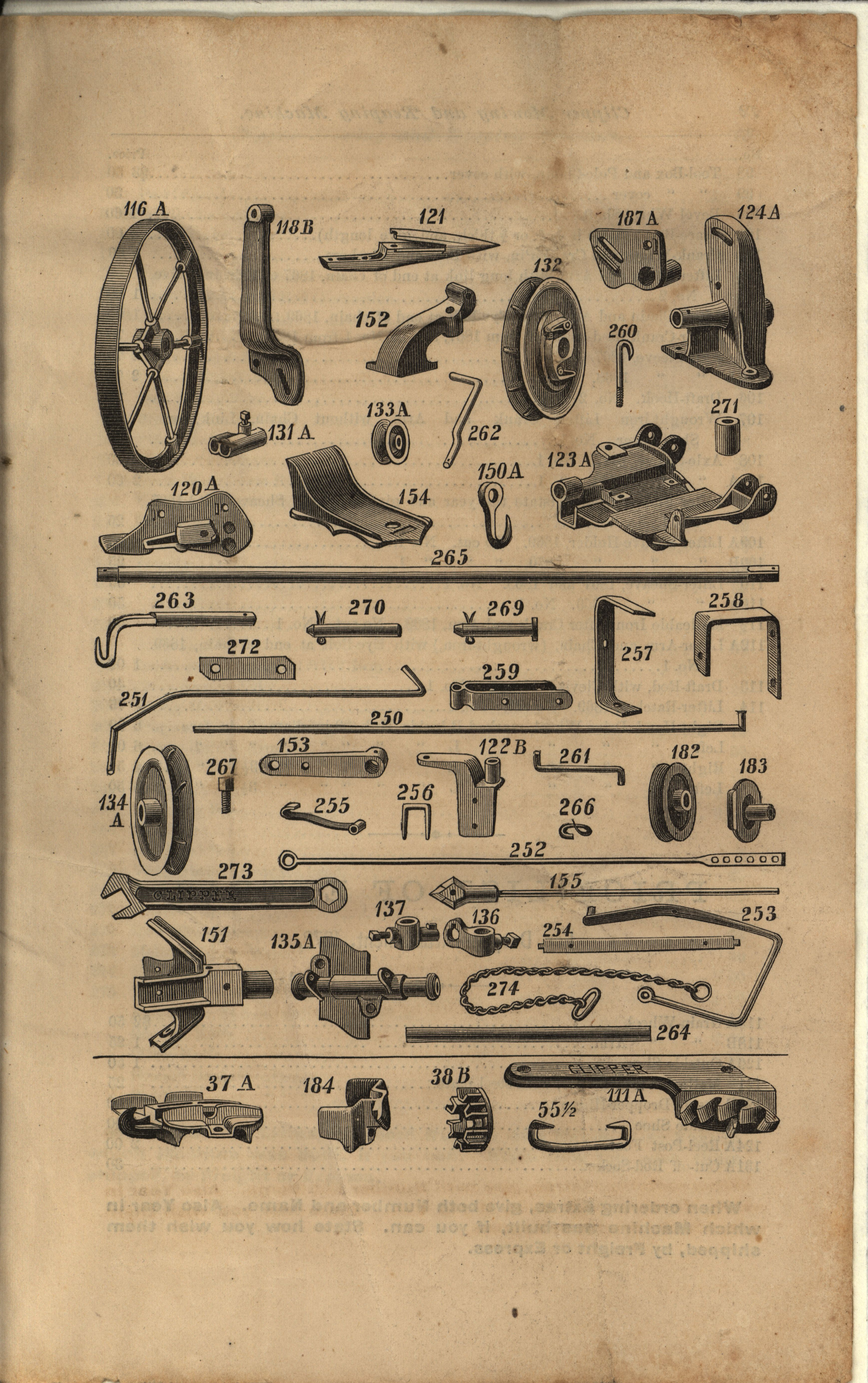 - Price list for extra parts offered by the Clipper Mower and Reaper Company in 1872, includes illustrations.